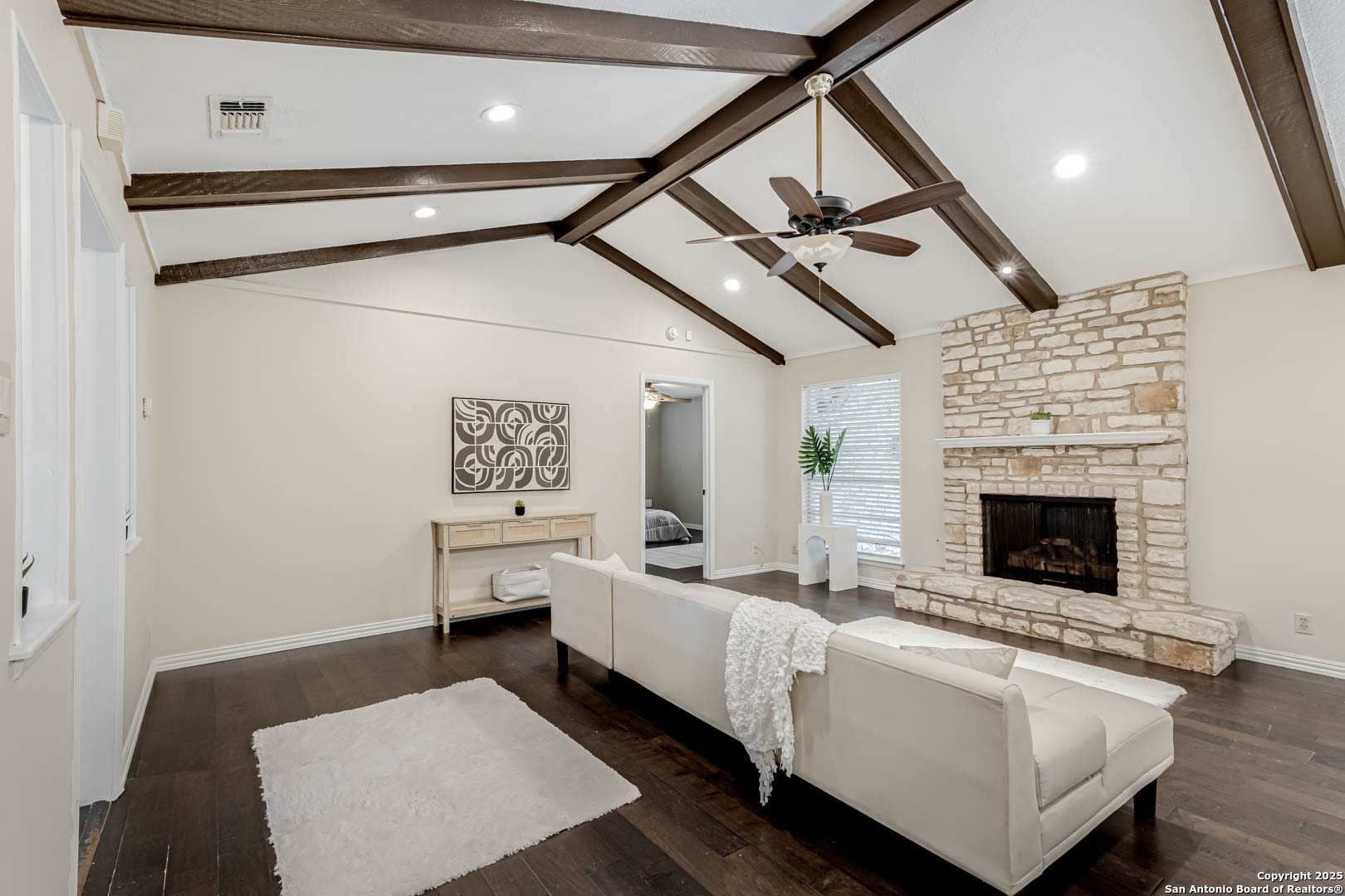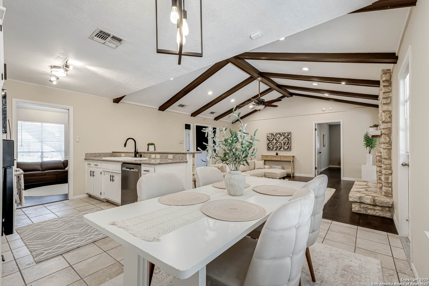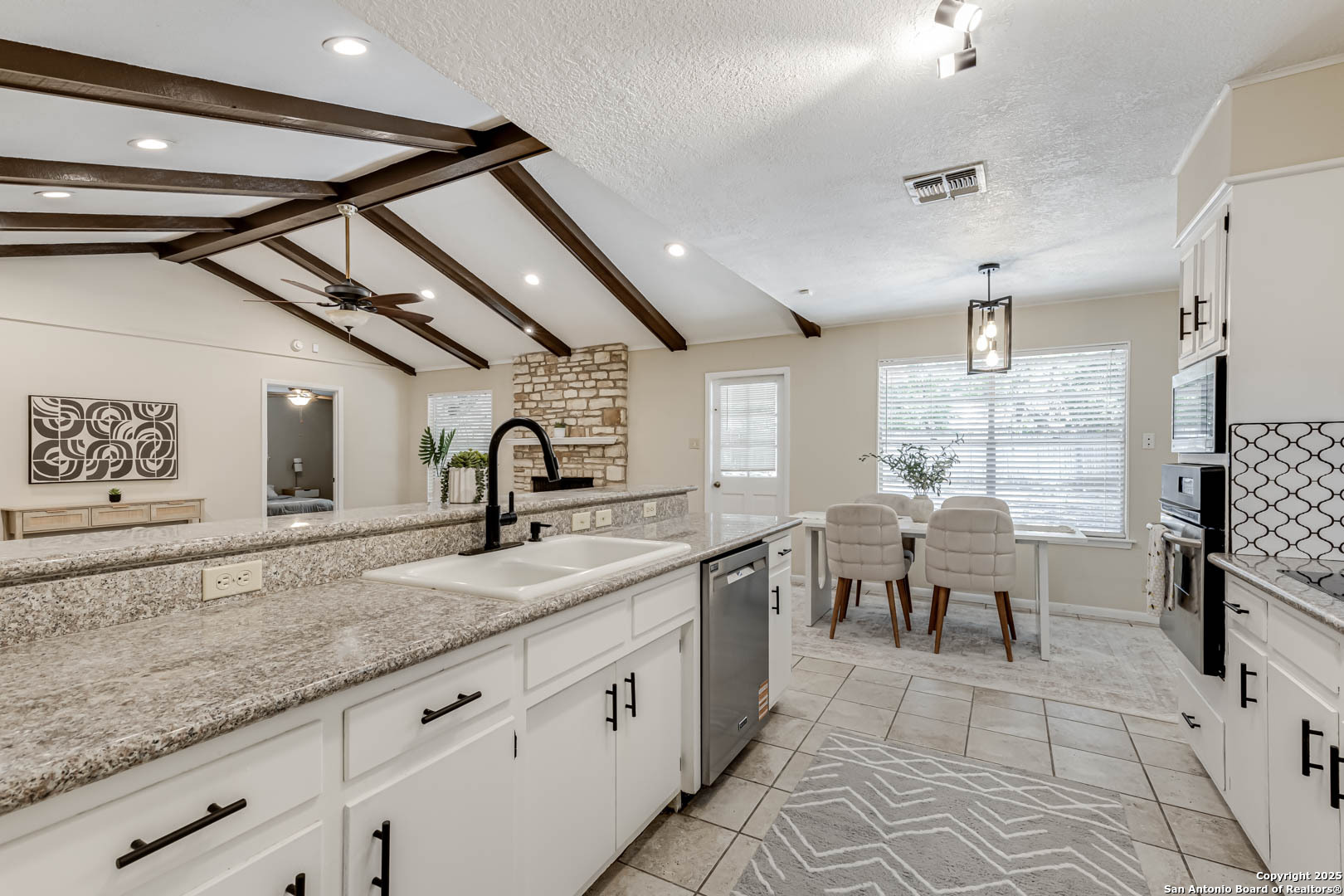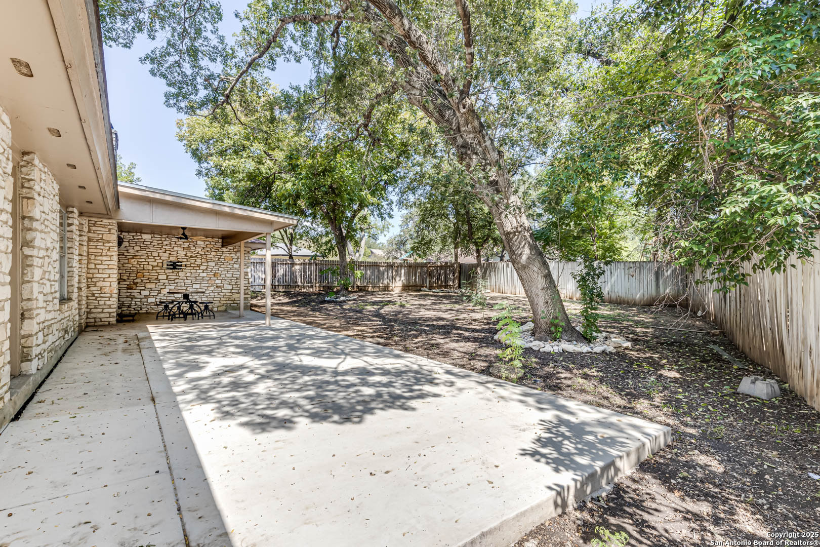 Step into a welcoming space with wood laminate floors that stretch across the open living areas. A fireplace anchors the main room, adding warmth and character that invites you to settle in and stay awhile. The kitchen is both functional and stylish, featuring stainless steel appliances and a spacious walk-in pantry that keeps everything tidy and within reach. This home includes three bedrooms and two bathrooms, with the primary suite offering a walk-in closet and the others providing solid storage and comfortable layouts. Bathrooms are equipped with standard tubs and pull-up bars for added ease. Outside, the backyard offers a shaded retreat with mature trees and rock scaping designed for smart water drainage. A covered patio creates the perfect spot for morning coffee or evening unwinding, while the front yard features simple landscaping with plant beds that frame the home's exterior. A two-car garage and electric utilities round out the practical features of this well-maintained property. Location perks: Nestled in the desirable North East ISD. Plus, you're just minutes from popular shopping destinations like North Star Mall, Alamo Quarry Market, and The Shops at Lincoln Heights-making errands, dining, and weekend outings effortlessly convenient.
