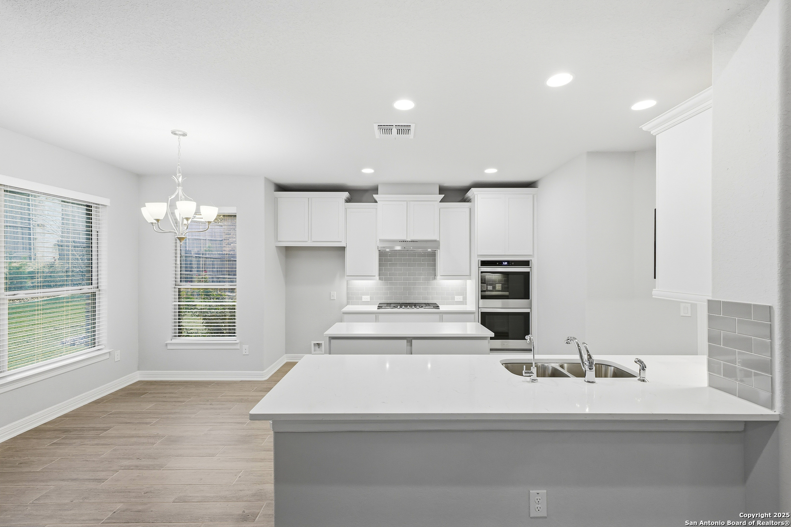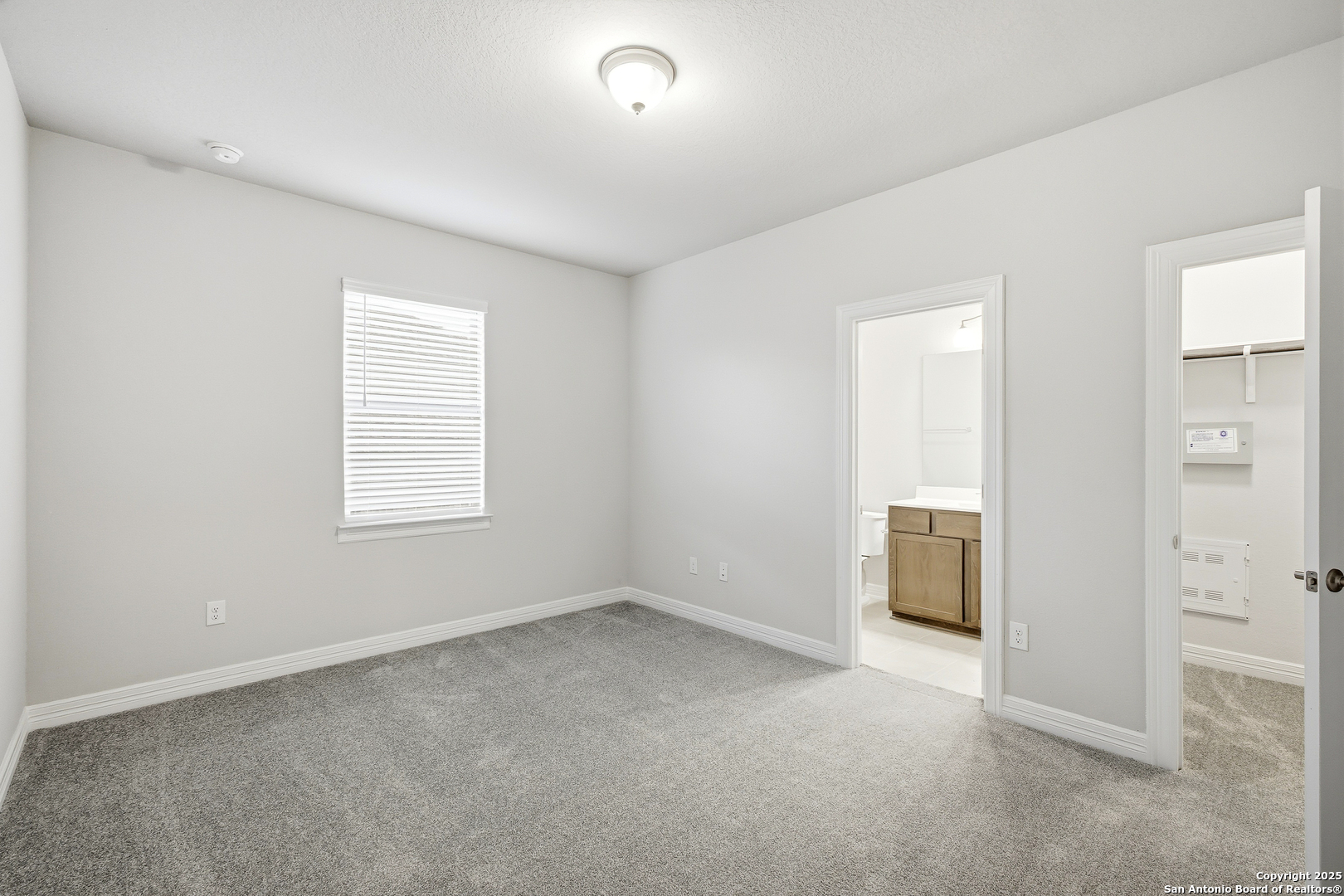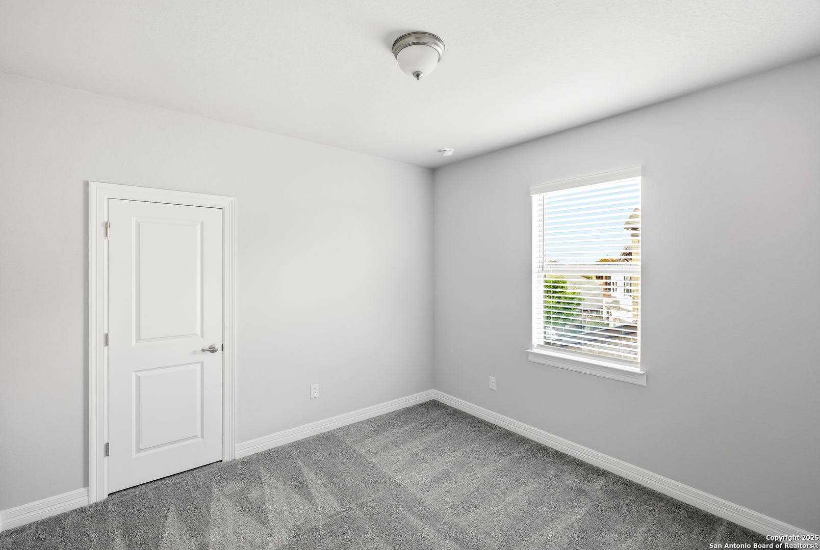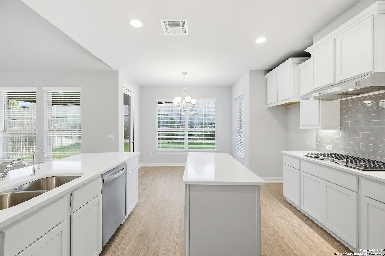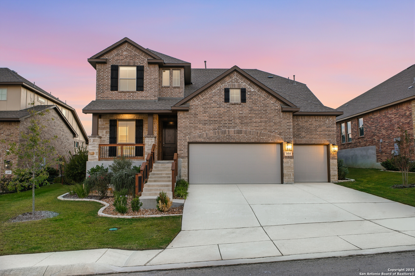 Stunning new construction by Sitterle Homes, perfectly positioned on a 0.17-acre lot within the exclusive gated community of Sunday Creek at Kinder Ranch. This sophisticated two-story Patterson floor plan offers 4 bedrooms, 3 full baths, 1 half bath, a 3-car garage, and 2,909 sq ft of thoughtfully curated living space backing to no rear neighbors. Elevated design elements include soaring ceilings, abundant natural light, and wood-look ceramic tile flooring extending through the main living areas, dining room, study, and laundry. An elegant foyer with arched openings and crown-trimmed formal dining leads into the expansive great room, where a dramatic vaulted ceiling, gas fireplace, and wall of windows create an inviting atmosphere ideal for both everyday living and elevated entertaining. The gourmet kitchen showcases white cabinetry, granite countertops, stainless steel appliances, a gas cooktop with vent hood, dual built-in ovens, built-in microwave, tile backsplash, an oversized center island, additional prep island, breakfast bar seating, and a sunlit breakfast area overlooking the backyard. The downstairs primary suite features a tranquil retreat with a tray ceiling, soft carpeting, and a luxurious bath offering an oversized walk-in shower with rainfall head, dual vanity, private toilet room, and a spacious walk-in closet. Upstairs includes a generous game room, two secondary bedrooms served by a full hallway bath, and a fourth bedroom featuring its own private full bathroom. The upstairs hallway highlights open railing overlooking the staircase and foyer, adding architectural depth and a sense of openness. Outdoor living is enhanced by an extended covered patio and a beautifully landscaped yard offering a private setting with generous space to relax or entertain. Additional features include a full irrigation system and plumbing for a water softener. Nestled within the master-planned Kinder Ranch community, residents enjoy gated access, highly acclaimed Comal ISD schools with on-site K-12 campuses, a Jr. Olympic swimming pool, multi-acre nature preserve, scenic walking and biking trails, and a community playground. This prime North San Antonio location provides effortless access to Hwy 281, Hwy 46, Loop 1604, premier Stone Oak dining and shopping, Timberwood Park, Canyon Lake, Guadalupe State Park, top medical facilities including Methodist Stone Oak Hospital, and a convenient commute to Camp Bullis and Randolph AFB. Built with Sitterle's renowned craftsmanship, this exceptional home blends modern luxury, timeless finishes, and refined living in one of the area's most desirable communities.