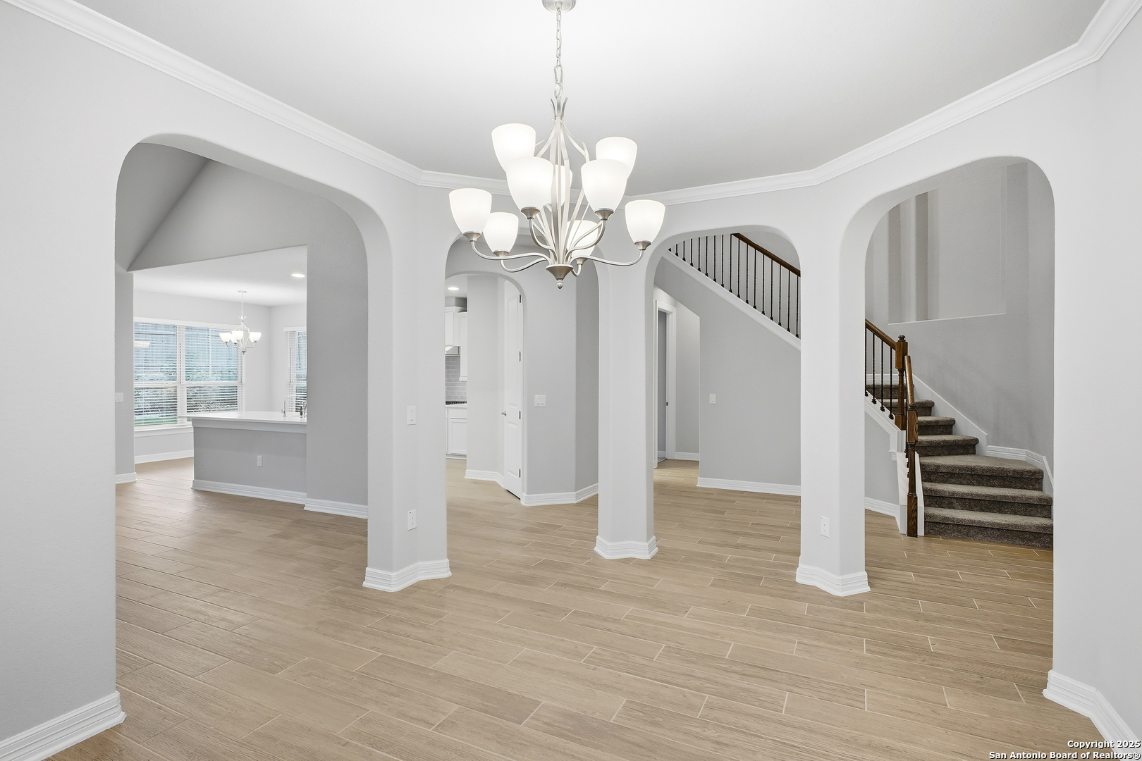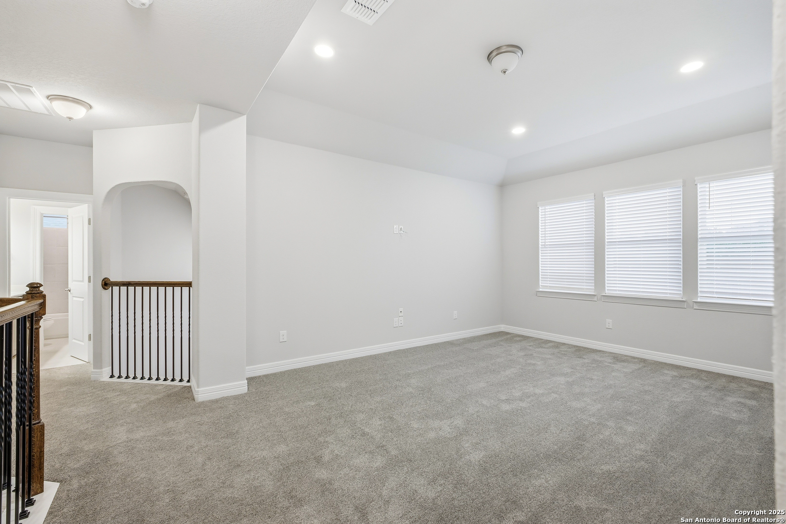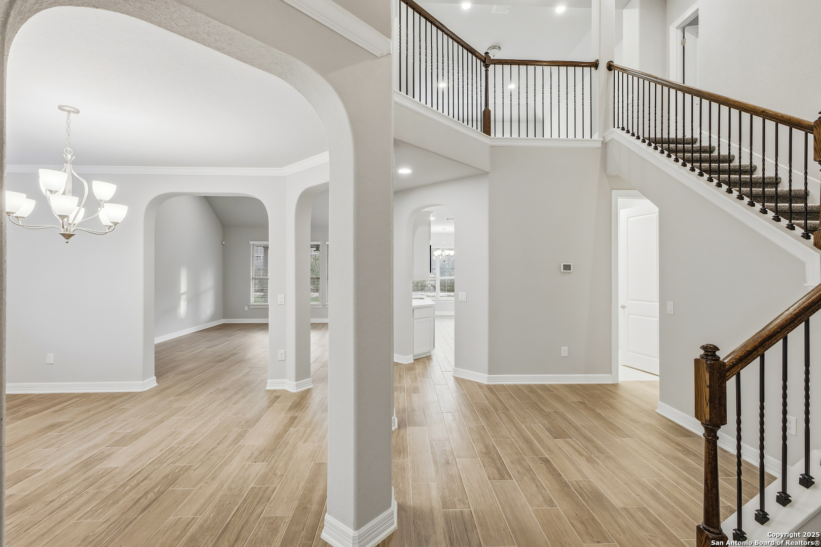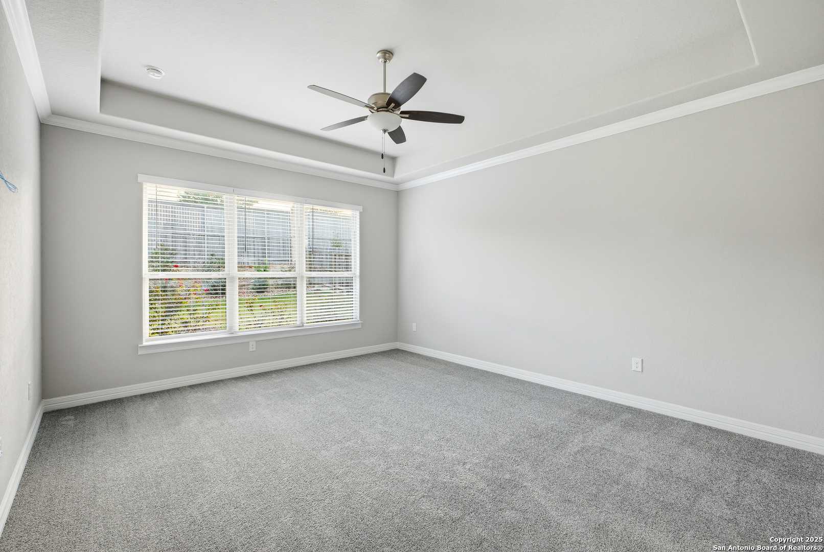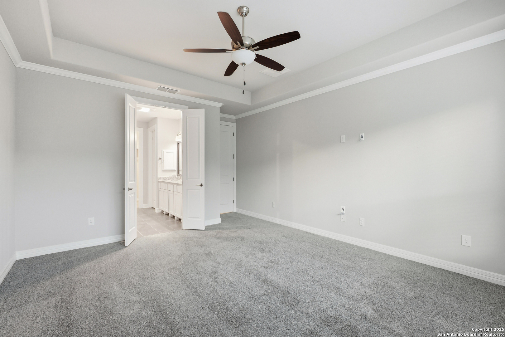 Stunning new construction by Sitterle Homes, perfectly positioned on a 0.17-acre lot within the exclusive gated community of Sunday Creek at Kinder Ranch. This sophisticated two-story Patterson floor plan offers 4 bedrooms, 3 full baths, 1 half bath, a 3-car garage, and 2,909 sq ft of thoughtfully curated living space backing to no rear neighbors. Elevated design elements include soaring ceilings, abundant natural light, and wood-look ceramic tile flooring extending through the main living areas, dining room, study, and laundry. An elegant foyer with arched openings and crown-trimmed formal dining leads into the expansive great room, where a dramatic vaulted ceiling, gas fireplace, and wall of windows create an inviting atmosphere ideal for both everyday living and elevated entertaining. The gourmet kitchen showcases white cabinetry, granite countertops, stainless steel appliances, a gas cooktop with vent hood, dual built-in ovens, built-in microwave, tile backsplash, an oversized center island, additional prep island, breakfast bar seating, and a sunlit breakfast area overlooking the backyard. The downstairs primary suite features a tranquil retreat with a tray ceiling, soft carpeting, and a luxurious bath offering an oversized walk-in shower with rainfall head, dual vanity, private toilet room, and a spacious walk-in closet. Upstairs includes a generous game room, two secondary bedrooms served by a full hallway bath, and a fourth bedroom featuring its own private full bathroom. The upstairs hallway highlights open railing overlooking the staircase and foyer, adding architectural depth and a sense of openness. Outdoor living is enhanced by an extended covered patio and a beautifully landscaped yard offering a private setting with generous space to relax or entertain. Additional features include a full irrigation system and plumbing for a water softener. Nestled within the master-planned Kinder Ranch community, residents enjoy gated access, highly acclaimed Comal ISD schools with on-site K-12 campuses, a Jr. Olympic swimming pool, multi-acre nature preserve, scenic walking and biking trails, and a community playground. This prime North San Antonio location provides effortless access to Hwy 281, Hwy 46, Loop 1604, premier Stone Oak dining and shopping, Timberwood Park, Canyon Lake, Guadalupe State Park, top medical facilities including Methodist Stone Oak Hospital, and a convenient commute to Camp Bullis and Randolph AFB. Built with Sitterle's renowned craftsmanship, this exceptional home blends modern luxury, timeless finishes, and refined living in one of the area's most desirable communities.