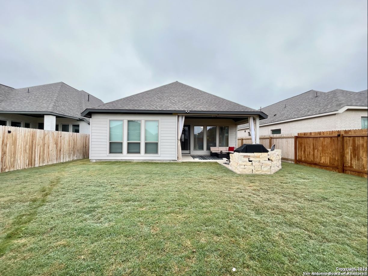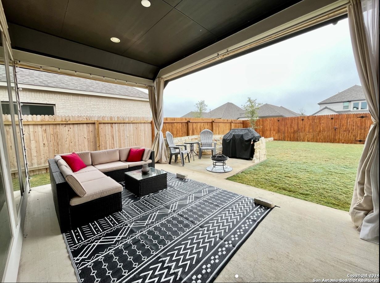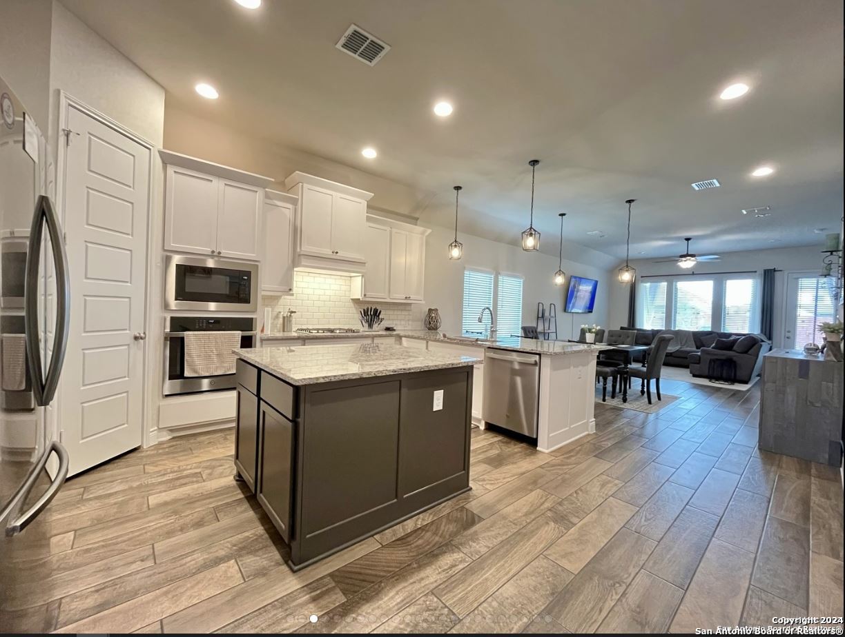Discover your dream home in Kallison Ranch! This stunning one-story home features an open floor plan with high ceilings, recessed lighting, and abundant natural light. The kitchen impresses with custom white cabinetry, a large island with a breakfast bar, sleek white tile backsplash, gas cooking, stainless steel appliances (including a refrigerator), and a spacious pantry. The living and dining areas include ceramic tile flooring, a ceiling fan, and a mounted 75" Samsung LED TV. The oversized master suite offers a tranquil retreat with a garden tub, walk-in shower, double vanity, and a large walk-in closet. A dedicated study is perfect for a home office. The utility room is equipped with a washer, dryer, and built-in storage bench. Step outside to a spacious backyard backing to a greenbelt, complete with a covered patio, retractable blinds, built-in lighting, and a sprinkler system. Conveniently located near shopping, dining, entertainment, and major highways-this home has it all!