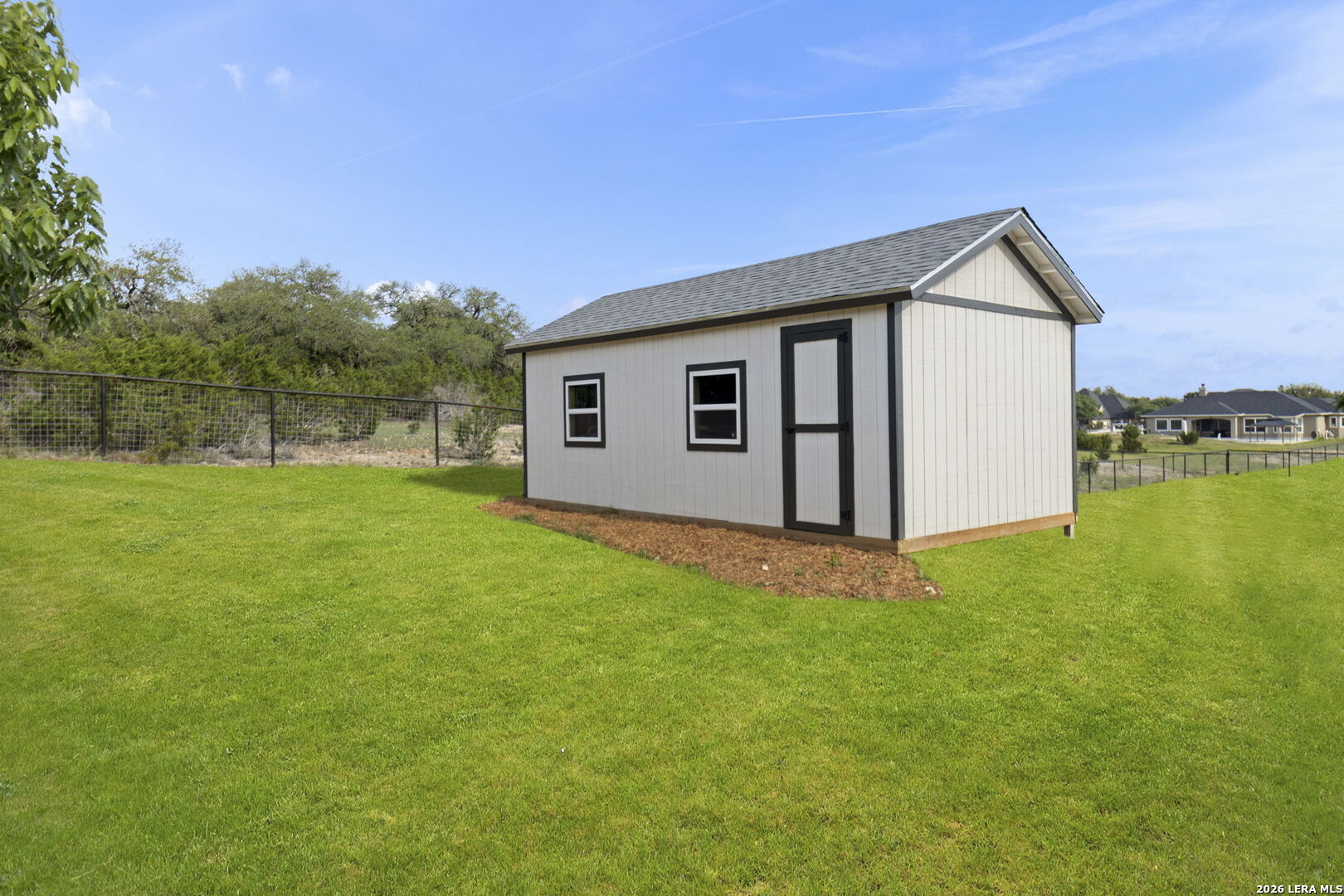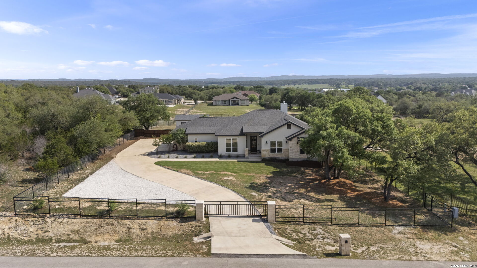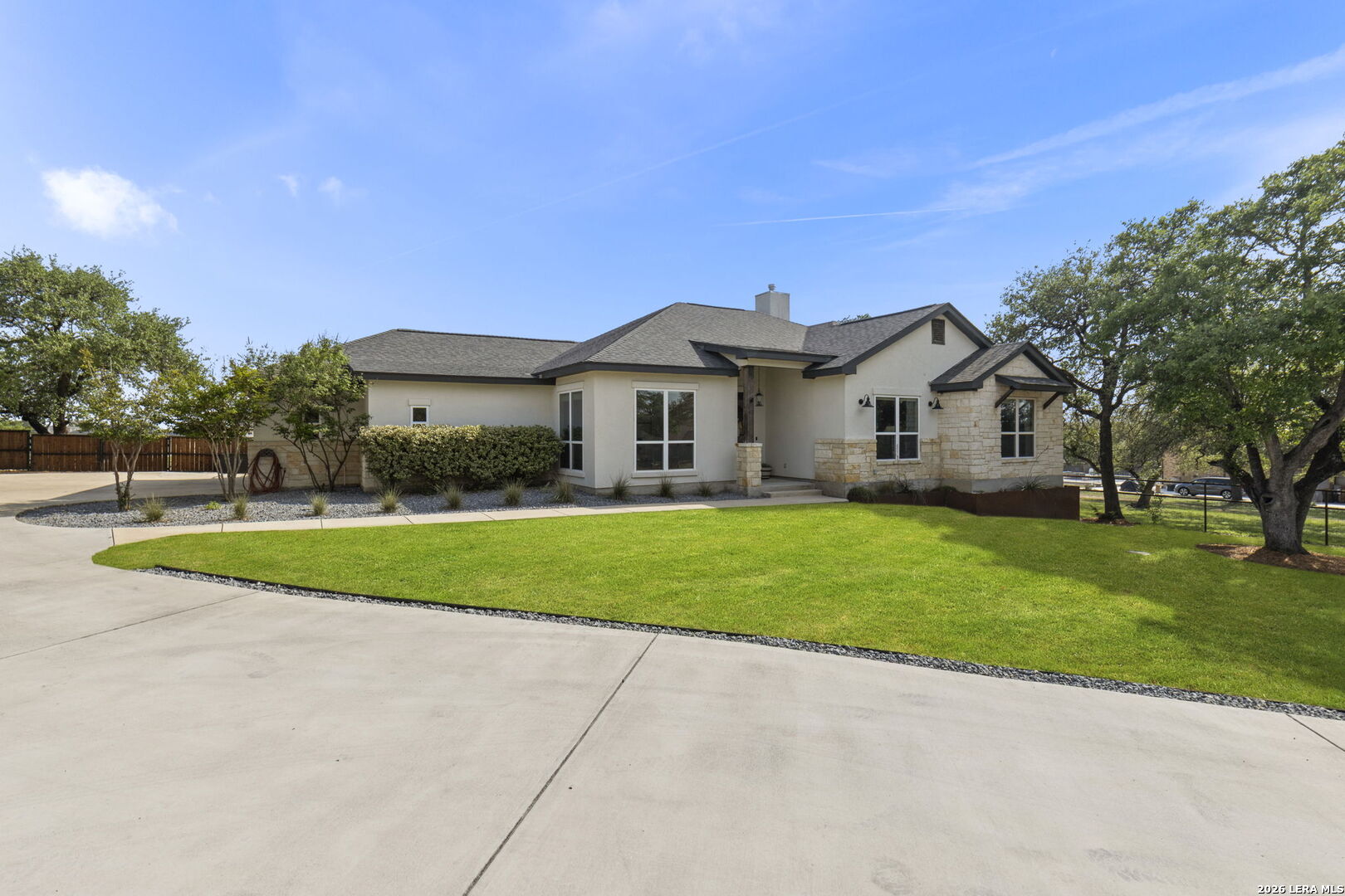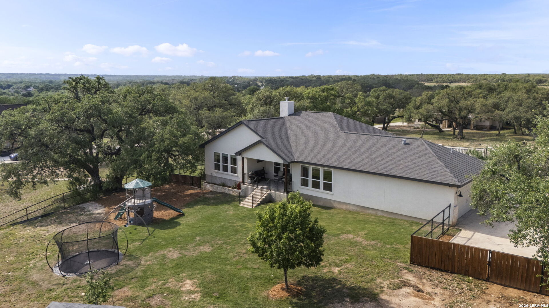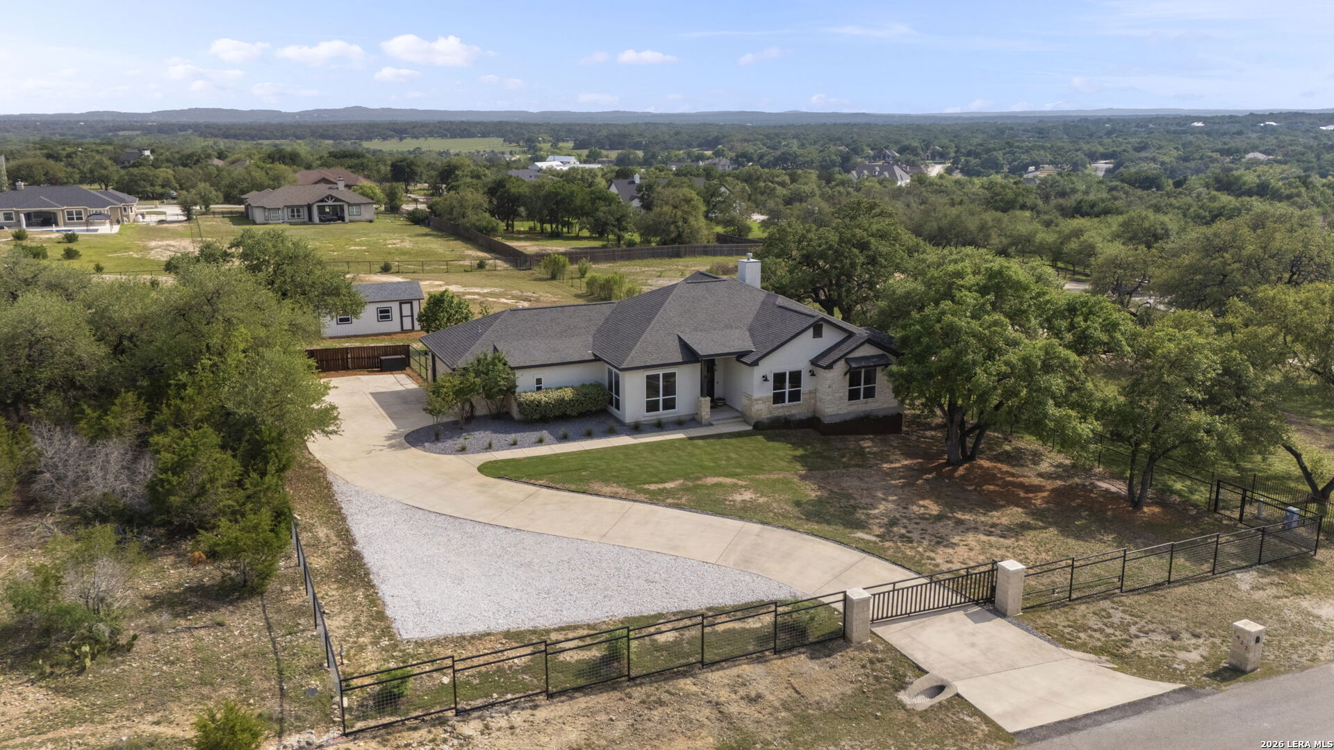 Welcome to Hill Country Living at its best! Situated on a fully fenced 1-acre lot, this home offers the perfect blend of comfort, functionality, and outdoor enjoyment. This single-story home features 4 bedrooms, 2 bathrooms, a 2-car garage and an open-concept layout designed for everyday living and entertaining. Inside, you'll find tile flooring throughout and a desirable split-bedroom floor plan for added privacy. The spacious living room is centered around a beautiful fireplace with custom built-ins and flows seamlessly into the dining area filled with natural light from oversized windows. The kitchen is thoughtfully designed with a large eat in island, Kent Moore cabinetry, gas cooking and generous prep and storage space. The private primary suite overlooks the backyard and features TWO walk-in closets, dual vanities, a stand-alone soaking tub, and separate shower. Secondary bedrooms offer flexibility for guests, office space, or hobbies. The spacious backyard offers peaceful Hill Country views, wide open space and frequent axis and whitetail deer sightings in the evenings. A large 12x24 ft. storage building provides excellent space for hobbies, tools, or extra storage. Neighborhood amenities include a community pool, playground, and walking trails, all conveniently located near the Guadalupe River and the natural beauty of the Texas Hill Country.