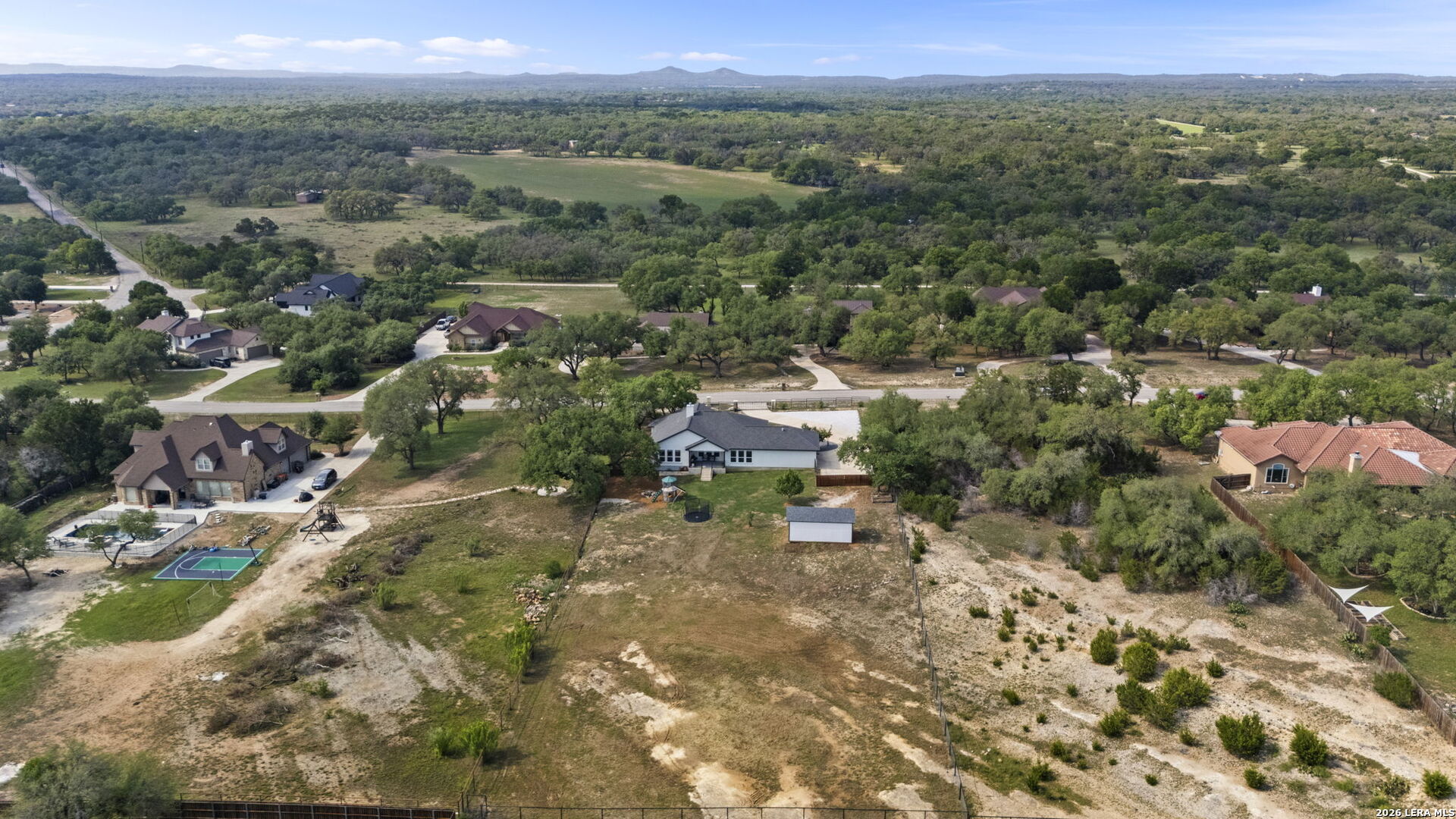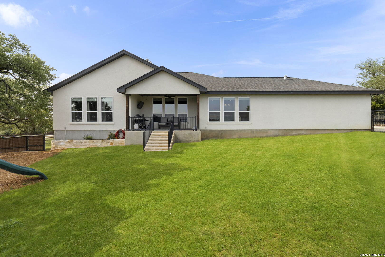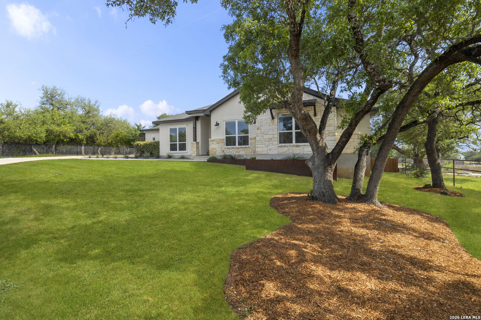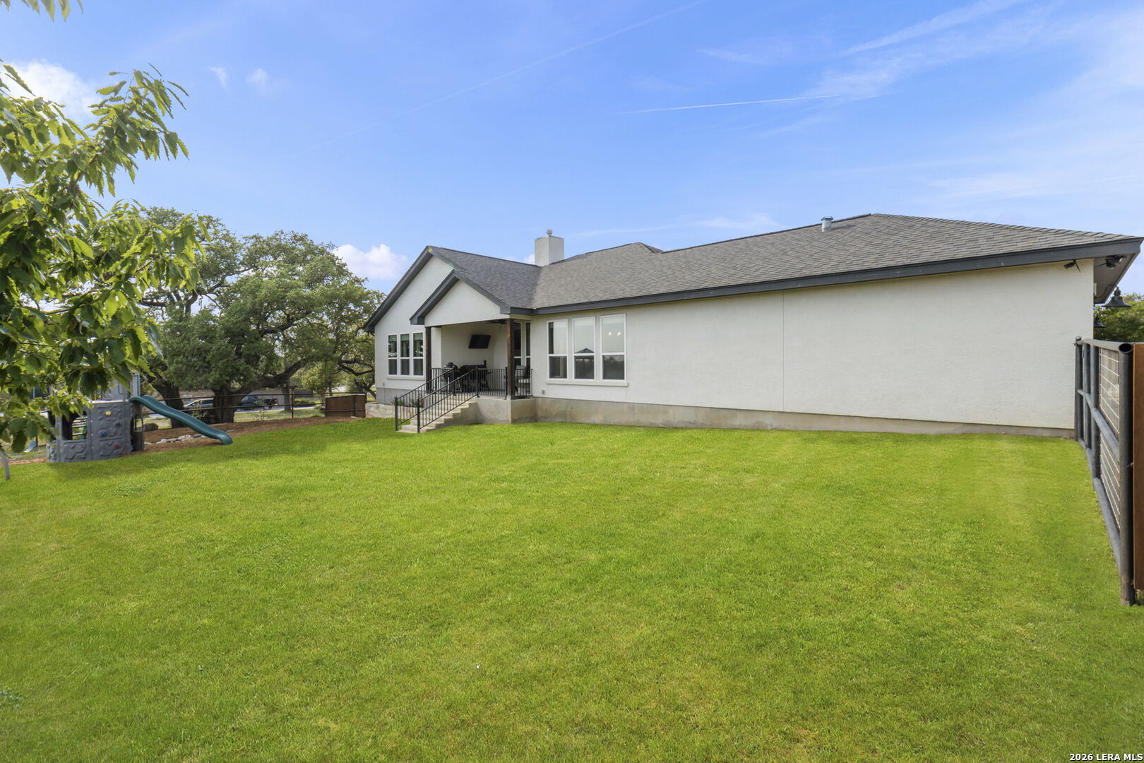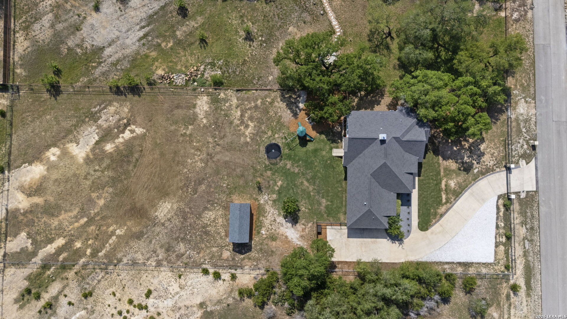 Welcome to Hill Country Living at its best! Situated on a fully fenced 1-acre lot, this home offers the perfect blend of comfort, functionality, and outdoor enjoyment. This single-story home features 4 bedrooms, 2 bathrooms, a 2-car garage and an open-concept layout designed for everyday living and entertaining. Inside, you'll find tile flooring throughout and a desirable split-bedroom floor plan for added privacy. The spacious living room is centered around a beautiful fireplace with custom built-ins and flows seamlessly into the dining area filled with natural light from oversized windows. The kitchen is thoughtfully designed with a large eat in island, Kent Moore cabinetry, gas cooking and generous prep and storage space. The private primary suite overlooks the backyard and features TWO walk-in closets, dual vanities, a stand-alone soaking tub, and separate shower. Secondary bedrooms offer flexibility for guests, office space, or hobbies. The spacious backyard offers peaceful Hill Country views, wide open space and frequent axis and whitetail deer sightings in the evenings. A large 12x24 ft. storage building provides excellent space for hobbies, tools, or extra storage. Neighborhood amenities include a community pool, playground, and walking trails, all conveniently located near the Guadalupe River and the natural beauty of the Texas Hill Country.