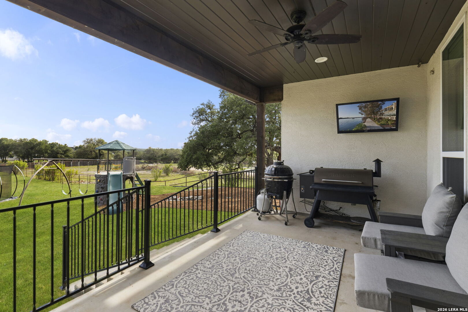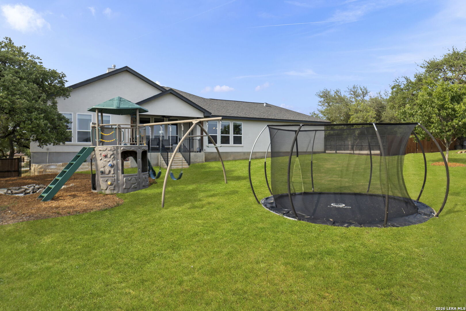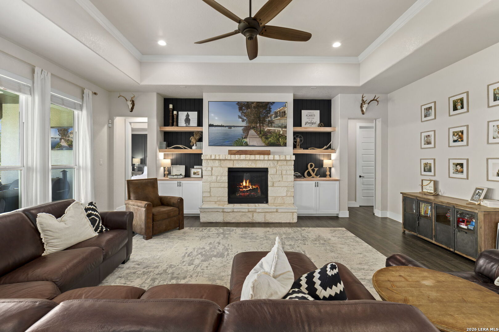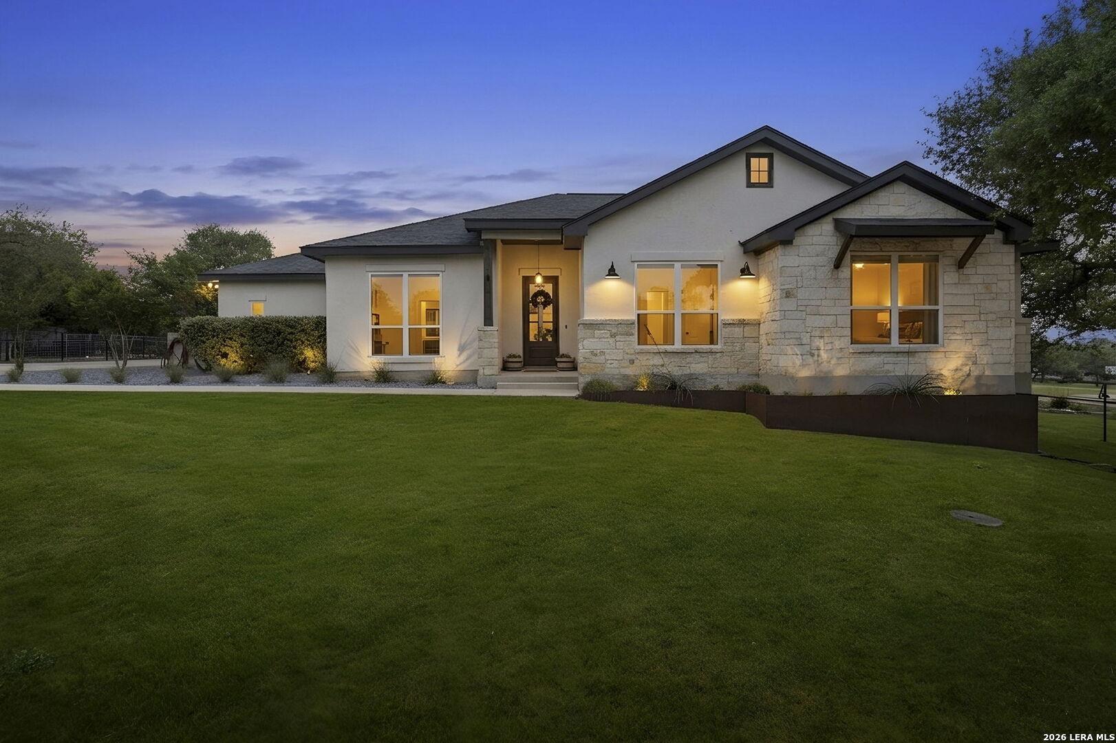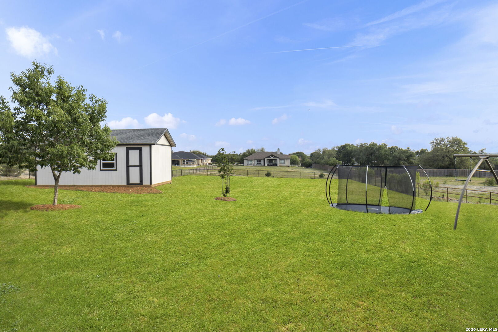 Welcome to Hill Country Living at its best! Situated on a fully fenced 1-acre lot, this home offers the perfect blend of comfort, functionality, and outdoor enjoyment. This single-story home features 4 bedrooms, 2 bathrooms, a 2-car garage and an open-concept layout designed for everyday living and entertaining. Inside, you'll find tile flooring throughout and a desirable split-bedroom floor plan for added privacy. The spacious living room is centered around a beautiful fireplace with custom built-ins and flows seamlessly into the dining area filled with natural light from oversized windows. The kitchen is thoughtfully designed with a large eat in island, Kent Moore cabinetry, gas cooking and generous prep and storage space. The private primary suite overlooks the backyard and features TWO walk-in closets, dual vanities, a stand-alone soaking tub, and separate shower. Secondary bedrooms offer flexibility for guests, office space, or hobbies. The spacious backyard offers peaceful Hill Country views, wide open space and frequent axis and whitetail deer sightings in the evenings. A large 12x24 ft. storage building provides excellent space for hobbies, tools, or extra storage. Neighborhood amenities include a community pool, playground, and walking trails, all conveniently located near the Guadalupe River and the natural beauty of the Texas Hill Country.