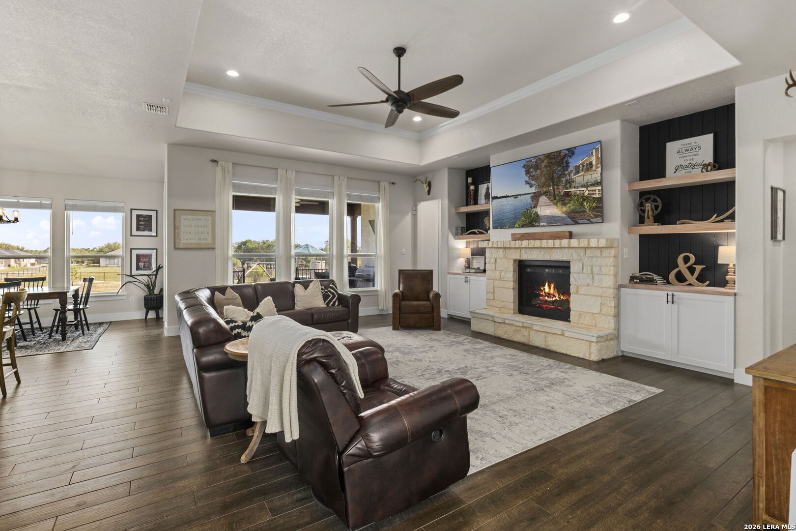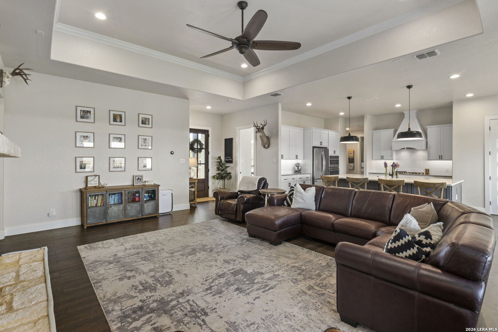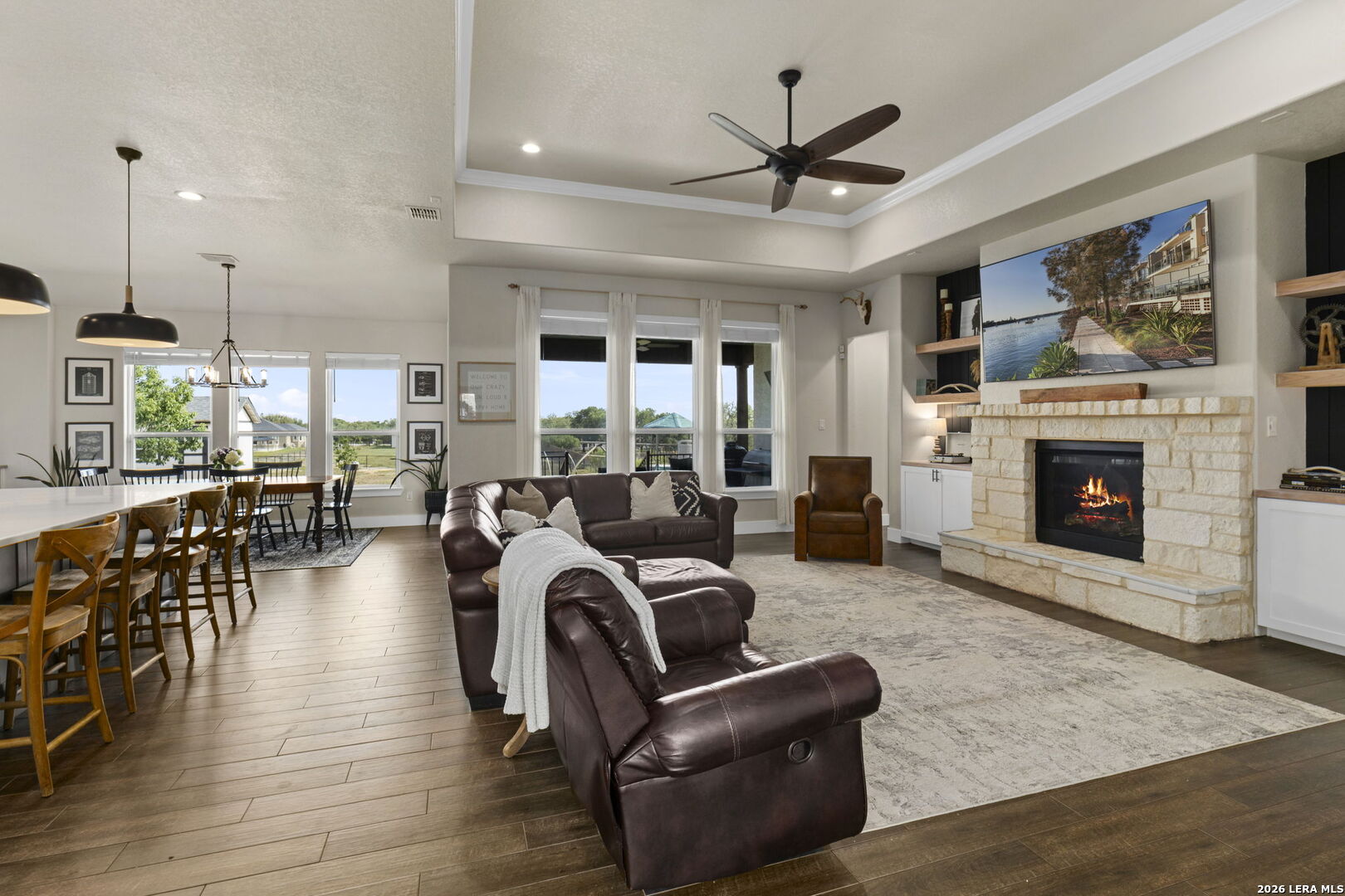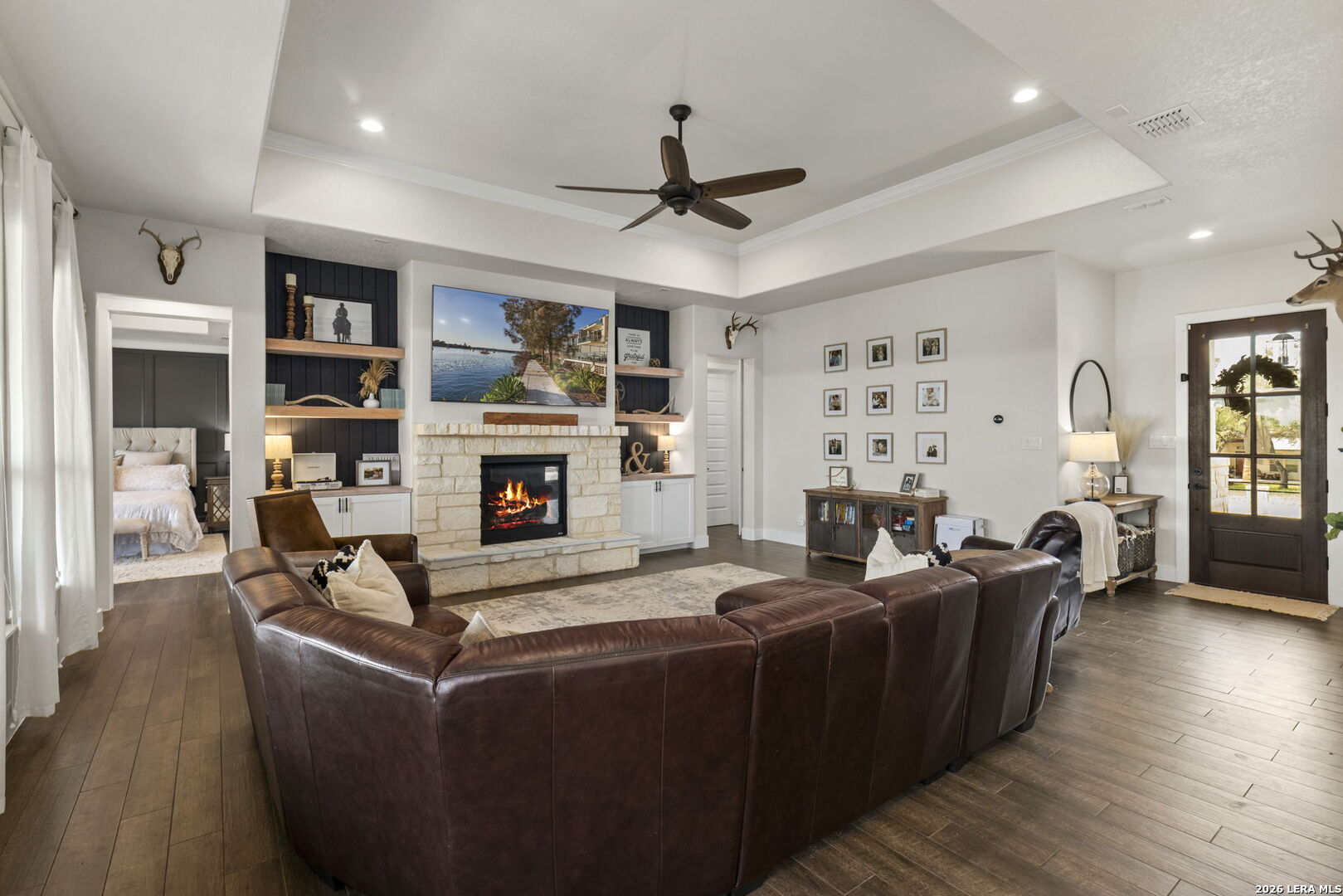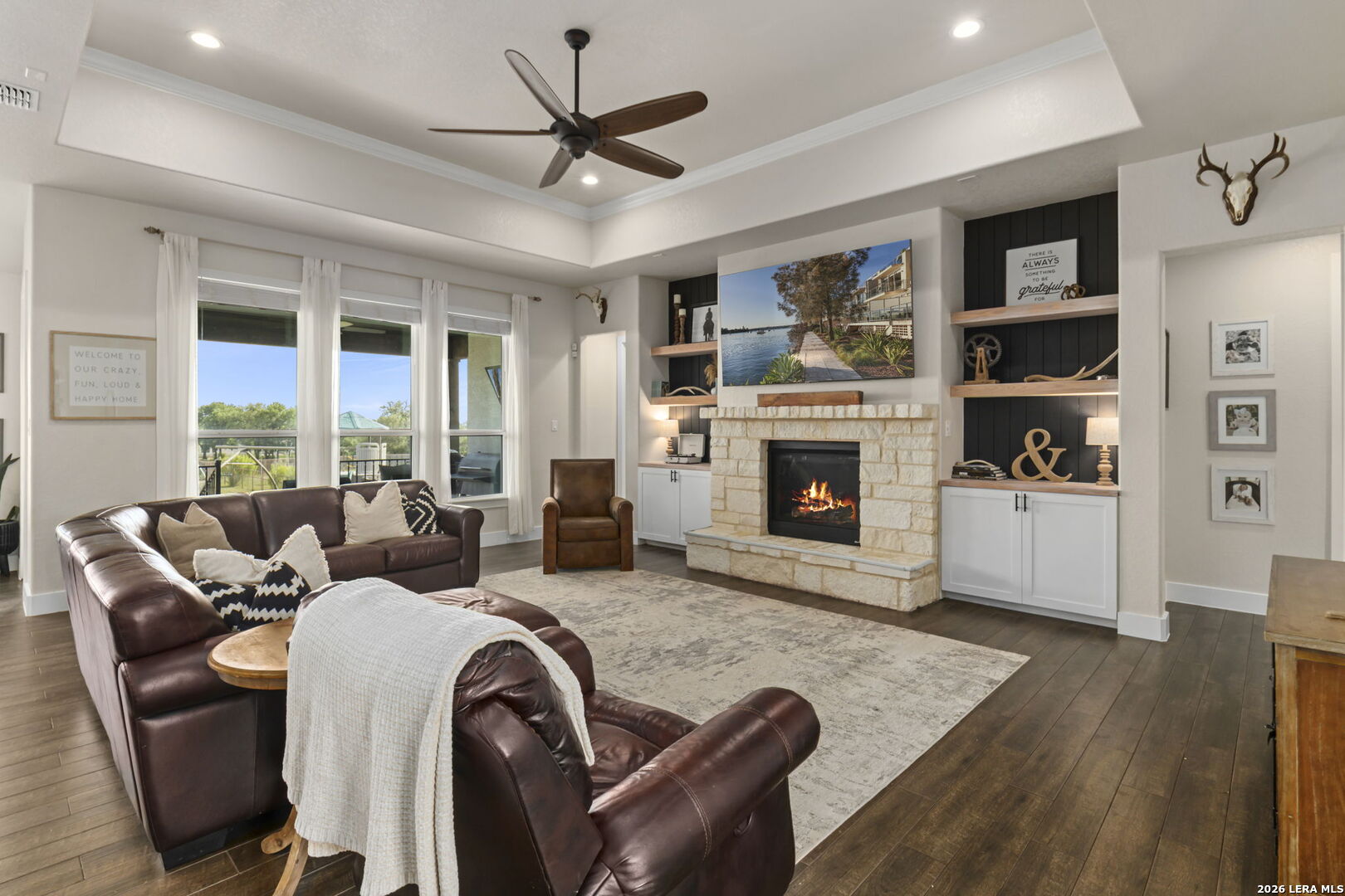 Welcome to Hill Country Living at its best! Situated on a fully fenced 1-acre lot, this home offers the perfect blend of comfort, functionality, and outdoor enjoyment. This single-story home features 4 bedrooms, 2 bathrooms, a 2-car garage and an open-concept layout designed for everyday living and entertaining. Inside, you'll find tile flooring throughout and a desirable split-bedroom floor plan for added privacy. The spacious living room is centered around a beautiful fireplace with custom built-ins and flows seamlessly into the dining area filled with natural light from oversized windows. The kitchen is thoughtfully designed with a large eat in island, Kent Moore cabinetry, gas cooking and generous prep and storage space. The private primary suite overlooks the backyard and features TWO walk-in closets, dual vanities, a stand-alone soaking tub, and separate shower. Secondary bedrooms offer flexibility for guests, office space, or hobbies. The spacious backyard offers peaceful Hill Country views, wide open space and frequent axis and whitetail deer sightings in the evenings. A large 12x24 ft. storage building provides excellent space for hobbies, tools, or extra storage. Neighborhood amenities include a community pool, playground, and walking trails, all conveniently located near the Guadalupe River and the natural beauty of the Texas Hill Country.