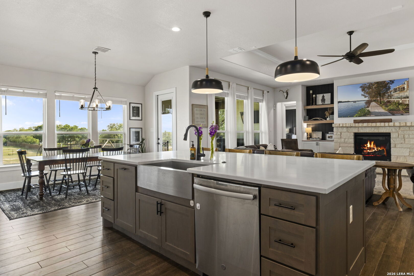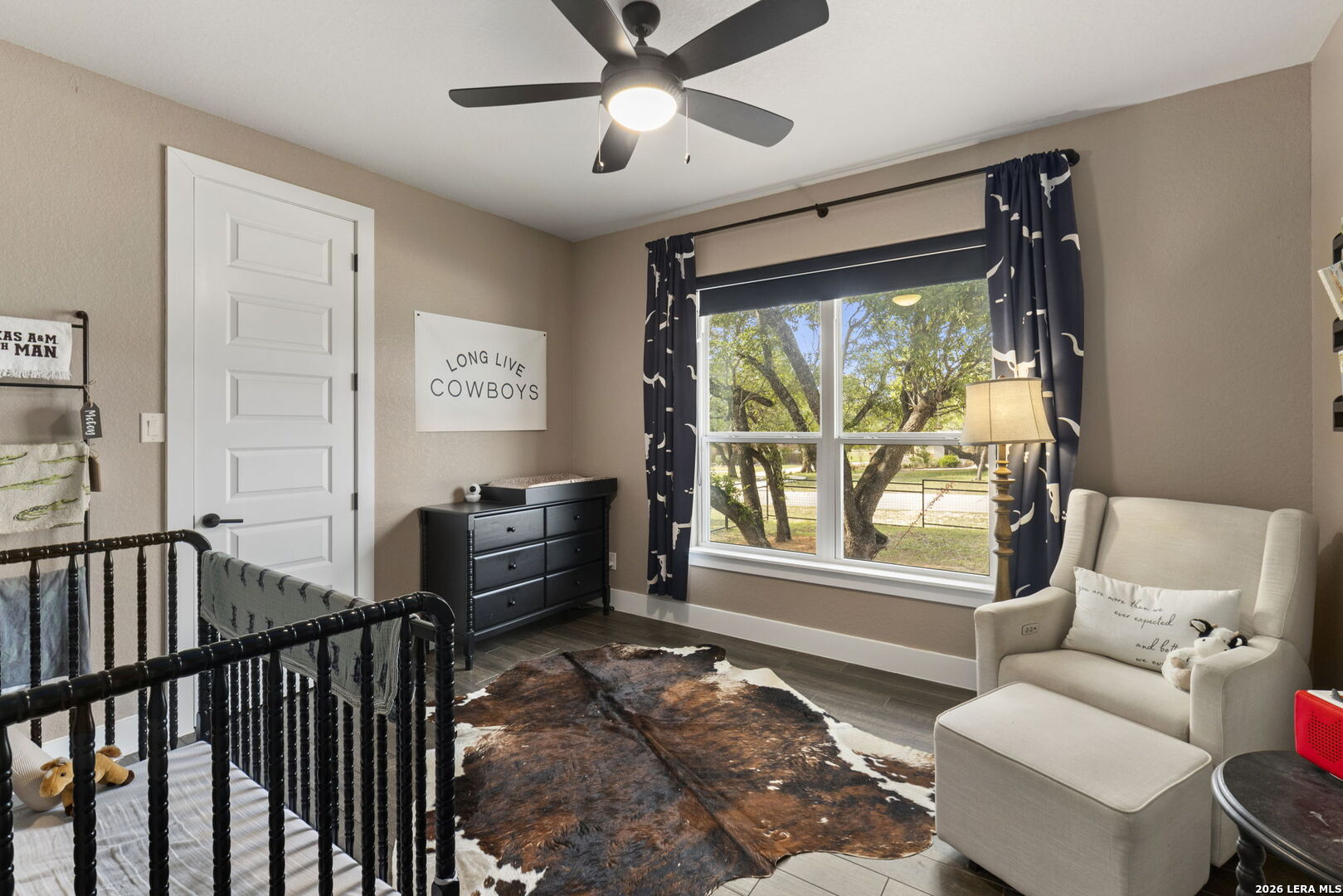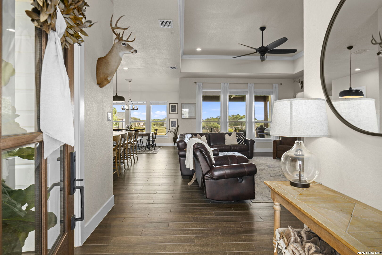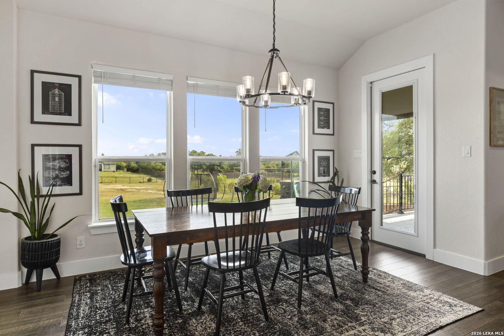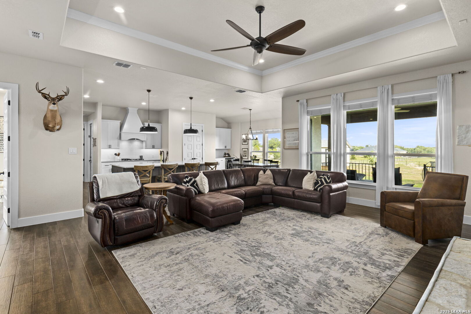 Welcome to Hill Country Living at its best! Situated on a fully fenced 1-acre lot, this home offers the perfect blend of comfort, functionality, and outdoor enjoyment. This single-story home features 4 bedrooms, 2 bathrooms, a 2-car garage and an open-concept layout designed for everyday living and entertaining. Inside, you'll find tile flooring throughout and a desirable split-bedroom floor plan for added privacy. The spacious living room is centered around a beautiful fireplace with custom built-ins and flows seamlessly into the dining area filled with natural light from oversized windows. The kitchen is thoughtfully designed with a large eat in island, Kent Moore cabinetry, gas cooking and generous prep and storage space. The private primary suite overlooks the backyard and features TWO walk-in closets, dual vanities, a stand-alone soaking tub, and separate shower. Secondary bedrooms offer flexibility for guests, office space, or hobbies. The spacious backyard offers peaceful Hill Country views, wide open space and frequent axis and whitetail deer sightings in the evenings. A large 12x24 ft. storage building provides excellent space for hobbies, tools, or extra storage. Neighborhood amenities include a community pool, playground, and walking trails, all conveniently located near the Guadalupe River and the natural beauty of the Texas Hill Country.