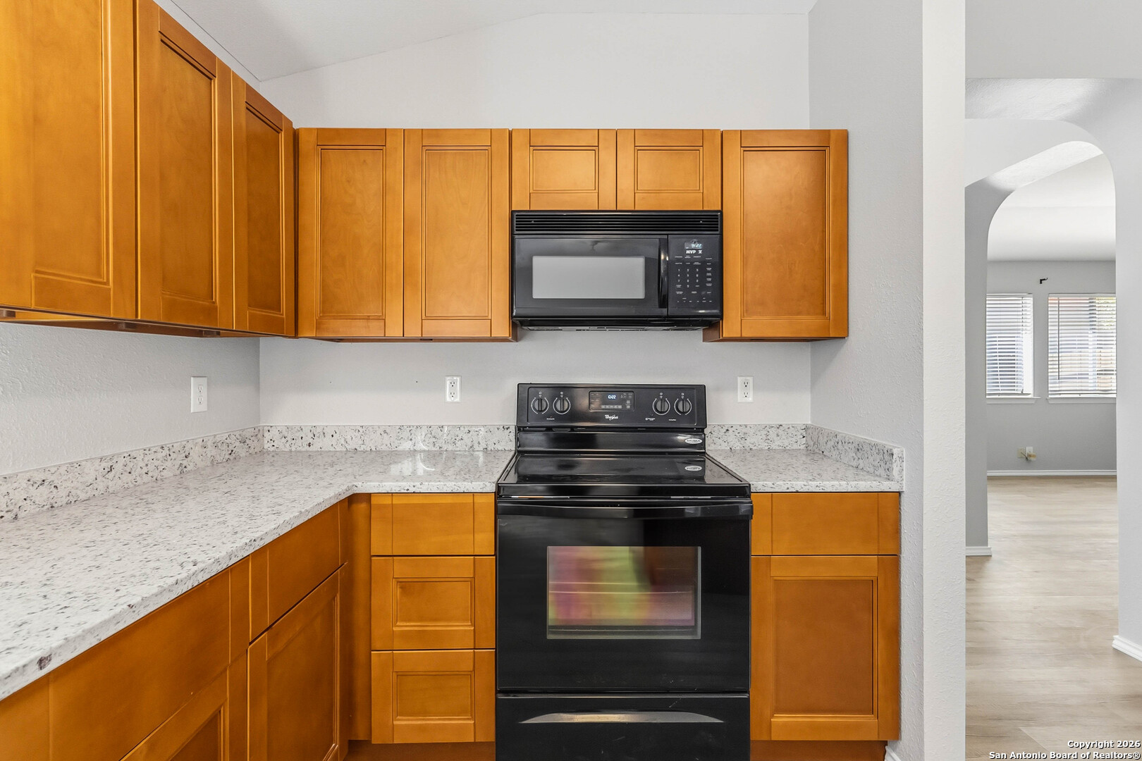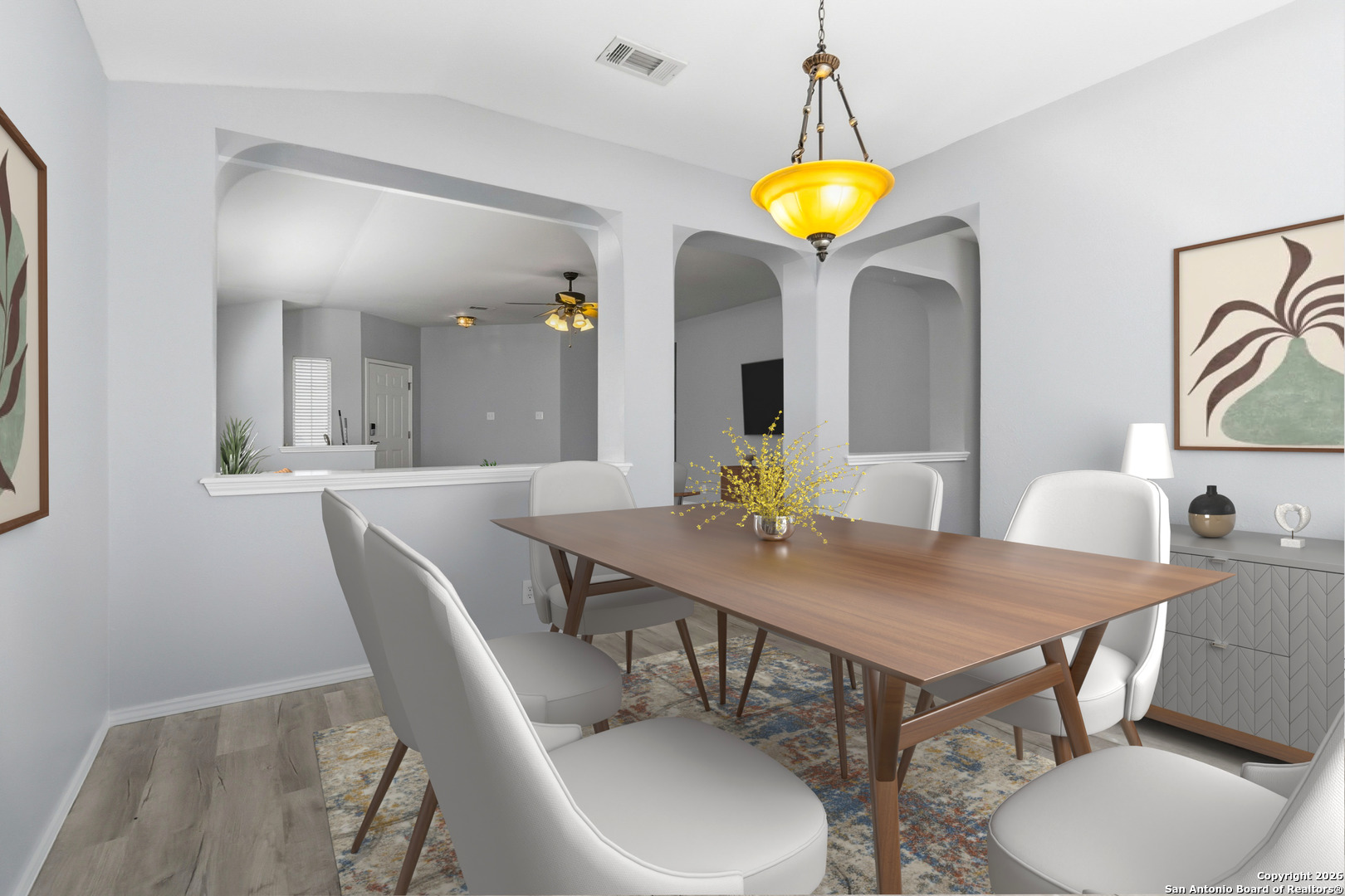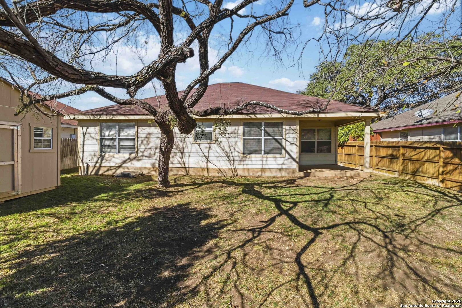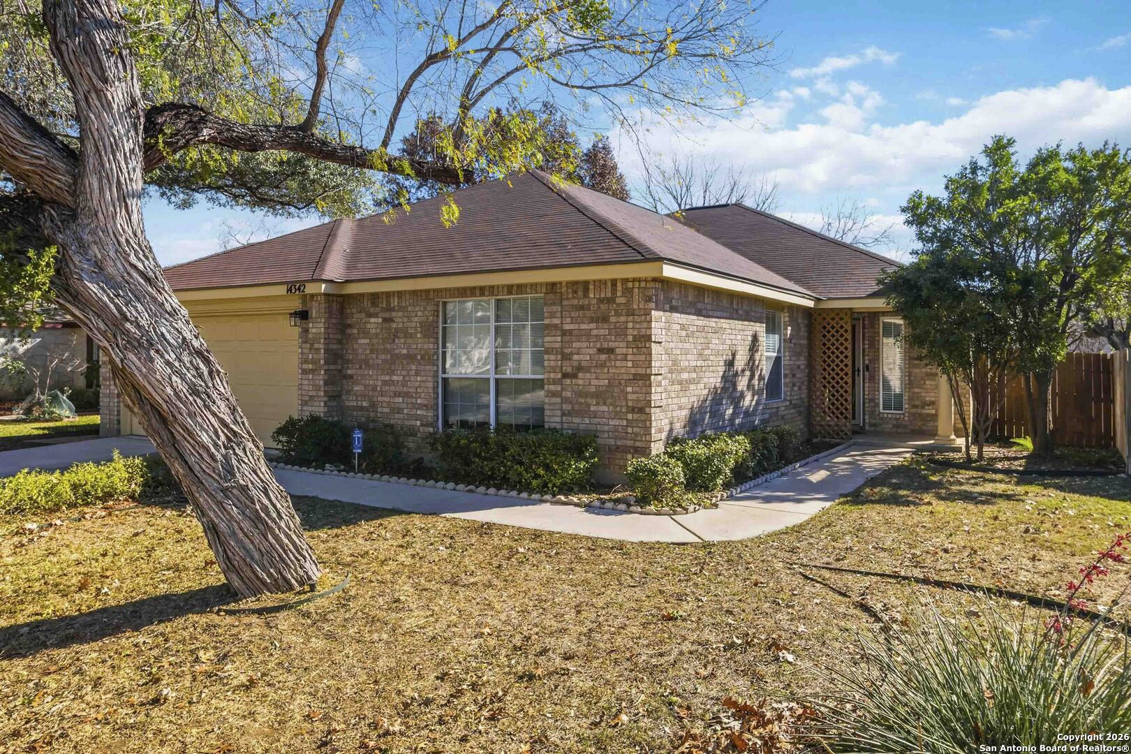 Welcome home! This charming single-story residence is located within the tranquil, gated Thousand Oaks Forest community. The front porch, shaded by a distinguished tree, provides a comfortable space for relaxation. Upon entry, vinyl flooring extends through the open plan living and dining areas. The kitchen features new cabinetry and flooring, as well as an island equipped with a built-in microwave, stove, and refrigerator, seamlessly connecting to a bright breakfast nook and a recently painted family room in contemporary gray tones. Outdoor amenities include a covered patio surrounded by mature mistletoe and mesquite trees, complemented by a spacious, convenient storage shed. Elementary school in walking distance. Stores within 5 miles of neighborhood.