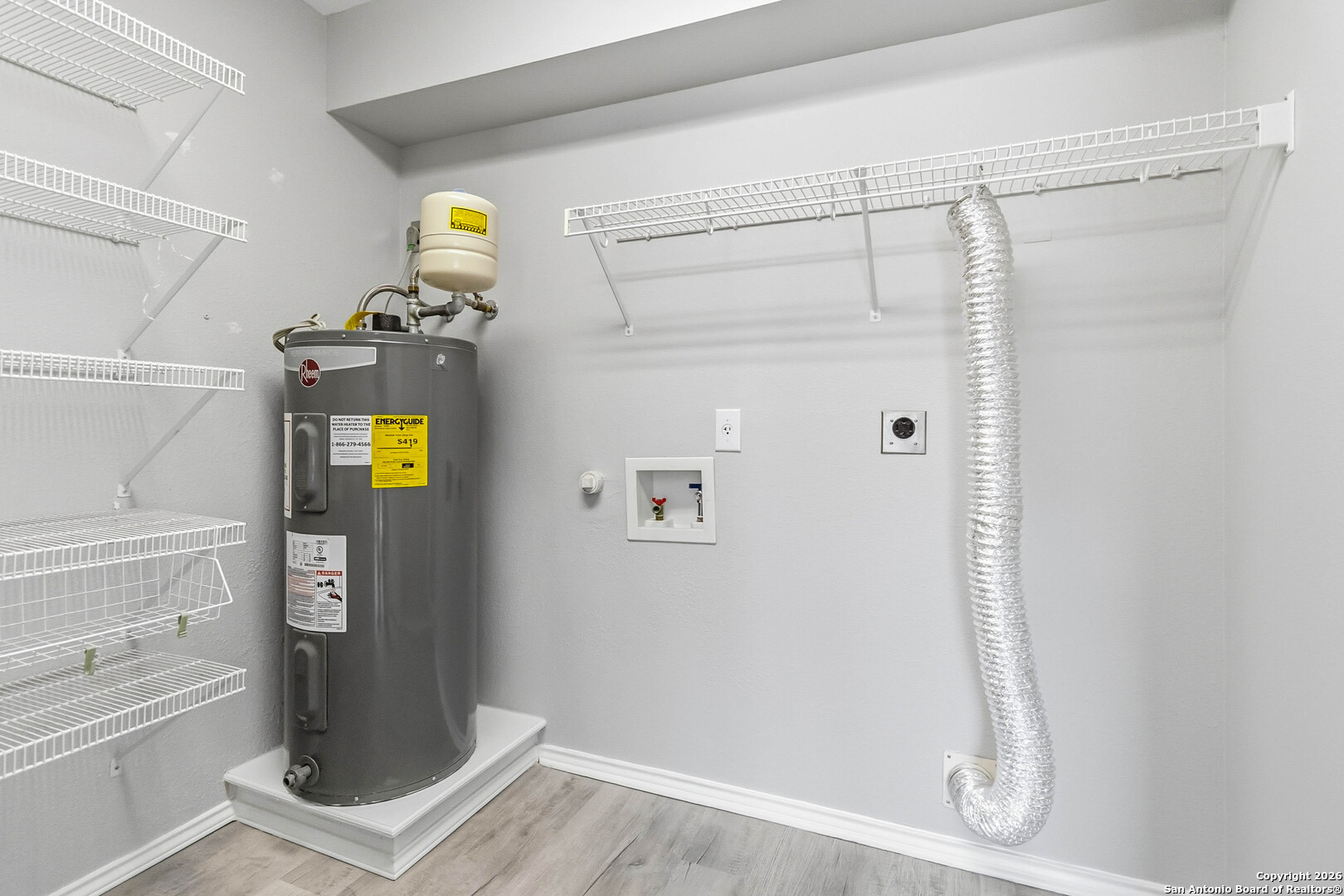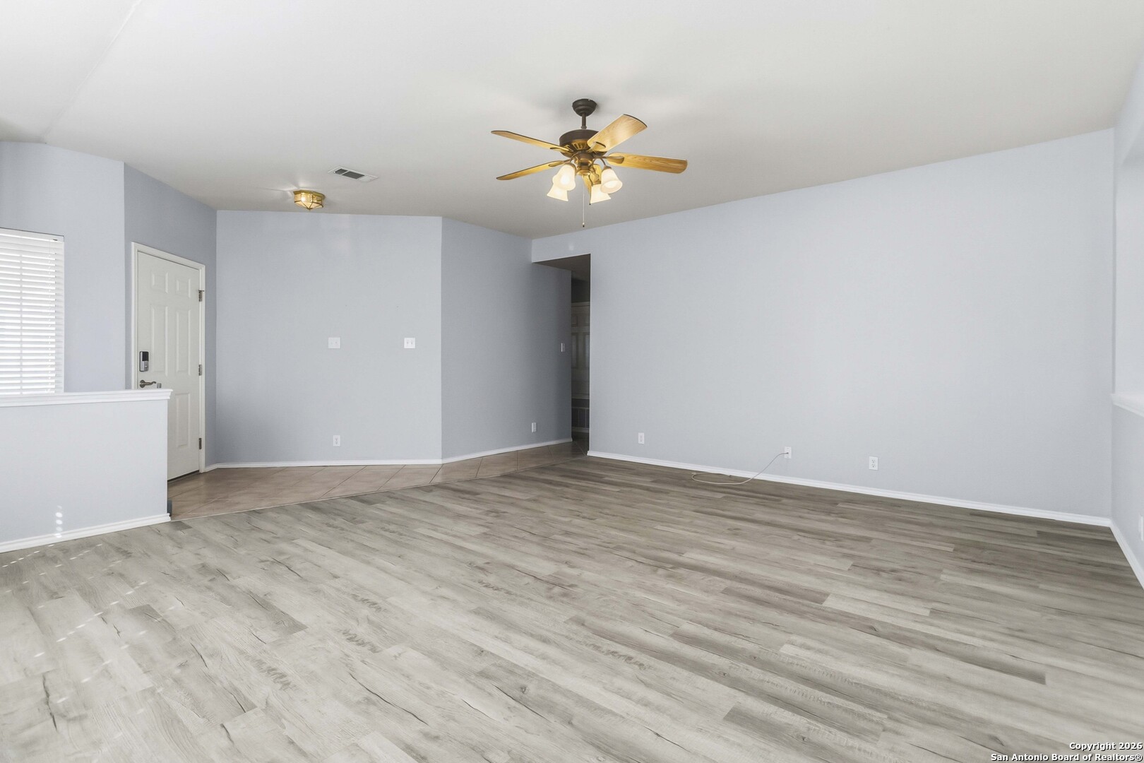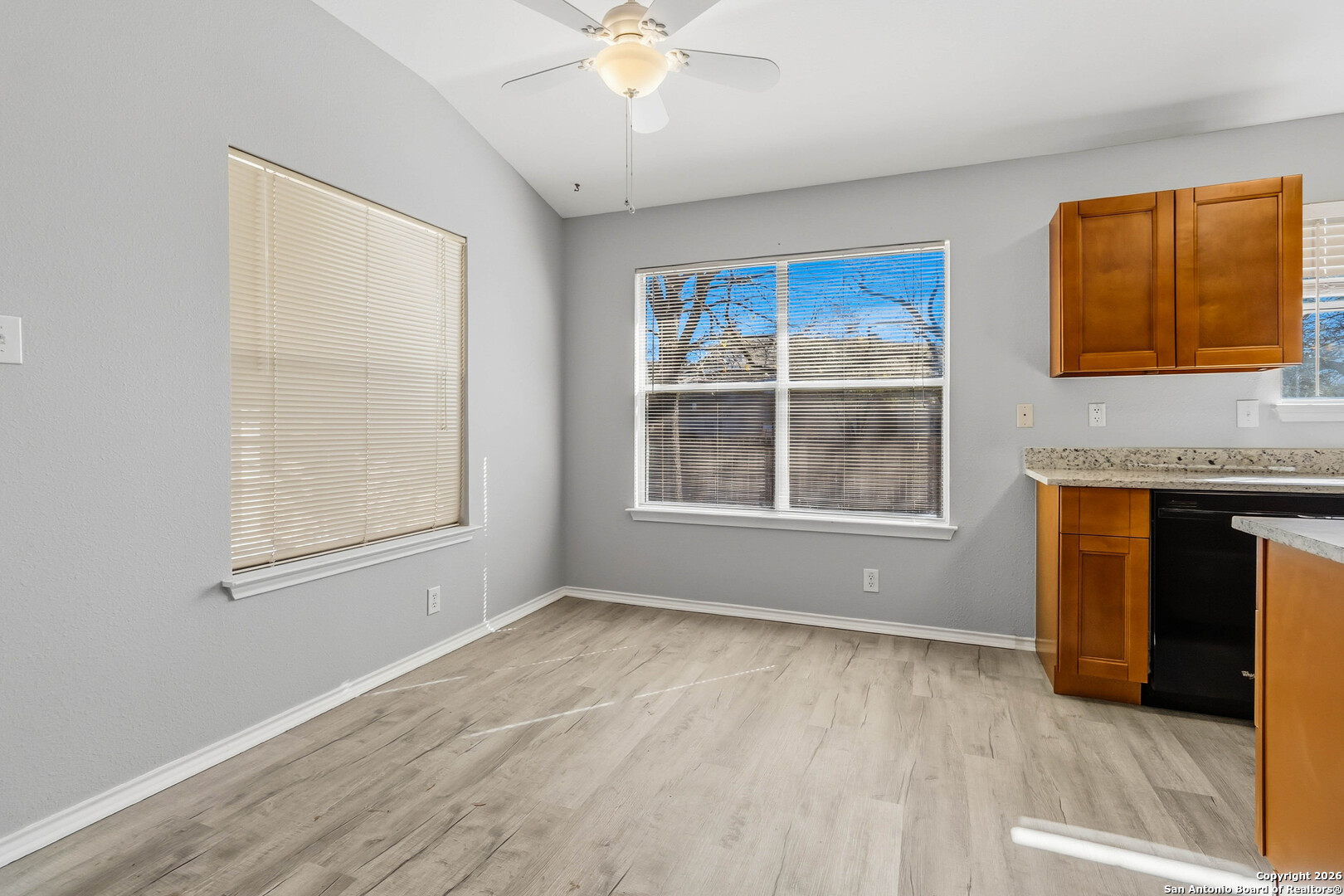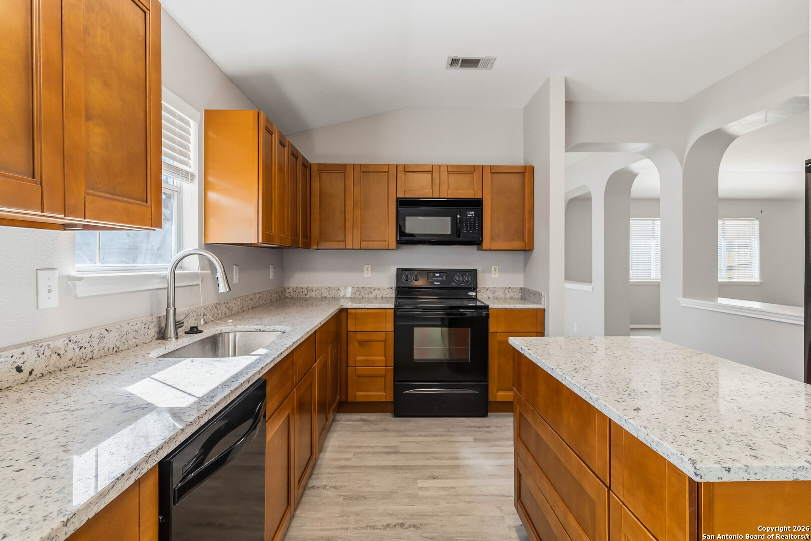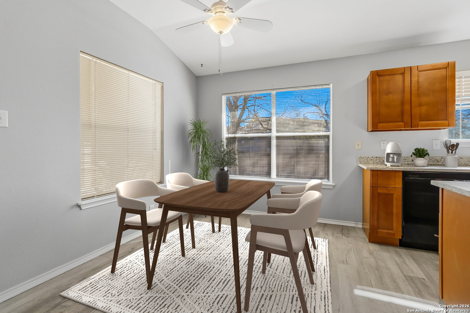 Welcome home! This charming single-story residence is located within the tranquil, gated Thousand Oaks Forest community. The front porch, shaded by a distinguished tree, provides a comfortable space for relaxation. Upon entry, vinyl flooring extends through the open plan living and dining areas. The kitchen features new cabinetry and flooring, as well as an island equipped with a built-in microwave, stove, and refrigerator, seamlessly connecting to a bright breakfast nook and a recently painted family room in contemporary gray tones. Outdoor amenities include a covered patio surrounded by mature mistletoe and mesquite trees, complemented by a spacious, convenient storage shed. Elementary school in walking distance. Stores within 5 miles of neighborhood.