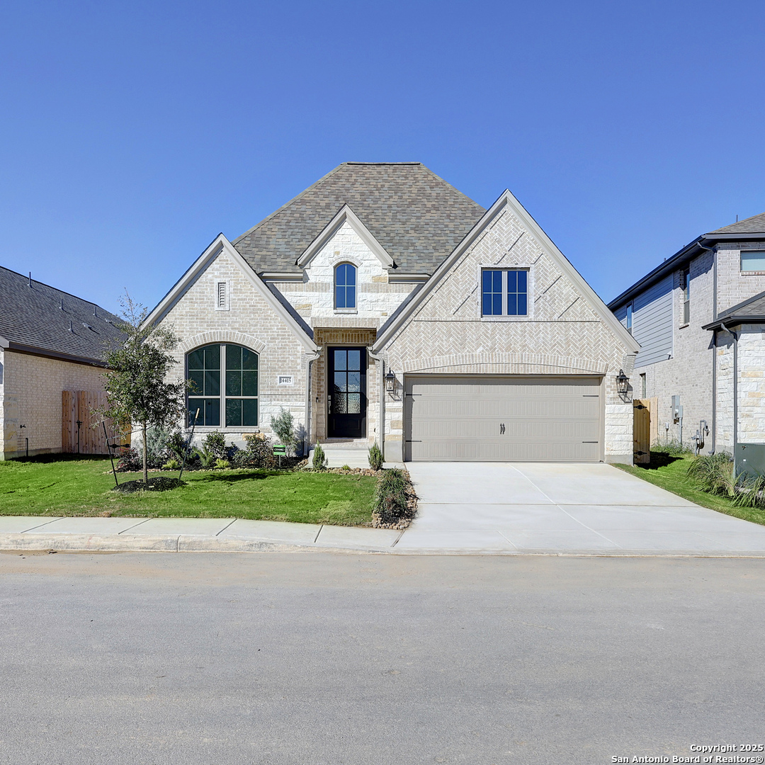 Extended entry with 13-foot ceiling leads to open kitchen, dining area and family room. Kitchen offers generous counter space, 5-burner gas cooktop, corner walk-in pantry and inviting island with built-in seating space. Dining area flows into family room with wall of windows. Game room with French doors just across from kitchen. Primary suite includes double-door entry to primary bath with dual vanities, garden tub, separate glass-enclosed shower and two large walk-in closets. Secondary bedrooms feature walk-in closets. Extended covered backyard patio and 5-zone sprinkler system. Mud room off two-car garage.