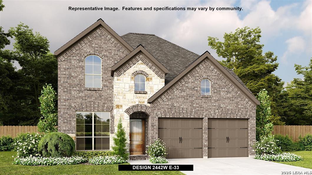 Home office with French doors set at two-story entry. Two-story family room opens to kitchen and morning area. Kitchen features large walk-in pantry, a 5-burner gas cooktop, and generous island with built-in seating space. Family room features wall of windows. First-floor primary suite includes bedroom with wall of windows. Dual sinks, garden tub, separate glass-enclosed shower and large walk-in closet in primary bath. Game room and all secondary bedrooms are upstairs. Extended covered backyard patio. Landscape features a 5-zone sprinkler system. Two-car garage.