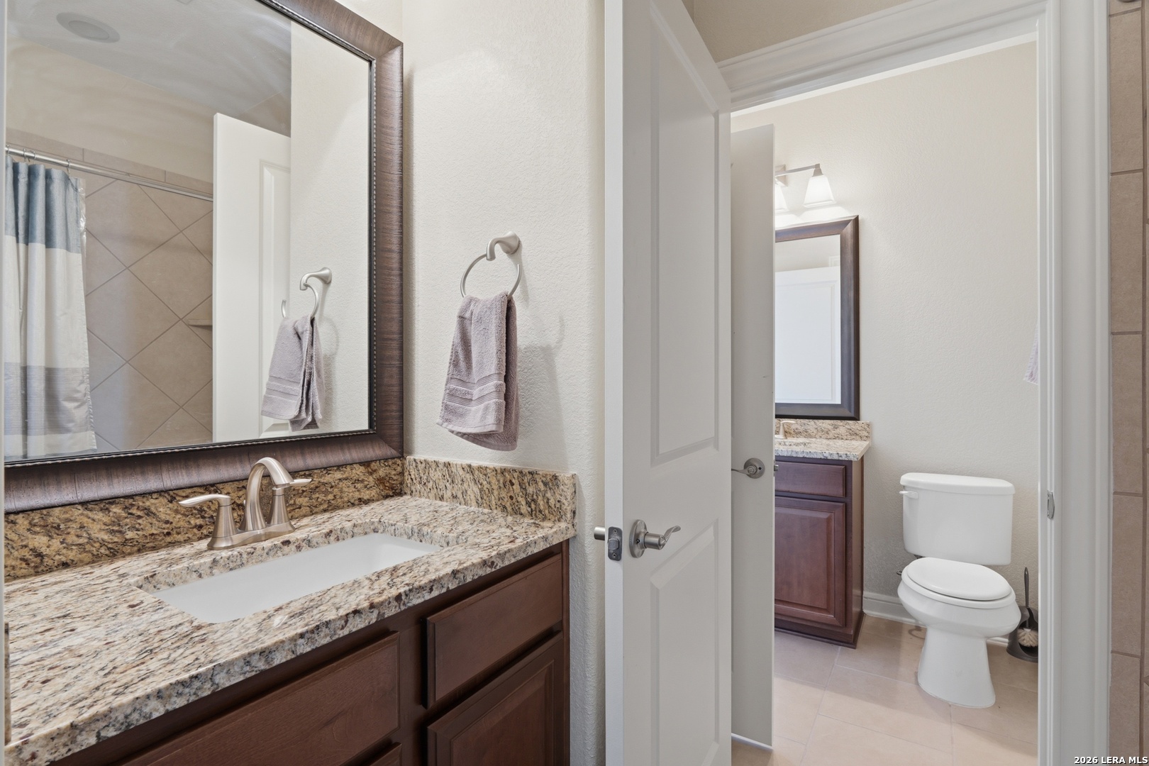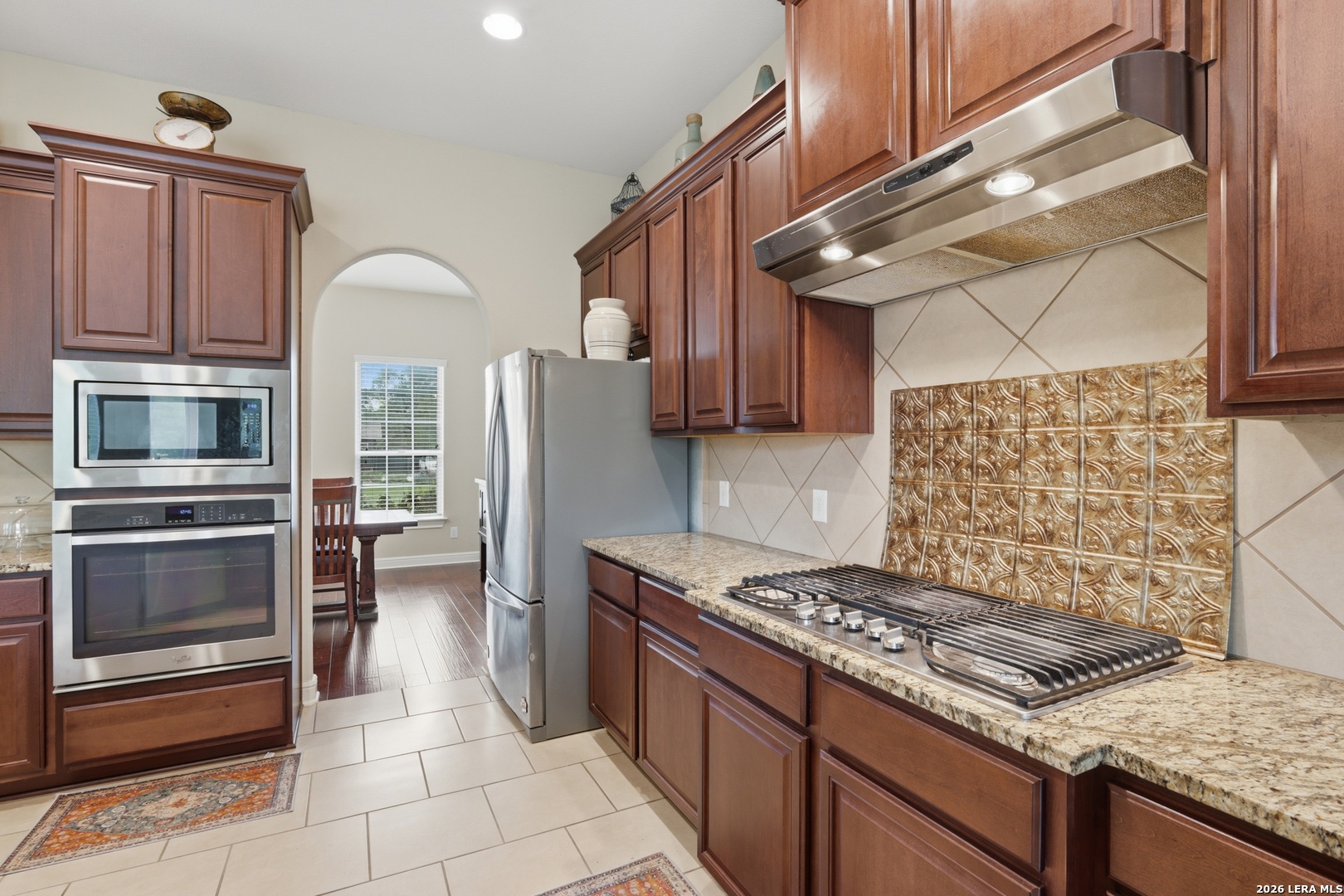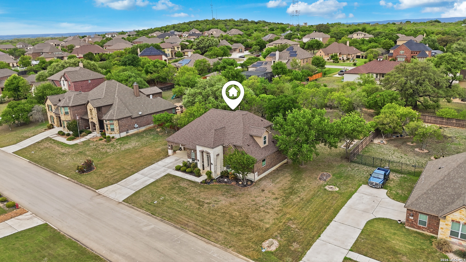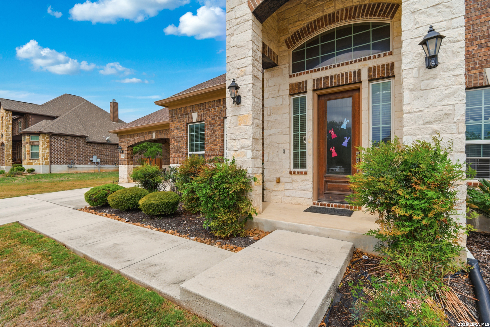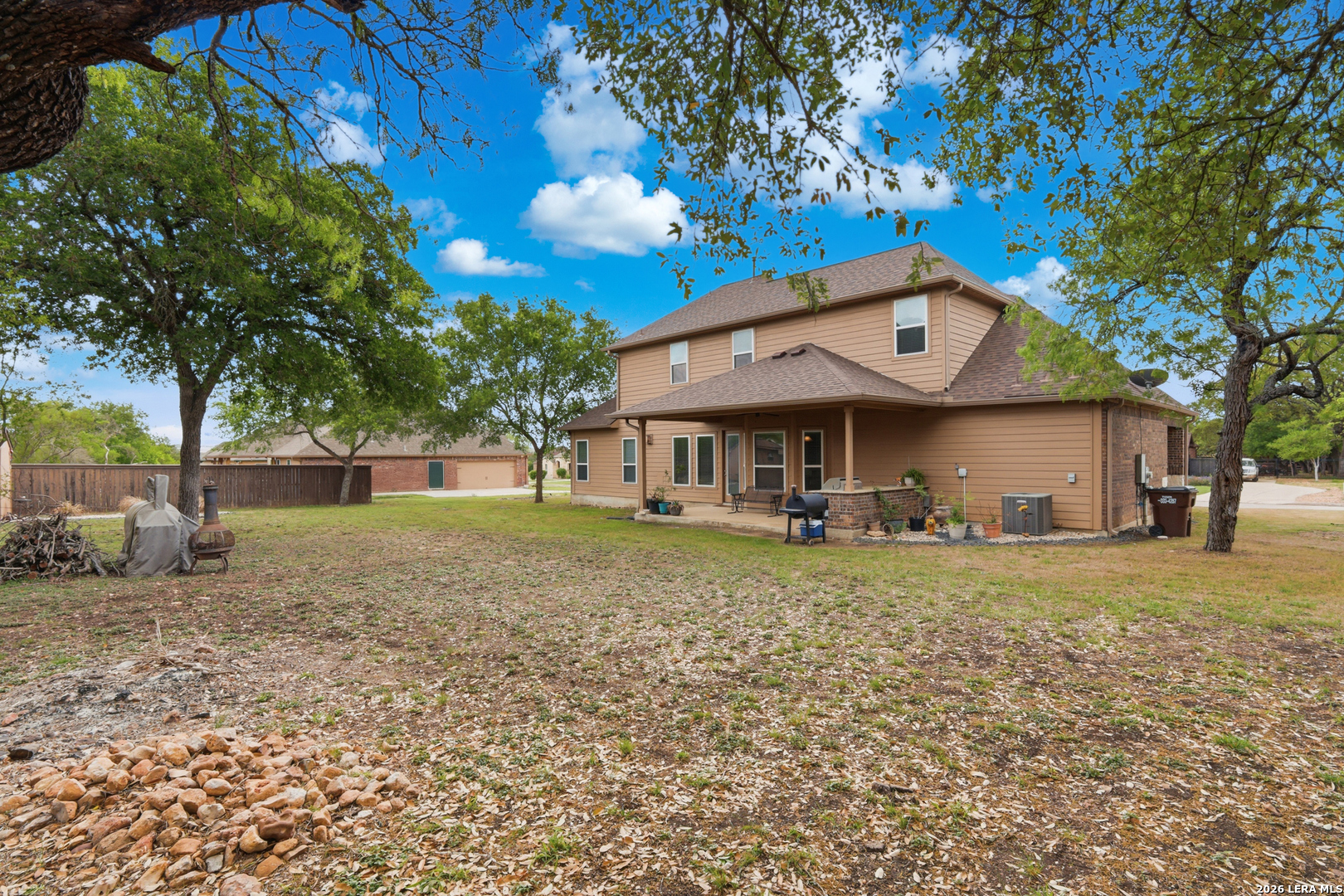 Elegant two story home located in the gated community of Potranco Ranch near Castroville, featuring a timeless all brick exterior and thoughtfully designed interior spaces. This two story home near Castroville offers an airy feel with high ceilings, an open floor plan, and recessed lighting throughout that enhances the natural flow of the home. The main living area centers around a stylish fireplace with a mantel, creating a warm focal point that seamlessly connects to the kitchen. Designed for both function and style, the kitchen is a chef's kitchen complete with granite countertops, a gas cooktop, built in oven, and stainless steel appliances, making it ideal for everyday living and entertaining. The primary suite downstairs provides a private retreat, featuring a spacious layout, a large walk in closet, and a well appointed bath with a soaking tub and double vanities. Step outside to enjoy a fully equipped backyard designed for relaxation and gatherings. The space includes a covered patio, outdoor kitchen with a stainless outdoor grill, a storage shed, and rain gutters already installed. The property backs to an easement, offering added separation and a more open feel.