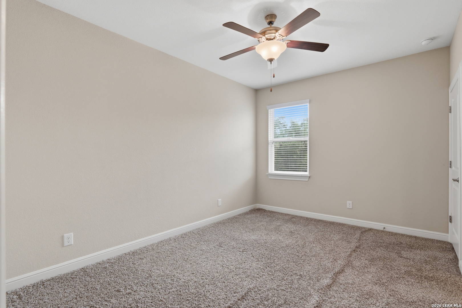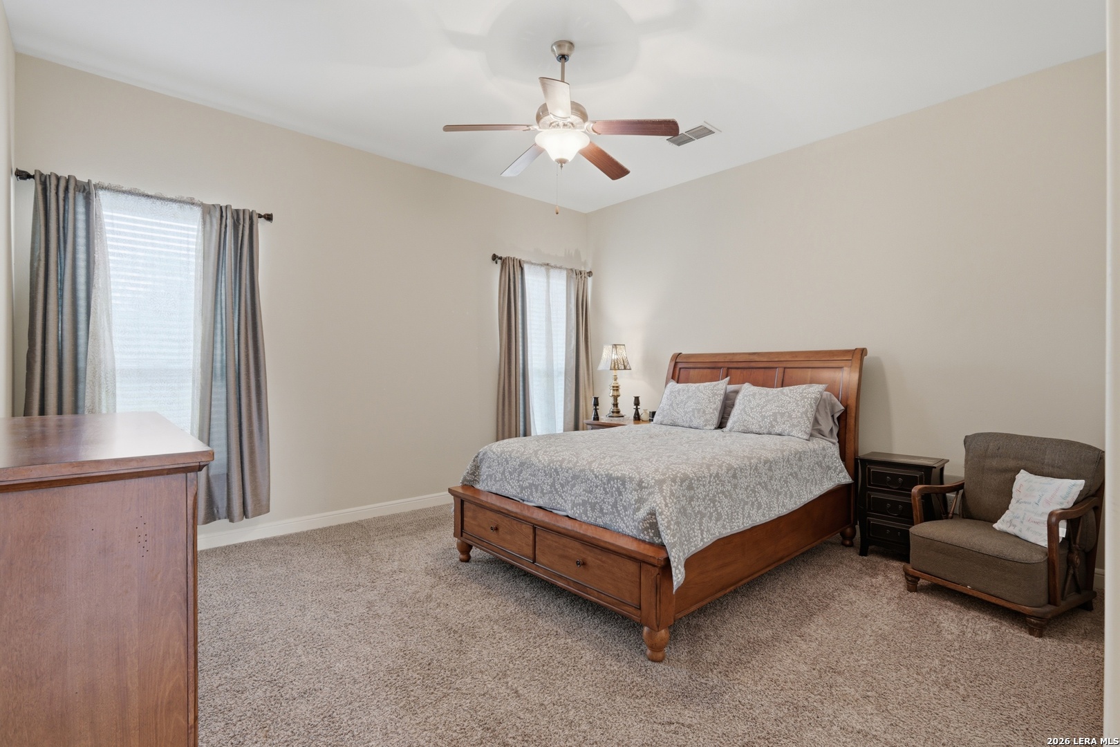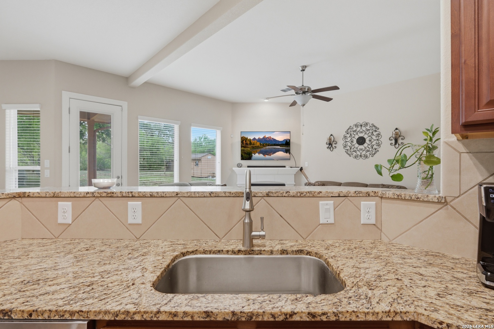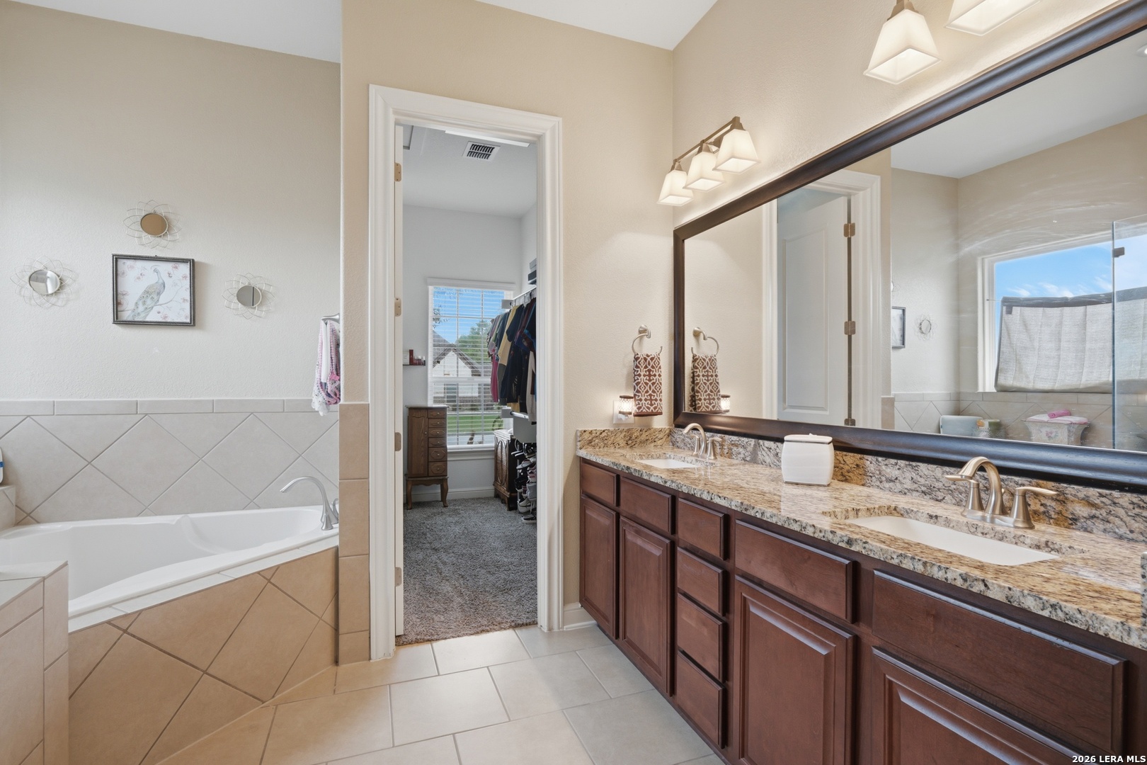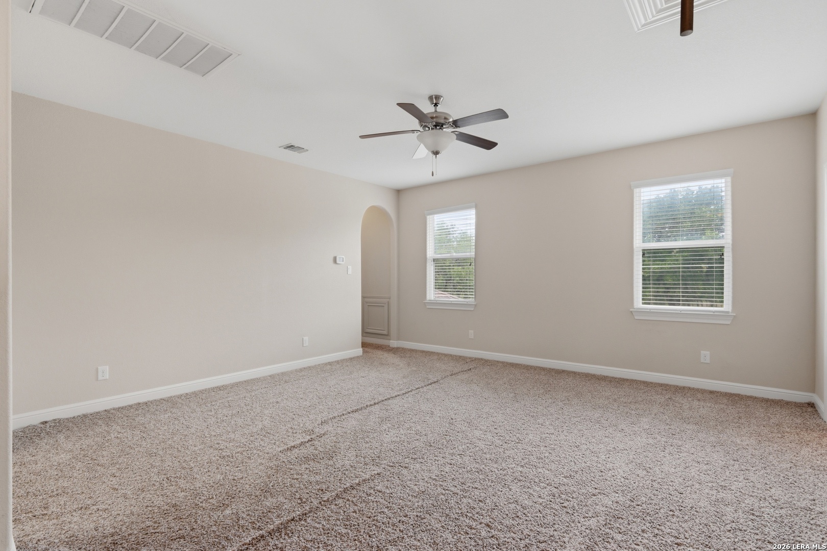 Elegant two story home located in the gated community of Potranco Ranch near Castroville, featuring a timeless all brick exterior and thoughtfully designed interior spaces. This two story home near Castroville offers an airy feel with high ceilings, an open floor plan, and recessed lighting throughout that enhances the natural flow of the home. The main living area centers around a stylish fireplace with a mantel, creating a warm focal point that seamlessly connects to the kitchen. Designed for both function and style, the kitchen is a chef's kitchen complete with granite countertops, a gas cooktop, built in oven, and stainless steel appliances, making it ideal for everyday living and entertaining. The primary suite downstairs provides a private retreat, featuring a spacious layout, a large walk in closet, and a well appointed bath with a soaking tub and double vanities. Step outside to enjoy a fully equipped backyard designed for relaxation and gatherings. The space includes a covered patio, outdoor kitchen with a stainless outdoor grill, a storage shed, and rain gutters already installed. The property backs to an easement, offering added separation and a more open feel.