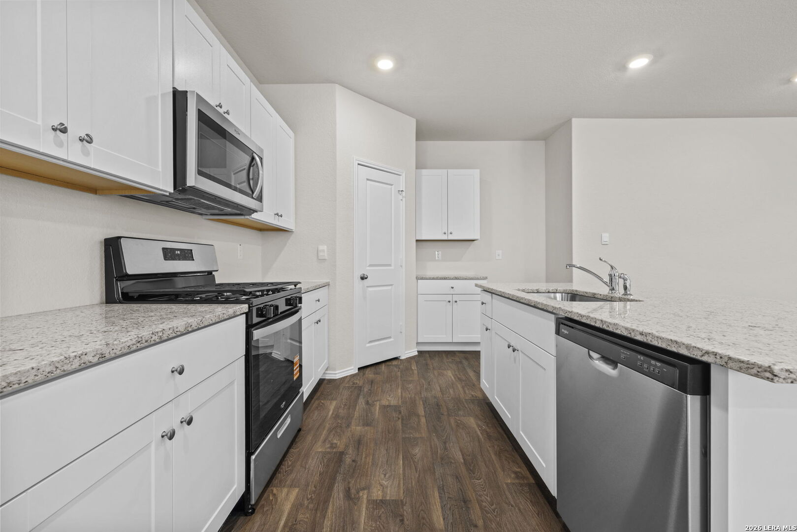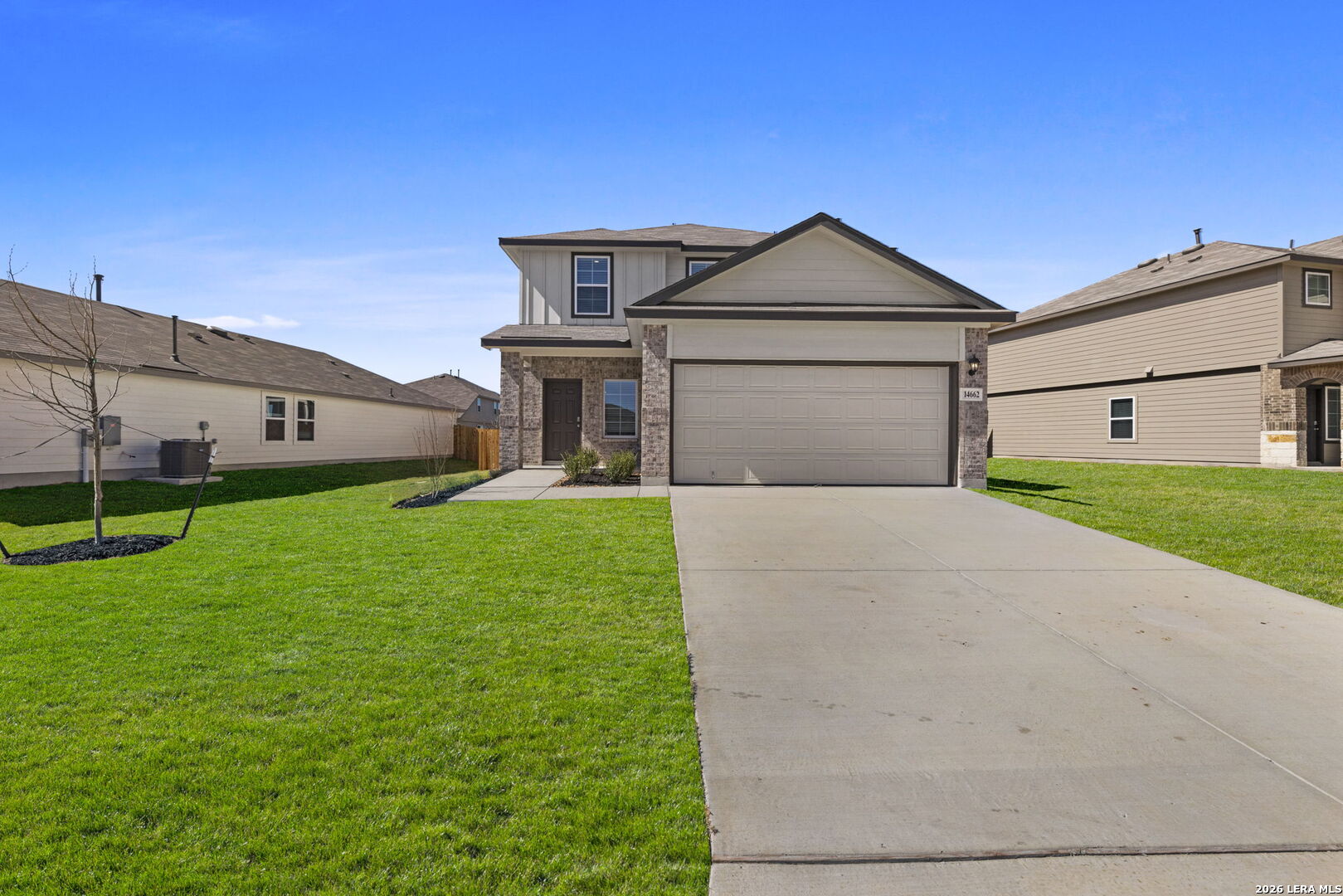 Step inside the Nicole plan, a two-story home featured in Riverstone at Westpointe in San Antonio, TX. Featuring 4 bedrooms, 3 full baths and a 2-car garage, this floor plan is sure to turn heads. The Nicole offers 2473 square feet of comfortable living and includes a full bathroom and bedroom located right off the foyer that is perfect for guests. Continue down the hall to find an open concept plan with the family room opening to a gourmet kitchen and dining room. The kitchen includes quartz counter tops, stainless steel appliances, shaker style cabinetry and a spacious corner pantry. A kitchen island overlooks the living room and includes a deep, single basin sink and a breakfast bar, perfect for fast mornings on the go. The wide, inviting staircase leads to a spacious game room, utility room, main bedroom suite, two secondary bedrooms with carpet flooring and spacious closets and third full bathroom. Your private main bedroom features an attached ensuite bathroom built with plenty of storage space, a walk-in shower and a separate water closet for the toilet. The grand walk-in closet is a stand-out feature of The Nicole floor plan, complete with plenty of windows for natural lighting. Additional features of The Nicole include sheet vinyl flooring in entry, living room, and all wet areas, quartz counter tops in all bathrooms, and full yard landscaping and irrigation. *Seller is willing to assist with closing costs or a rate buy-down through preferred lender with an acceptable offer. *