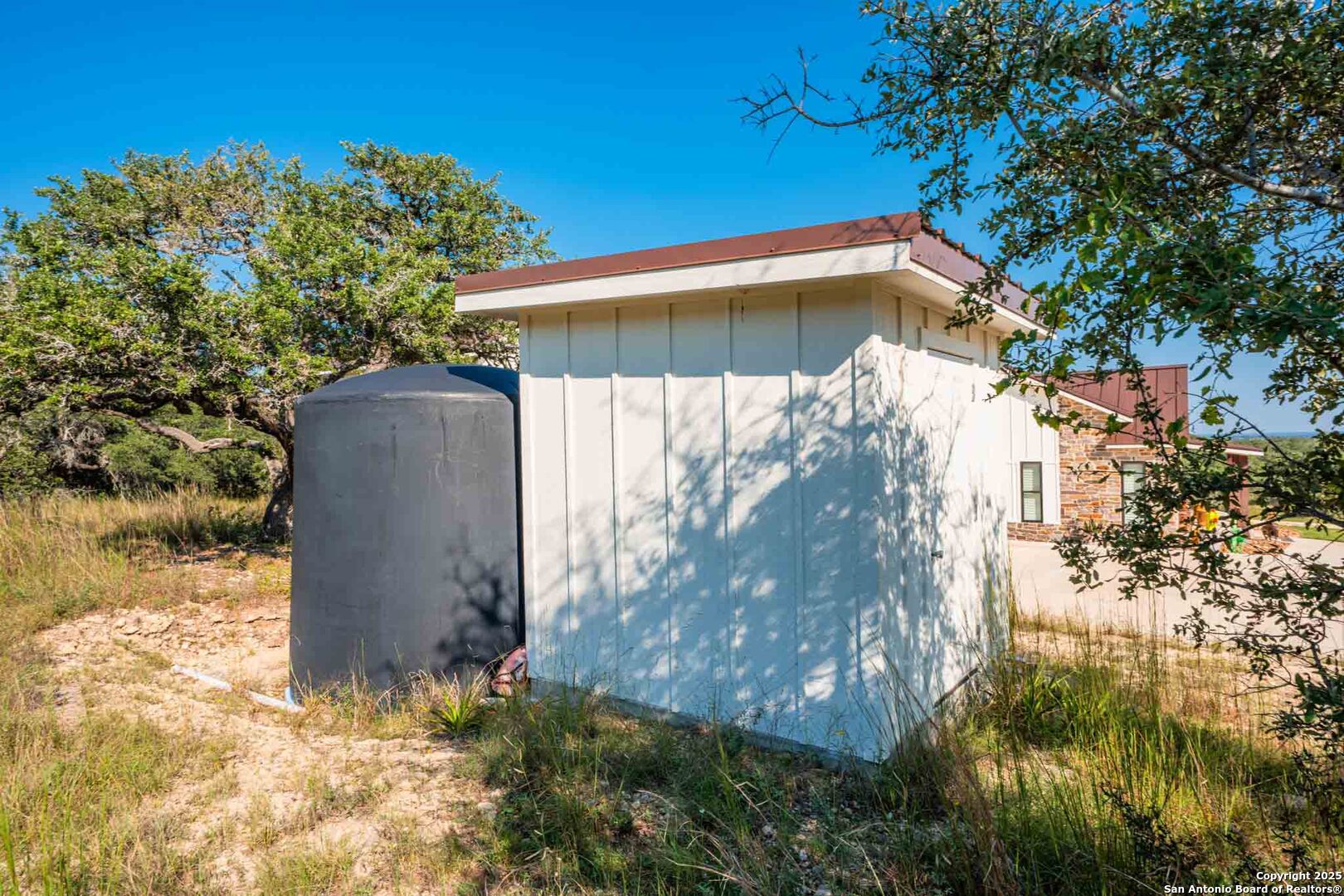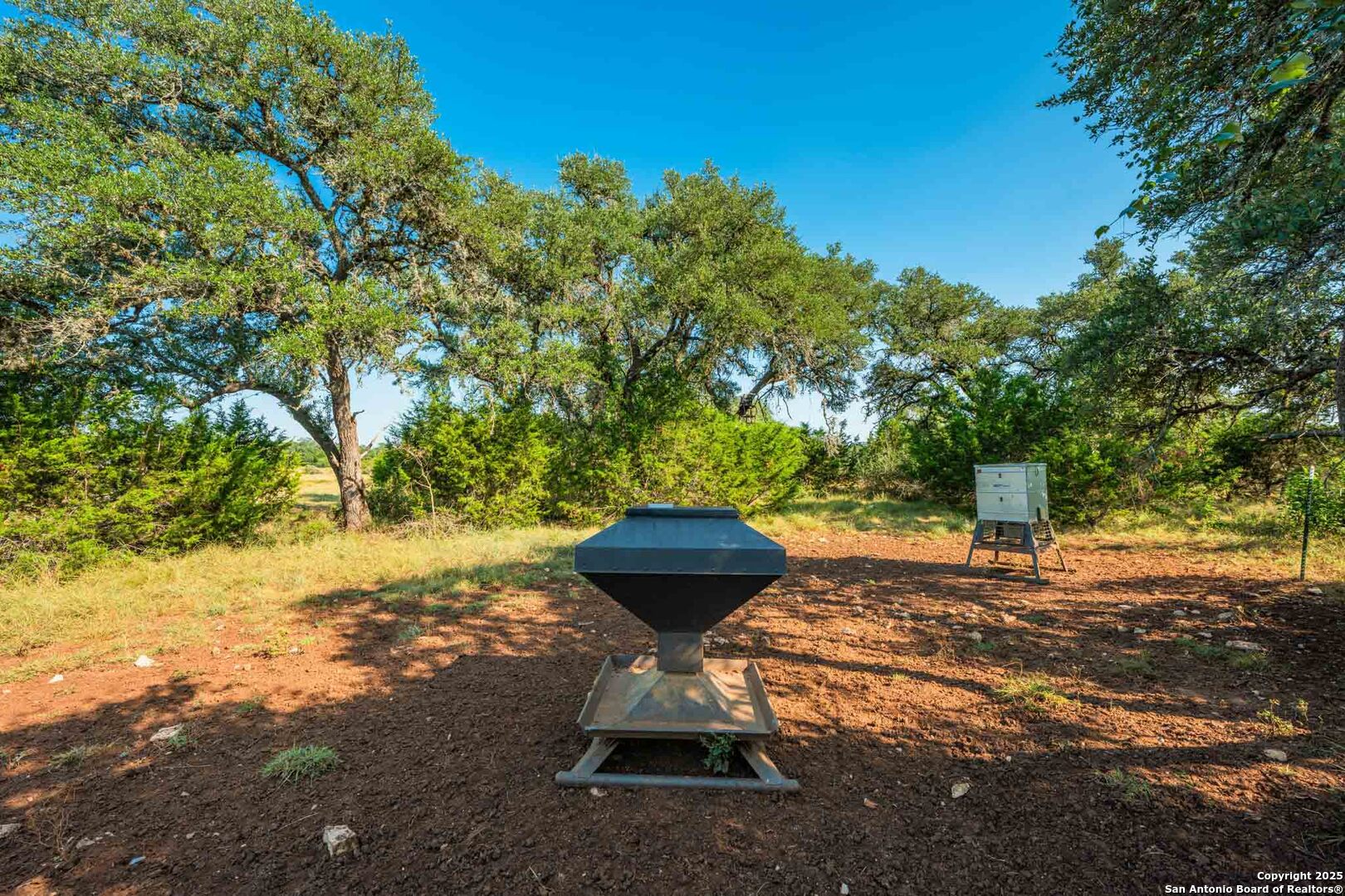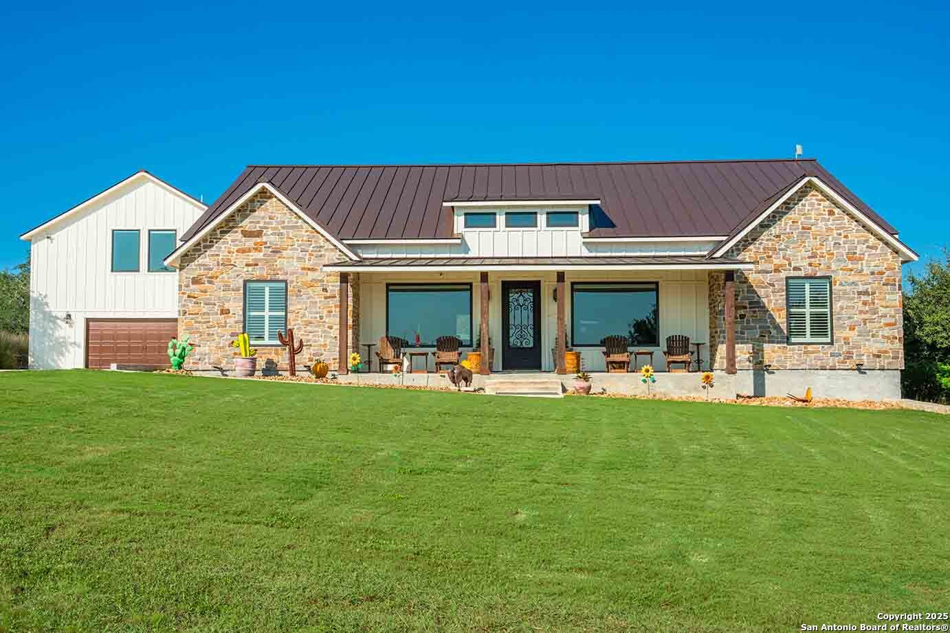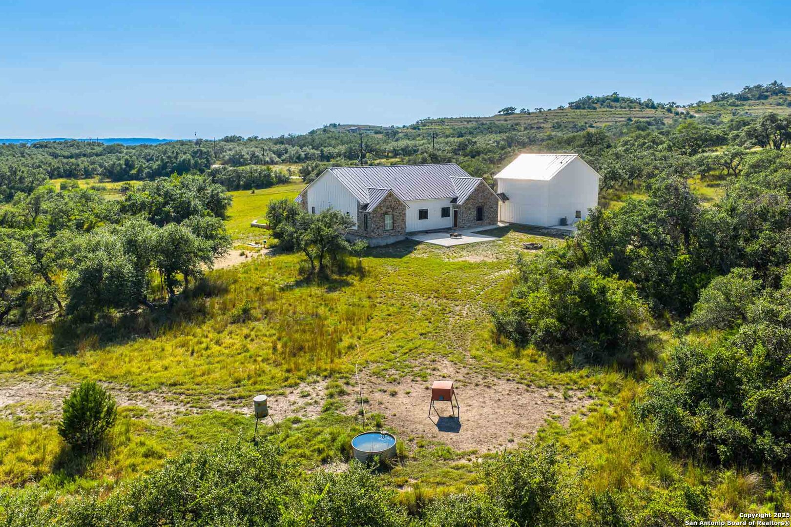 Exceptionally beautiful and well-located-Big Chief Ranch is 26 acres, offering luxurious modern living with an impressive Hill Country landscape backdrop featuring rolling hills in the distance. The property features a 3,085 sf 4B/4.5BA main home and a detached two car garage, which includes a half bathroom downstairs and an 810 1B/1BA guest apartment upstairs. Gentle rolling terrain dotted with mature live oaks, native grasses, and a stock tank. Designed with entertaining and comfort in mind. Completed in 2021, its primary residence offers an open-concept floor plan that seamlessly connects the gourmet kitchen, living room, and dining spaces. The kitchen boasts custom cabinetry, stainless steel appliances, a large quartz island, a walk-in pantry, and a wet bar with a wine refrigerator. Vaulted ceilings and large windows in the living room showcase stunning Hill Country views while filling the home with natural light. Each bedroom features a private en-suite bathroom and walk-in closet, with the primary suite offering a double vanity, expansive countertop space, and an enormous walk-in closet. Custom window coverings and automatic shades enhance both the style and convenience of this stunning home. A covered front porch overlooks panoramic views, perfect for outdoor gatherings. The detached two-car garage features a half bath downstairs and an 810 sf apartment above, ideal for guests or extended family. At 26.36 acres, the property features a rectangular shape with numerous beautiful live oak groves, complemented by a good mix of cedar, which provides excellent cover for wildlife. A thick selection of native grasses covers the rolling terrain. The property has a secluded, tucked-away feel, with beautiful hills to enjoy in the backdrop. Frequent sightings of Hill Country wildlife, which include whitetail deer, axis deer, and turkey. Plenty of opportunities for bird watching and enjoying the native animals of the Hill Country. There is one water well on the property. According to the Seller, when drilled, the well tested at 7 gallons per minute. The water well provides water to the main improvements. A water softener and saltwater purifier are added amenities to the home. Additionally, there is one stock tank that will hold water seasonally.