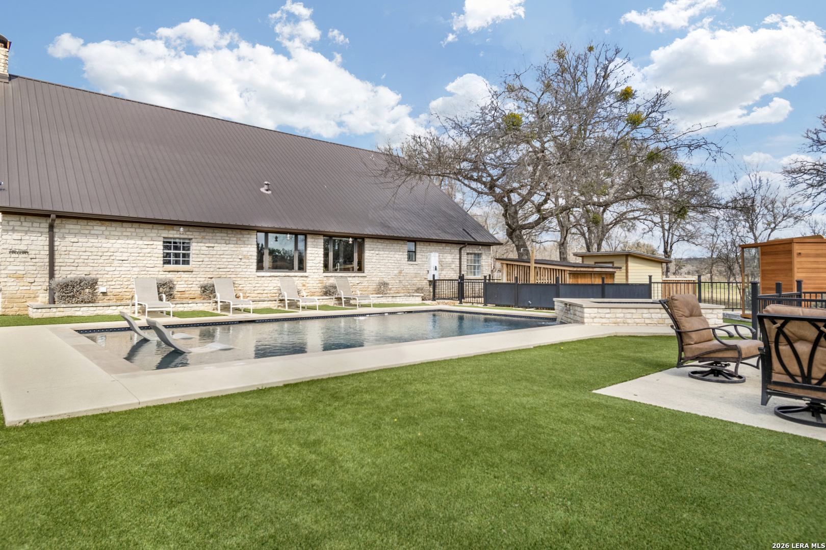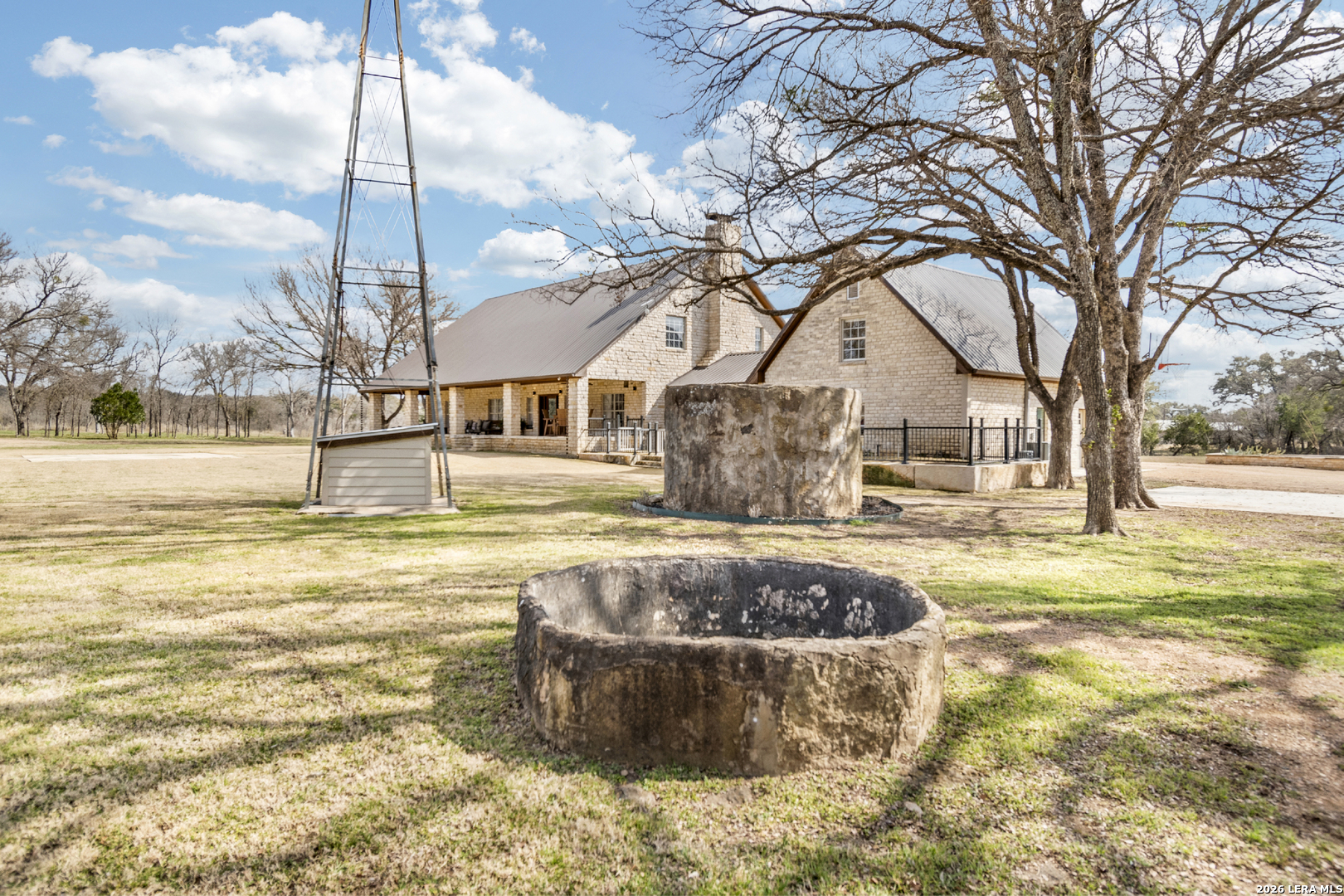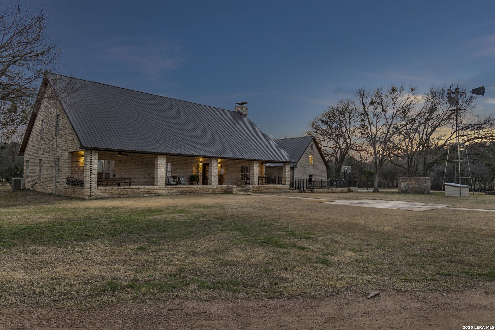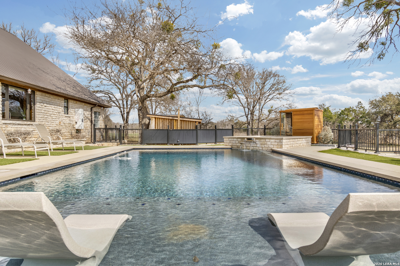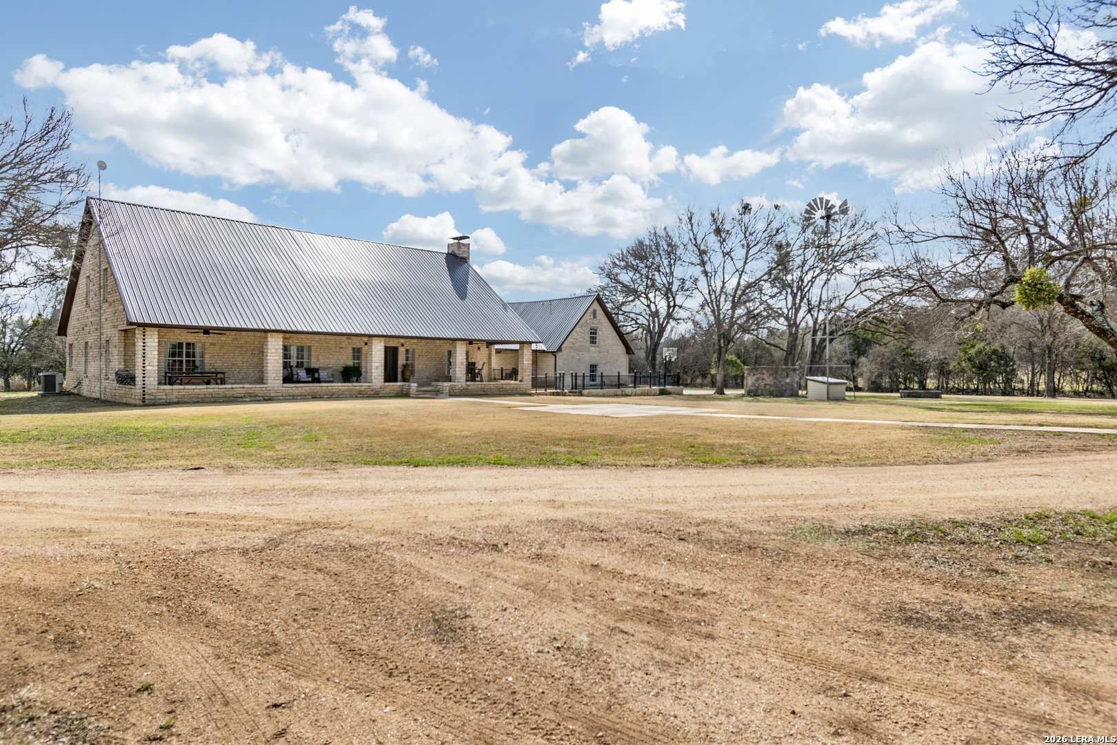 At the end of a quiet cul-de-sac, a secure privacy fence welcomes you to this stunning estate. Entering, you're greeted by a timeless windmill, a nod to the land's heritage and the old wagon trail that once crossed here. Set on nearly seven oak-studded acres, this all-stone Hill Country estate has been thoughtfully updated throughout. Custom cabinetry enhances nearly every space in the home, which features 3 bedrooms and 31/2 baths. The kitchen, overlooking the pool, boasts electric blinds, high-end appliances, a premium range with double ovens, and a built-in espresso machine, a chef's dream. On the west end, the private office features a fireplace and a floor-to-ceiling custom cabinet system, plus a Murphy bed for guests. Step outside to discover a private retreat with a 2020-built pool, hot tub,and sauna, all surrounded by low-maintenance turf. An expansive front porch and charming breezeway provide perfect spots for relaxation, while a half-court basketball area offers fun for all. Separate from the main home is a dedicated game room and a private studio apartment with 1 bedroom and 1 bath. The barndominium includes imported Italian laminate flooring, 1 bedroom, 11/2 baths, and a laundry room for guests. Upstairs, a flex space awaits. The impressive 40x40 storage/shop area with epoxy-finished floors is on the north end of the barndo. A garden area with a tool shed and a large dog run complete this exceptional setting. With most furnishings negotiable, this luxury estate is a true gem.