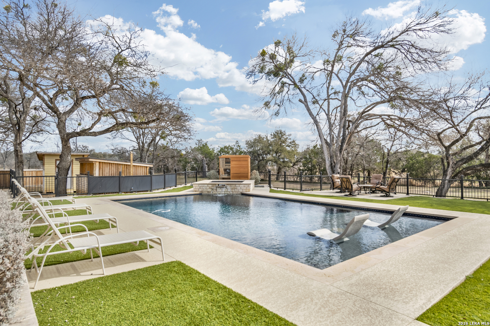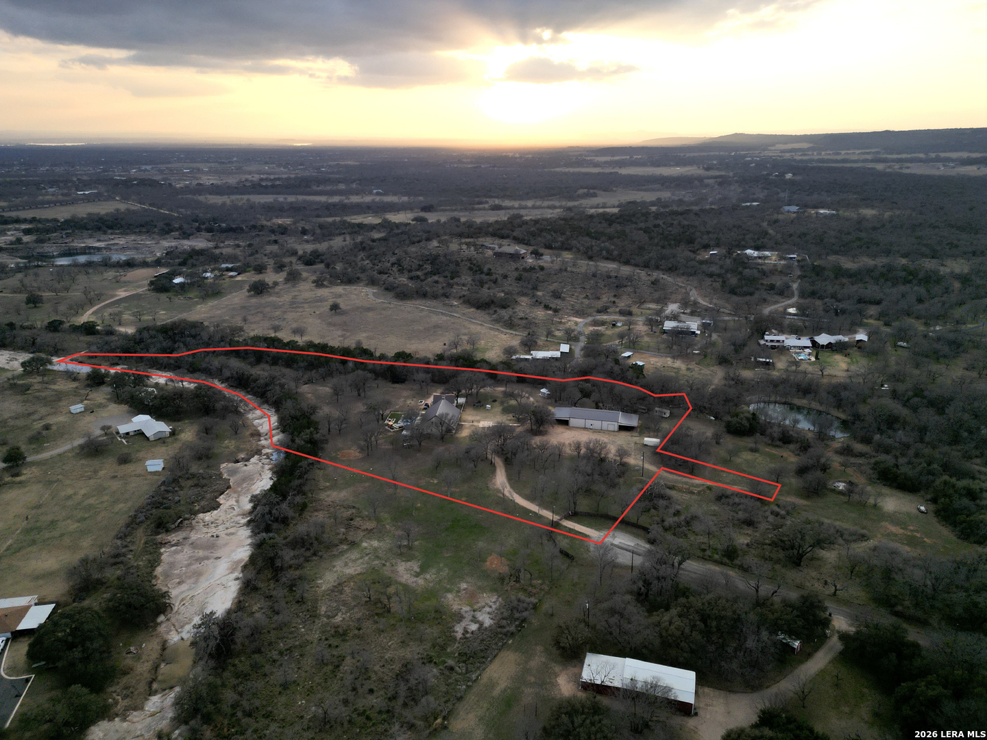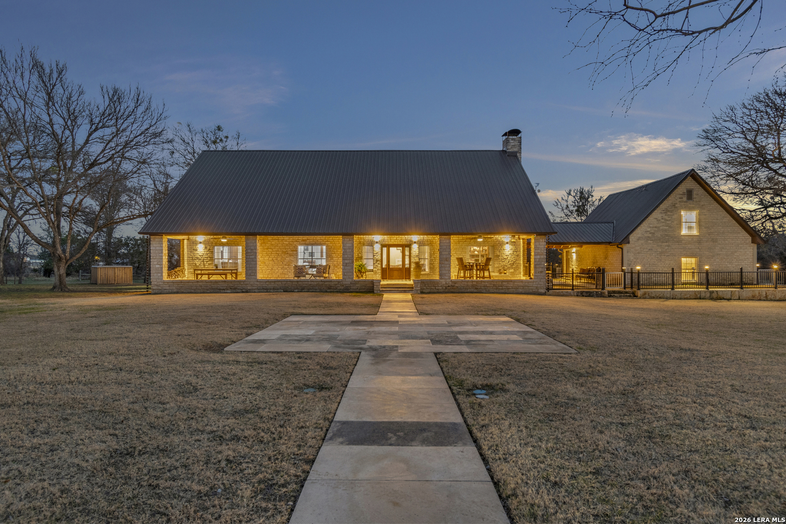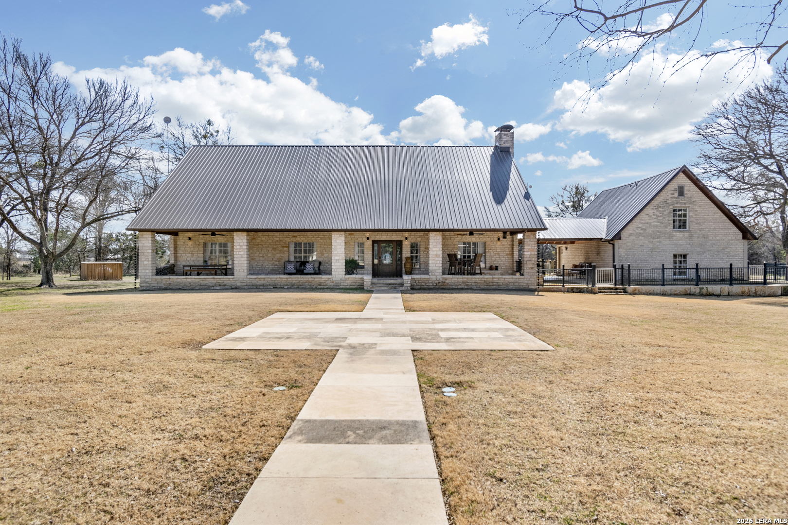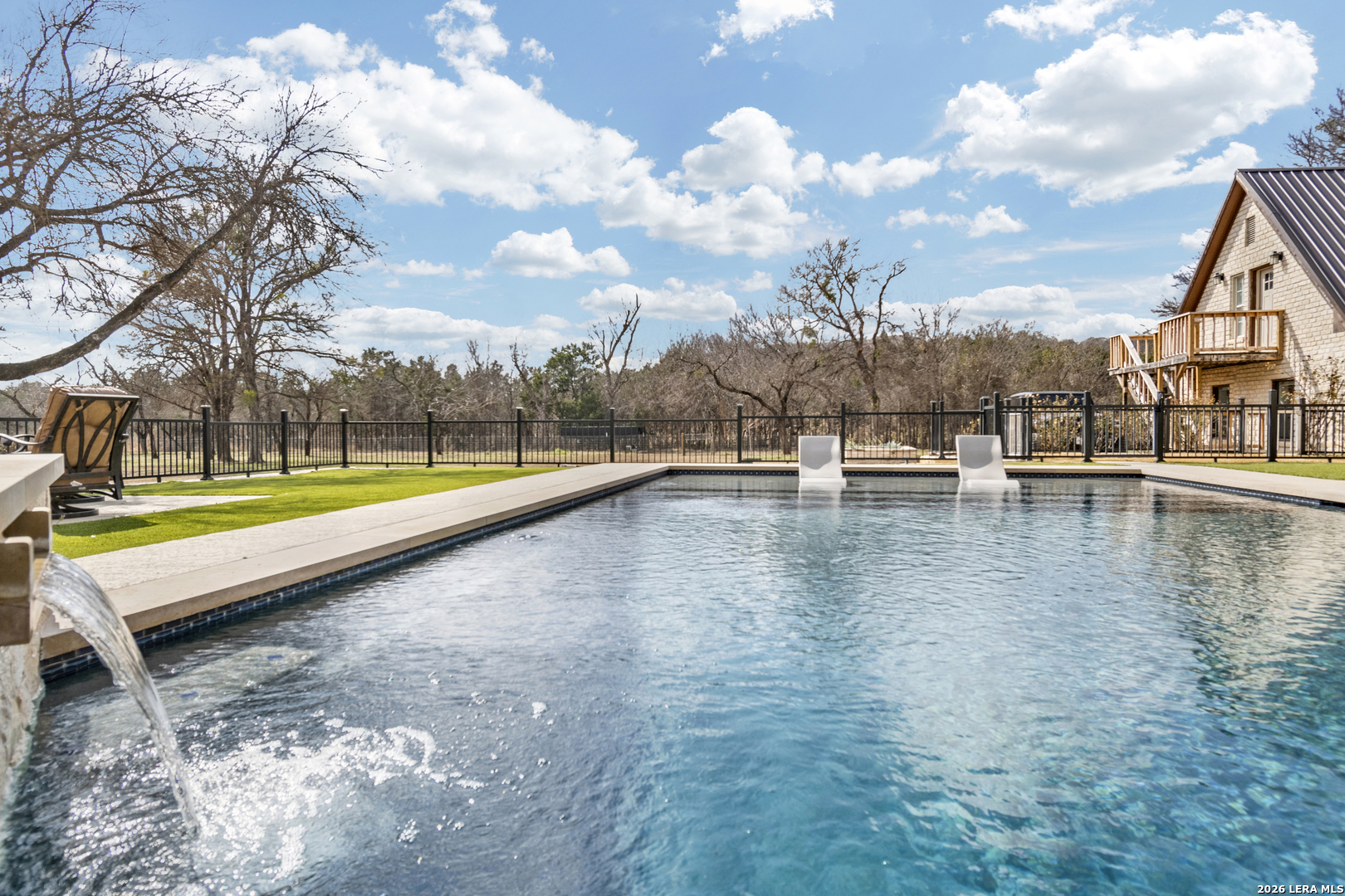 At the end of a quiet cul-de-sac, a secure privacy fence welcomes you to this stunning estate. Entering, you're greeted by a timeless windmill, a nod to the land's heritage and the old wagon trail that once crossed here. Set on nearly seven oak-studded acres, this all-stone Hill Country estate has been thoughtfully updated throughout. Custom cabinetry enhances nearly every space in the home, which features 3 bedrooms and 31/2 baths. The kitchen, overlooking the pool, boasts electric blinds, high-end appliances, a premium range with double ovens, and a built-in espresso machine, a chef's dream. On the west end, the private office features a fireplace and a floor-to-ceiling custom cabinet system, plus a Murphy bed for guests. Step outside to discover a private retreat with a 2020-built pool, hot tub,and sauna, all surrounded by low-maintenance turf. An expansive front porch and charming breezeway provide perfect spots for relaxation, while a half-court basketball area offers fun for all. Separate from the main home is a dedicated game room and a private studio apartment with 1 bedroom and 1 bath. The barndominium includes imported Italian laminate flooring, 1 bedroom, 11/2 baths, and a laundry room for guests. Upstairs, a flex space awaits. The impressive 40x40 storage/shop area with epoxy-finished floors is on the north end of the barndo. A garden area with a tool shed and a large dog run complete this exceptional setting. With most furnishings negotiable, this luxury estate is a true gem.