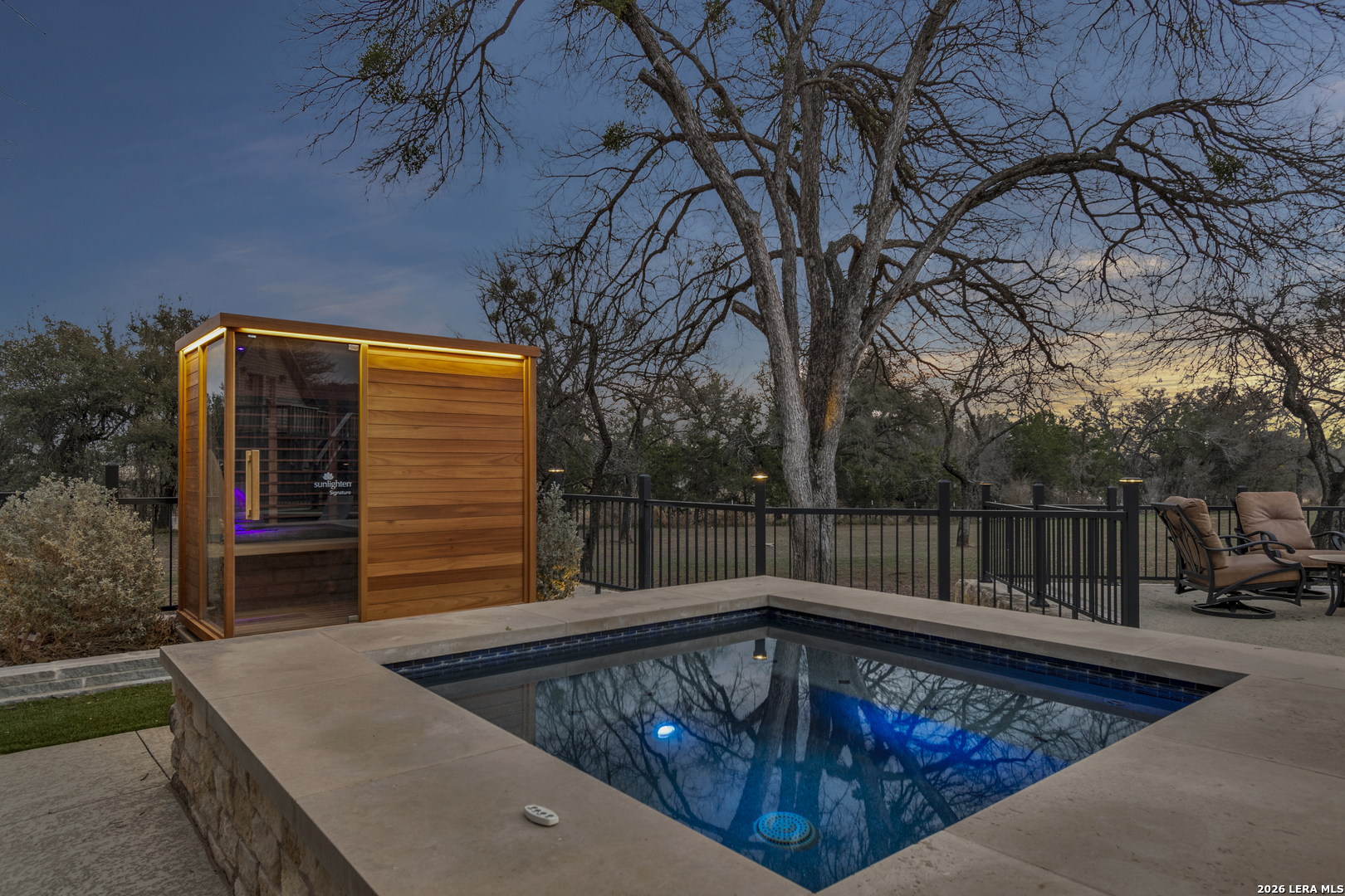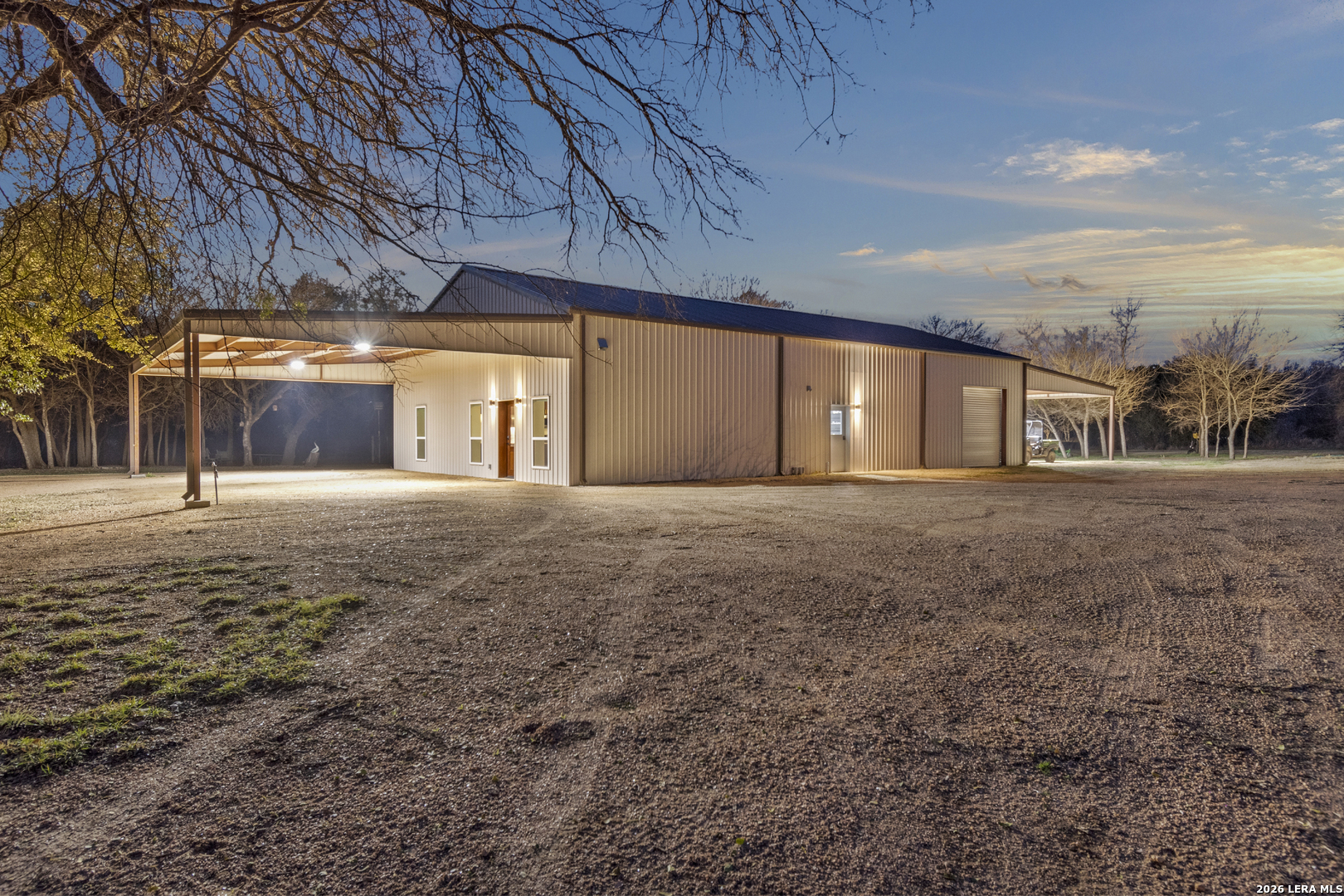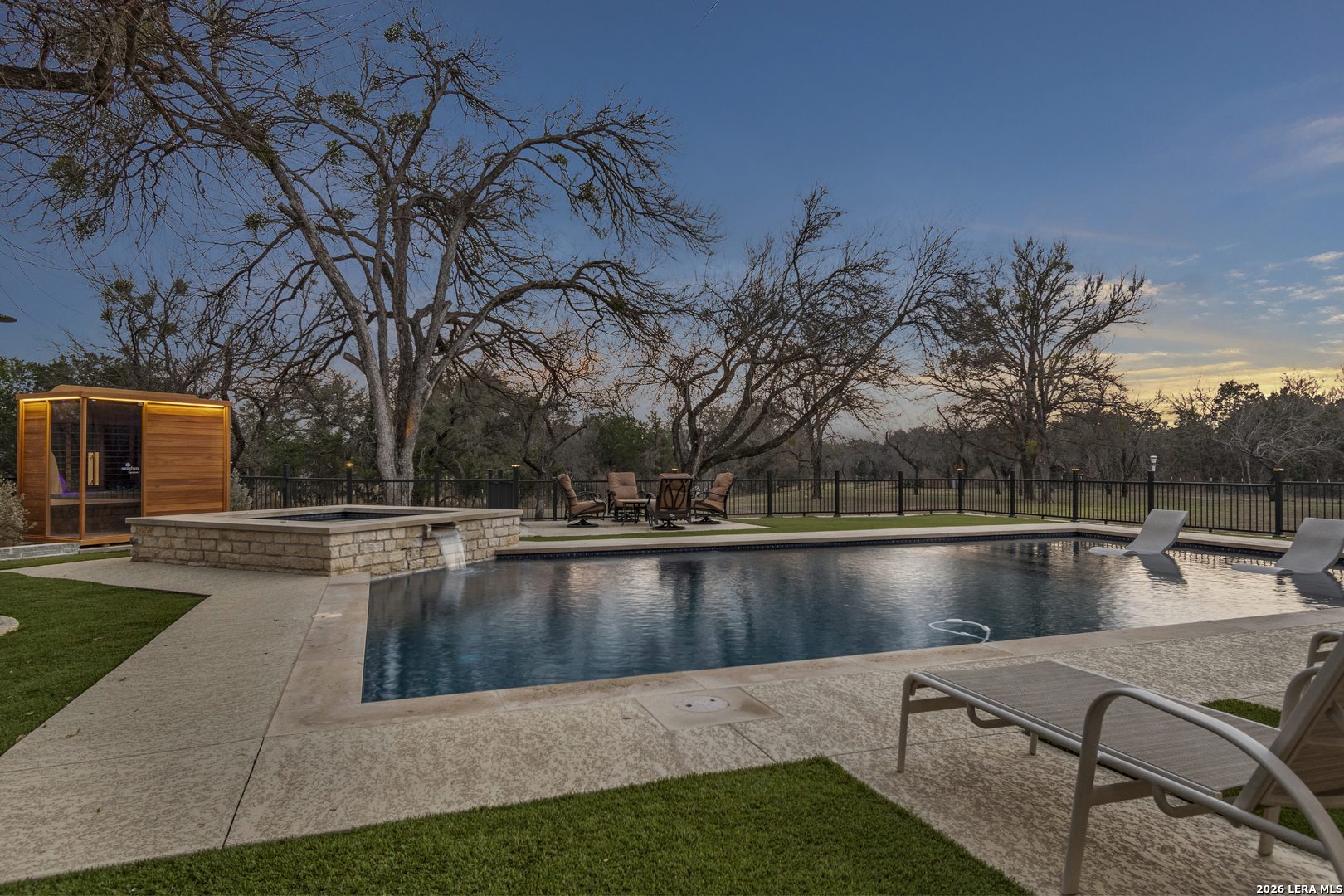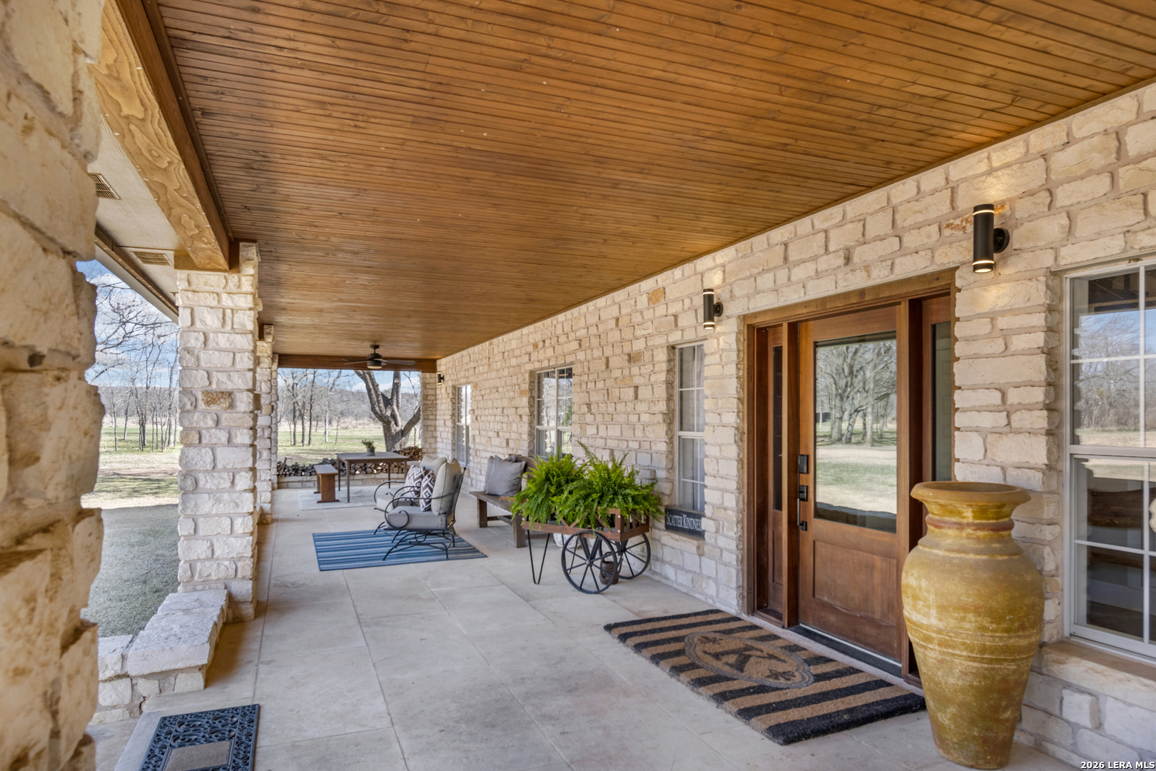 At the end of a quiet cul-de-sac, a secure privacy fence welcomes you to this stunning estate. Entering, you're greeted by a timeless windmill, a nod to the land's heritage and the old wagon trail that once crossed here. Set on nearly seven oak-studded acres, this all-stone Hill Country estate has been thoughtfully updated throughout. Custom cabinetry enhances nearly every space in the home, which features 3 bedrooms and 31/2 baths. The kitchen, overlooking the pool, boasts electric blinds, high-end appliances, a premium range with double ovens, and a built-in espresso machine, a chef's dream. On the west end, the private office features a fireplace and a floor-to-ceiling custom cabinet system, plus a Murphy bed for guests. Step outside to discover a private retreat with a 2020-built pool, hot tub,and sauna, all surrounded by low-maintenance turf. An expansive front porch and charming breezeway provide perfect spots for relaxation, while a half-court basketball area offers fun for all. Separate from the main home is a dedicated game room and a private studio apartment with 1 bedroom and 1 bath. The barndominium includes imported Italian laminate flooring, 1 bedroom, 11/2 baths, and a laundry room for guests. Upstairs, a flex space awaits. The impressive 40x40 storage/shop area with epoxy-finished floors is on the north end of the barndo. A garden area with a tool shed and a large dog run complete this exceptional setting. With most furnishings negotiable, this luxury estate is a true gem.