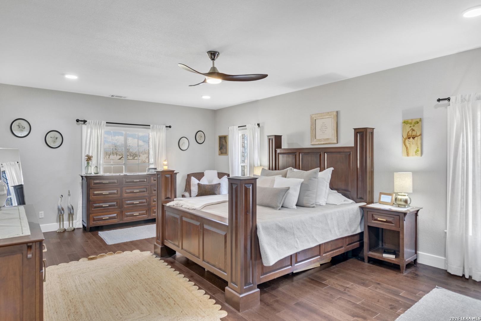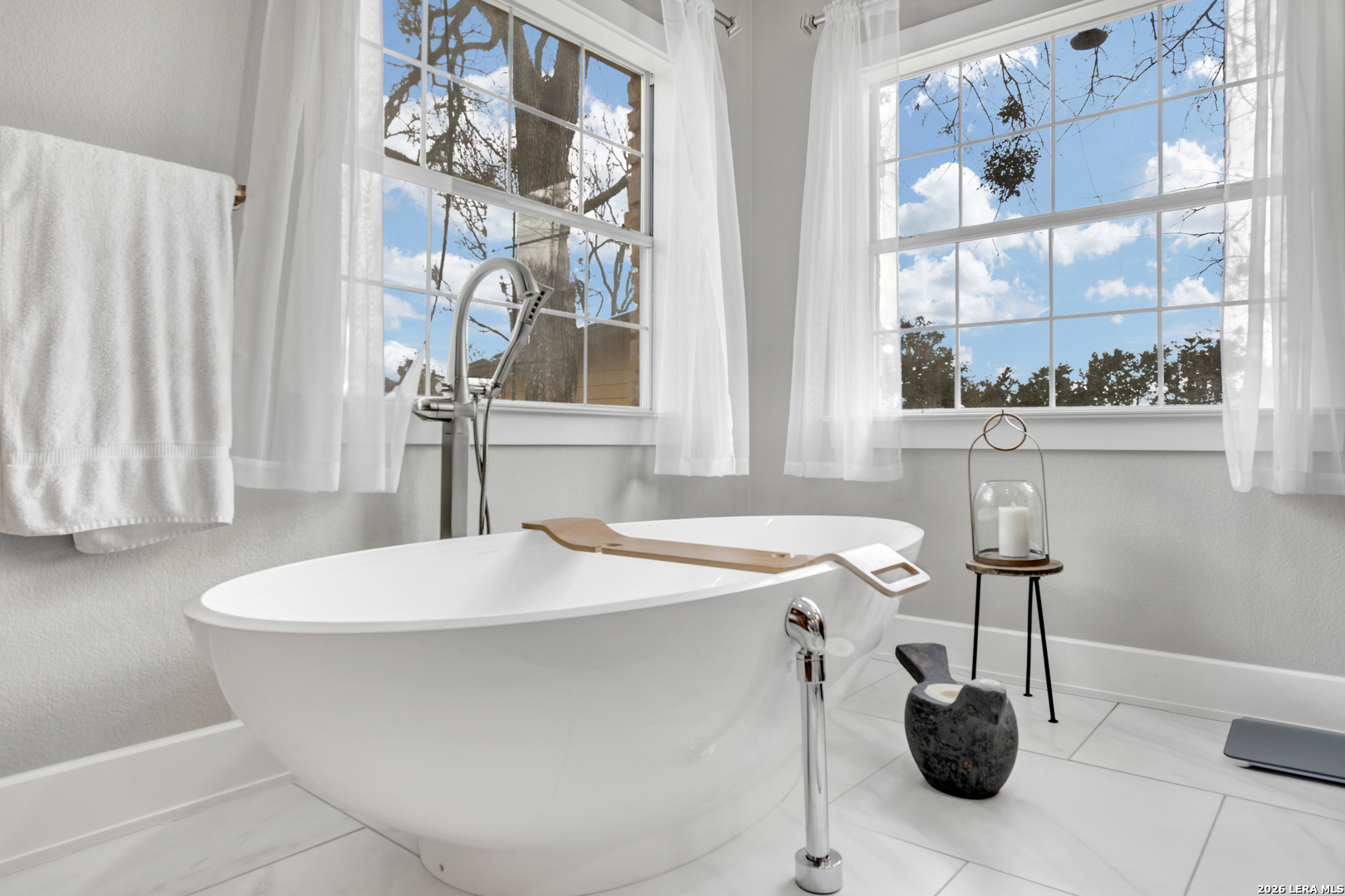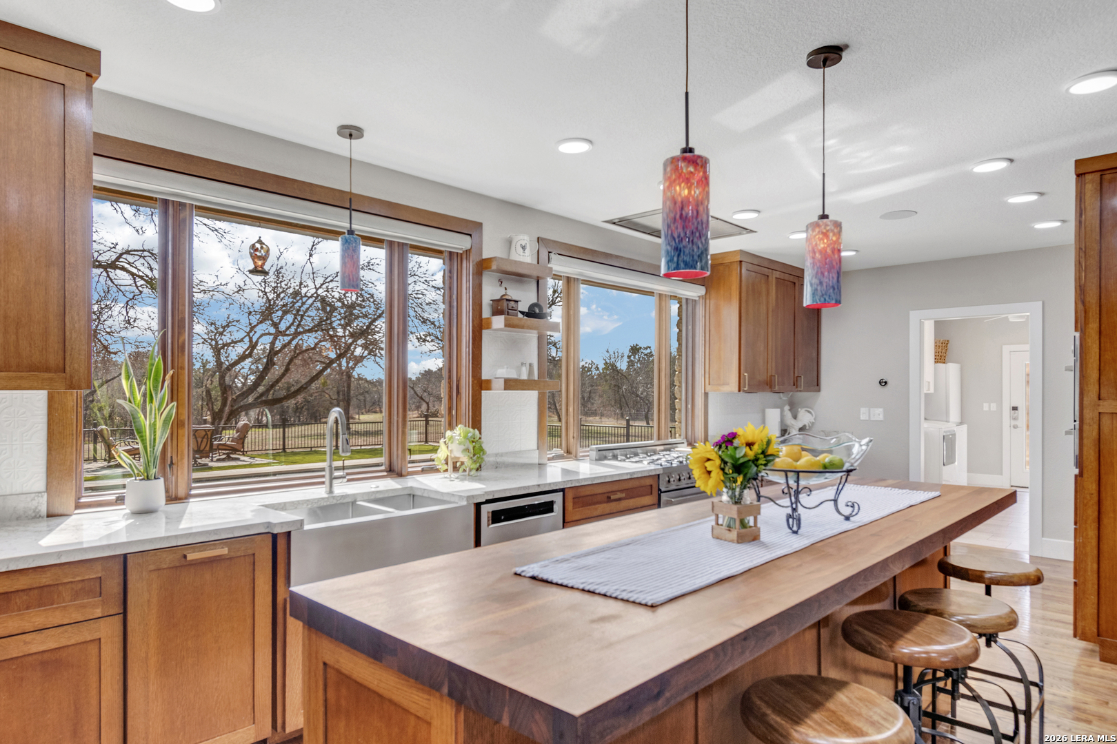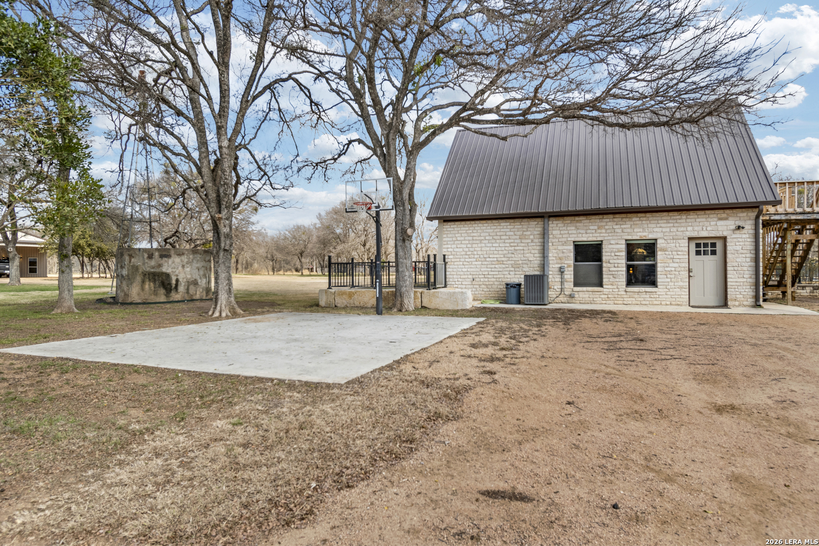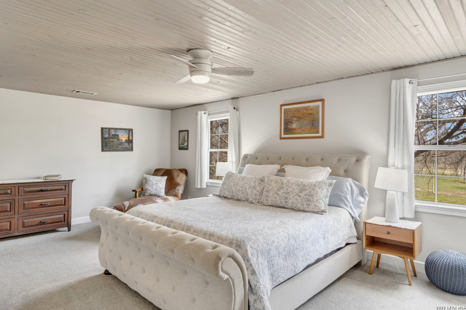 At the end of a quiet cul-de-sac, a secure privacy fence welcomes you to this stunning estate. Entering, you're greeted by a timeless windmill, a nod to the land's heritage and the old wagon trail that once crossed here. Set on nearly seven oak-studded acres, this all-stone Hill Country estate has been thoughtfully updated throughout. Custom cabinetry enhances nearly every space in the home, which features 3 bedrooms and 31/2 baths. The kitchen, overlooking the pool, boasts electric blinds, high-end appliances, a premium range with double ovens, and a built-in espresso machine, a chef's dream. On the west end, the private office features a fireplace and a floor-to-ceiling custom cabinet system, plus a Murphy bed for guests. Step outside to discover a private retreat with a 2020-built pool, hot tub,and sauna, all surrounded by low-maintenance turf. An expansive front porch and charming breezeway provide perfect spots for relaxation, while a half-court basketball area offers fun for all. Separate from the main home is a dedicated game room and a private studio apartment with 1 bedroom and 1 bath. The barndominium includes imported Italian laminate flooring, 1 bedroom, 11/2 baths, and a laundry room for guests. Upstairs, a flex space awaits. The impressive 40x40 storage/shop area with epoxy-finished floors is on the north end of the barndo. A garden area with a tool shed and a large dog run complete this exceptional setting. With most furnishings negotiable, this luxury estate is a true gem.