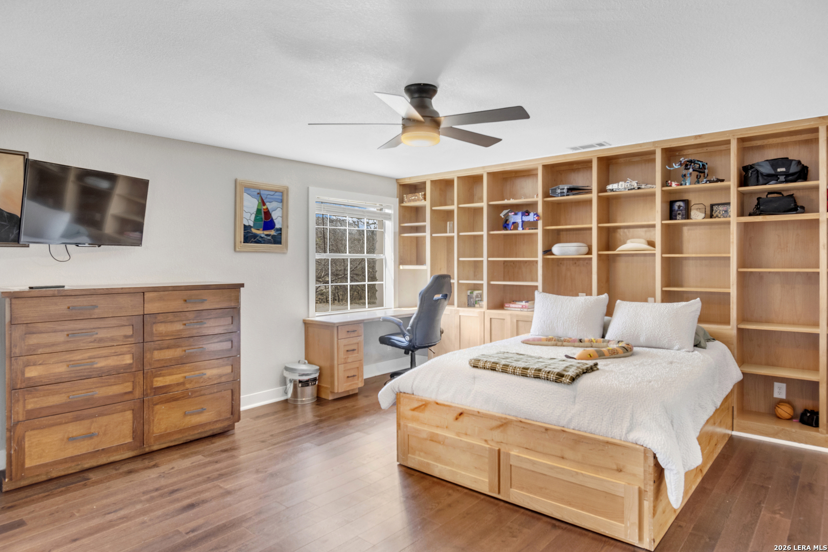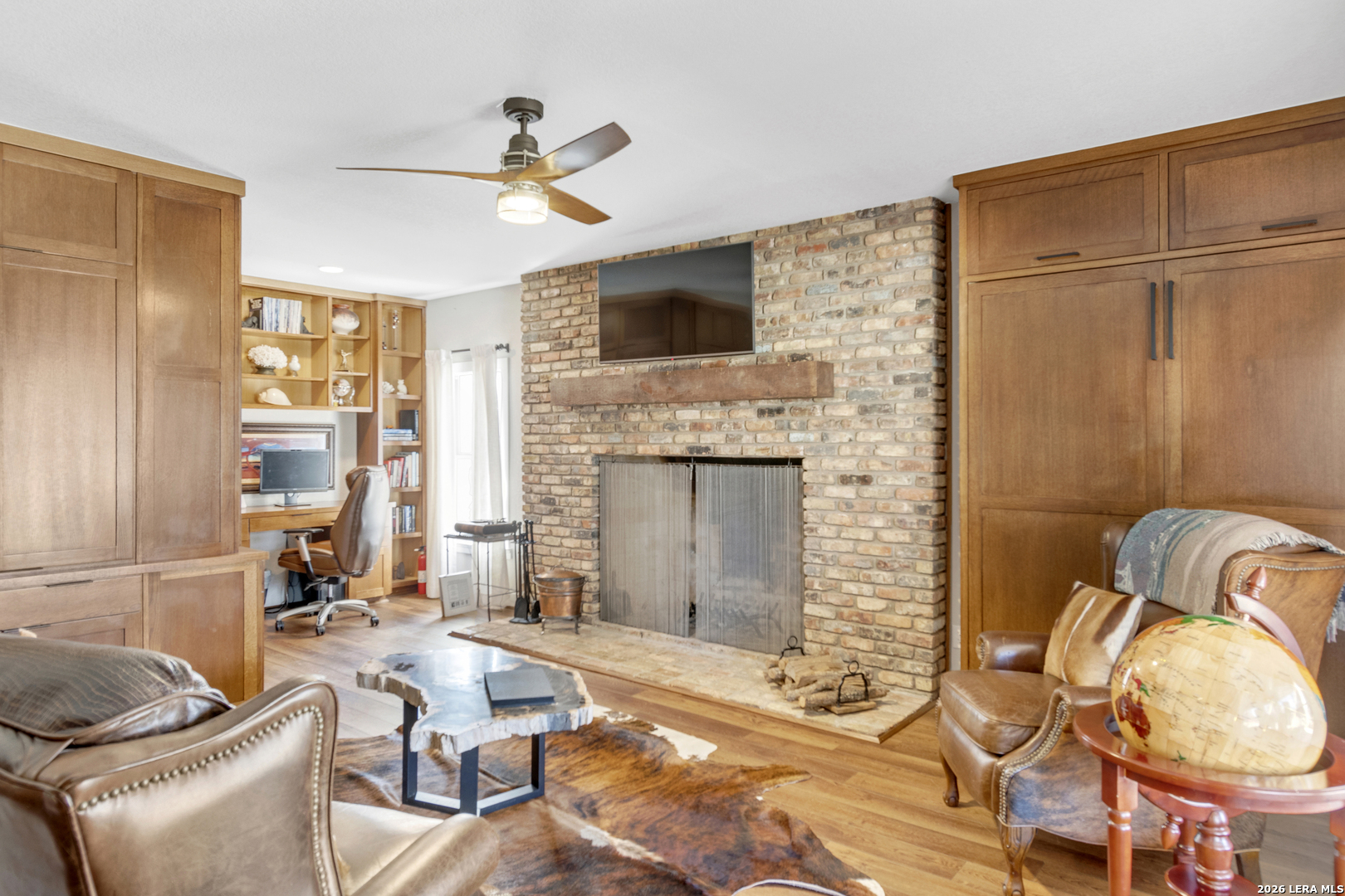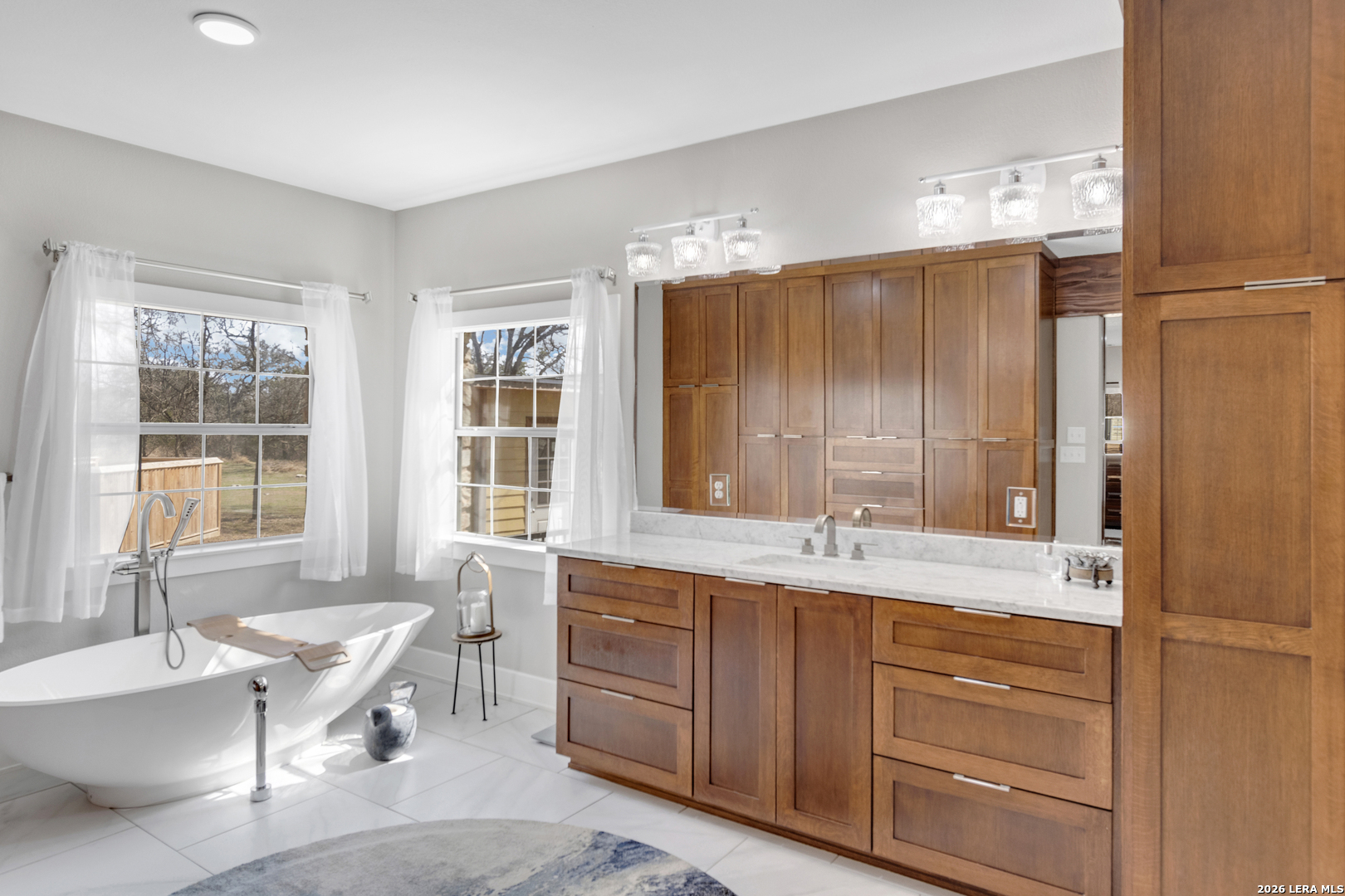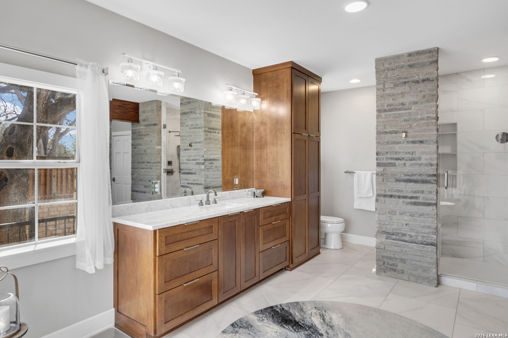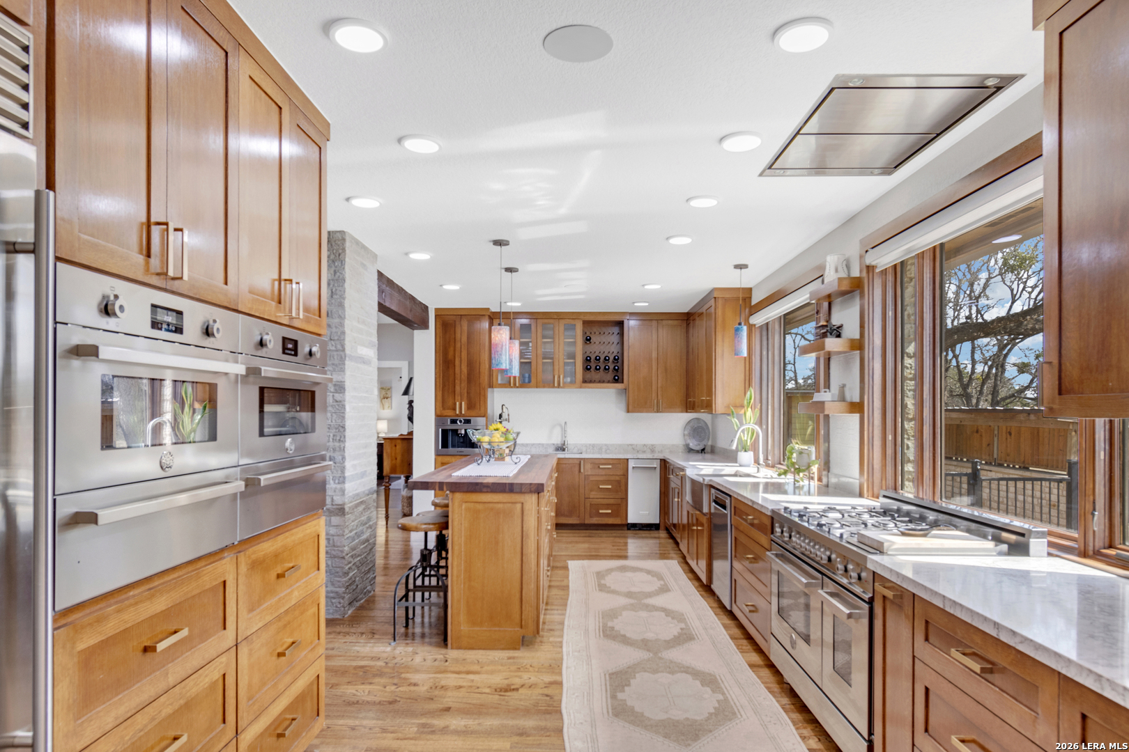 At the end of a quiet cul-de-sac, a secure privacy fence welcomes you to this stunning estate. Entering, you're greeted by a timeless windmill, a nod to the land's heritage and the old wagon trail that once crossed here. Set on nearly seven oak-studded acres, this all-stone Hill Country estate has been thoughtfully updated throughout. Custom cabinetry enhances nearly every space in the home, which features 3 bedrooms and 31/2 baths. The kitchen, overlooking the pool, boasts electric blinds, high-end appliances, a premium range with double ovens, and a built-in espresso machine, a chef's dream. On the west end, the private office features a fireplace and a floor-to-ceiling custom cabinet system, plus a Murphy bed for guests. Step outside to discover a private retreat with a 2020-built pool, hot tub,and sauna, all surrounded by low-maintenance turf. An expansive front porch and charming breezeway provide perfect spots for relaxation, while a half-court basketball area offers fun for all. Separate from the main home is a dedicated game room and a private studio apartment with 1 bedroom and 1 bath. The barndominium includes imported Italian laminate flooring, 1 bedroom, 11/2 baths, and a laundry room for guests. Upstairs, a flex space awaits. The impressive 40x40 storage/shop area with epoxy-finished floors is on the north end of the barndo. A garden area with a tool shed and a large dog run complete this exceptional setting. With most furnishings negotiable, this luxury estate is a true gem.
