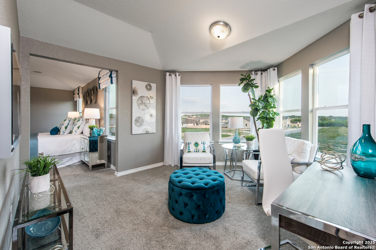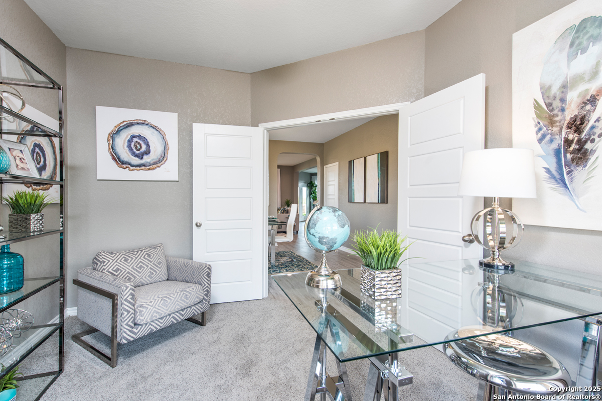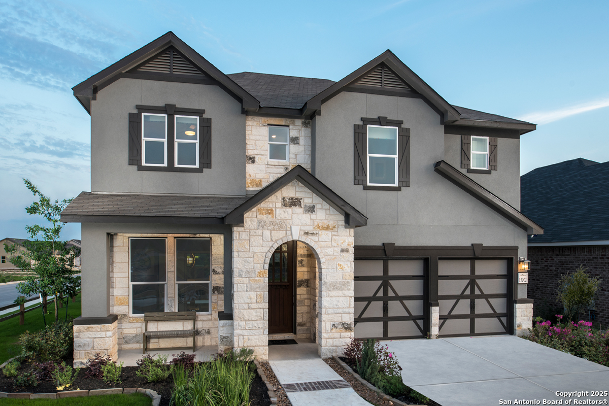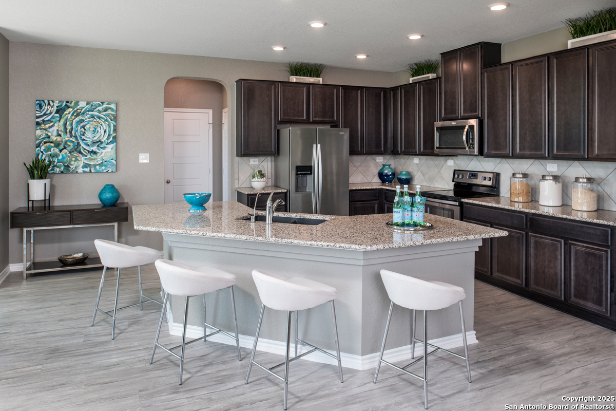 This beautiful home features 9-ft. ceilings on the first floor and a versatile study, perfect for working from home. The modern kitchen shines with Whirlpool stainless steel appliances, an Emser tile backsplash, Arctic Pearl granite countertops, a Moen faucet, and an extended breakfast bar ideal for casual dining. The primary bath offers a spa-like retreat with a raised vanity, upgraded cabinets, a 42-in. garden tub, and a separate shower accented with Emser tile. Decorative touches include stylish Kwikset Polo interior door hardware. Enjoy peace of mind with a built-in wireless security system. Outdoors, relax or entertain under the extended covered patio, with an automatic sprinkler system to keep your lawn looking its best.