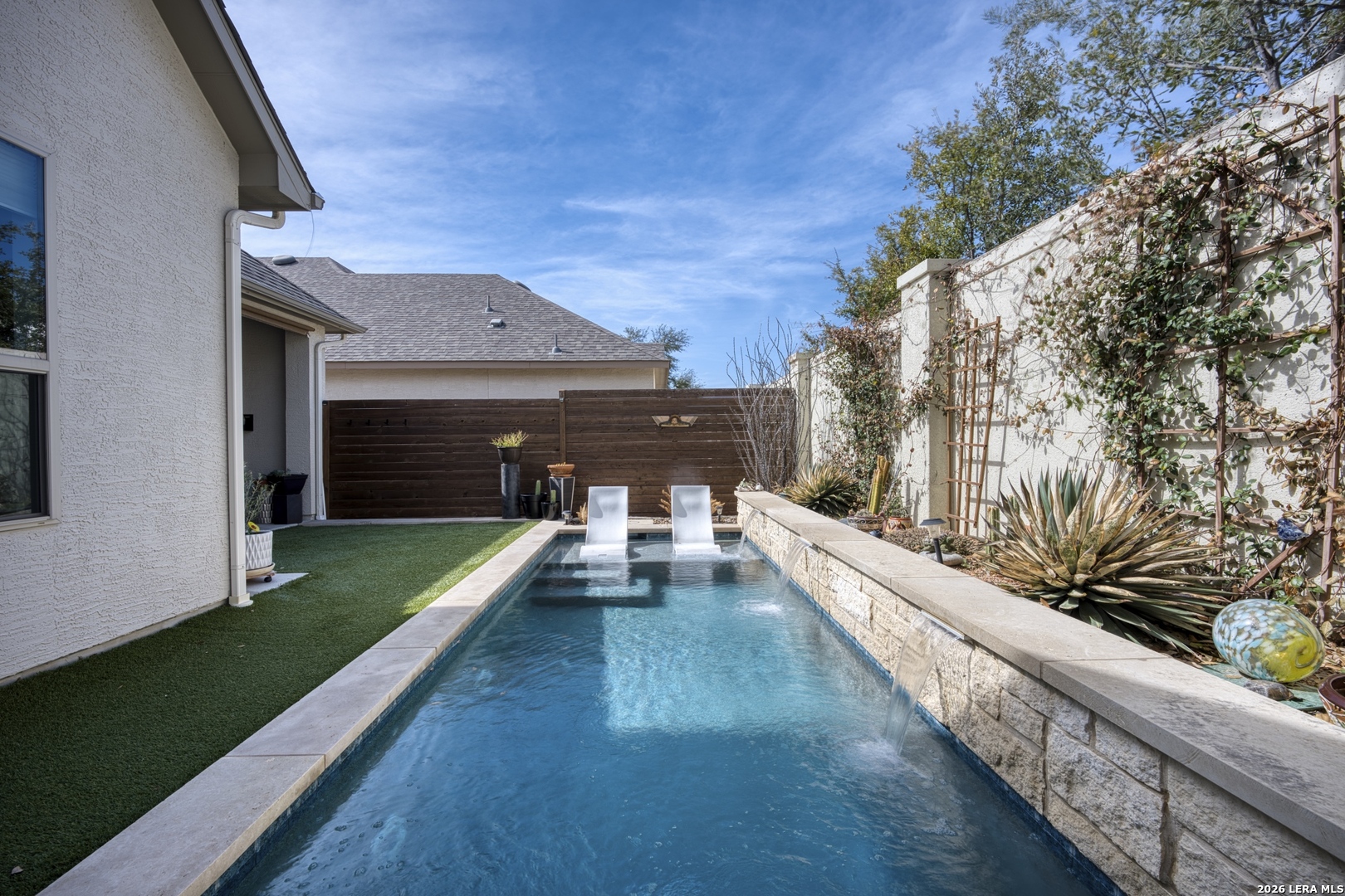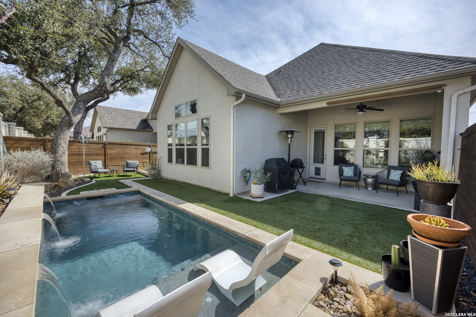 Welcome to this BEAUTIFUL OASIS Retreat with a HEATED POOL for year-round enjoyment! Nested in the prestigious community of Pond Hill Villas in sought-after Shavano Park and easy access to shopping malls, hospitals, the airport, and downtown. It comes with an OFFICE to work from home and a THREE CAR GARAGE with plenty of space to store your toys. Elegance and low maintenance living with no carpet or grass to worry about. The bright and open layout blends indoor and outdoor living seamlessly. On the inside the kitchen features an expansive island with quartz countertop and flows easily into the dining and living areas. The primary extra-large retreat comes with soaring ceilings creating a truly relaxing haven. The secondary bedroom features a nook for extra work-from-home space. Throughout the home expansive windows overlook the tranquil backyard OASIS featuring the beautiful pool that includes spa jets and it is heated for year-round use. ====COME SEE IT BEFORE IT IS GONE!!======