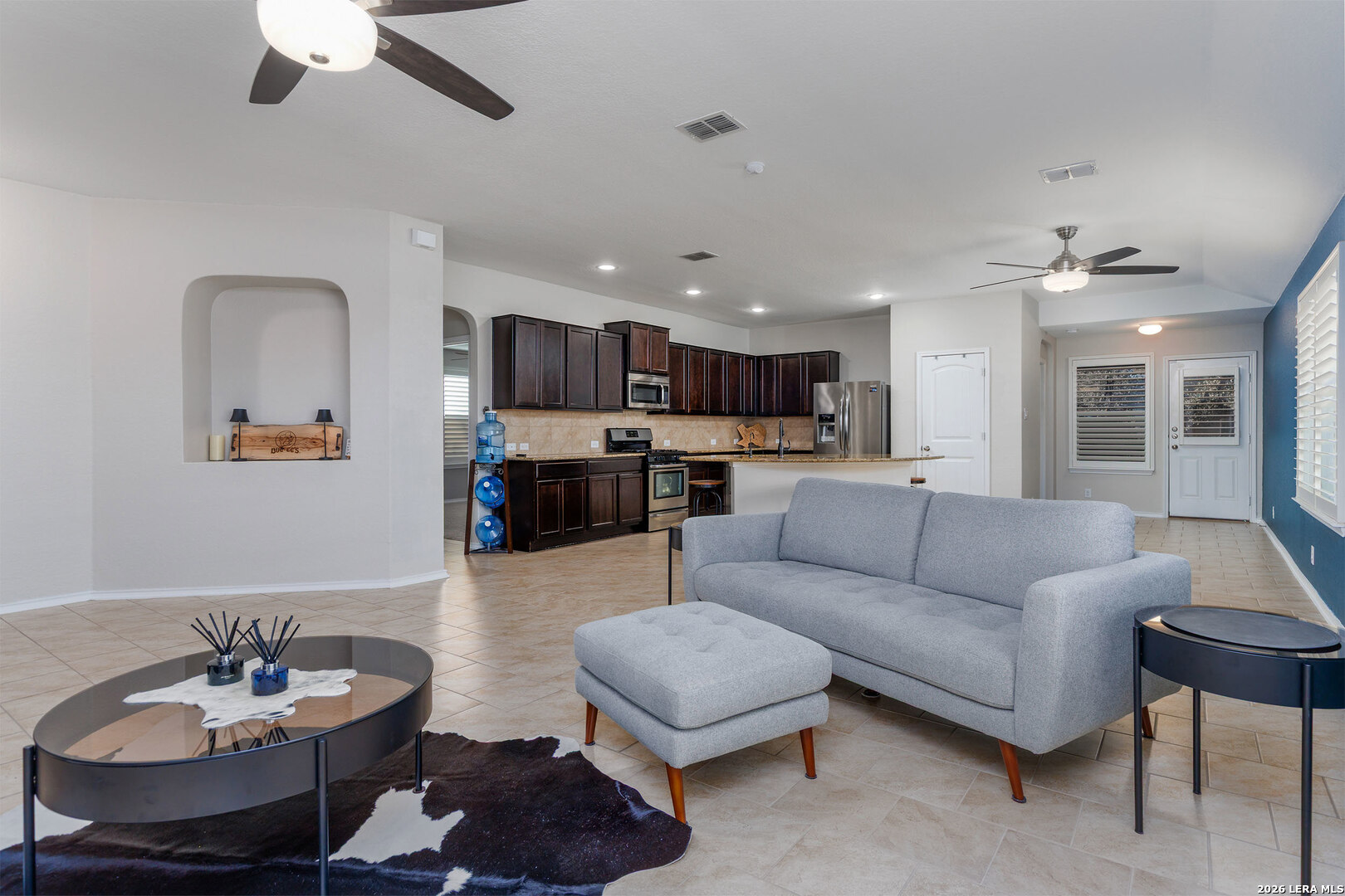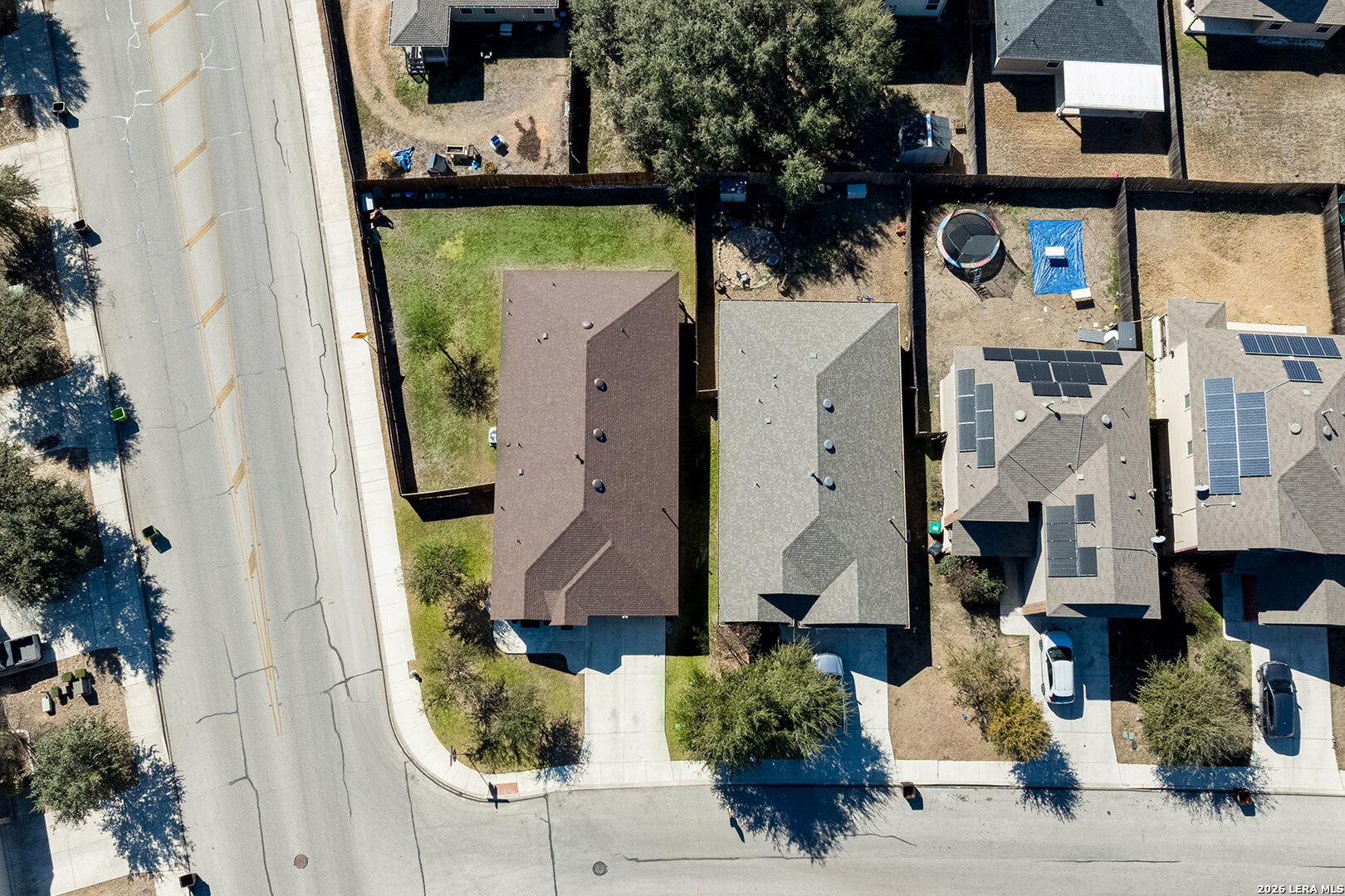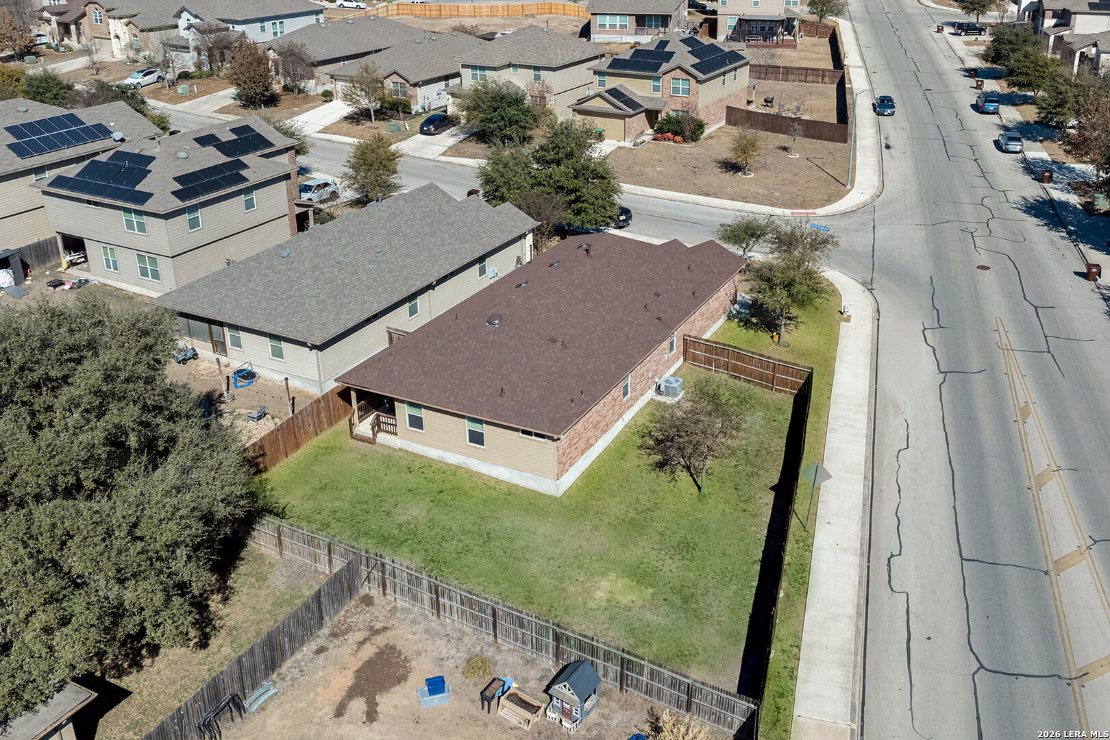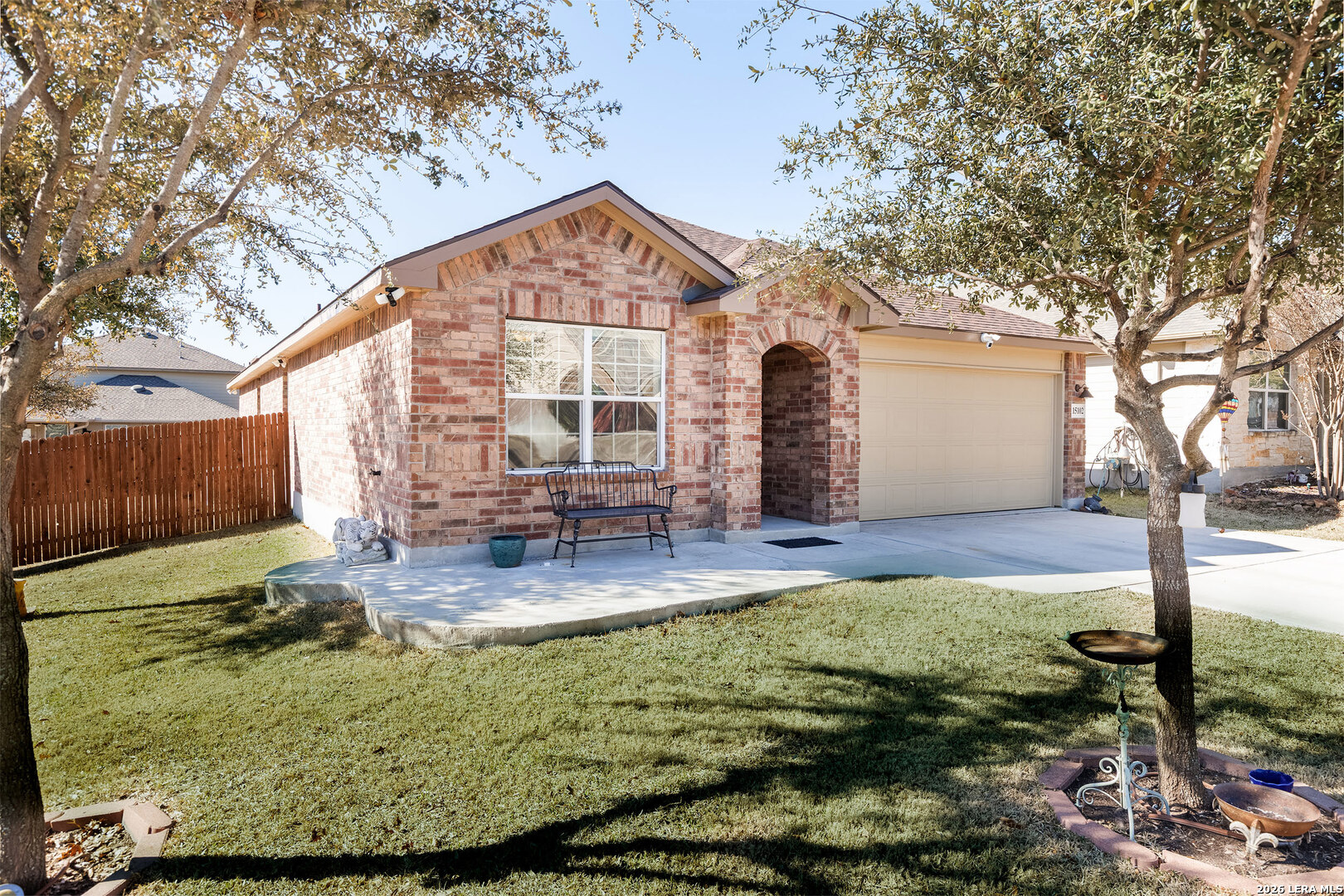 Well-maintained single-story home situated on a corner lot in Redbird Ranch. The property offers an open-concept floor plan with a spacious kitchen featuring a large island, stainless steel appliances including refrigerator, and a beverage refrigerator. Ceiling fans are installed in all bedrooms and the main living area. Windows include partial tinting and shutters. Both front and rear entry doors are equipped with storm doors. Recent updates include a roof replaced in 2025 with a transferable 5-year labor warranty. Additional features include a water softener, in-ground sprinkler system both front and back yard, washer and dryer, and two mounted flat-screen televisions located in the front bedrooms. A gated side entrance provides direct backyard access from the street, allowing for flexible outdoor use. The home is located near neighborhood amenities, including a pool and playground within walking distance. A third community amenity center is currently under construction and, upon completion, is planned to include additional pools, basketball courts, playgrounds, and tennis courts. The property is centrally located among all three amenity centers. Convenient access to H-E-B, shopping, dining, and major roadways. A Santikos Movie Theatre is currently under construction near H-E-B.