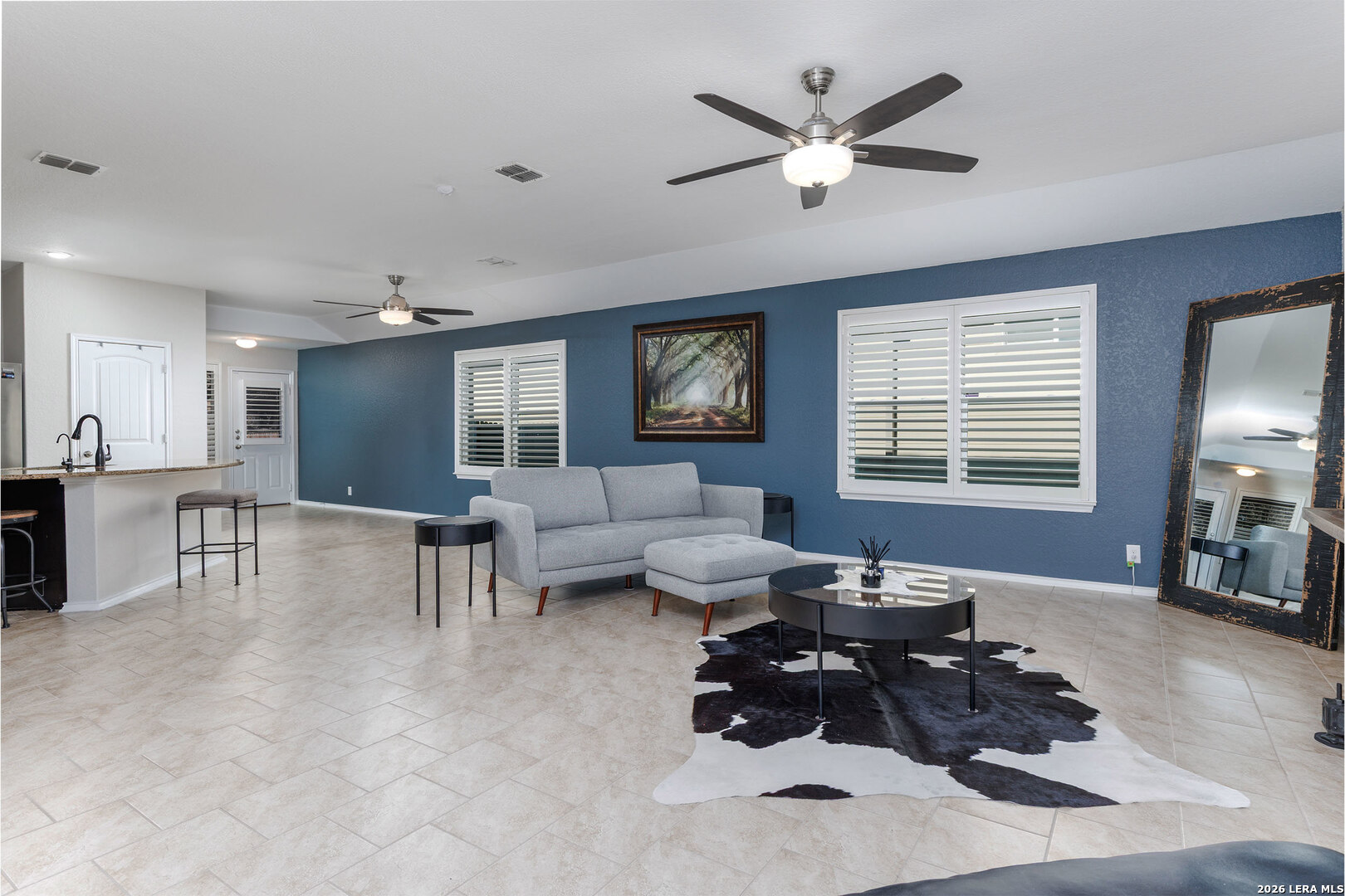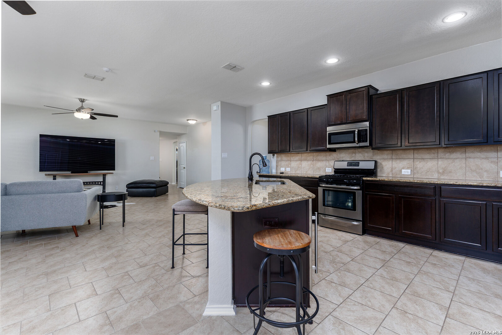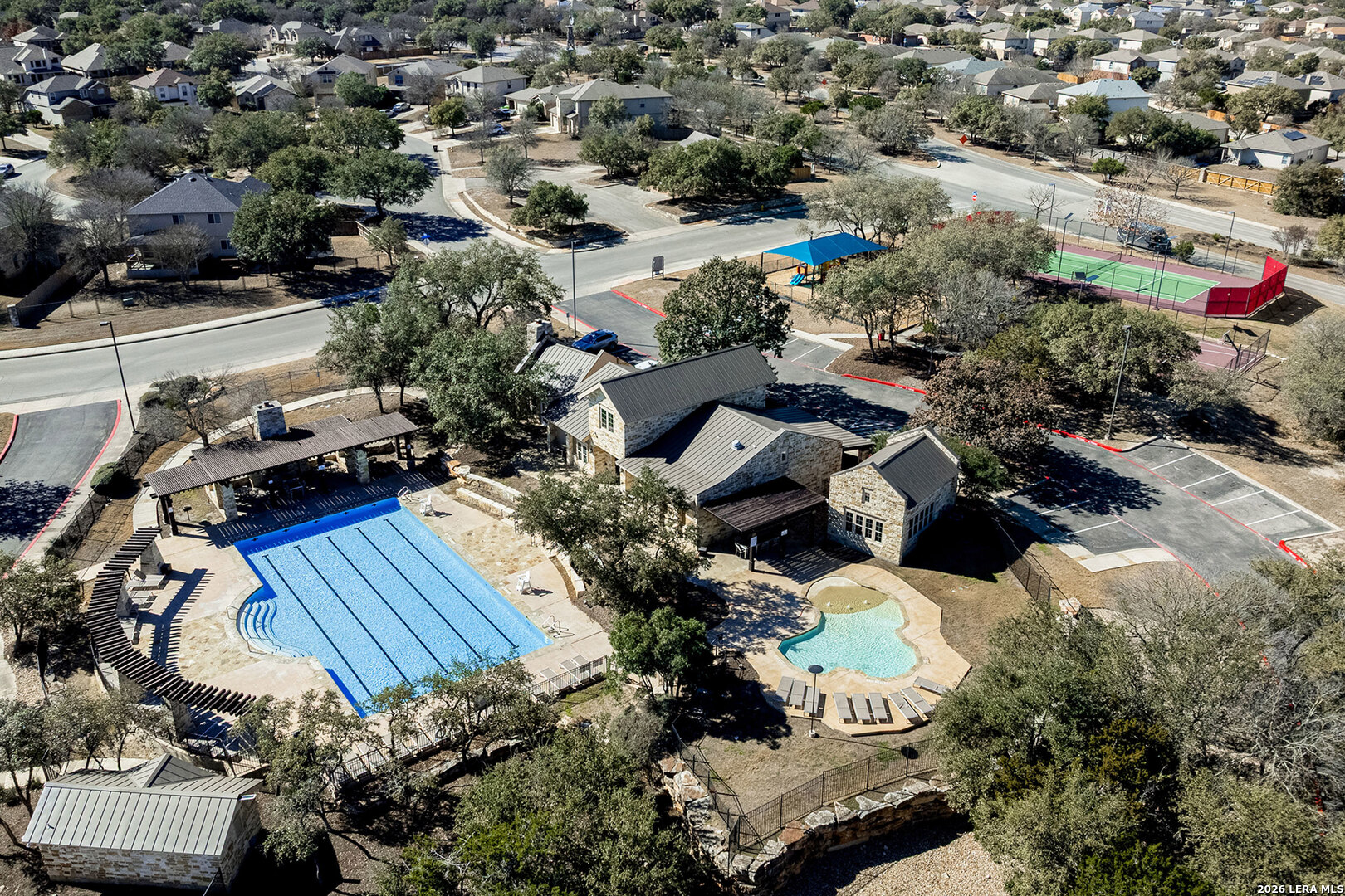 Well-maintained single-story home situated on a corner lot in Redbird Ranch. The property offers an open-concept floor plan with a spacious kitchen featuring a large island, stainless steel appliances including refrigerator, and a beverage refrigerator. Ceiling fans are installed in all bedrooms and the main living area. Windows include partial tinting and shutters. Both front and rear entry doors are equipped with storm doors. Recent updates include a roof replaced in 2025 with a transferable 5-year labor warranty. Additional features include a water softener, in-ground sprinkler system both front and back yard, washer and dryer, and two mounted flat-screen televisions located in the front bedrooms. A gated side entrance provides direct backyard access from the street, allowing for flexible outdoor use. The home is located near neighborhood amenities, including a pool and playground within walking distance. A third community amenity center is currently under construction and, upon completion, is planned to include additional pools, basketball courts, playgrounds, and tennis courts. The property is centrally located among all three amenity centers. Convenient access to H-E-B, shopping, dining, and major roadways. A Santikos Movie Theatre is currently under construction near H-E-B.