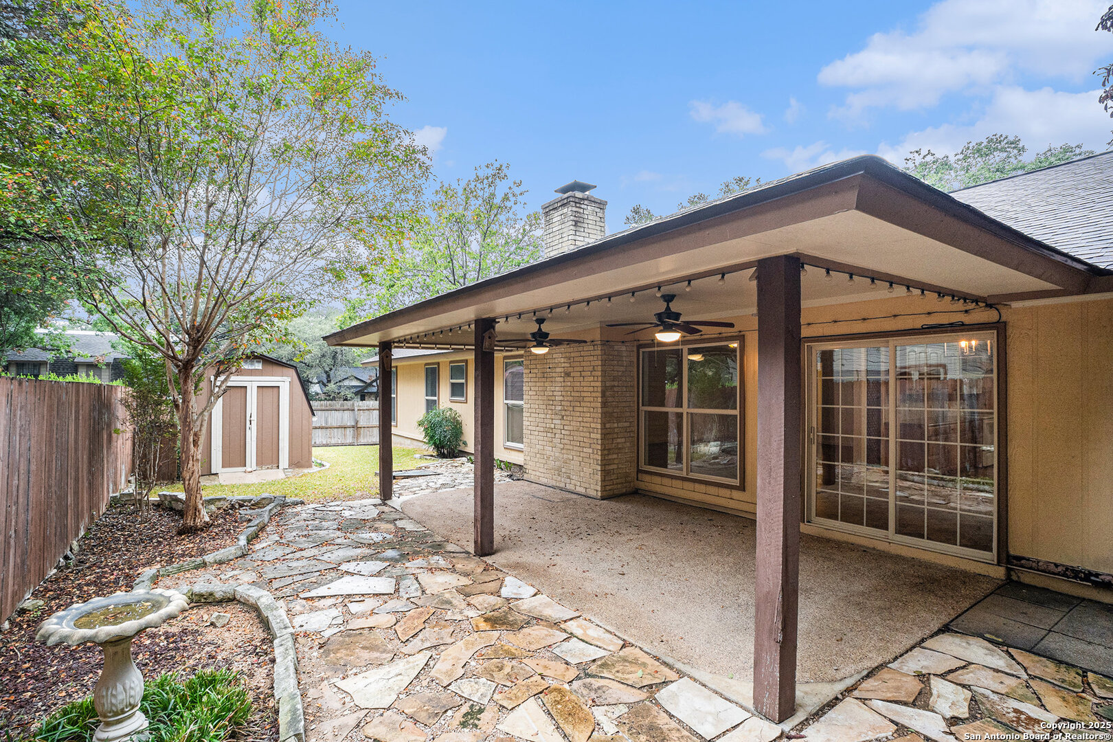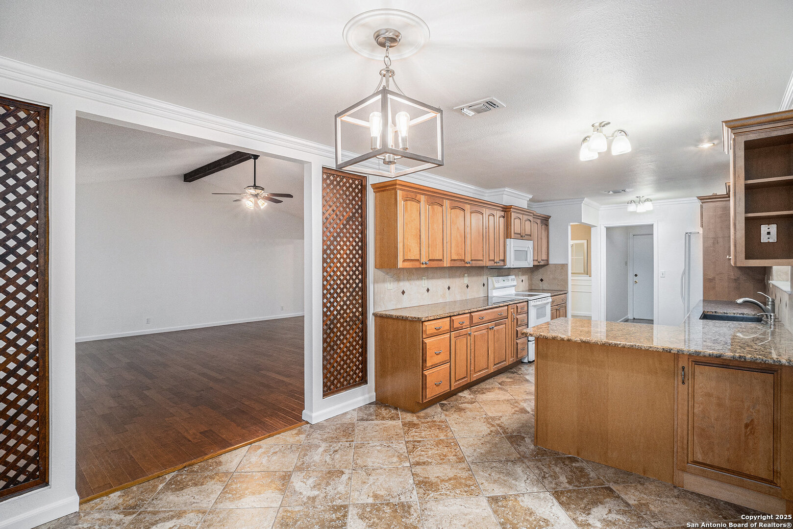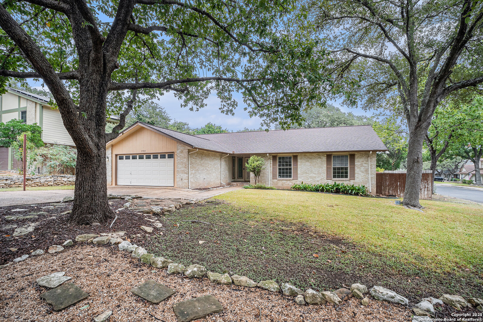 Located in the sought-after Oak Hollow Estates subdivision, this beautifully maintained and updated 4-bedroom, 2-bath home offers exceptional style, comfort, and convenience on a premium corner lot. Thoughtful exterior enhancements-including unique hardscaping, a rock wall, xeriscaping, and a striking glass front door-set an inviting tone before you even step inside. Double-pane windows enhance both efficiency and quiet enjoyment. A warm foyer leads to a stunning formal dining room accented with custom lattice wood slat walls that frame the entry with architectural character. The expansive living room impresses with vaulted ceilings, exposed wood beams, a cozy fireplace, and matching custom lattice wood slat wall inserts that define the transition into the oversized kitchen. This upgraded culinary space features granite counters, custom Kraftmaid cabinetry, modern lighting, high ceilings, and abundant crown molding for a refined touch. Above the sink, a charming custom stained-glass window serves as a striking focal point, filtering in soft, colorful light that elevates the kitchen's ambiance. This timeless feature adds refined character while welcoming natural light and serene views into the space. The primary suite is privately positioned away from the secondary bedrooms and includes an ensuite bath with granite countertops and a wheelchair-accessible shower. The home offers true ease of living with hardwood and 18" ceramic tile floors throughout-no carpet-and thoughtful handicap-accessible features. Additional highlights include an epoxy-coated garage floor and an updated electric circuit breaker box for peace of mind. The spacious backyard is perfect for outdoor living with a large, covered patio equipped with ceiling fans, plus a storage shed for tools and gear. Located near great schools and Hwy 281, inside Loop 1604, McAllister Park, shopping, entertainment, and the local library, this home combines style, accessibility, and an unbeatable location.