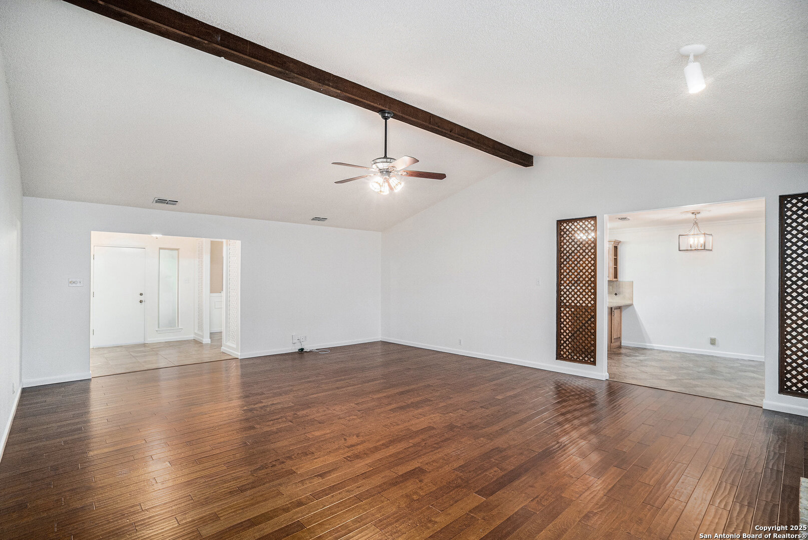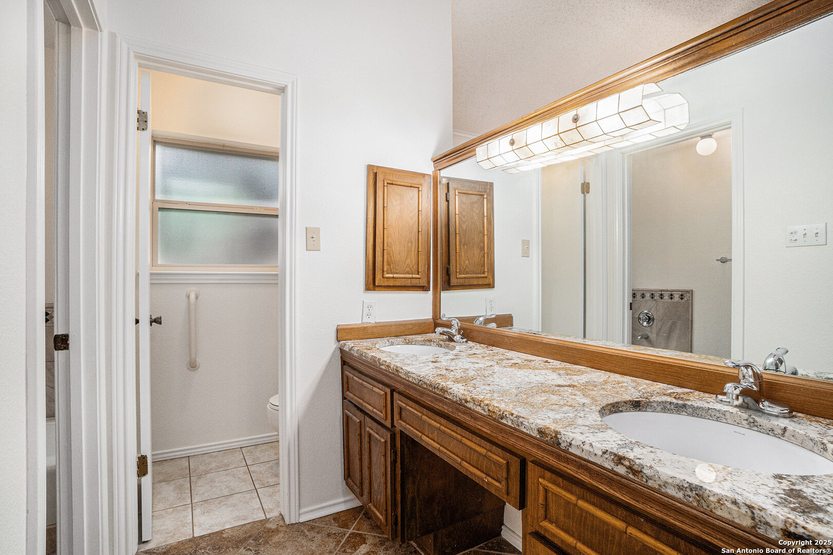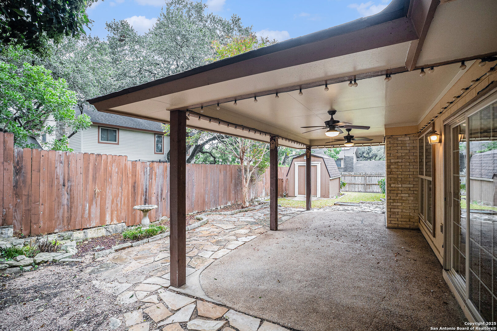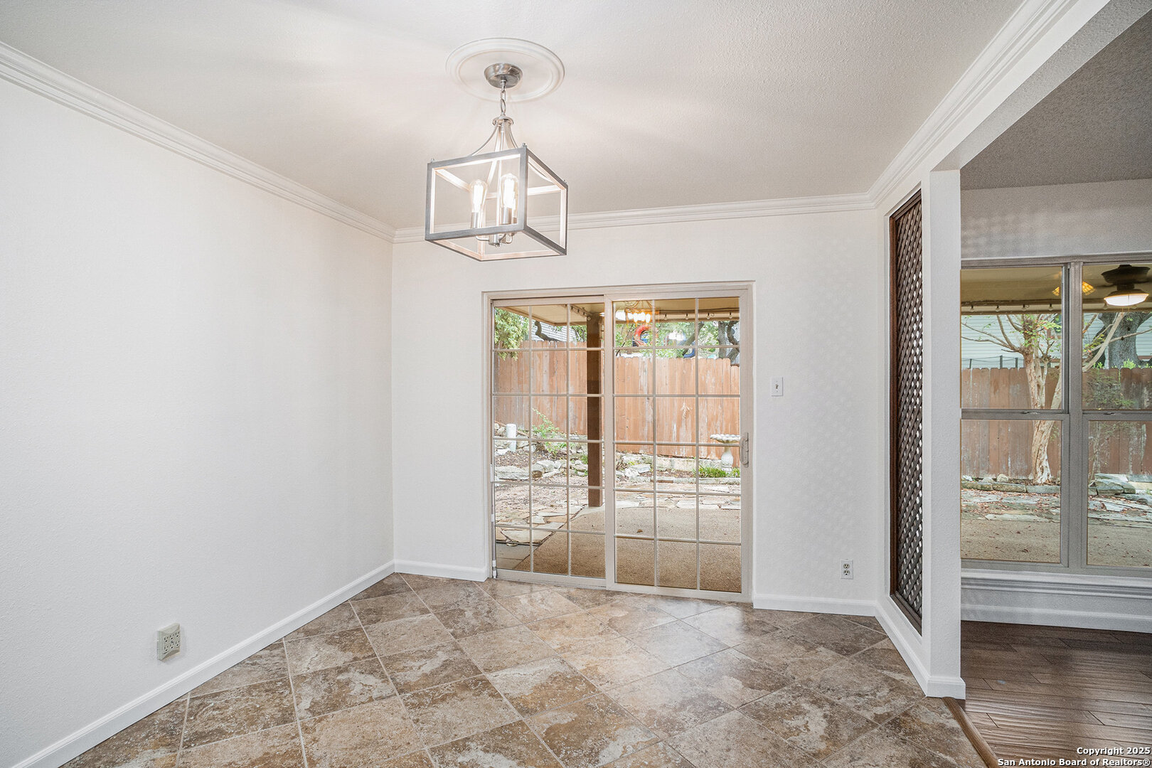 Located in the sought-after Oak Hollow Estates subdivision, this beautifully maintained and updated 4-bedroom, 2-bath home offers exceptional style, comfort, and convenience on a premium corner lot. Thoughtful exterior enhancements-including unique hardscaping, a rock wall, xeriscaping, and a striking glass front door-set an inviting tone before you even step inside. Double-pane windows enhance both efficiency and quiet enjoyment. A warm foyer leads to a stunning formal dining room accented with custom lattice wood slat walls that frame the entry with architectural character. The expansive living room impresses with vaulted ceilings, exposed wood beams, a cozy fireplace, and matching custom lattice wood slat wall inserts that define the transition into the oversized kitchen. This upgraded culinary space features granite counters, custom Kraftmaid cabinetry, modern lighting, high ceilings, and abundant crown molding for a refined touch. Above the sink, a charming custom stained-glass window serves as a striking focal point, filtering in soft, colorful light that elevates the kitchen's ambiance. This timeless feature adds refined character while welcoming natural light and serene views into the space. The primary suite is privately positioned away from the secondary bedrooms and includes an ensuite bath with granite countertops and a wheelchair-accessible shower. The home offers true ease of living with hardwood and 18" ceramic tile floors throughout-no carpet-and thoughtful handicap-accessible features. Additional highlights include an epoxy-coated garage floor and an updated electric circuit breaker box for peace of mind. The spacious backyard is perfect for outdoor living with a large, covered patio equipped with ceiling fans, plus a storage shed for tools and gear. Located near great schools and Hwy 281, inside Loop 1604, McAllister Park, shopping, entertainment, and the local library, this home combines style, accessibility, and an unbeatable location.