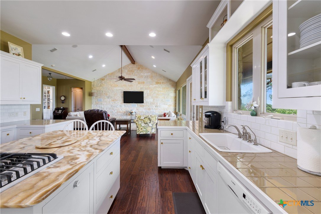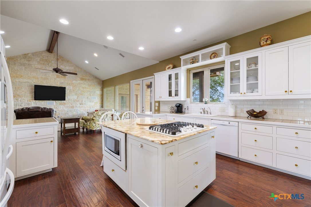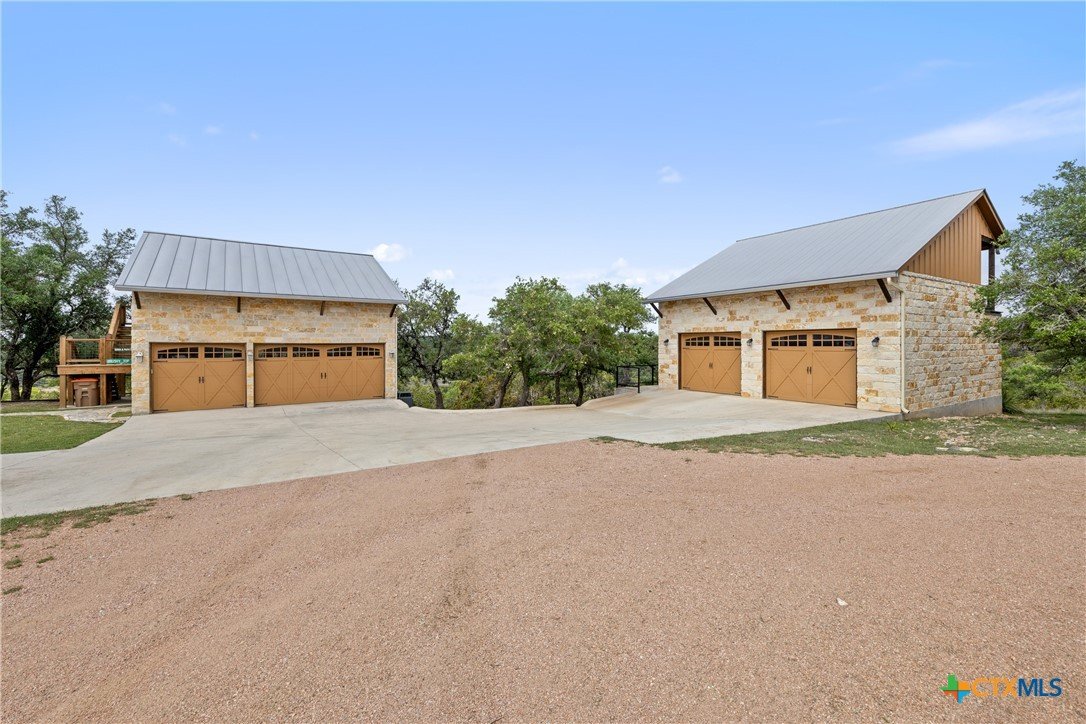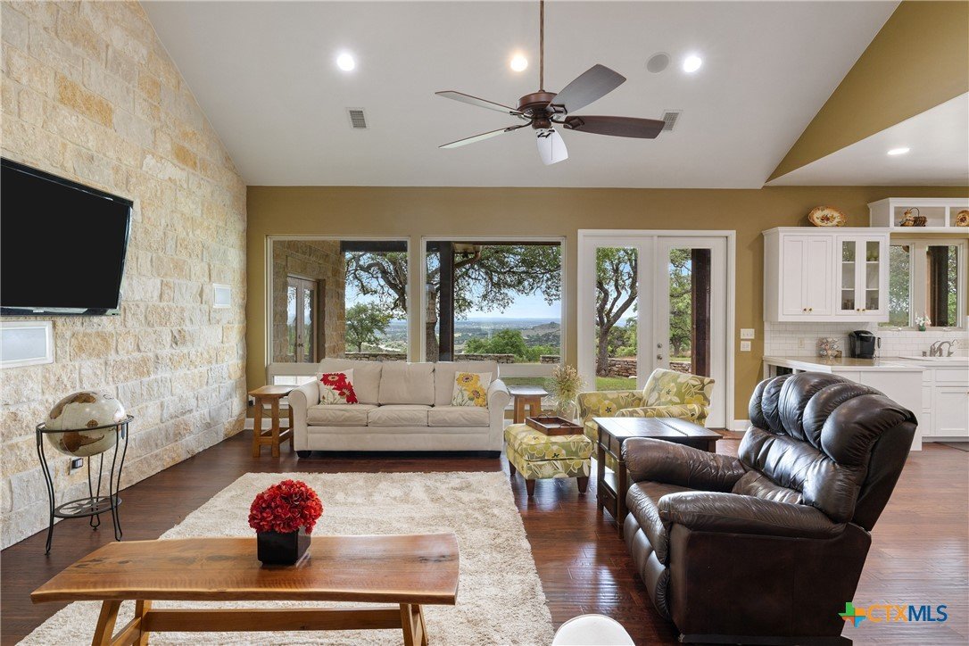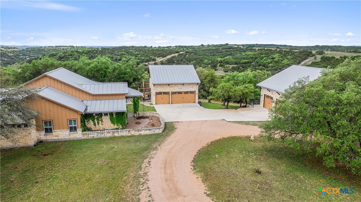 Welcome to a one-of-a-kind hill country retreat located in the highly sought-after gated community of Brushy Top. This beautifully maintained 10.6 acre property features a custom-built main residence, two separate guest apartments, and exceptional amenities throughout. The 2,475 sq ft main home offers 2 spacious bedrooms, 2.5 baths, and a large private office/3rd bedroom adorned with floor-to-ceiling bookshelves. Elegant interior rock walls, soaring vaulted ceilings in the living room, and 12-foot ceilings throughout enhance the homes open, airy ambiance. The gourmet kitchen flows seamlessly into the living area, complete with a built-in surround sound system perfect for entertaining. Rich wood flooring and a reverse osmosis water system add both luxury and practicality. The master suite boasts a walk-in Jacuzzi tub and generous space for relaxation. Step outside to enjoy expansive covered porches with stained concrete floors, ideal for taking in the peaceful surroundings. In addition to the main home, the property includes two oversized garages each with a fully equipped 1 bed, 1 bath apartment above, complete with kitchenettes perfect for guests or extended family. The land itself is meticulously maintained, with a high-producing water well (20 GPM) and gorgeous landscaping. Residents of Brushy Top enjoy exclusive access to two 10-acre stocked lakes for fishing and recreation, as well as a private wildlife conservancy featuring seven species, including majestic elk. Don't miss your chance to own this exceptional property in one of the Hill Country's most desirable communities.