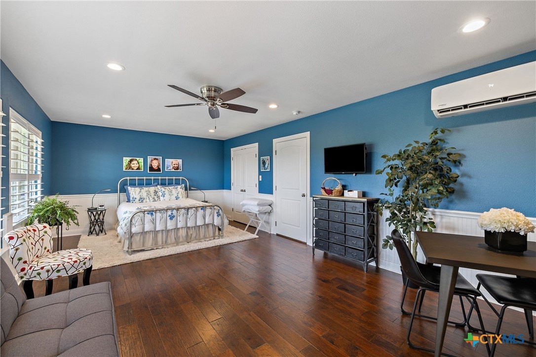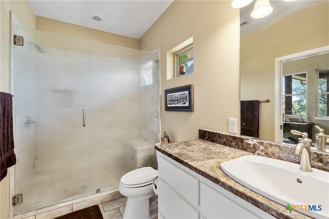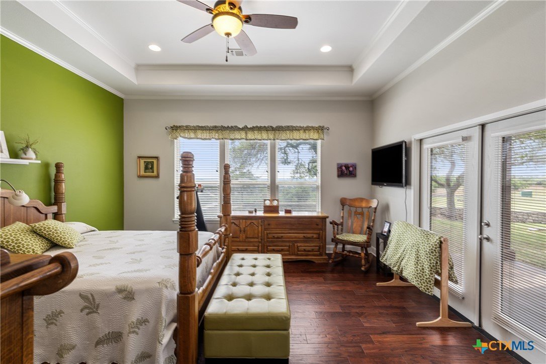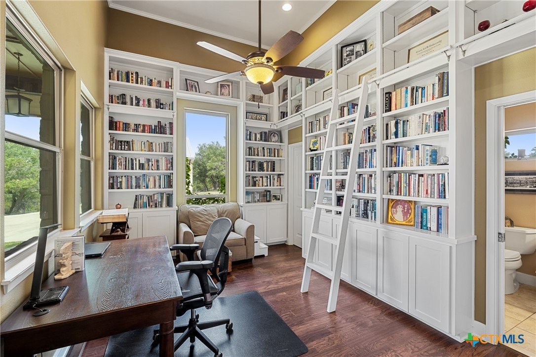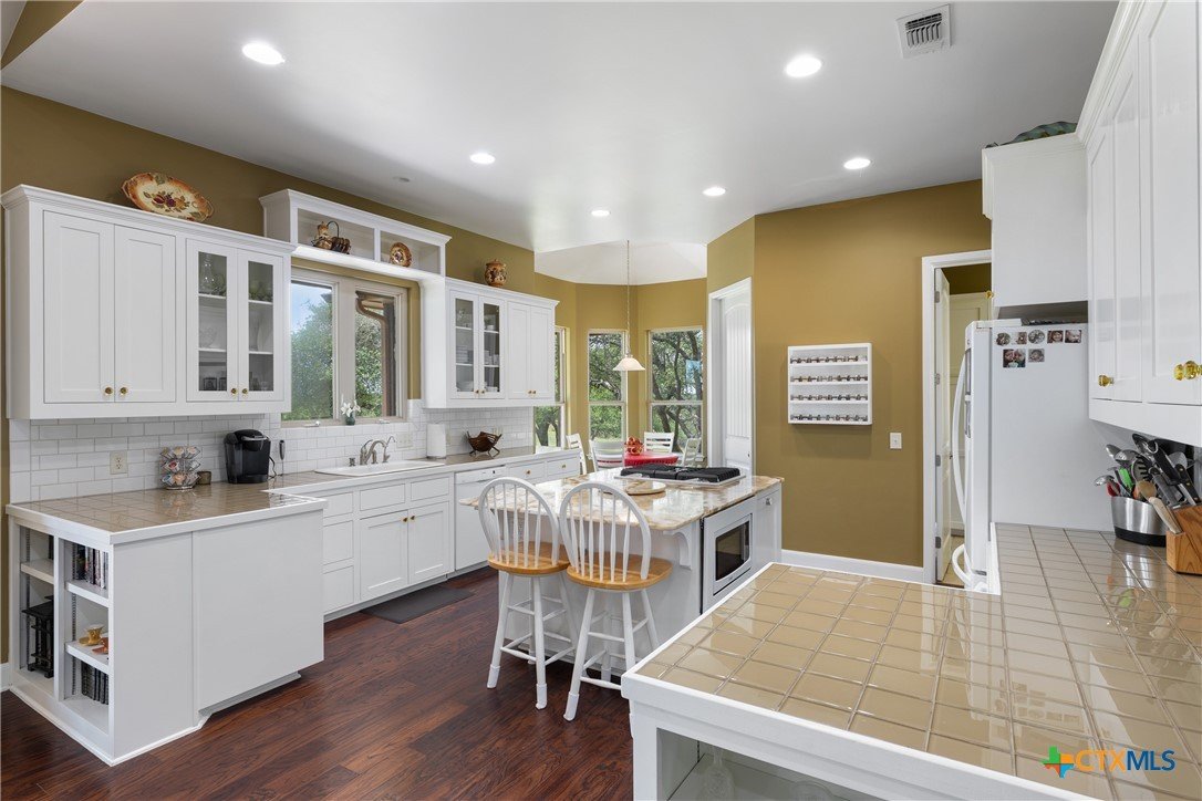 Welcome to a one-of-a-kind hill country retreat located in the highly sought-after gated community of Brushy Top. This beautifully maintained 10.6 acre property features a custom-built main residence, two separate guest apartments, and exceptional amenities throughout. The 2,475 sq ft main home offers 2 spacious bedrooms, 2.5 baths, and a large private office/3rd bedroom adorned with floor-to-ceiling bookshelves. Elegant interior rock walls, soaring vaulted ceilings in the living room, and 12-foot ceilings throughout enhance the homes open, airy ambiance. The gourmet kitchen flows seamlessly into the living area, complete with a built-in surround sound system perfect for entertaining. Rich wood flooring and a reverse osmosis water system add both luxury and practicality. The master suite boasts a walk-in Jacuzzi tub and generous space for relaxation. Step outside to enjoy expansive covered porches with stained concrete floors, ideal for taking in the peaceful surroundings. In addition to the main home, the property includes two oversized garages each with a fully equipped 1 bed, 1 bath apartment above, complete with kitchenettes perfect for guests or extended family. The land itself is meticulously maintained, with a high-producing water well (20 GPM) and gorgeous landscaping. Residents of Brushy Top enjoy exclusive access to two 10-acre stocked lakes for fishing and recreation, as well as a private wildlife conservancy featuring seven species, including majestic elk. Don't miss your chance to own this exceptional property in one of the Hill Country's most desirable communities.