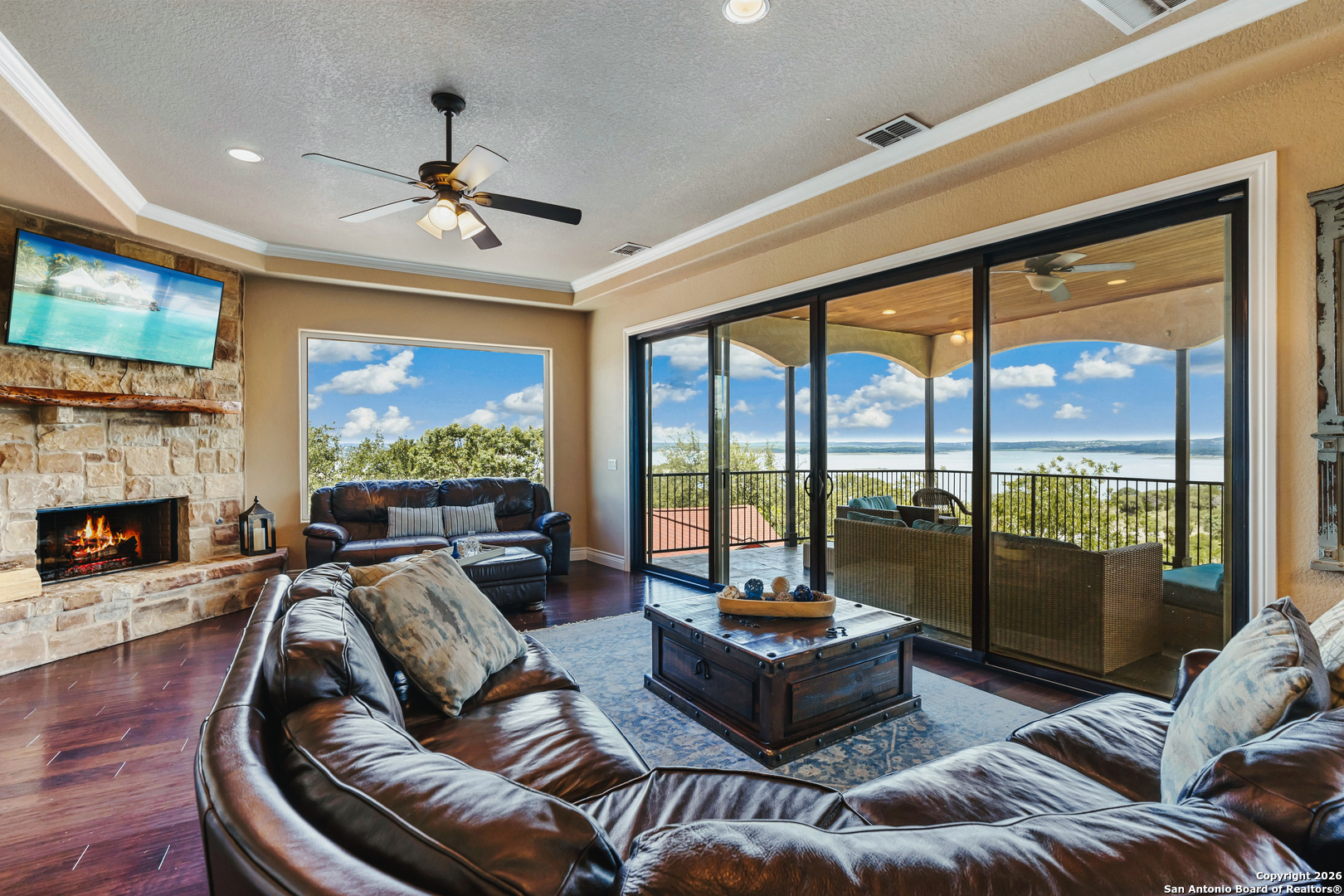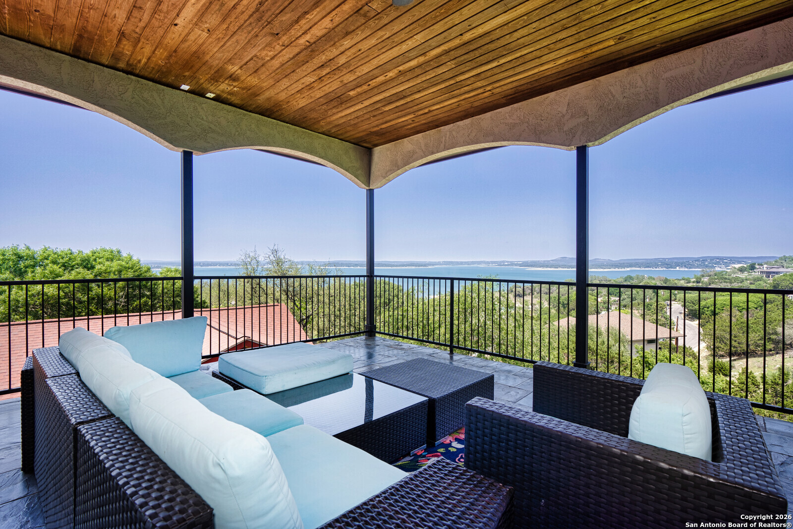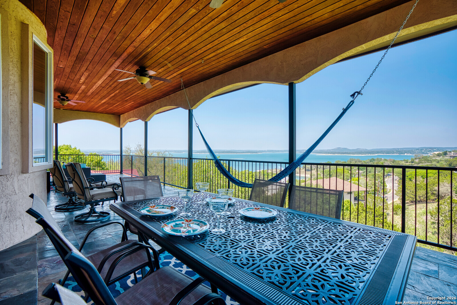 Views, views, and more views! Enjoy some of the best panoramic Canyon Lake scenery from nearly every room in this stunning home. The kitchen features custom cabinetry with pull-out shelving, stainless steel appliances, and granite countertops-perfect for both everyday living and entertaining. A spacious open-concept layout includes a dedicated office with built-ins and a separate panorama room to take in breathtaking Canyon Lake views, watch movies, or play games with friends and family. Step outside to beautifully maintained landscaping with a sprinkler system and over 1,000 sq. ft. of covered patio and decking, creating an incredible outdoor living space to unwind, host guests, and soak in unforgettable sunsets. Most furniture and appliances convey, making this home truly move-in ready. Whether you're entertaining or simply relaxing, this Canyon Lake retreat delivers the lifestyle you've been dreaming of.
