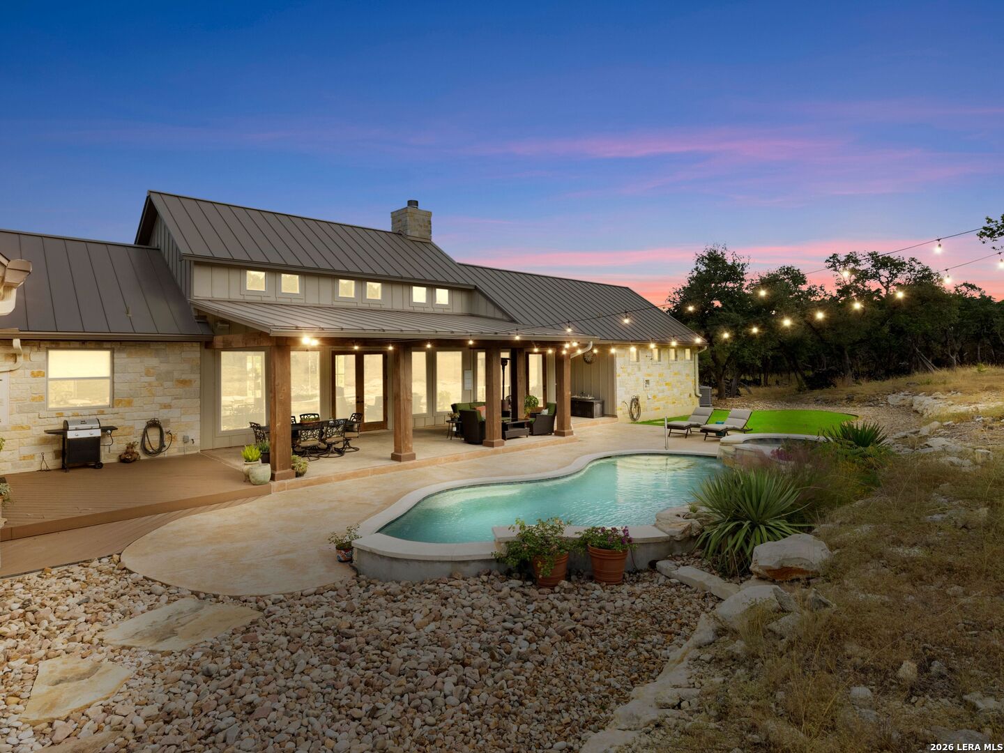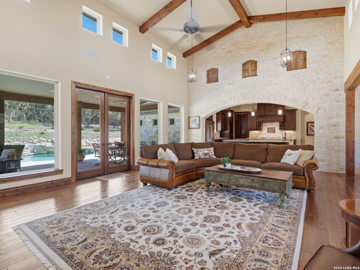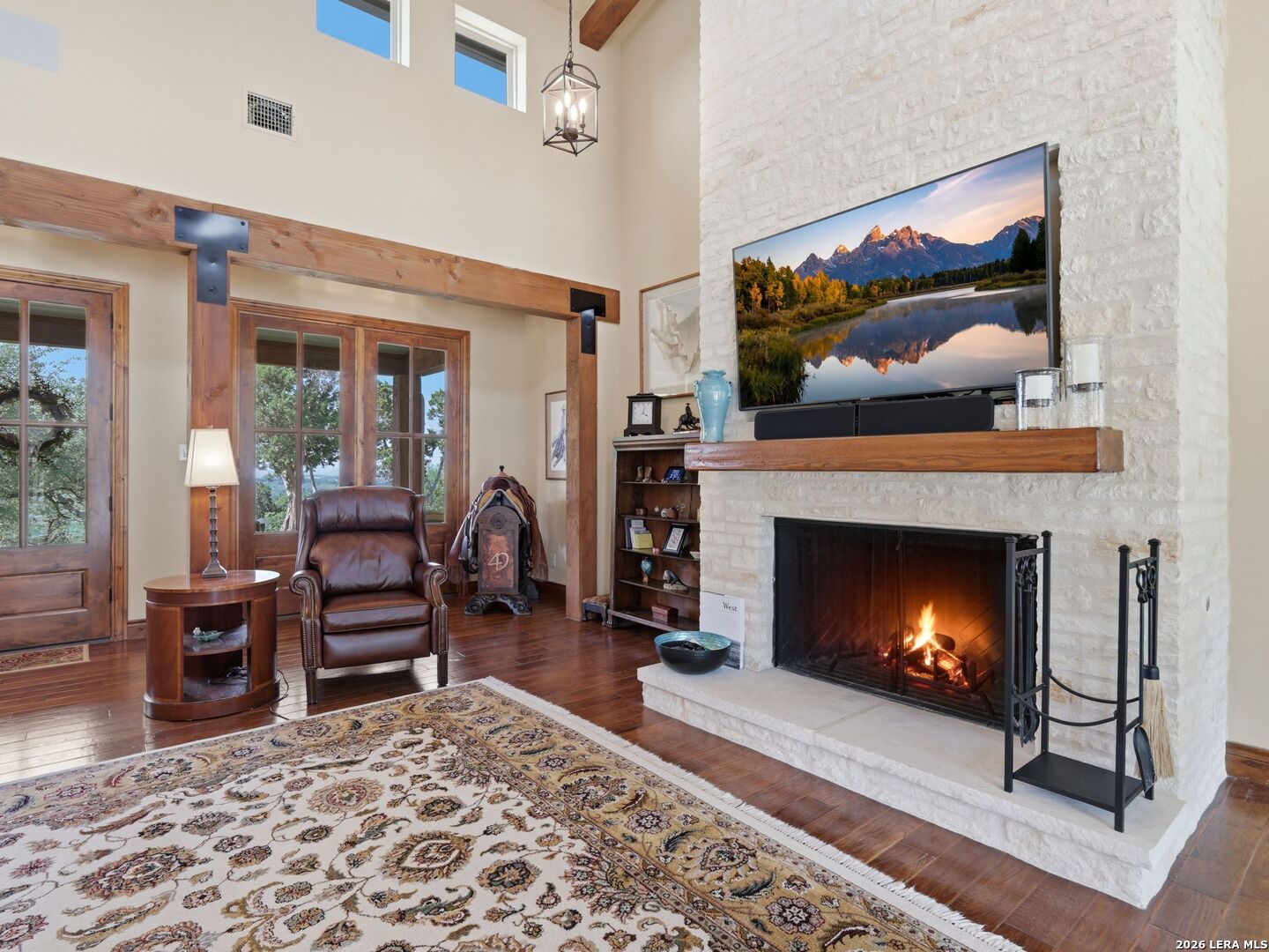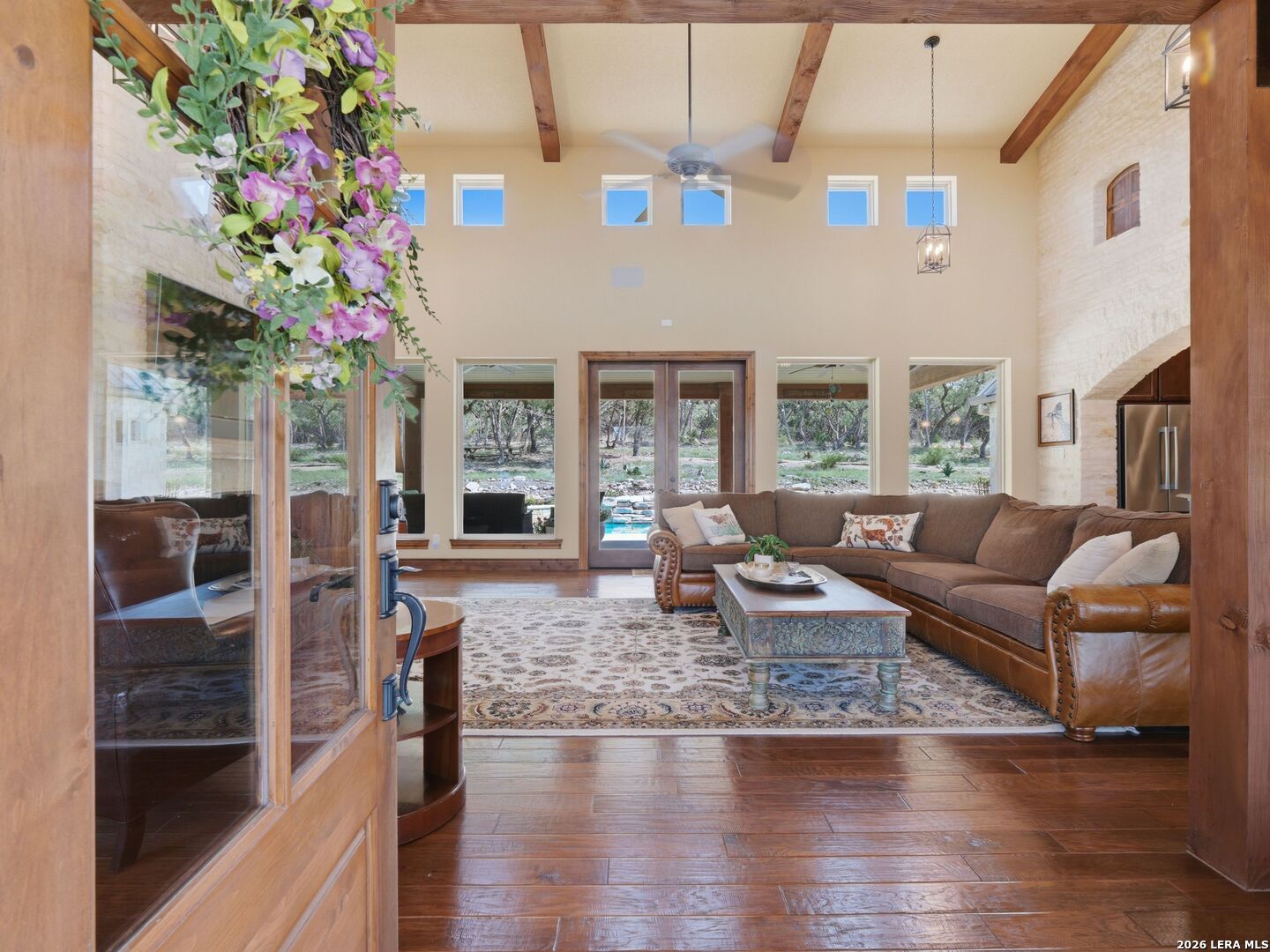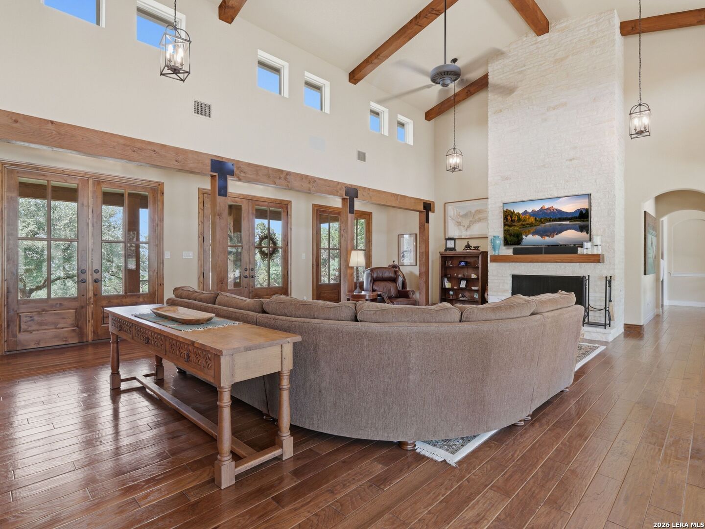 Picturesque Hill Country views with Twin Sisters visible in the distance set the tone for this 10+ acre retreat! Nestled along a scenic ridge in in the gated community of Rebecca Creek Ranches, this exceptional custom built home is filled with an abundance of natural light, perfectly framing the surrounding Hill Country vistas. Cathedral ceilings and wood beams accent a grand stone fireplace in the living room, while a spacious layout flows into a chef's kitchen with large island, Bosch appliances, and a five-burner gas cooktop. Outdoor living shines with a sparkling pool, waterfall, hot tub, expansive patio, and outdoor kitchen - perfect for entertaining or unwinding in total privacy. A rare blend of views, acreage, and lifestyle that's hard to find and even harder to leave!