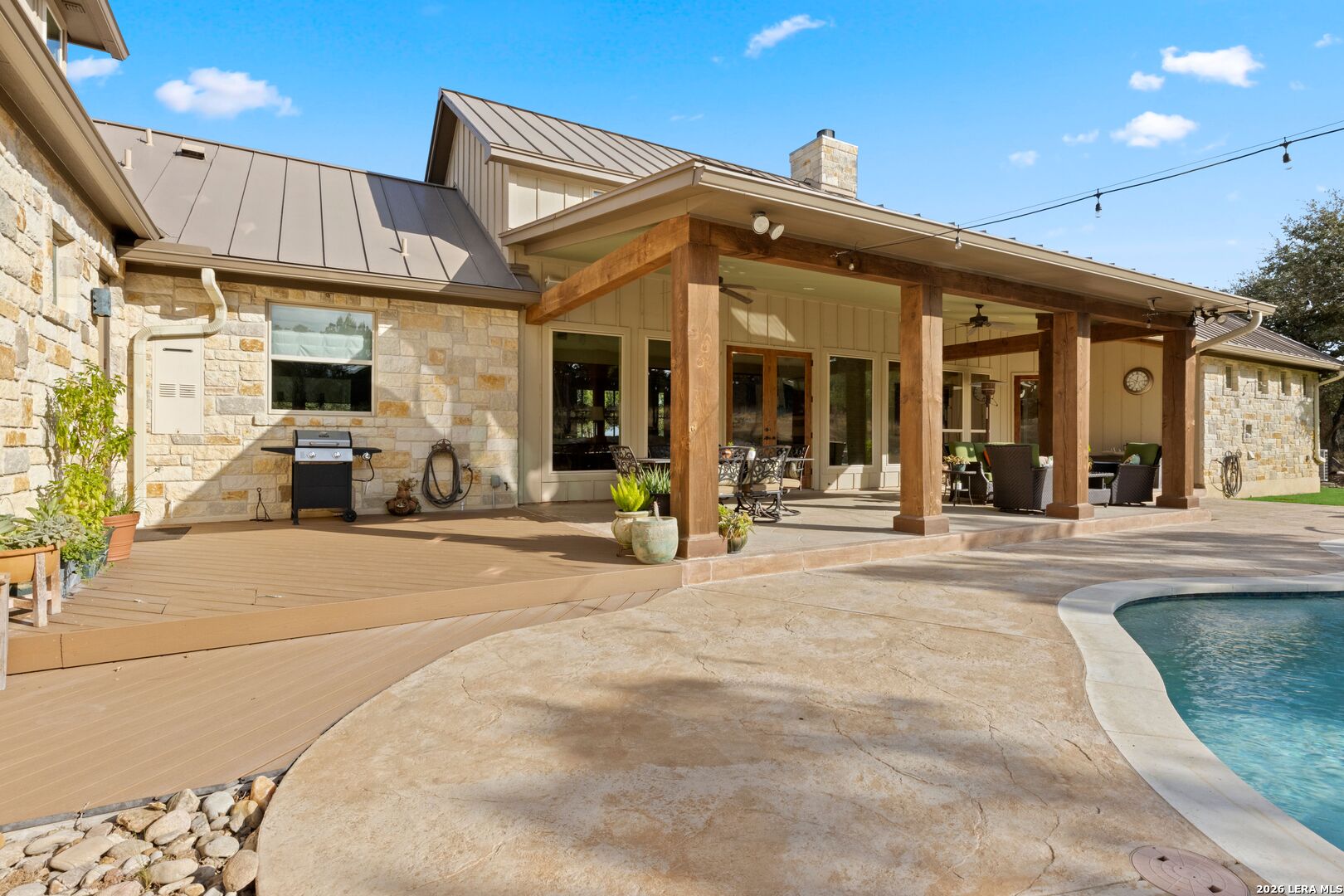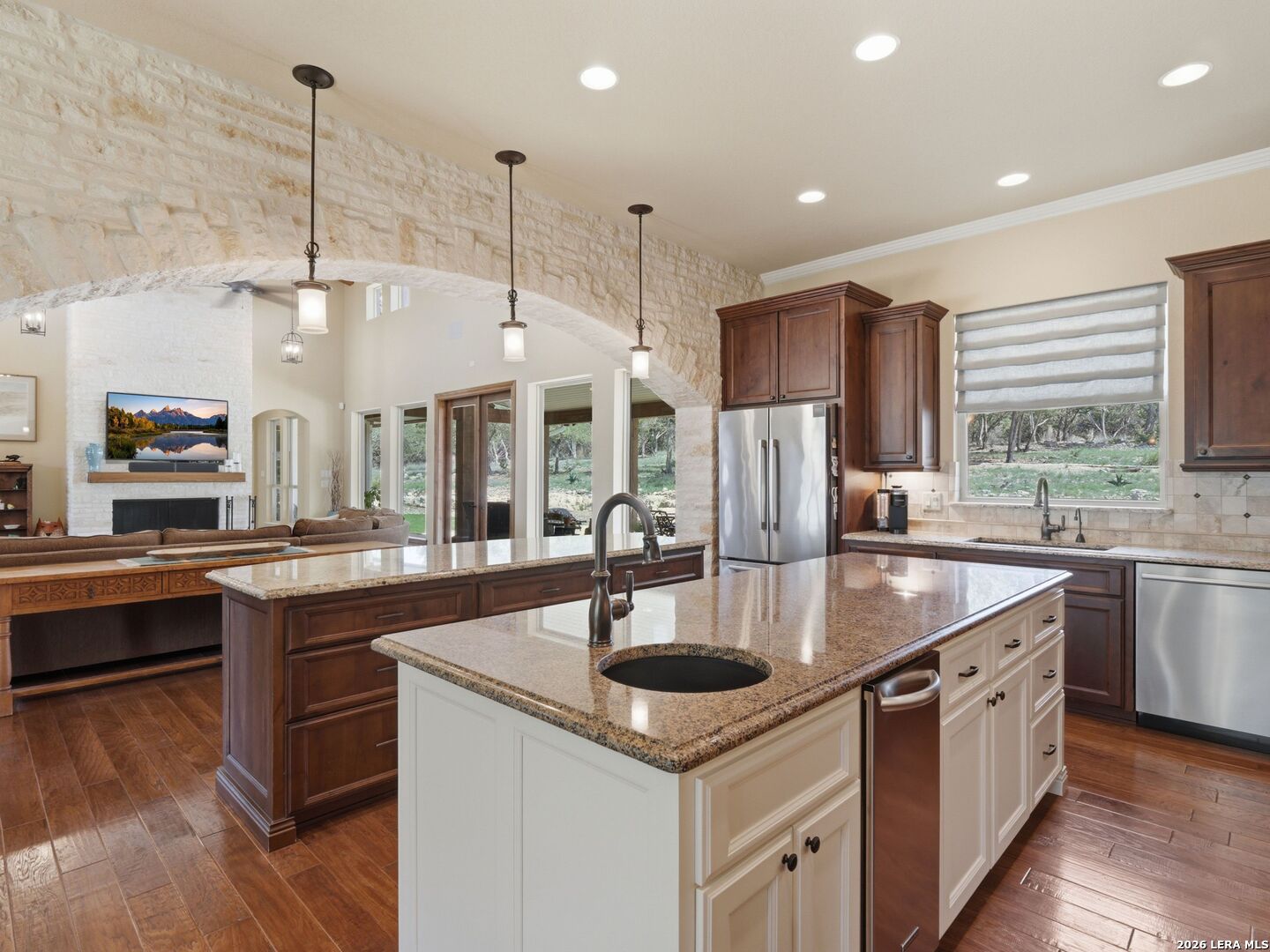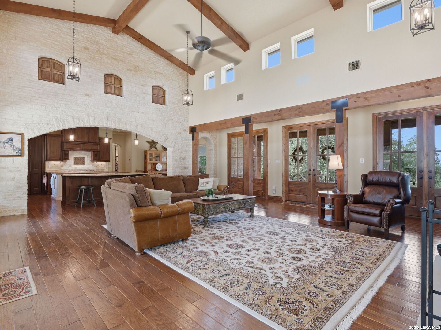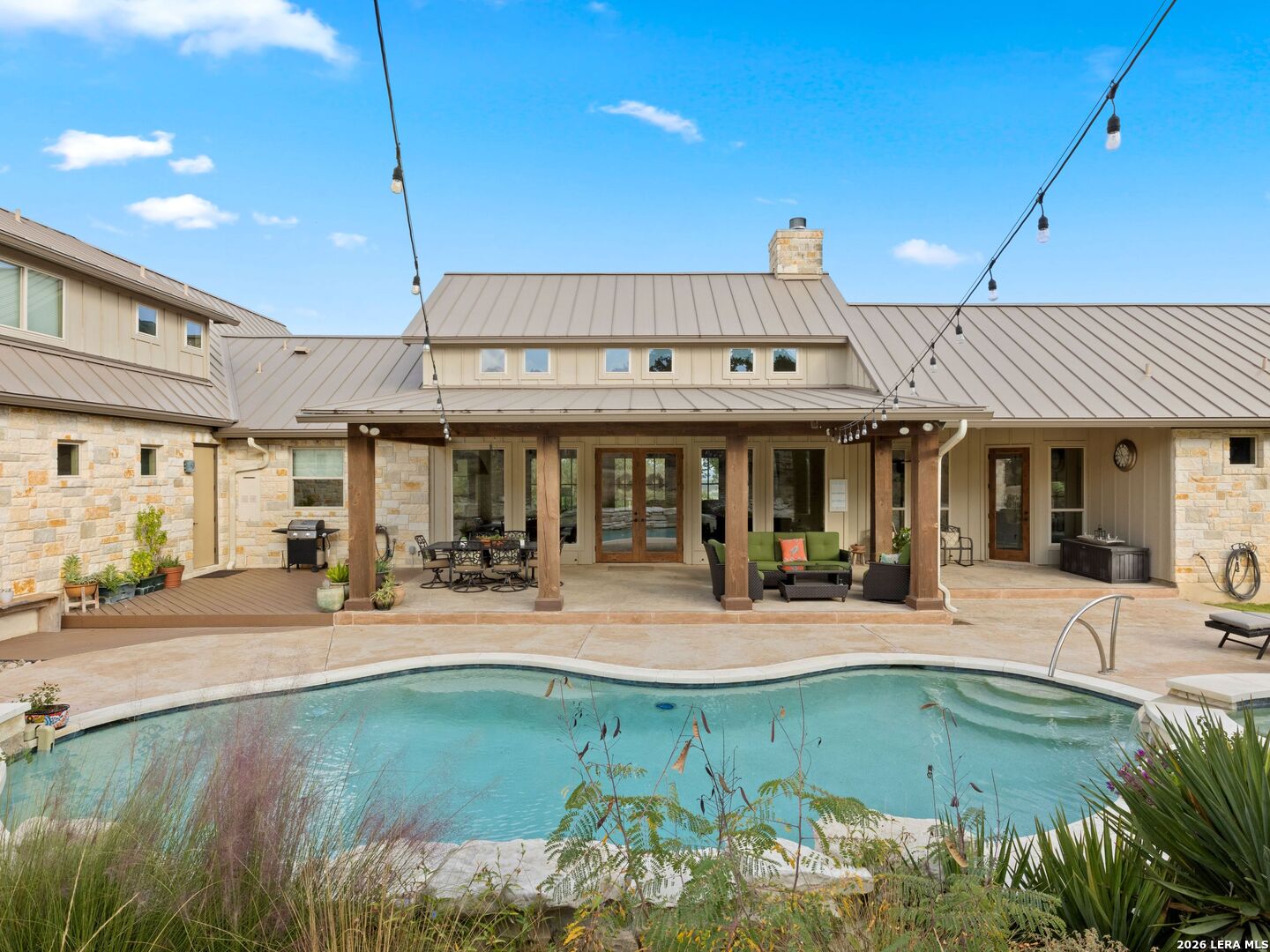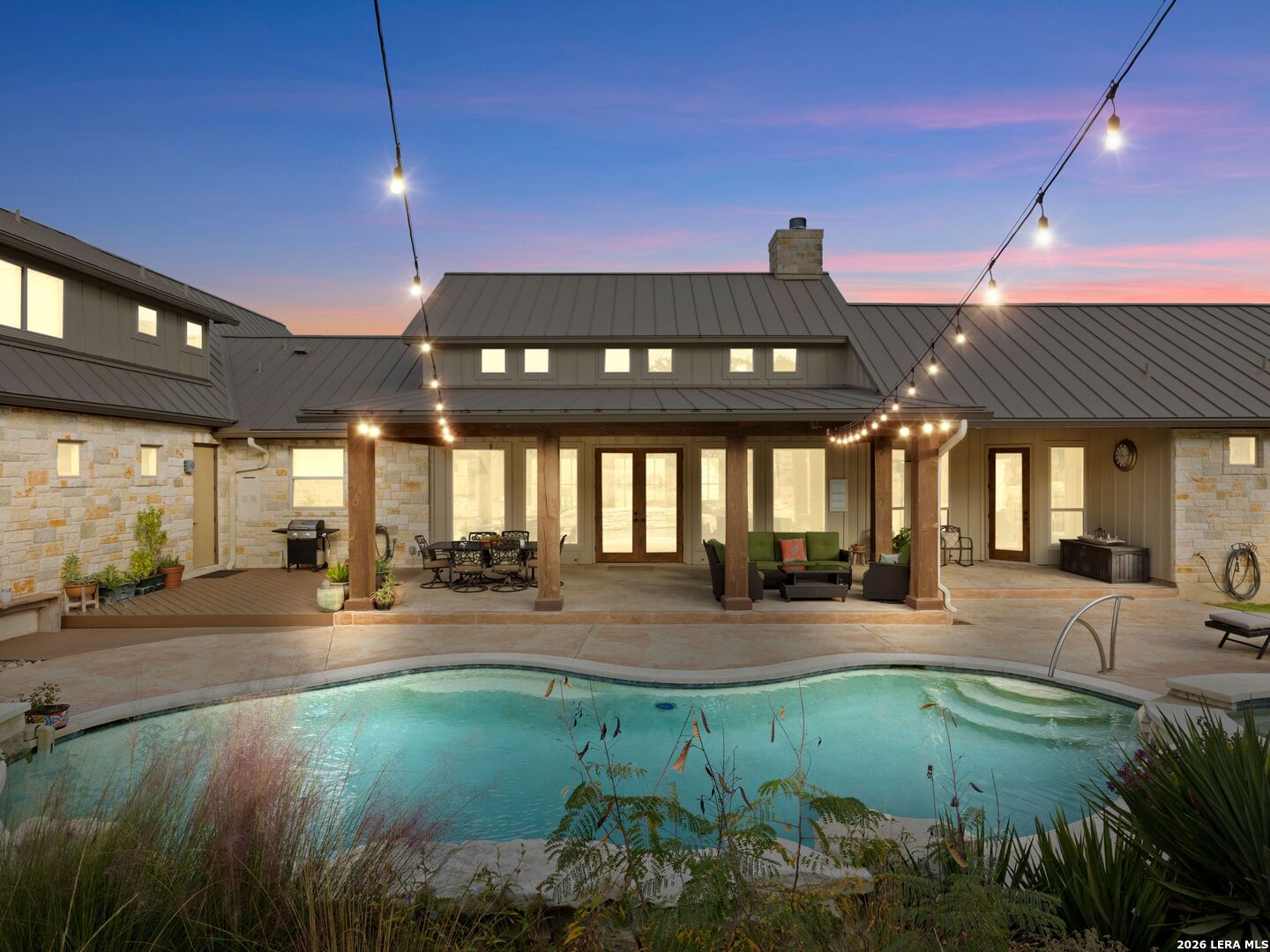 Picturesque Hill Country views with Twin Sisters visible in the distance set the tone for this 10+ acre retreat! Nestled along a scenic ridge in in the gated community of Rebecca Creek Ranches, this exceptional custom built home is filled with an abundance of natural light, perfectly framing the surrounding Hill Country vistas. Cathedral ceilings and wood beams accent a grand stone fireplace in the living room, while a spacious layout flows into a chef's kitchen with large island, Bosch appliances, and a five-burner gas cooktop. Outdoor living shines with a sparkling pool, waterfall, hot tub, expansive patio, and outdoor kitchen - perfect for entertaining or unwinding in total privacy. A rare blend of views, acreage, and lifestyle that's hard to find and even harder to leave!