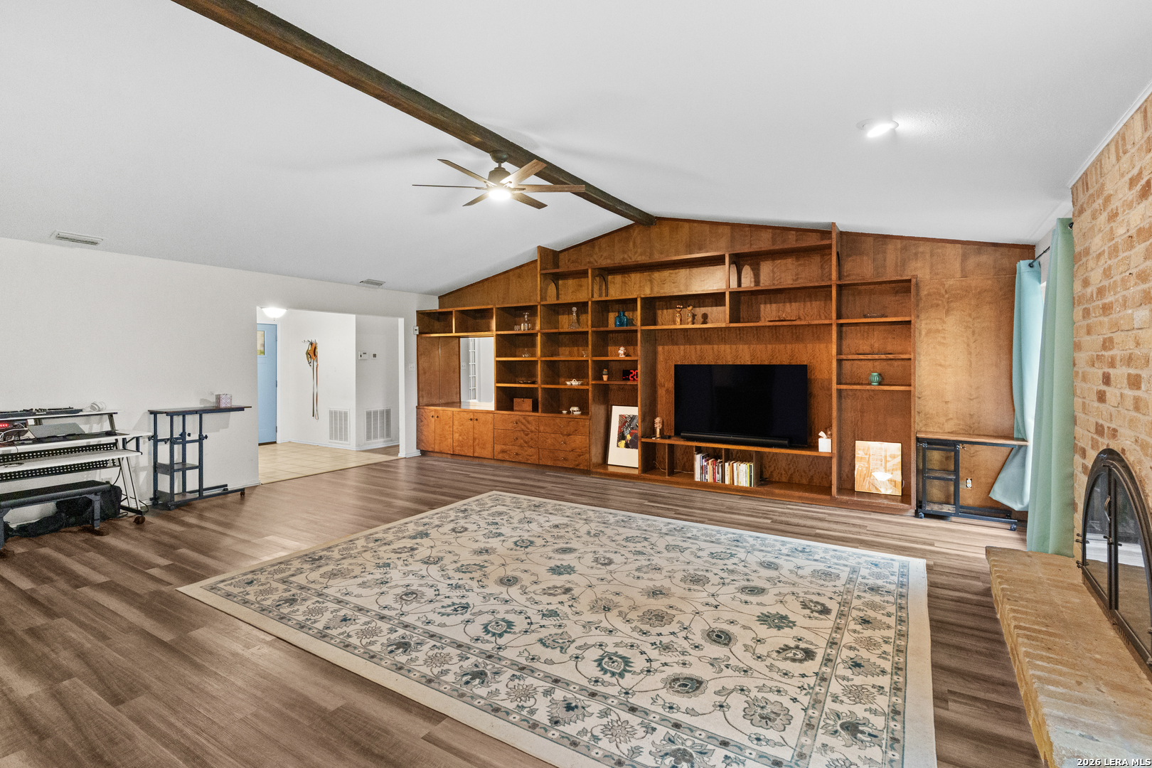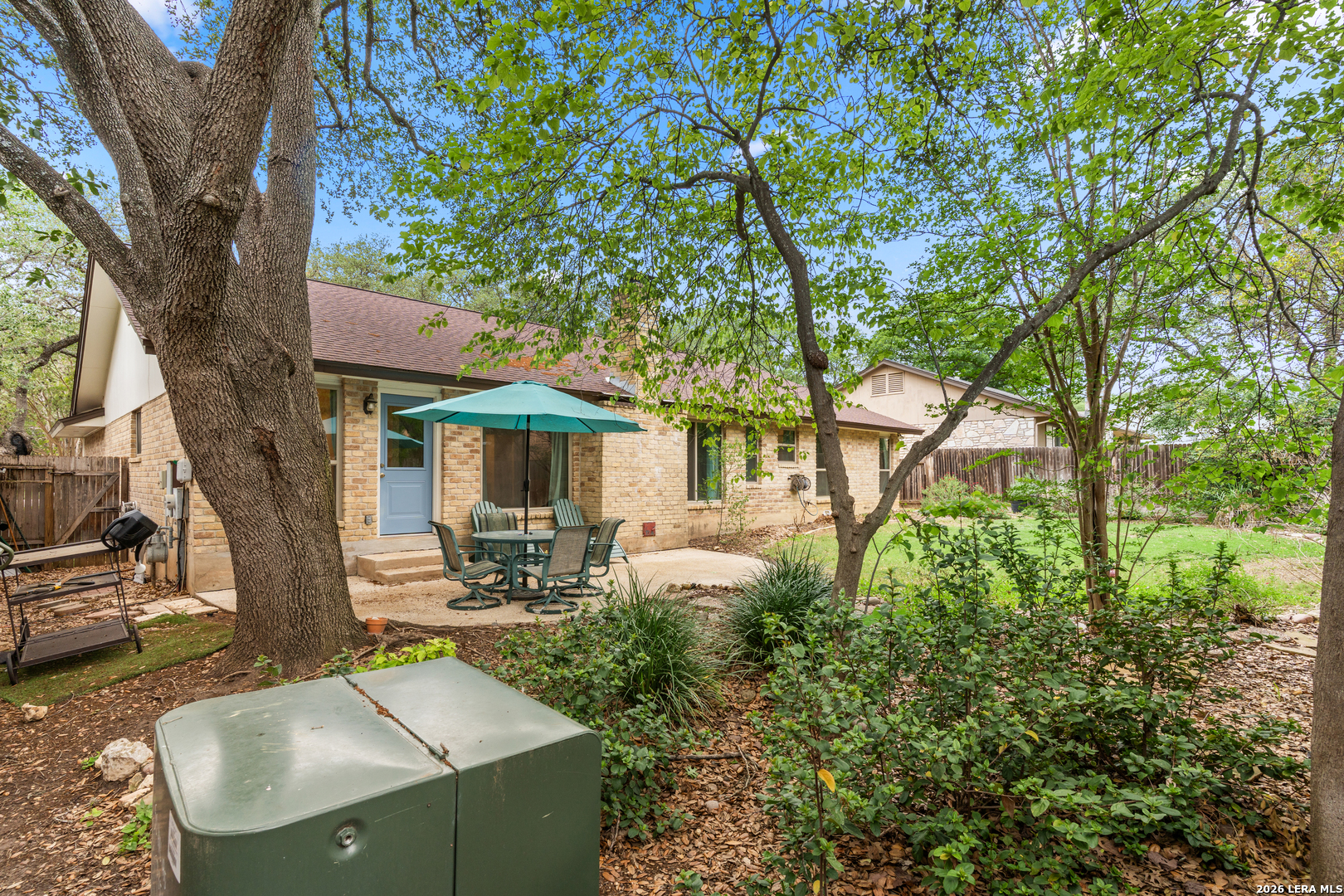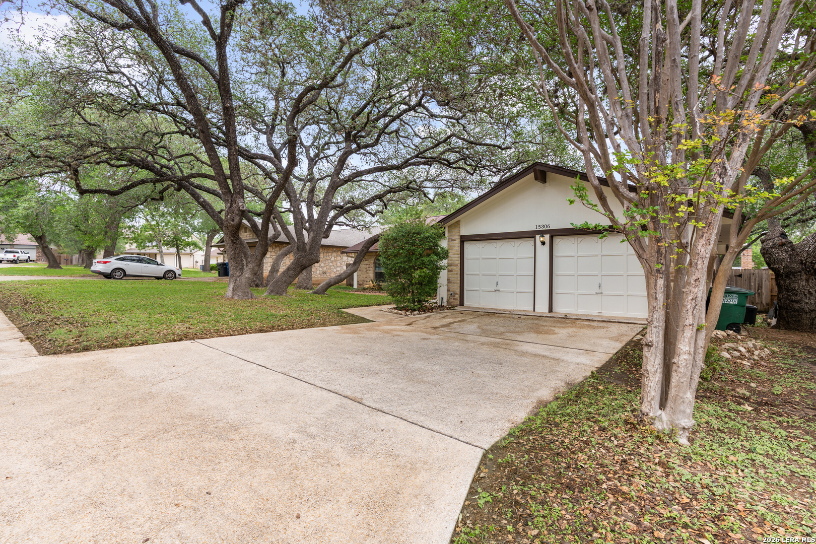 Located in North Central San Antonio's Thousand Oaks area, 15306 Mount Eagle St offers 5 bedrooms, 2 bathrooms, and approximately 2,243 square feet in a one story layout that combines character, flexibility, and everyday function. The living room stands out with vaulted ceilings, exposed beam detail, built in shelving, a brick fireplace, and large windows that bring in natural light and backyard views. The kitchen offers granite counters, tile backsplash, solid cabinet storage, breakfast bar seating, and easy flow into the breakfast area and dining or flex room. The primary suite is generously sized, the secondary bedrooms offer comfortable usable space, and a partially converted garage adds bonus room flexibility for an office, hobby space, guest room, or other needs. Mature trees and a spacious backyard complete the setting in a part of 78232 that continues to draw buyers looking for an established feel with convenient access to daily amenities.Ubicada en la zona de Thousand Oaks, en el area norte central de San Antonio, 15306 Mount Eagle St ofrece 5 recamaras, 2 banos y aproximadamente 2,243 pies cuadrados en una distribucion de un nivel que combina caracter, versatilidad y funcionalidad diaria. La sala principal resalta con techos altos, vigas expuestas, repisas empotradas, chimenea de ladrillo y ventanales que permiten buena luz natural y vista hacia el patio. La cocina cuenta con cubiertas de granito, backsplash de azulejo, buen espacio de gabinetes, barra desayunadora y conexion comoda hacia el desayunador y el area de comedor o espacio flexible. La recamara principal ofrece muy buen tamano, las recamaras secundarias tienen espacio comodo y la conversion parcial del garaje agrega un area adicional ideal para oficina, cuarto de visitas, pasatiempo u otras necesidades. Arboles maduros y un patio trasero amplio completan el entorno en una parte de 78232 que sigue llamando la atencion de compradores que buscan un ambiente establecido con acceso conveniente a servicios y zonas comerciales.