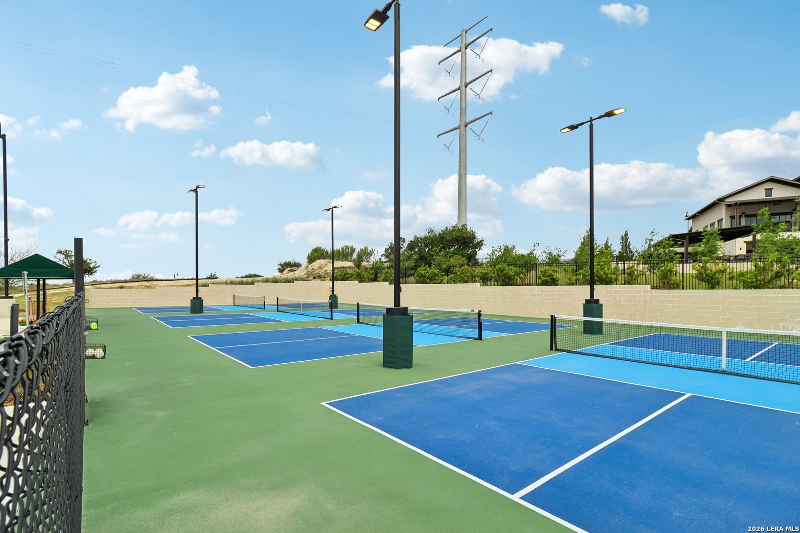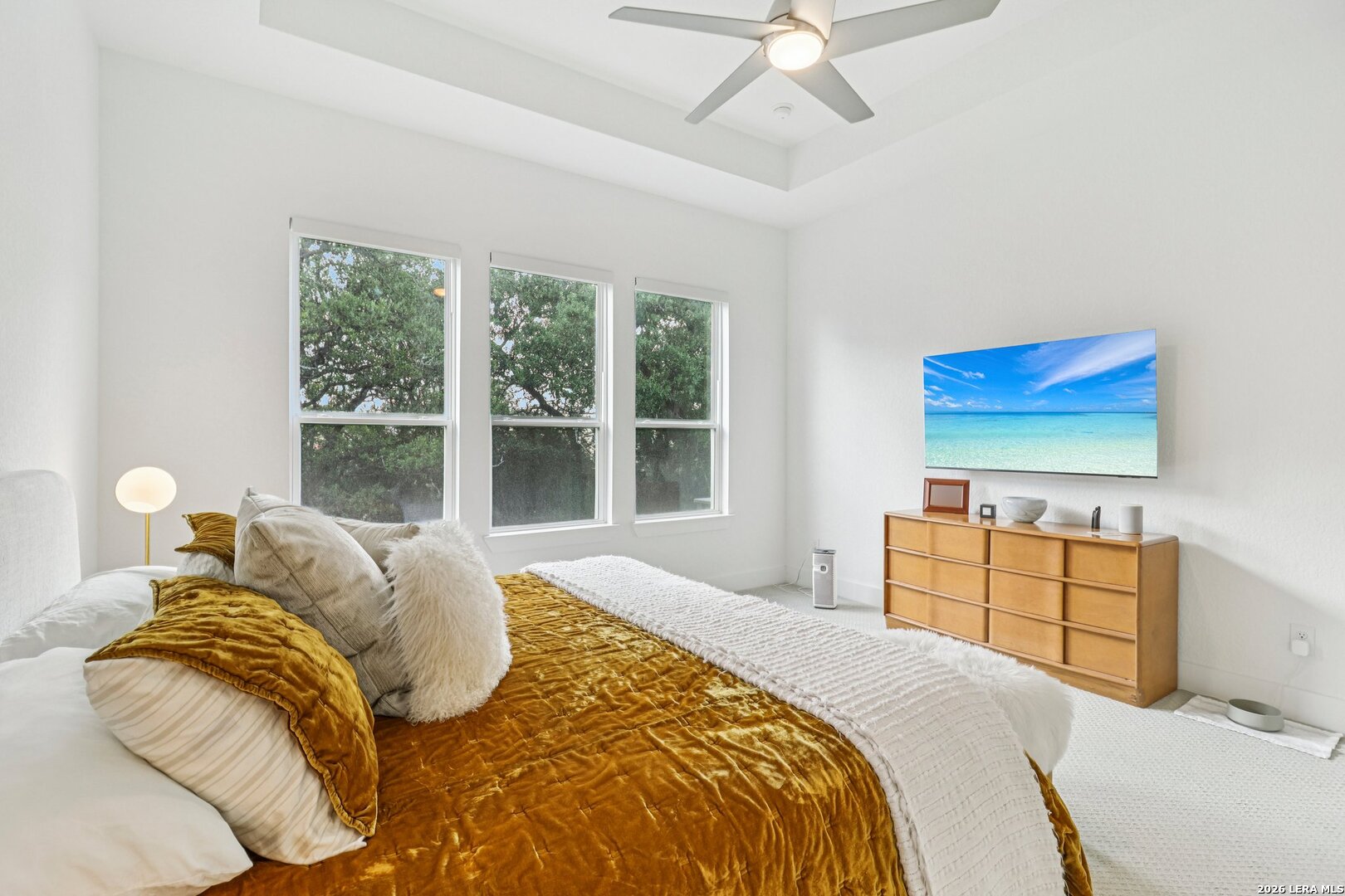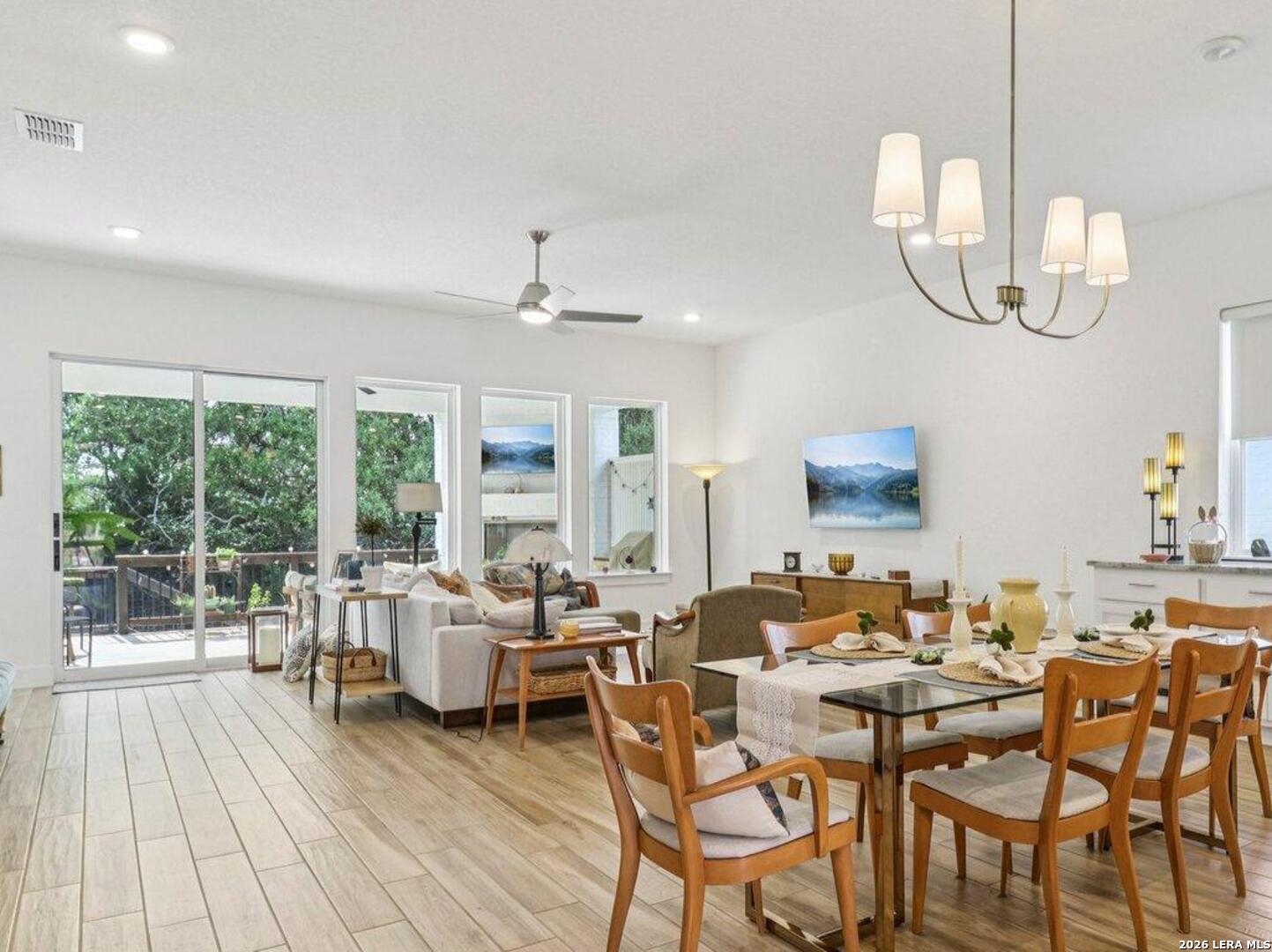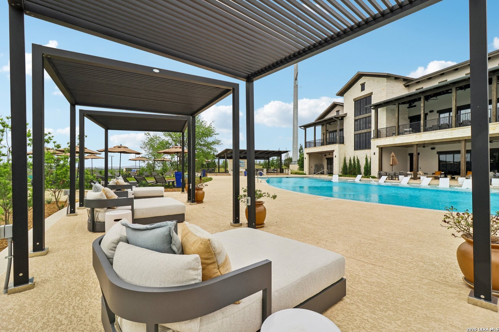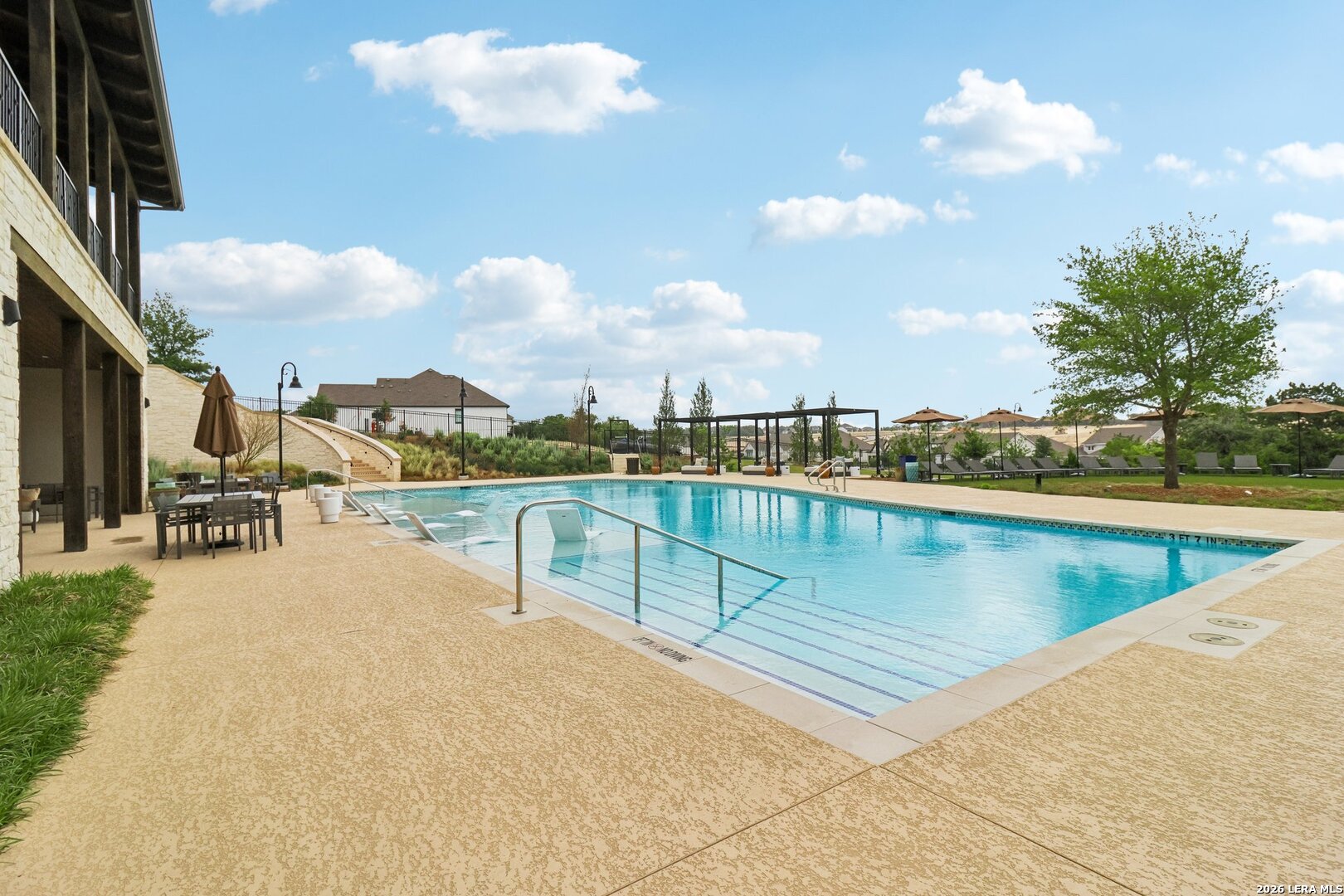 Greenbelt lot! Regency at Esperanza - Active Adult Community. Open and bright this beautiful home has an open floor plan with a spacious great room and casual dining area. Kitchen has large island/breakfast bar, upgraded cabinets, and gas cooking. Secluded primary bedroom featuring 11' tray ceilings, walk-in closet, elegant en-suite with double vanity, vessel tub and separate shower. Perfect for relaxation and entertaining, the oversized private covered patio features a fireplace and greenbelt view! Other features include 100% maintenance-free brick exterior, premier Colonial White granite, Mahogany entry door, Shaw carpet upgrade with Scotch-guard, tankless water heater, laundry room sink and water softener pre-plumb. Additionally, the property has a dedicated gas stub out for a fireplace in living, outside grill and is prewired for a pool and spa. Just a short walk to exclusive community amenities, including a resort-style pool, fitness center, bocce ball, pickle ball, and a dedicated Lifestyle Director. Nestled within the expansive Esperanza master planned communitya with dog park, lazy river, 20+ miles of trails, minutes from downtown Boerne with restaurants and shopping.
