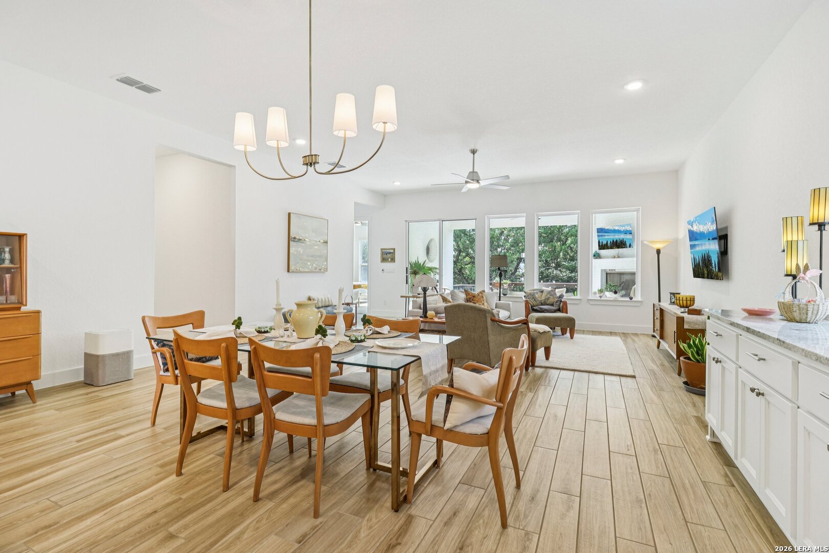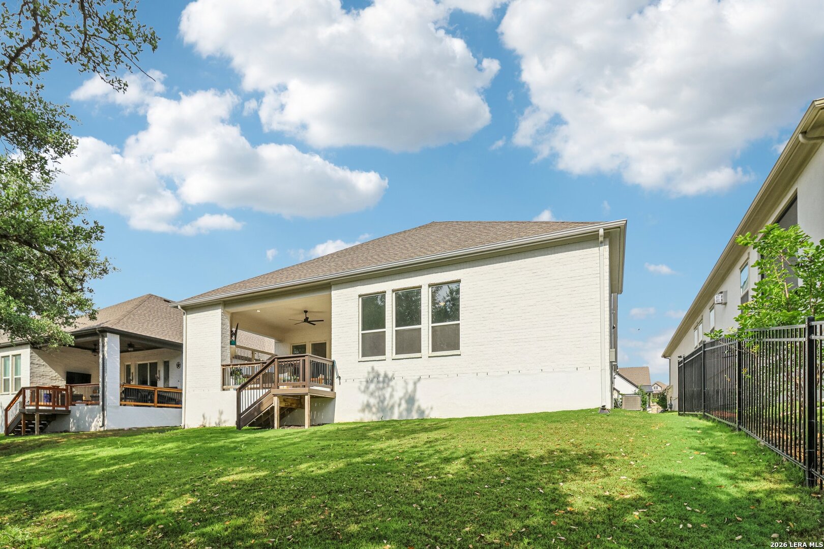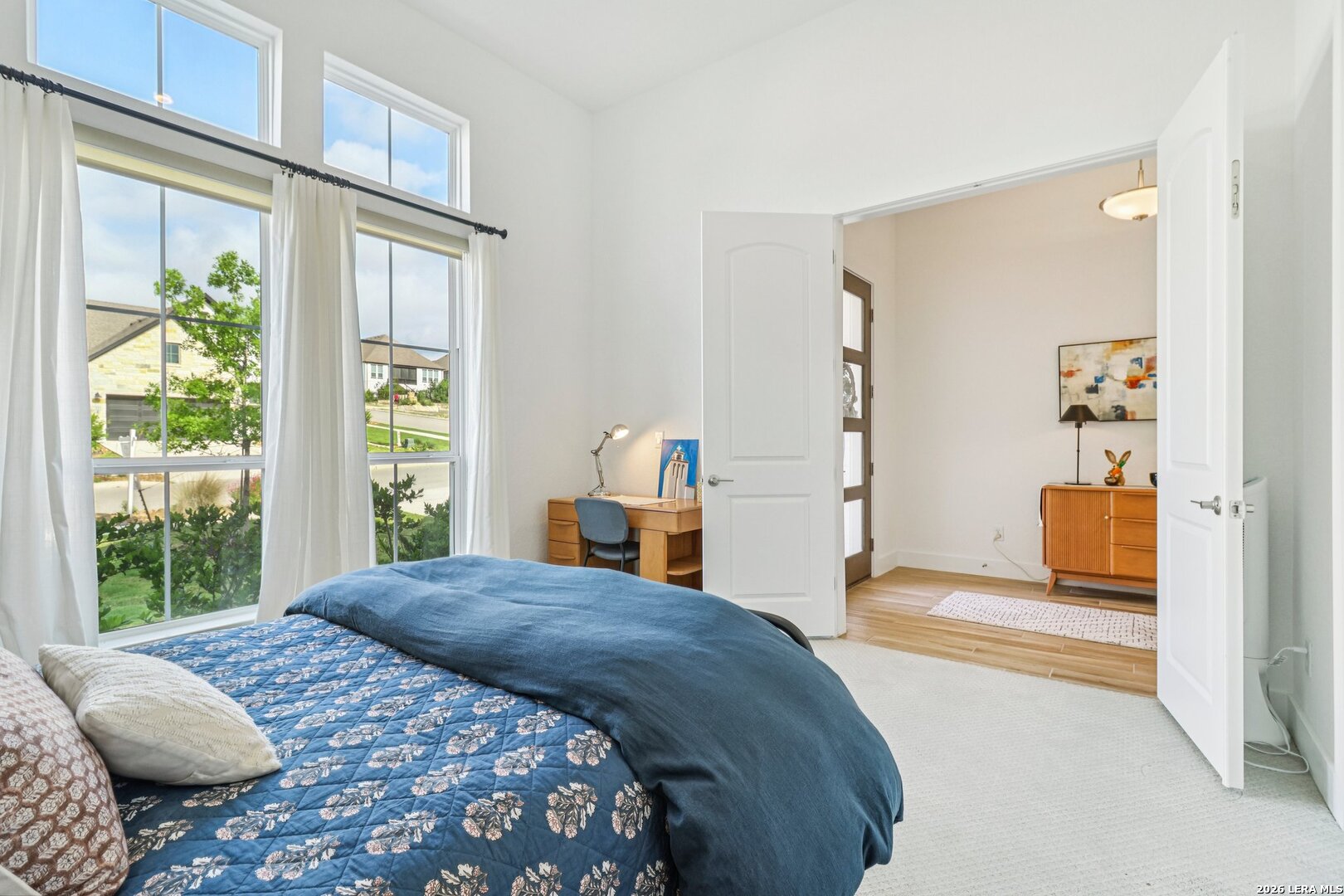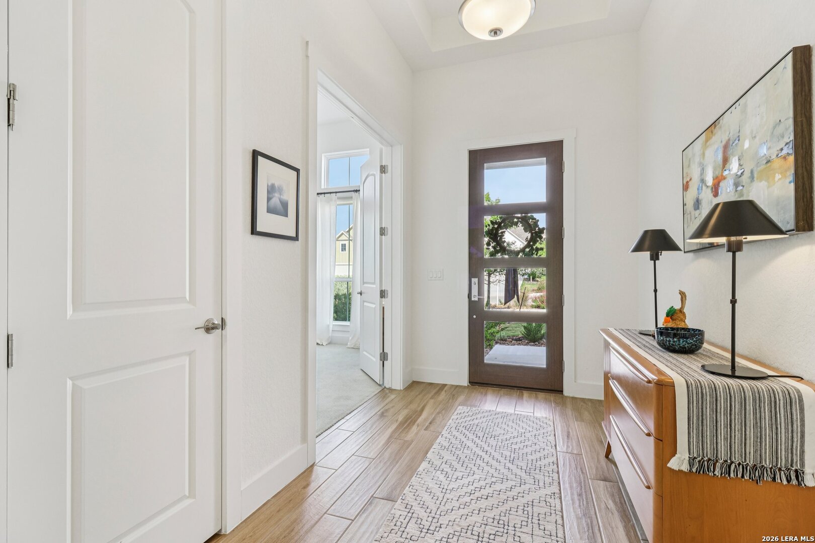 Greenbelt lot! Regency at Esperanza - Active Adult Community. Open and bright this beautiful home has an open floor plan with a spacious great room and casual dining area. Kitchen has large island/breakfast bar, upgraded cabinets, and gas cooking. Secluded primary bedroom featuring 11' tray ceilings, walk-in closet, elegant en-suite with double vanity, vessel tub and separate shower. Perfect for relaxation and entertaining, the oversized private covered patio features a fireplace and greenbelt view! Other features include 100% maintenance-free brick exterior, premier Colonial White granite, Mahogany entry door, Shaw carpet upgrade with Scotch-guard, tankless water heater, laundry room sink and water softener pre-plumb. Additionally, the property has a dedicated gas stub out for a fireplace in living, outside grill and is prewired for a pool and spa. Just a short walk to exclusive community amenities, including a resort-style pool, fitness center, bocce ball, pickle ball, and a dedicated Lifestyle Director. Nestled within the expansive Esperanza master planned communitya with dog park, lazy river, 20+ miles of trails, minutes from downtown Boerne with restaurants and shopping.