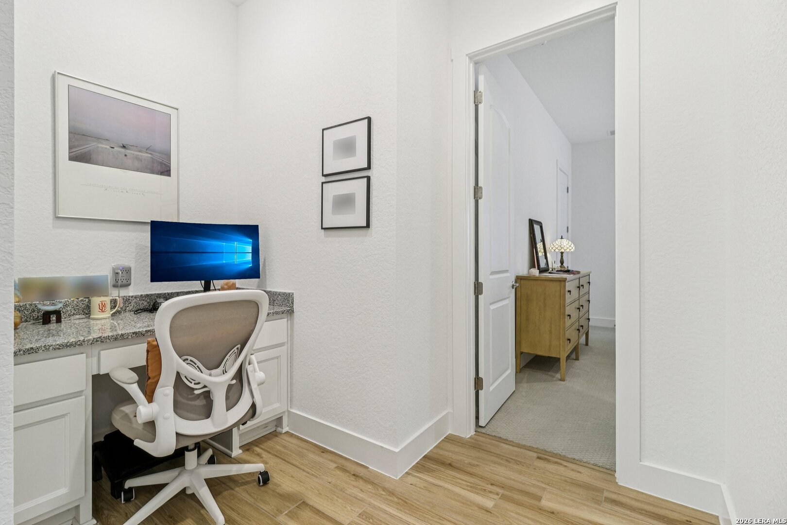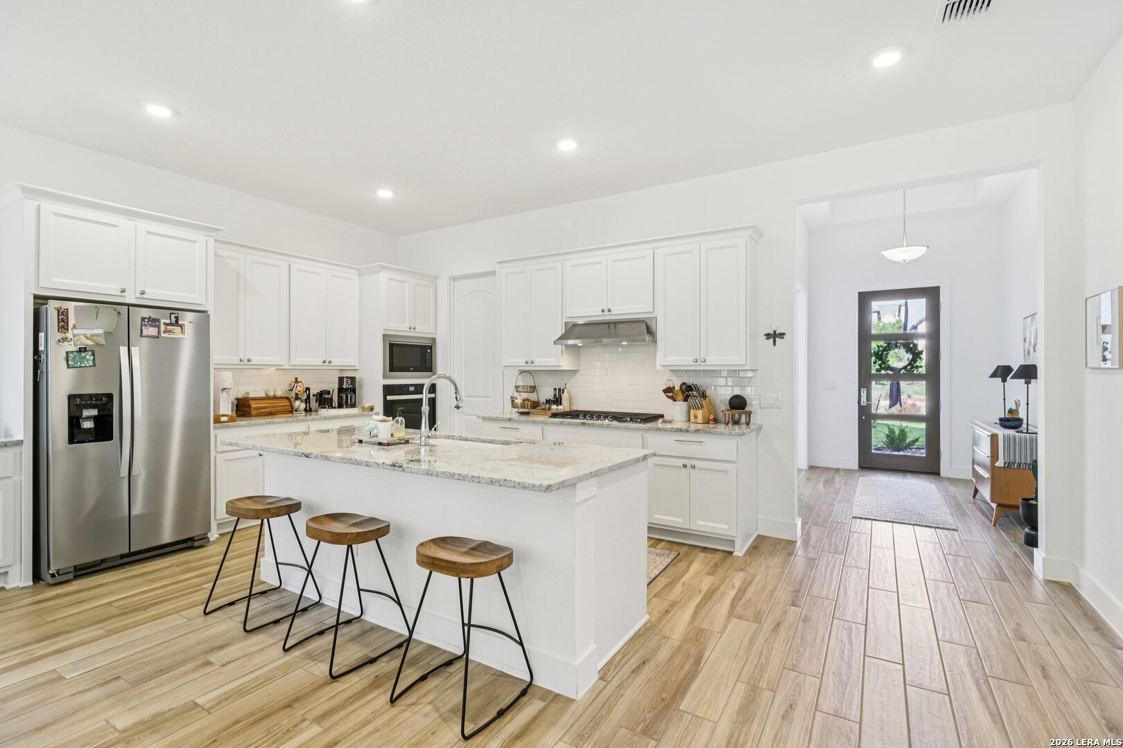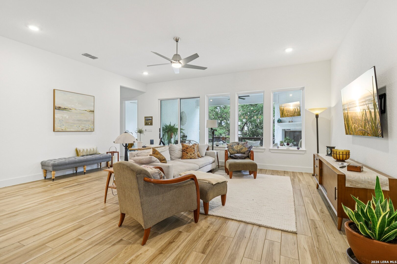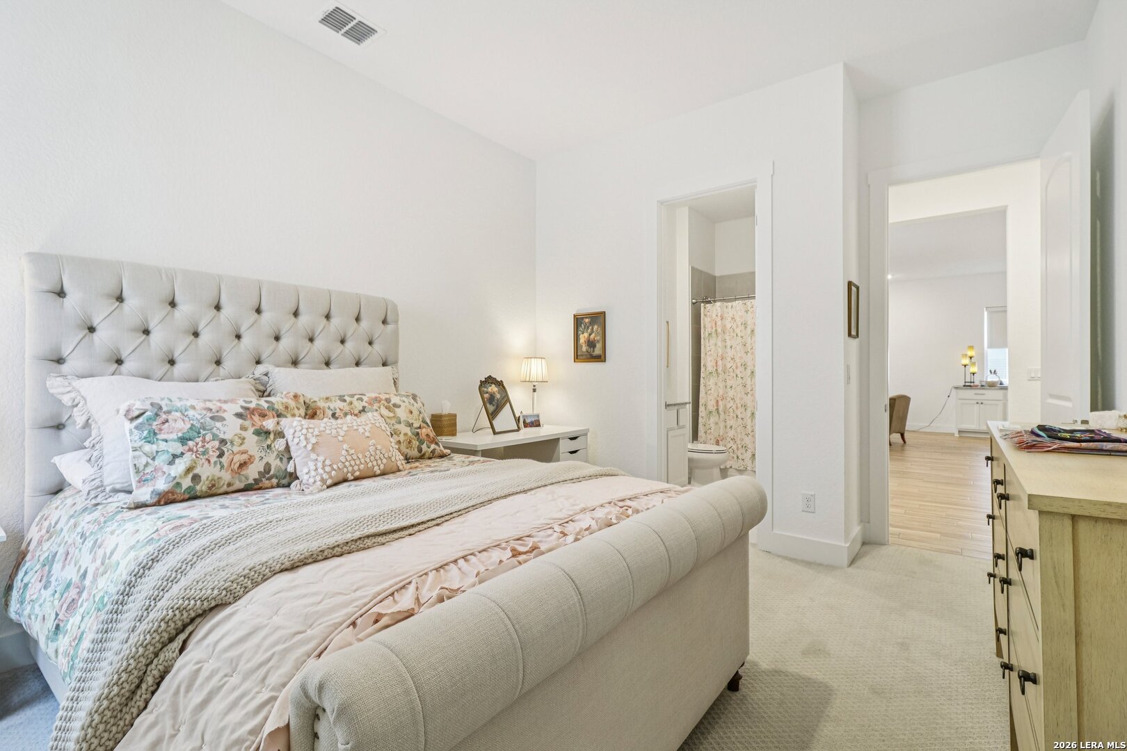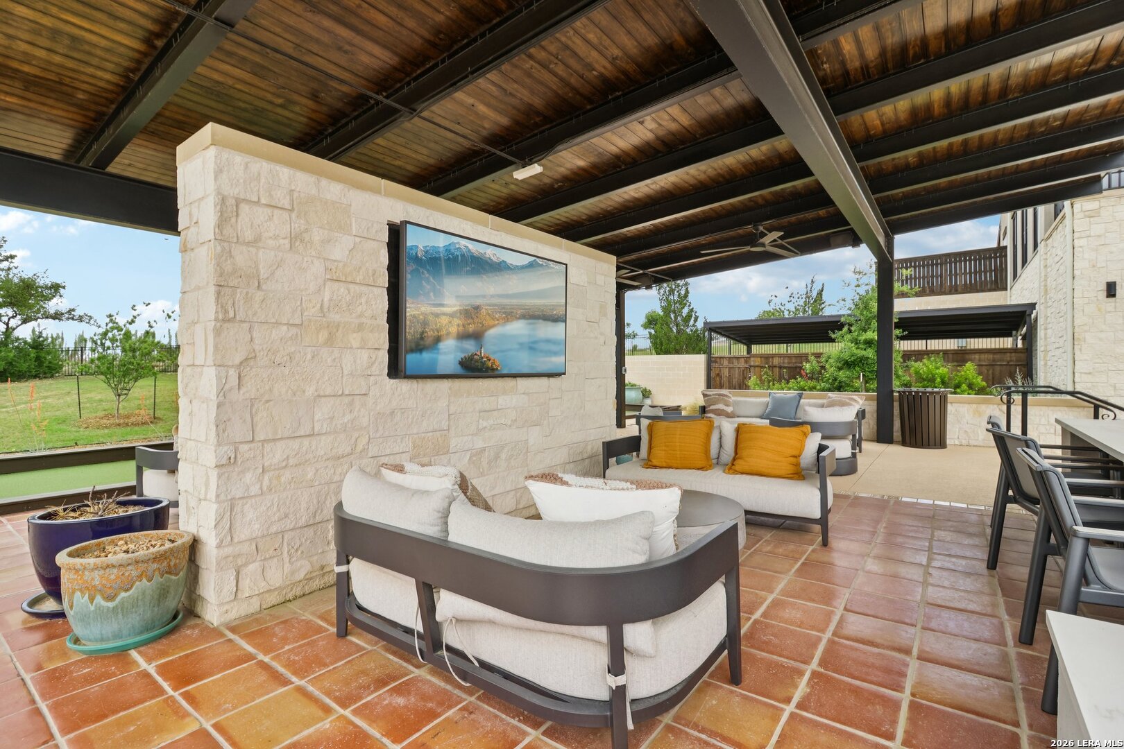 Greenbelt lot! Regency at Esperanza - Active Adult Community. Open and bright this beautiful home has an open floor plan with a spacious great room and casual dining area. Kitchen has large island/breakfast bar, upgraded cabinets, and gas cooking. Secluded primary bedroom featuring 11' tray ceilings, walk-in closet, elegant en-suite with double vanity, vessel tub and separate shower. Perfect for relaxation and entertaining, the oversized private covered patio features a fireplace and greenbelt view! Other features include 100% maintenance-free brick exterior, premier Colonial White granite, Mahogany entry door, Shaw carpet upgrade with Scotch-guard, tankless water heater, laundry room sink and water softener pre-plumb. Additionally, the property has a dedicated gas stub out for a fireplace in living, outside grill and is prewired for a pool and spa. Just a short walk to exclusive community amenities, including a resort-style pool, fitness center, bocce ball, pickle ball, and a dedicated Lifestyle Director. Nestled within the expansive Esperanza master planned communitya with dog park, lazy river, 20+ miles of trails, minutes from downtown Boerne with restaurants and shopping.