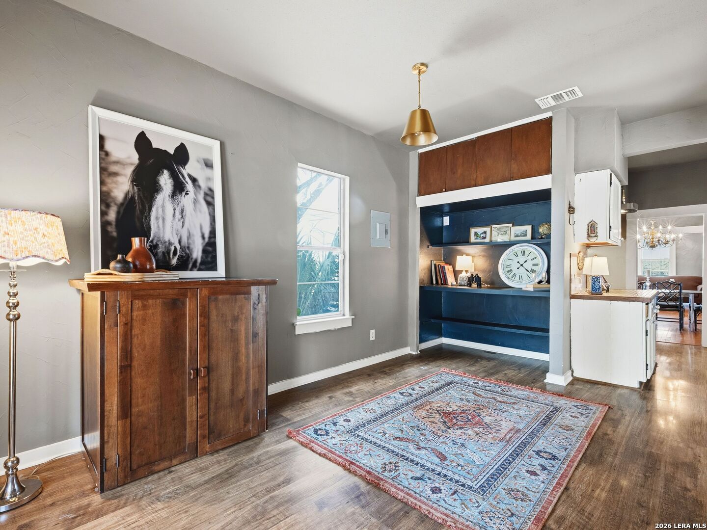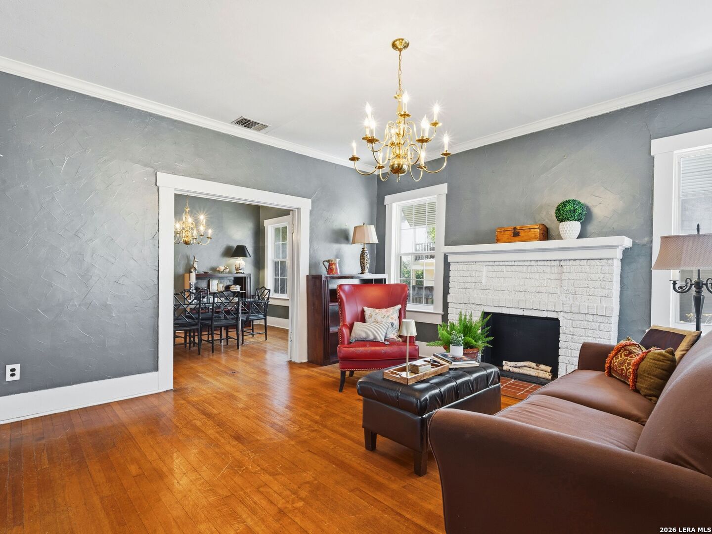 Charming cottage-style home that boasts relaxation with its expansive and inviting front porch. Once inside, you'll see hardwood floors, a central brick fireplace, and eye sights to the open floor plan. The kitchen features gas cooking and adjoins the dining room and a second room for either a 2nd dining space or a living space. An additional dwelling attached to the garage is a flex space for your imagination, workshop, crafting, etc. Central location to shopping, dining, schools, and more!
