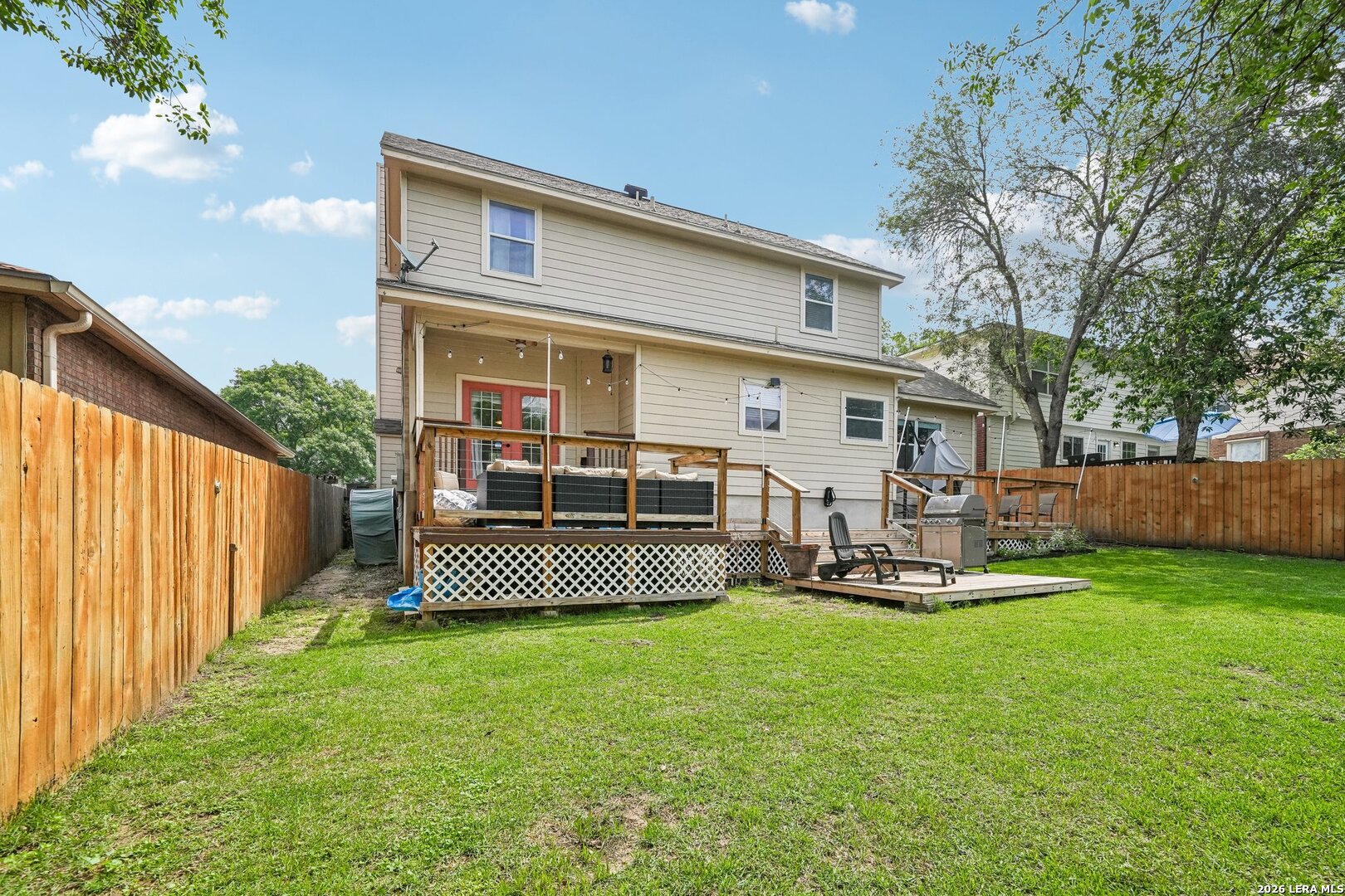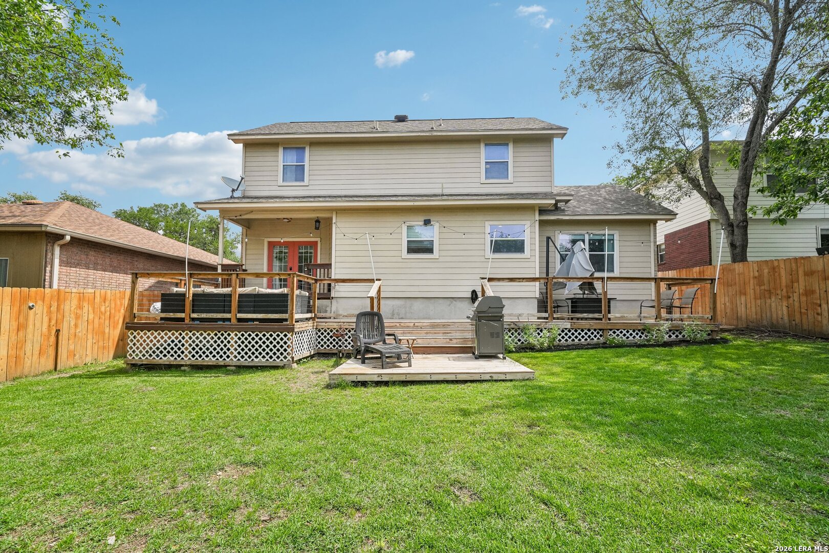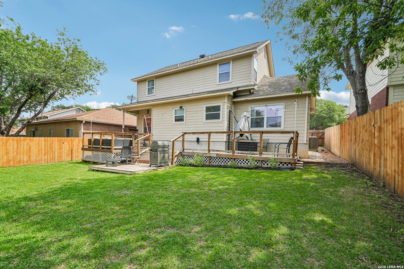 Welcome Home to this nicely updated, move-in ready home! It showcases thoughtful upgrades...a striking whitewashed wood fireplace facade that adds warmth and character. The kitchen is equipped with stainless steel appliances and a new dishwasher. A naturally bright dining room offers added convenience with custom storage cabinets. New ceiling fans, a designer board and batten hallway accent wall, and a garage with durable epoxy-sealed flooring. This home blends comfort, style, and functionality. New wood laminate flooring added throughout the living and dining areas. Brand new carpet on stairs, upstairs, hallway, and three bedrooms. Upstairs, a fully remodeled secondary bathroom designed with modern finishes. The attic has been fully insulated and floored, providing excellent additional storage space. A newer water heater adds peace of mind. A nicely landscaped backyard includes a shed, stained fence, and an extended deck-perfect for entertaining. Don't miss out. Schedule your showing today!