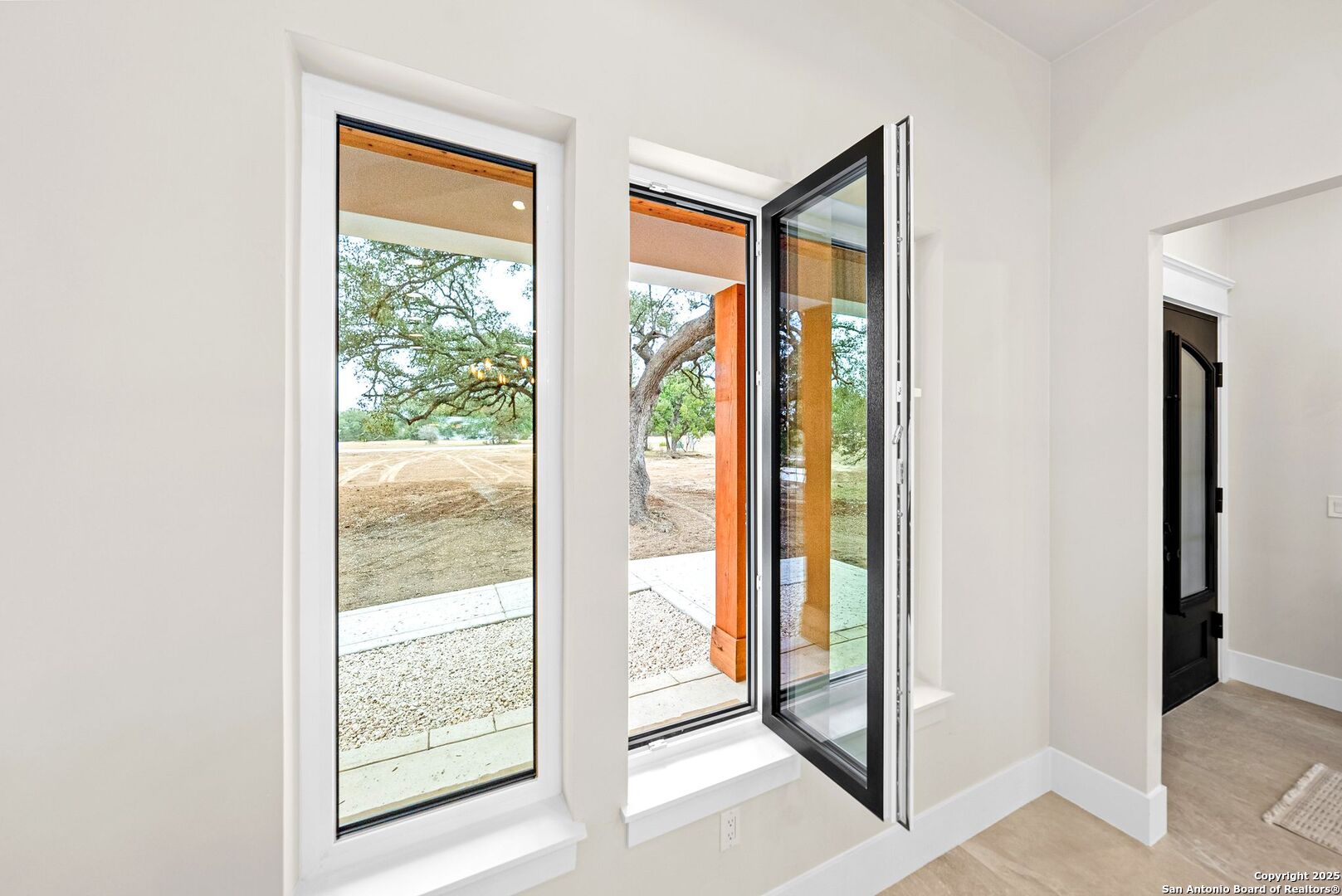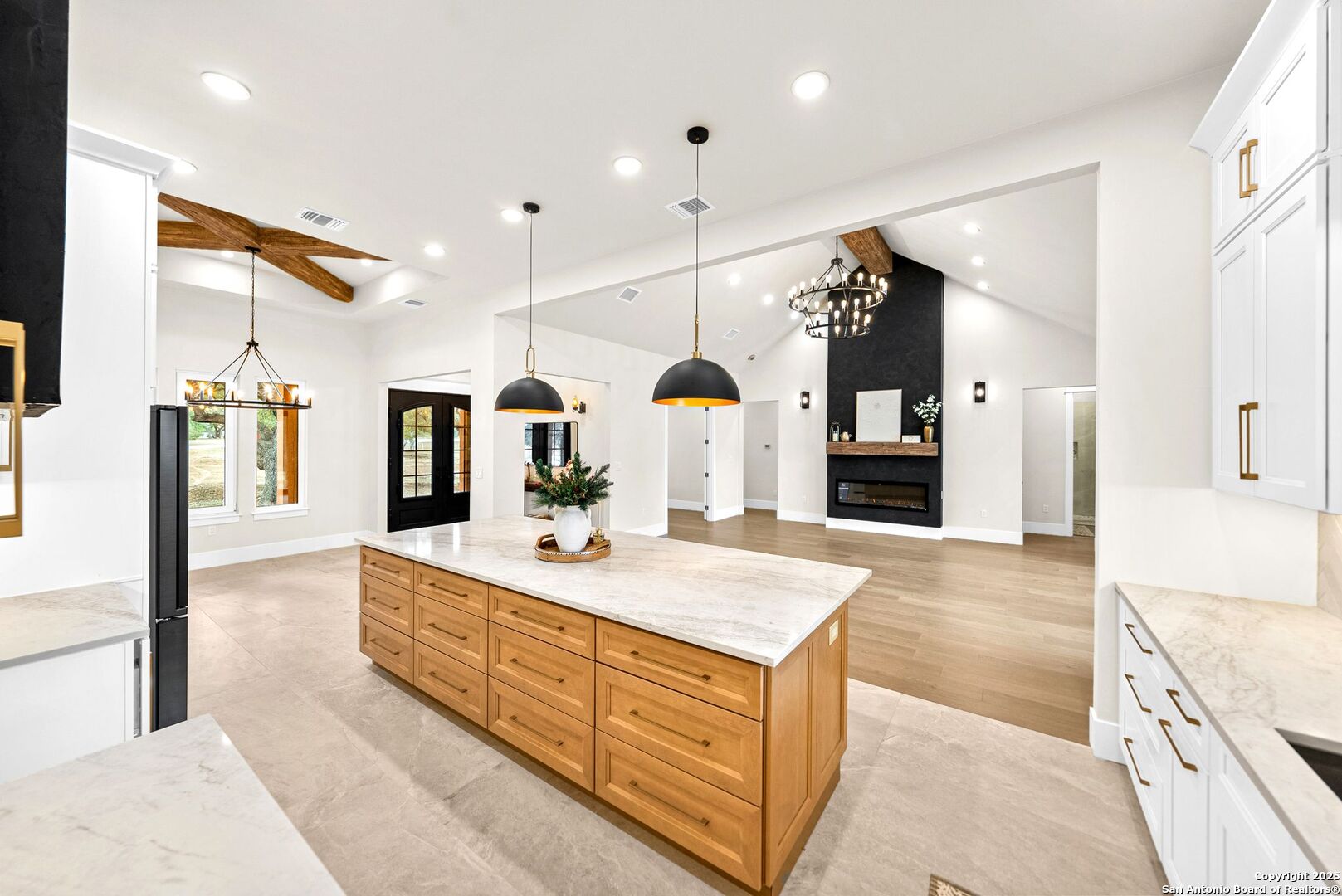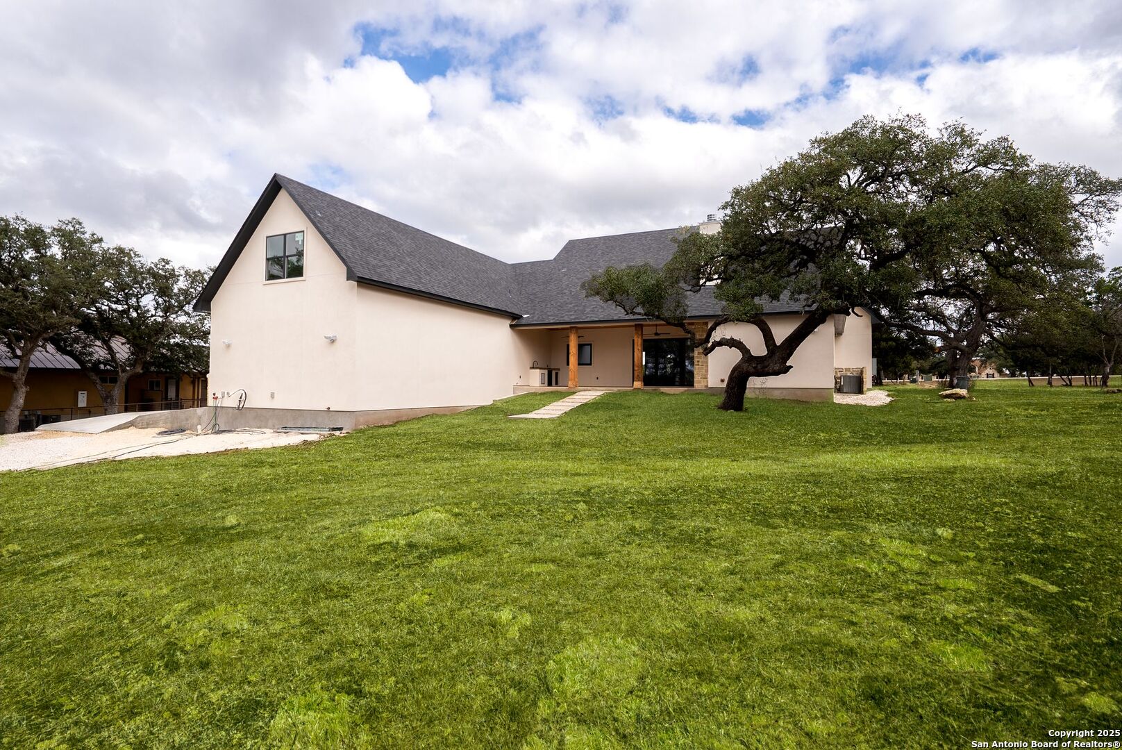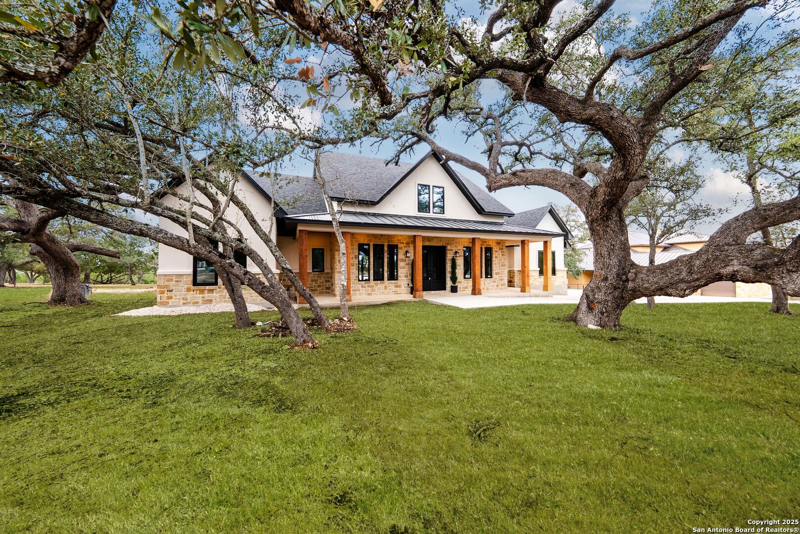 Exceptional new construction located in the Bridlegate community of Bandera, Texas, set on over 3 acres of Hill Country landscape. This thoughtfully designed home offers 4 bedrooms, 3.5 baths, a dedicated office, and an upstairs bonus room with restroom (700sqft) that can be finished out by the builder - request details. The interior showcases vaulted ceilings with faux beams, Venetian plaster accents at the hood and fireplace, and high-end fixtures throughout. The chef's kitchen features an oversized island, Taj Mahal quartzite countertops, gas cooking with pot filler, and all brand-new kitchen appliances included (backordered range/hood vent). Delta plumbing fixtures, foam insulation, and triple-pane European-style windows reflect the builder's commitment to quality and energy efficiency-no details were overlooked. Enjoy seamless indoor-outdoor living with a covered patio featuring an outdoor fireplace and kitchen, perfect for entertaining. The builder has also prepared the backyard for a future shop or ADU, offering flexibility for additional living space, storage, or a workspace. Additional highlights include decked attic storage, premium finishes throughout, and a design that blends luxury with function. This is a rare opportunity to own a truly well-built home in one of Bandera's most sought-after communities.