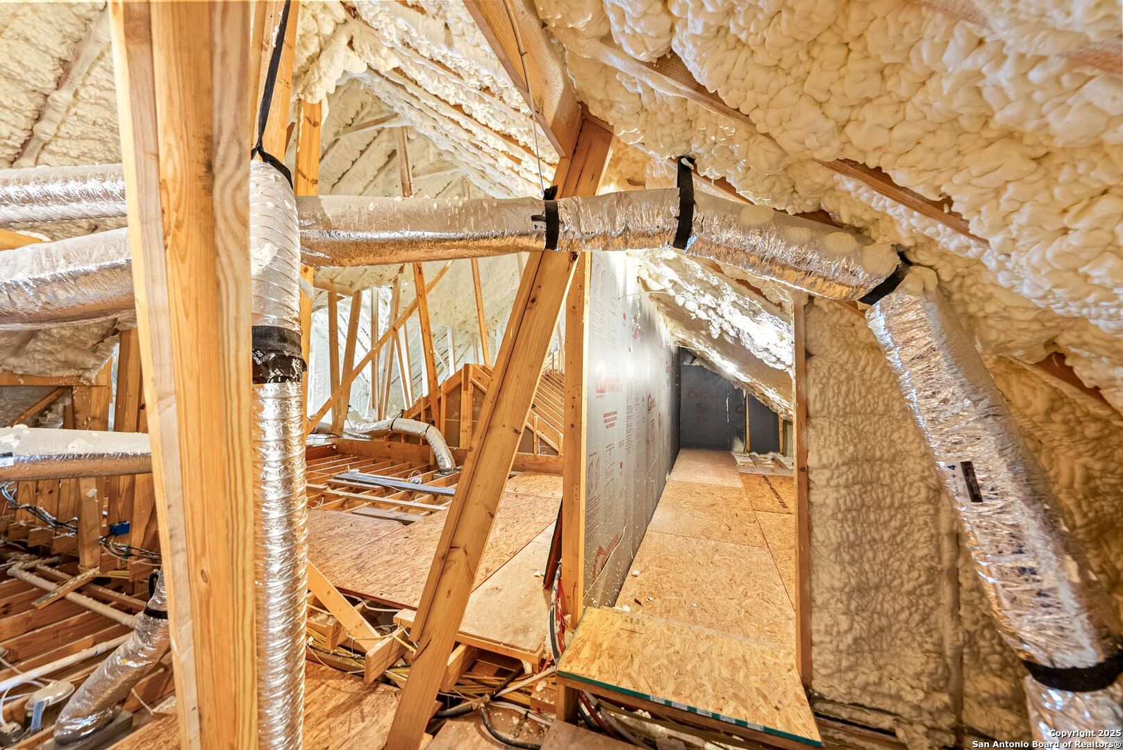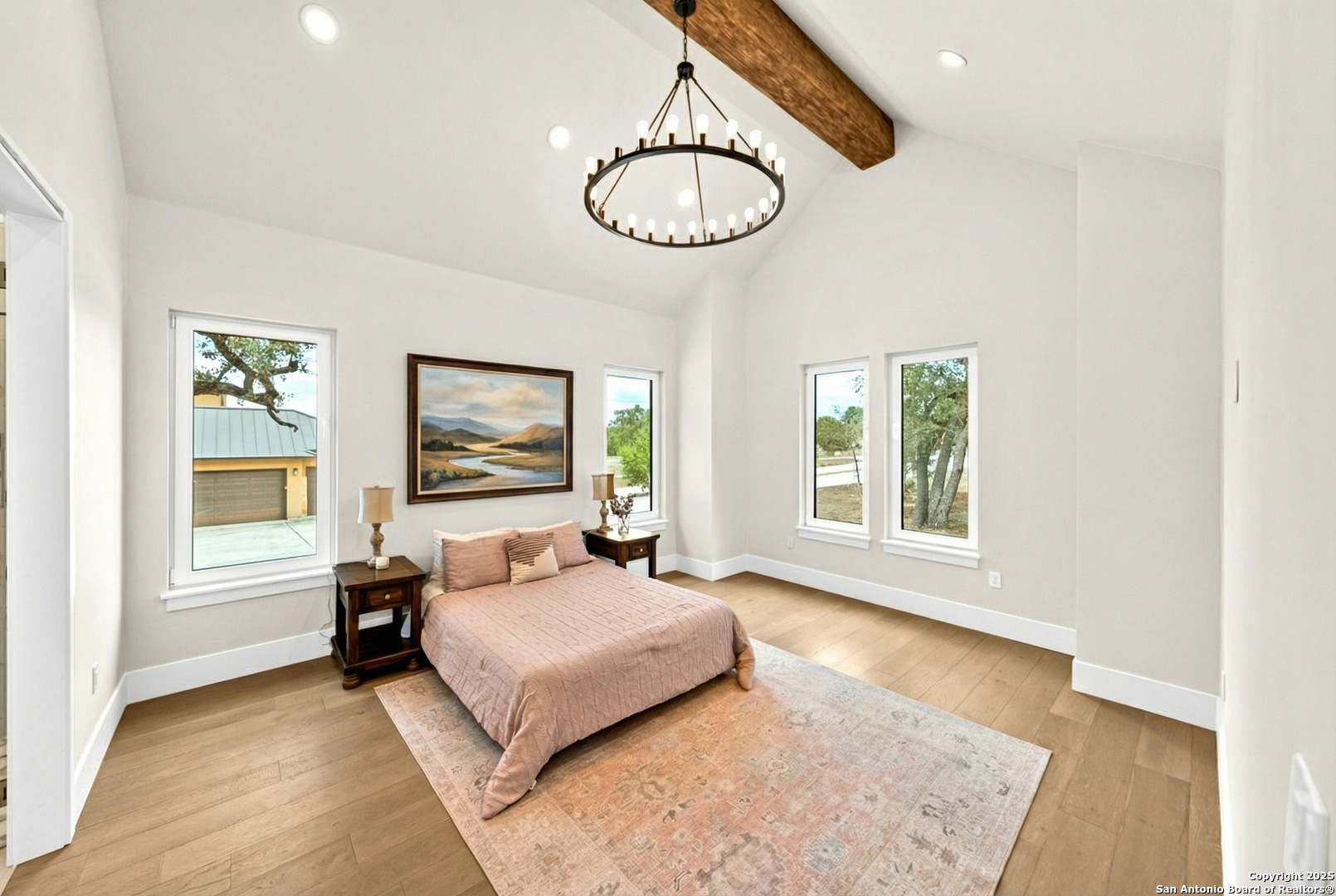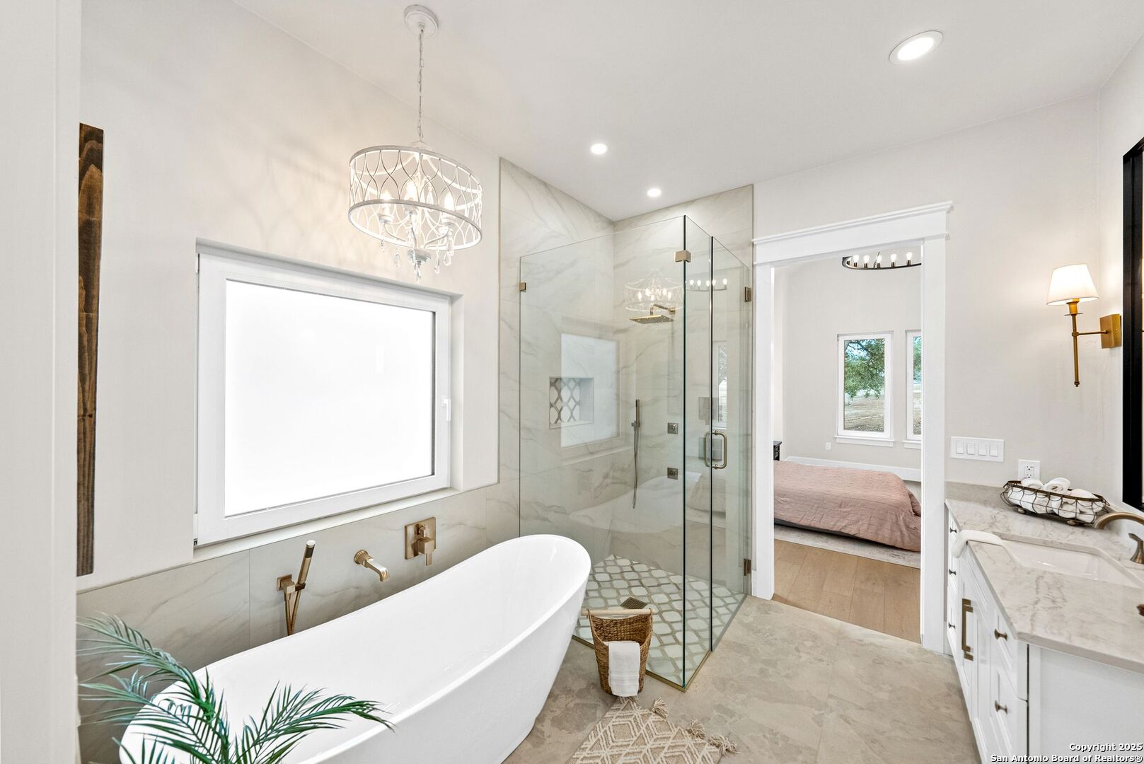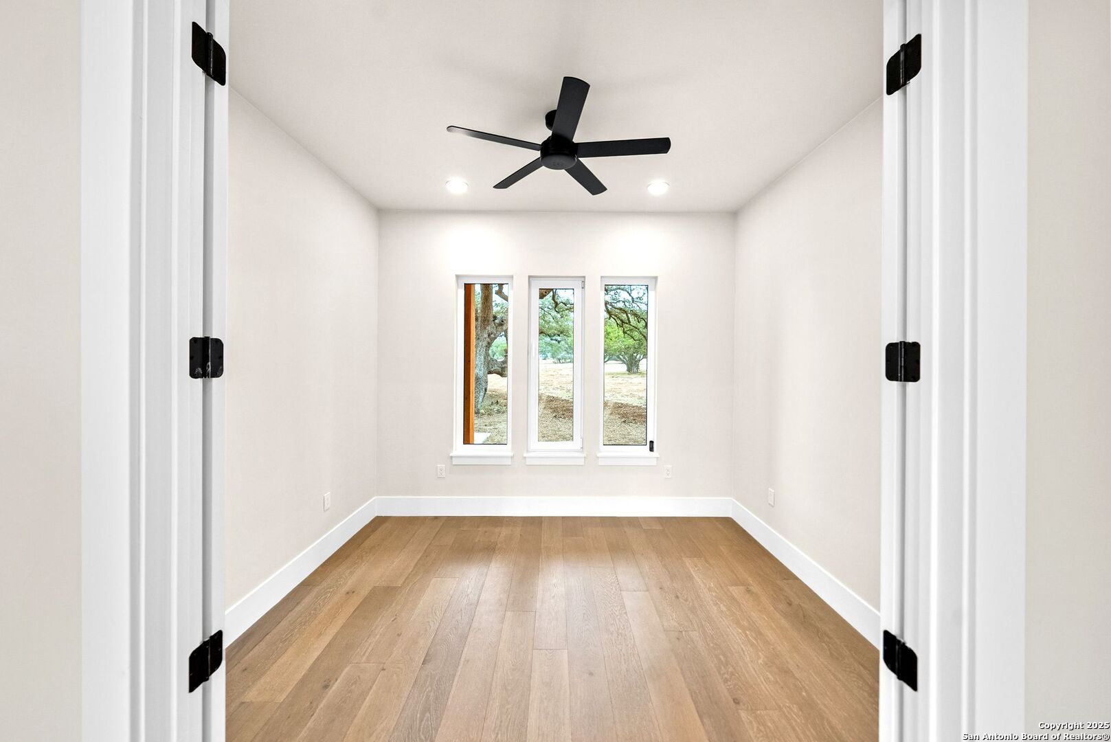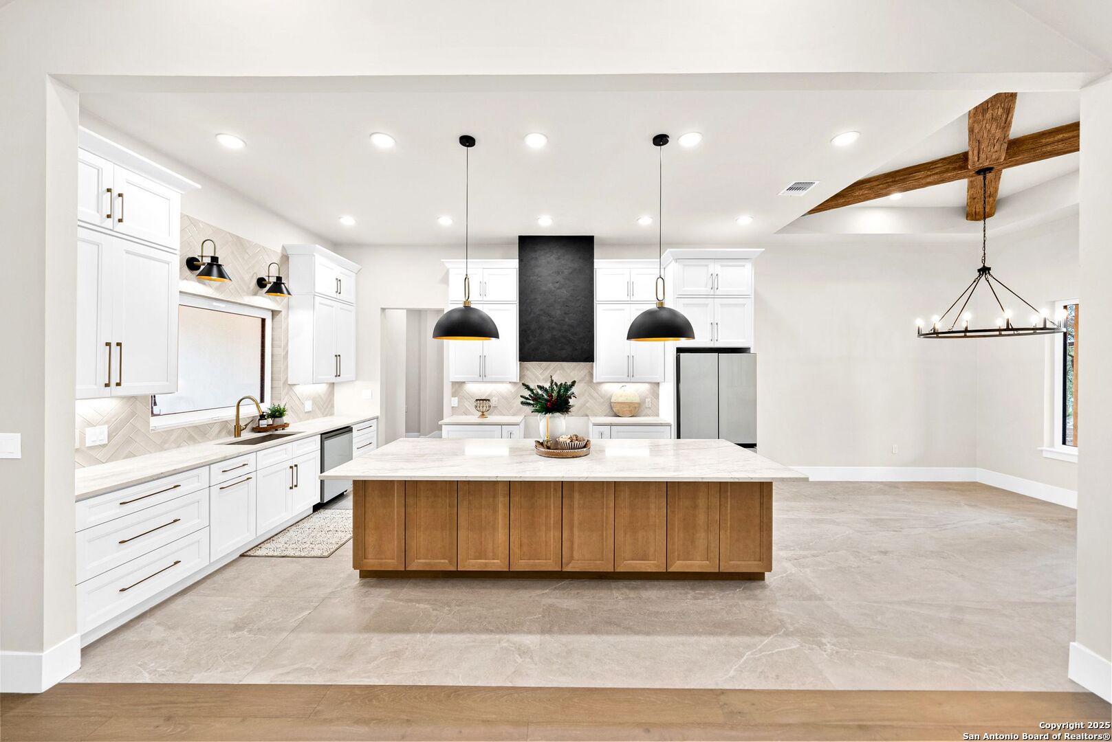 Exceptional new construction located in the Bridlegate community of Bandera, Texas, set on over 3 acres of Hill Country landscape. This thoughtfully designed home offers 4 bedrooms, 3.5 baths, a dedicated office, and an upstairs bonus room with restroom (700sqft) that can be finished out by the builder - request details. The interior showcases vaulted ceilings with faux beams, Venetian plaster accents at the hood and fireplace, and high-end fixtures throughout. The chef's kitchen features an oversized island, Taj Mahal quartzite countertops, gas cooking with pot filler, and all brand-new kitchen appliances included (backordered range/hood vent). Delta plumbing fixtures, foam insulation, and triple-pane European-style windows reflect the builder's commitment to quality and energy efficiency-no details were overlooked. Enjoy seamless indoor-outdoor living with a covered patio featuring an outdoor fireplace and kitchen, perfect for entertaining. The builder has also prepared the backyard for a future shop or ADU, offering flexibility for additional living space, storage, or a workspace. Additional highlights include decked attic storage, premium finishes throughout, and a design that blends luxury with function. This is a rare opportunity to own a truly well-built home in one of Bandera's most sought-after communities.