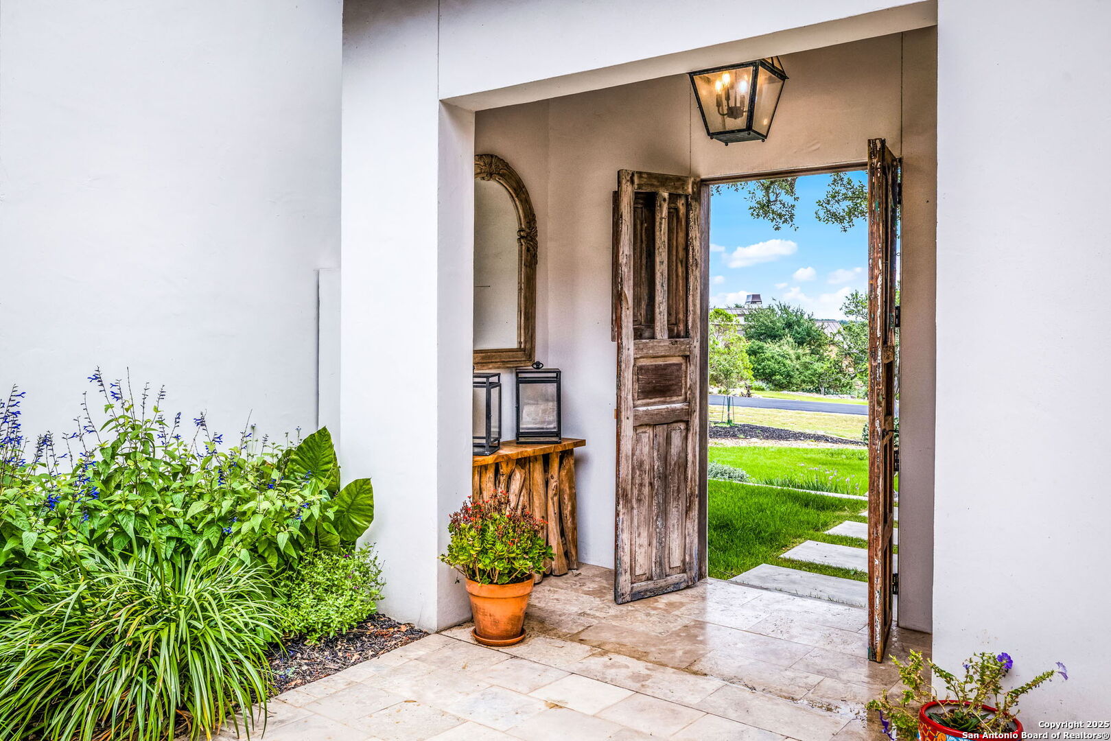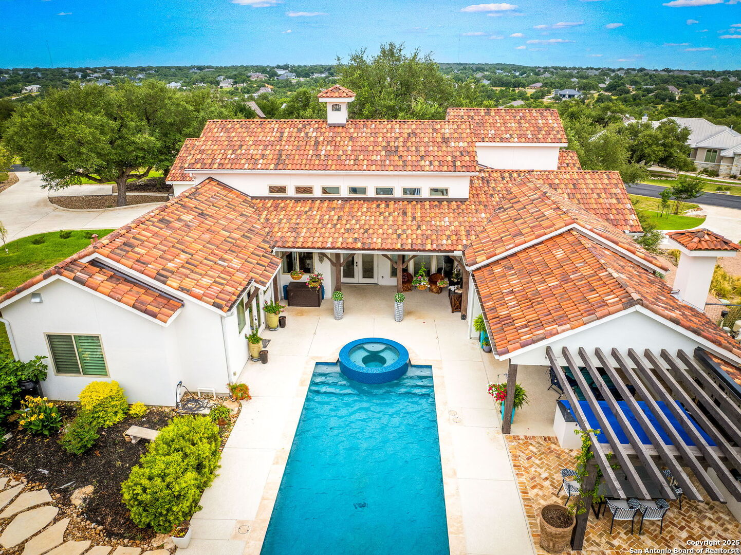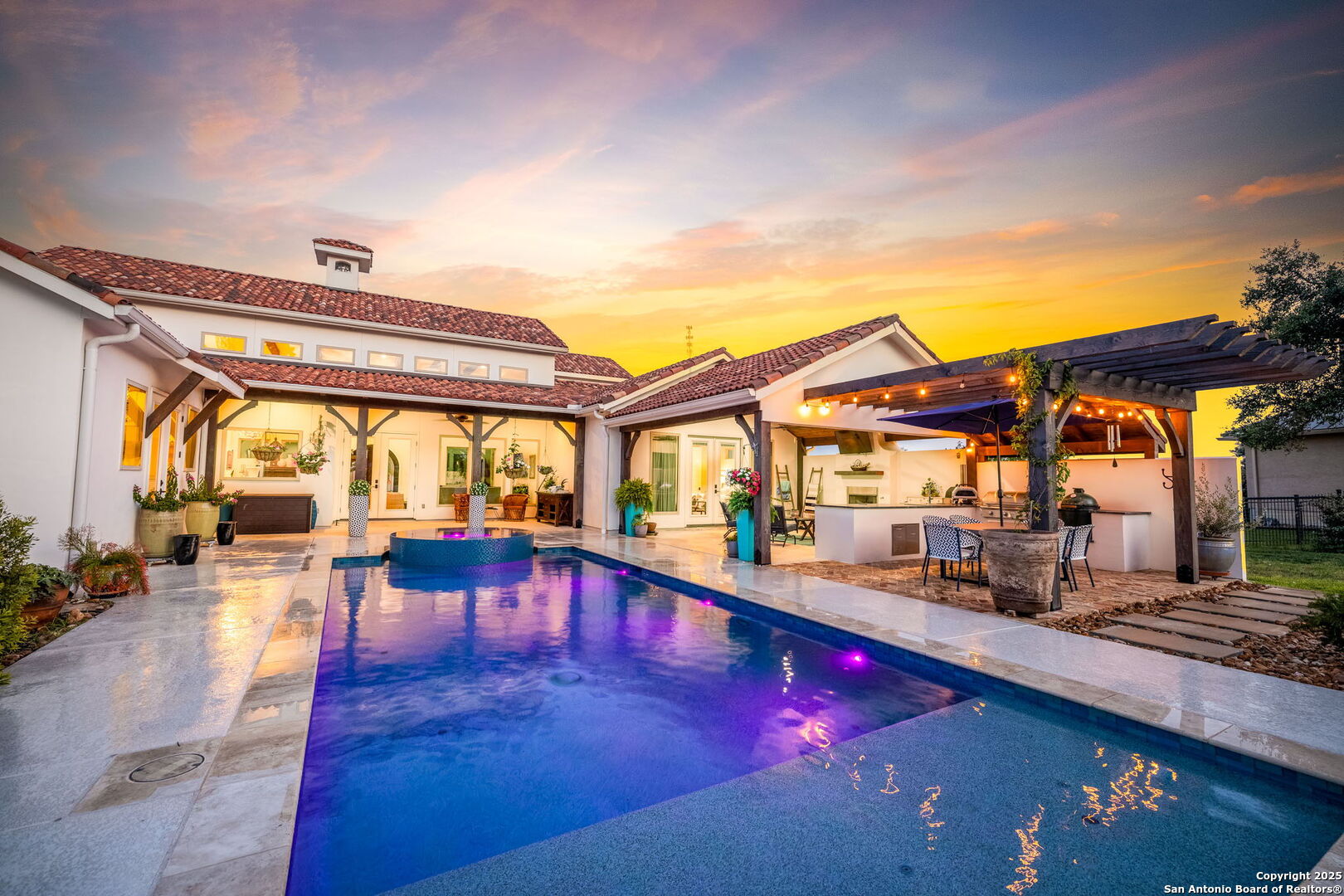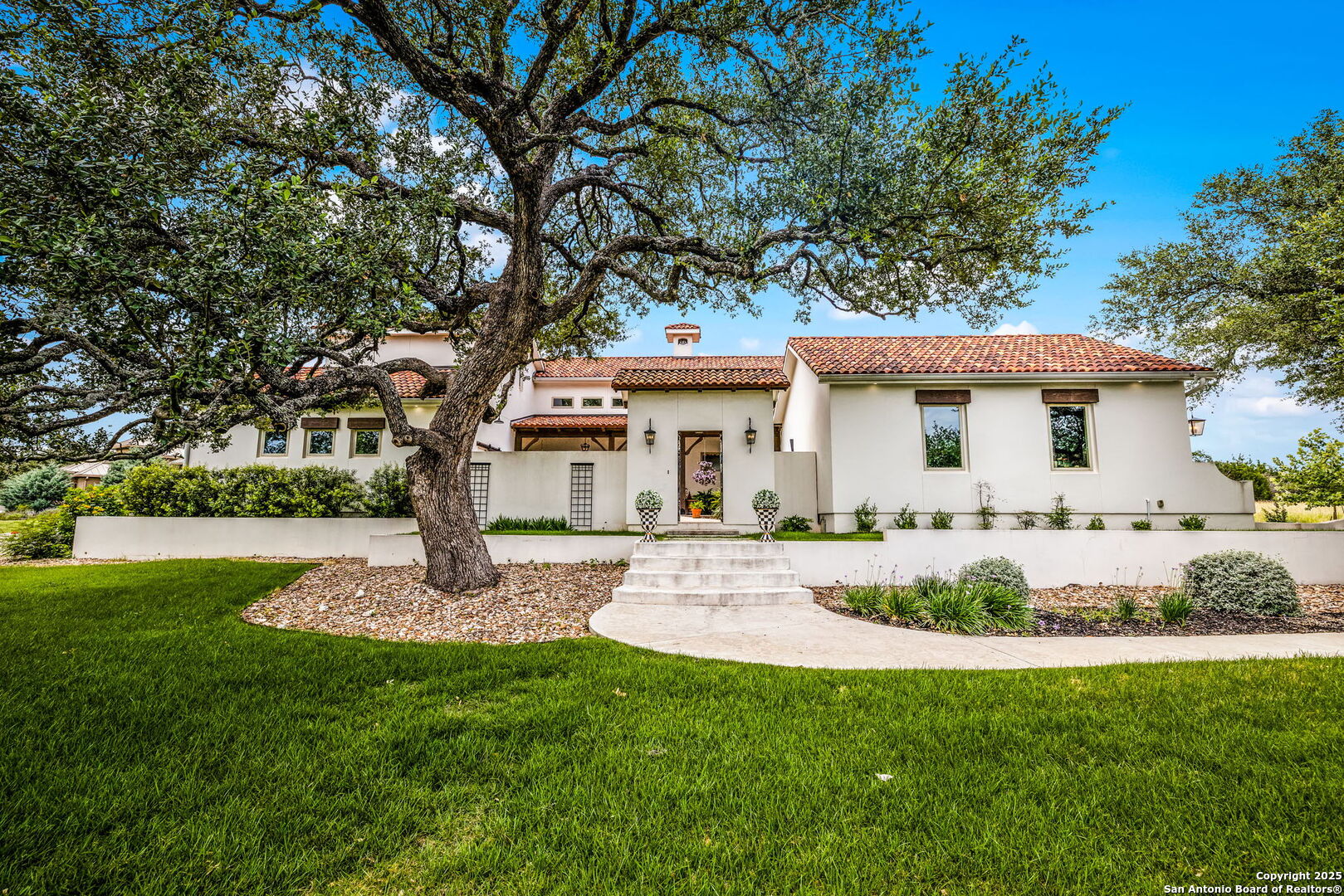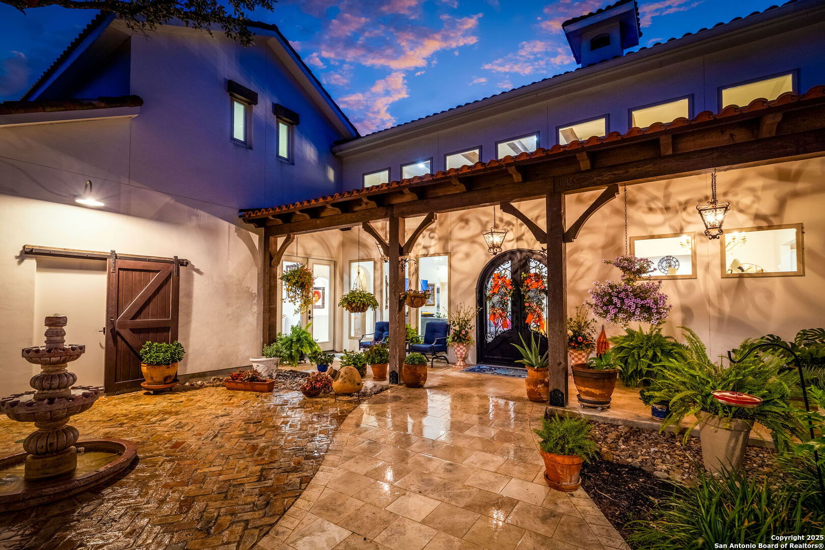 Welcome to an extraordinary Santa Barbara-style retreat in the exclusive gated Bordeaux section of Vintage Oaks, where luxury, privacy, and timeless design converge. Situated on over an acre of manicured grounds, this custom-built masterpiece offers 4 bedrooms, 3 bathrooms, a dedicated office, and a resort-inspired outdoor living space that blends seamlessly with the Hill Country landscape. From the moment you arrive, the home's graceful architecture, creamy smooth stucco, and rich wood accents create an ambiance of refined elegance. A private, arched entry gate invites you into a serene courtyard-a perfect first impression-where lush greenery and the gentle sound of a fountain welcome you home. Inside, the open-concept layout is defined by soaring ceilings adorned with exposed wood beams, hand-troweled walls, and an abundance of natural light streaming through expansive windows. The living room serves as the heart of the home, anchored by a stunning fireplace that exudes warmth and character. Just beyond, the chef's kitchen is a culinary dream, boasting high-end appliances, a gas range, double ovens, custom cabinetry, a sprawling center island with seating, and a walk-in pantry designed for both functionality and style. The adjacent dining area ensures every meal is served with a side of beauty. The primary suite is a sanctuary of comfort and sophistication. Featuring its own fireplace, it's a retreat you'll never want to leave. The spa-inspired en suite bath includes a clawfoot soaking tub, walk-in shower, dual vanities, and an expansive walk-in closet. Three additional bedrooms are generously sized, each offering comfort, style, and thoughtful design touches. A dedicated office, overlooking the courtyard, makes working from home both productive and inspiring. Step outside, and you'll discover the crown jewel of this property: an outdoor living space designed for year-round enjoyment. A sparkling pool with a spa invites refreshing dips on warm Texas days, while the surrounding patios and pergola provide shaded spots to relax. An outdoor kitchen with a built-in grill and prep space makes entertaining effortless, and the outdoor fireplace sets the scene for cozy evenings under the stars. Whether hosting a large gathering or enjoying a quiet night with family, this backyard delivers an unparalleled experience. Additional features include a three-car garage with ample storage, three total fireplaces (in the living room, primary suite, and outdoors), and thoughtful landscaping that enhances privacy and beauty from every angle. As part of the Vintage Oaks community, you'll have access to world-class amenities including multiple pools, walking trails, a fitness center, and more-all while enjoying the security of the gated Bordeaux section. This is more than just a home-it's a lifestyle. Every detail, from the arched doorways to the beamed ceilings, has been carefully curated to embody the charm of Santa Barbara design while offering the modern conveniences today's luxury buyers demand. Perfectly positioned in the heart of the Texas Hill Country, you'll enjoy the tranquility of your private retreat while being just minutes from the vibrant culture, dining, and shopping of New Braunfels. With its sophisticated architecture, resort-style amenities, and a location that offers both prestige and convenience, this home is a rare find for the discerning buyer seeking elegance, comfort, and the ultimate in indoor-outdoor living.
