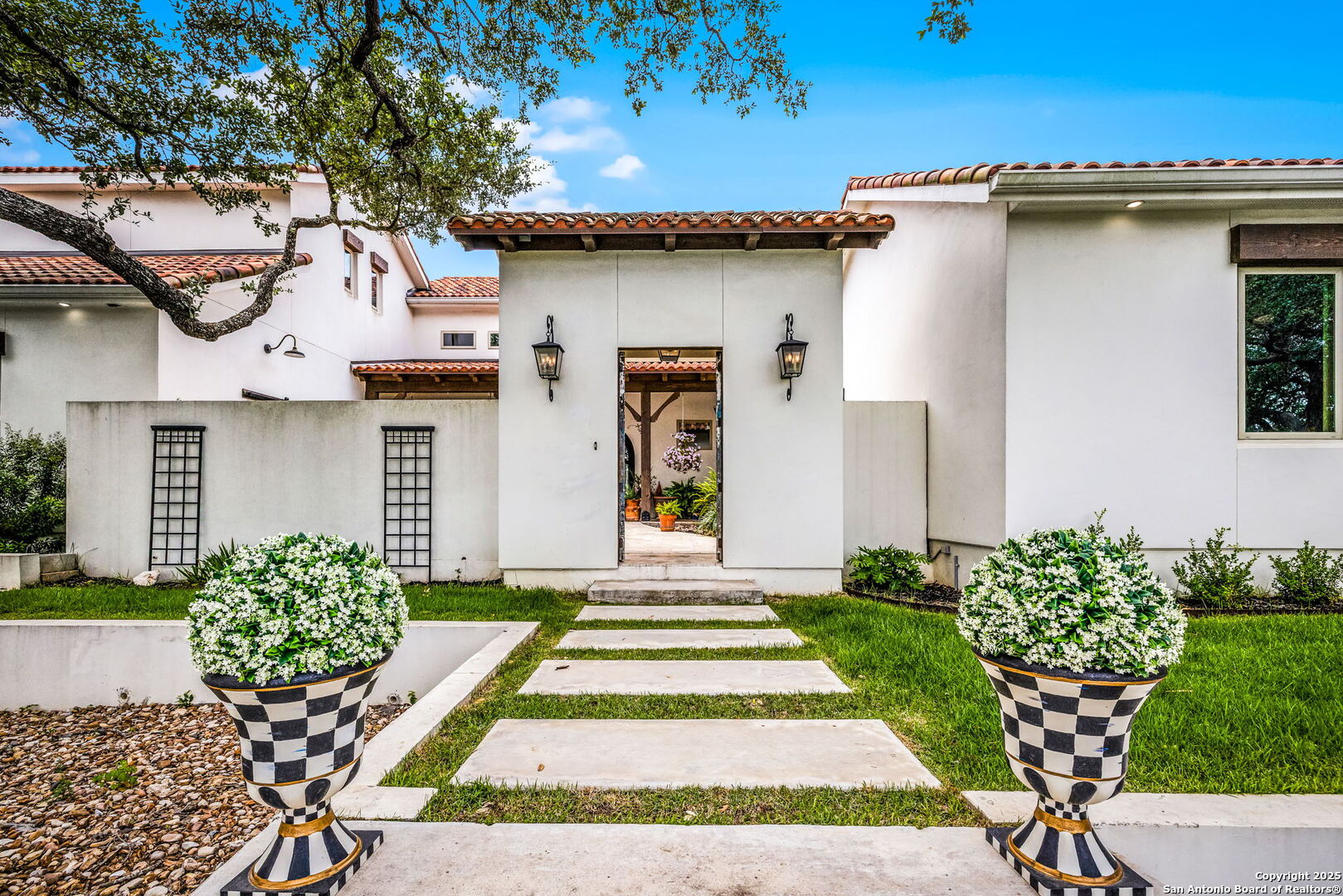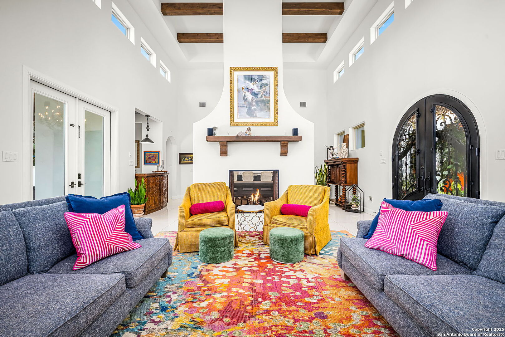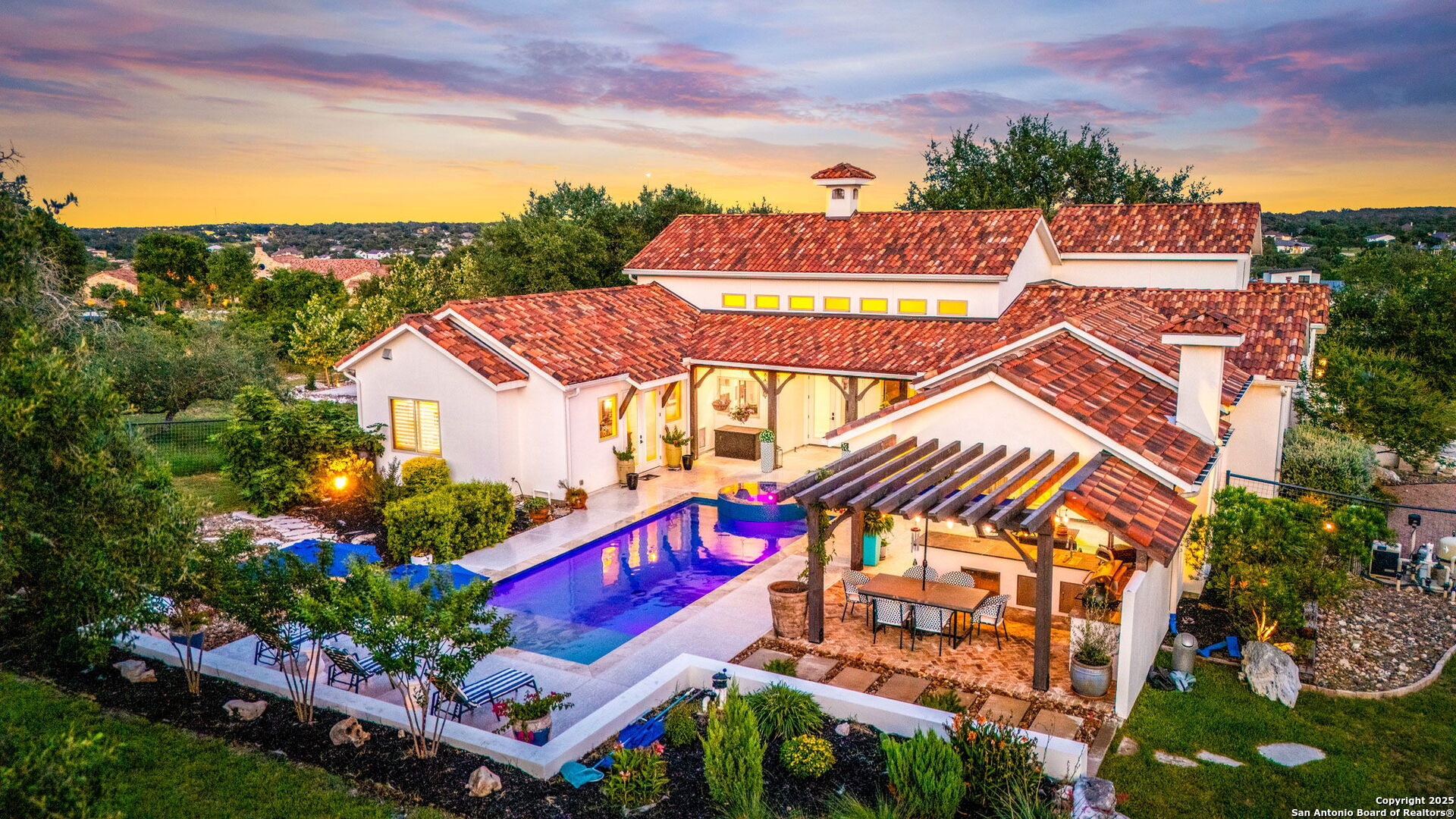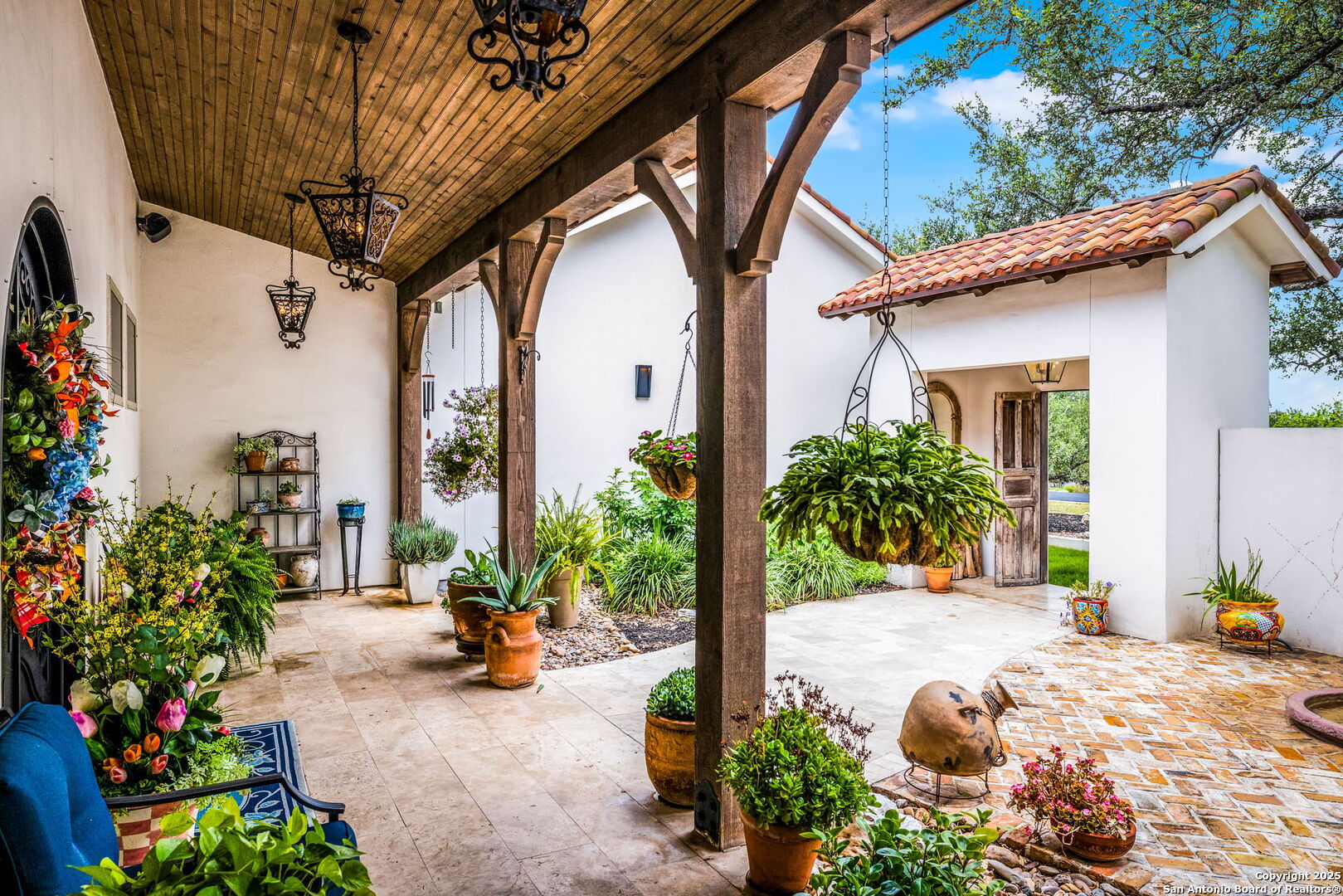 Welcome to an extraordinary Santa Barbara-style retreat in the exclusive gated Bordeaux section of Vintage Oaks, where luxury, privacy, and timeless design converge. Situated on over an acre of manicured grounds, this custom-built masterpiece offers 4 bedrooms, 3 bathrooms, a dedicated office, and a resort-inspired outdoor living space that blends seamlessly with the Hill Country landscape. From the moment you arrive, the home's graceful architecture, creamy smooth stucco, and rich wood accents create an ambiance of refined elegance. A private, arched entry gate invites you into a serene courtyard-a perfect first impression-where lush greenery and the gentle sound of a fountain welcome you home. Inside, the open-concept layout is defined by soaring ceilings adorned with exposed wood beams, hand-troweled walls, and an abundance of natural light streaming through expansive windows. The living room serves as the heart of the home, anchored by a stunning fireplace that exudes warmth and character. Just beyond, the chef's kitchen is a culinary dream, boasting high-end appliances, a gas range, double ovens, custom cabinetry, a sprawling center island with seating, and a walk-in pantry designed for both functionality and style. The adjacent dining area ensures every meal is served with a side of beauty. The primary suite is a sanctuary of comfort and sophistication. Featuring its own fireplace, it's a retreat you'll never want to leave. The spa-inspired en suite bath includes a clawfoot soaking tub, walk-in shower, dual vanities, and an expansive walk-in closet. Three additional bedrooms are generously sized, each offering comfort, style, and thoughtful design touches. A dedicated office, overlooking the courtyard, makes working from home both productive and inspiring. Step outside, and you'll discover the crown jewel of this property: an outdoor living space designed for year-round enjoyment. A sparkling pool with a spa invites refreshing dips on warm Texas days, while the surrounding patios and pergola provide shaded spots to relax. An outdoor kitchen with a built-in grill and prep space makes entertaining effortless, and the outdoor fireplace sets the scene for cozy evenings under the stars. Whether hosting a large gathering or enjoying a quiet night with family, this backyard delivers an unparalleled experience. Additional features include a three-car garage with ample storage, three total fireplaces (in the living room, primary suite, and outdoors), and thoughtful landscaping that enhances privacy and beauty from every angle. As part of the Vintage Oaks community, you'll have access to world-class amenities including multiple pools, walking trails, a fitness center, and more-all while enjoying the security of the gated Bordeaux section. This is more than just a home-it's a lifestyle. Every detail, from the arched doorways to the beamed ceilings, has been carefully curated to embody the charm of Santa Barbara design while offering the modern conveniences today's luxury buyers demand. Perfectly positioned in the heart of the Texas Hill Country, you'll enjoy the tranquility of your private retreat while being just minutes from the vibrant culture, dining, and shopping of New Braunfels. With its sophisticated architecture, resort-style amenities, and a location that offers both prestige and convenience, this home is a rare find for the discerning buyer seeking elegance, comfort, and the ultimate in indoor-outdoor living.