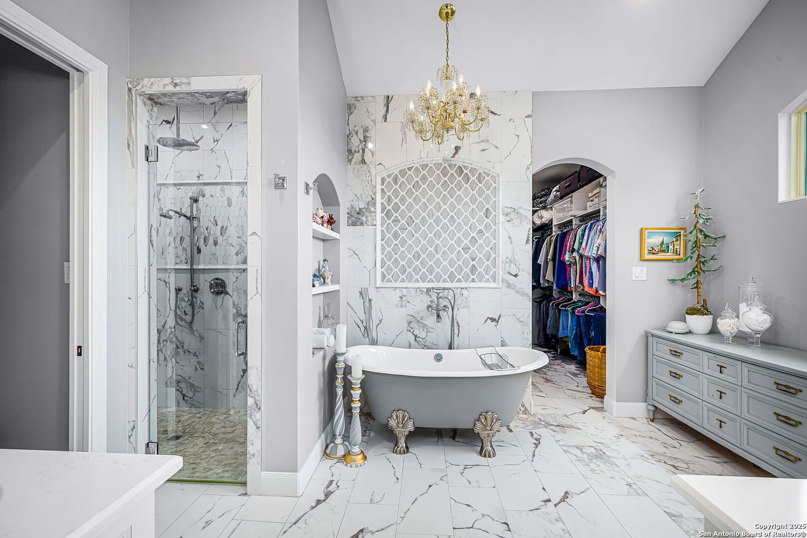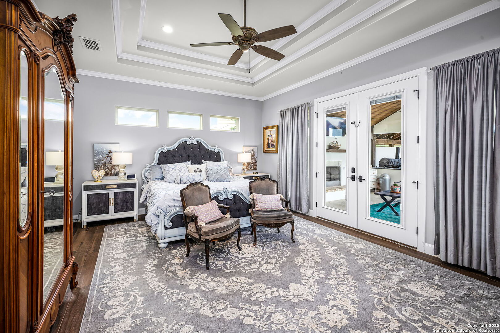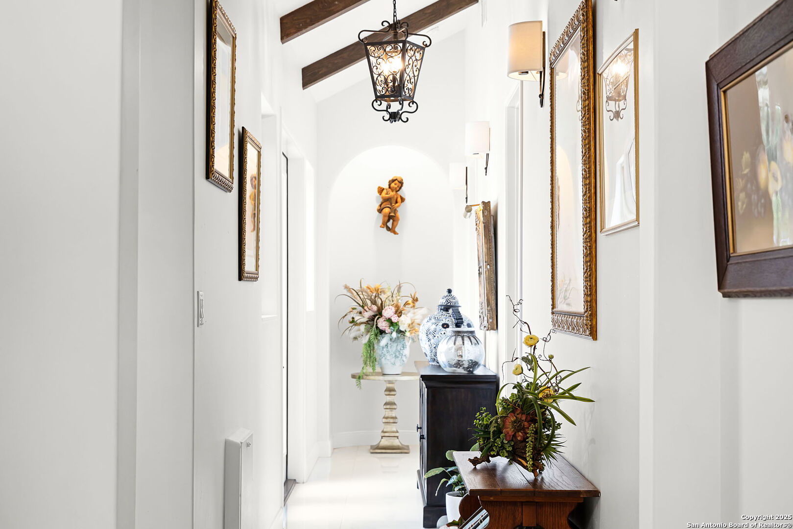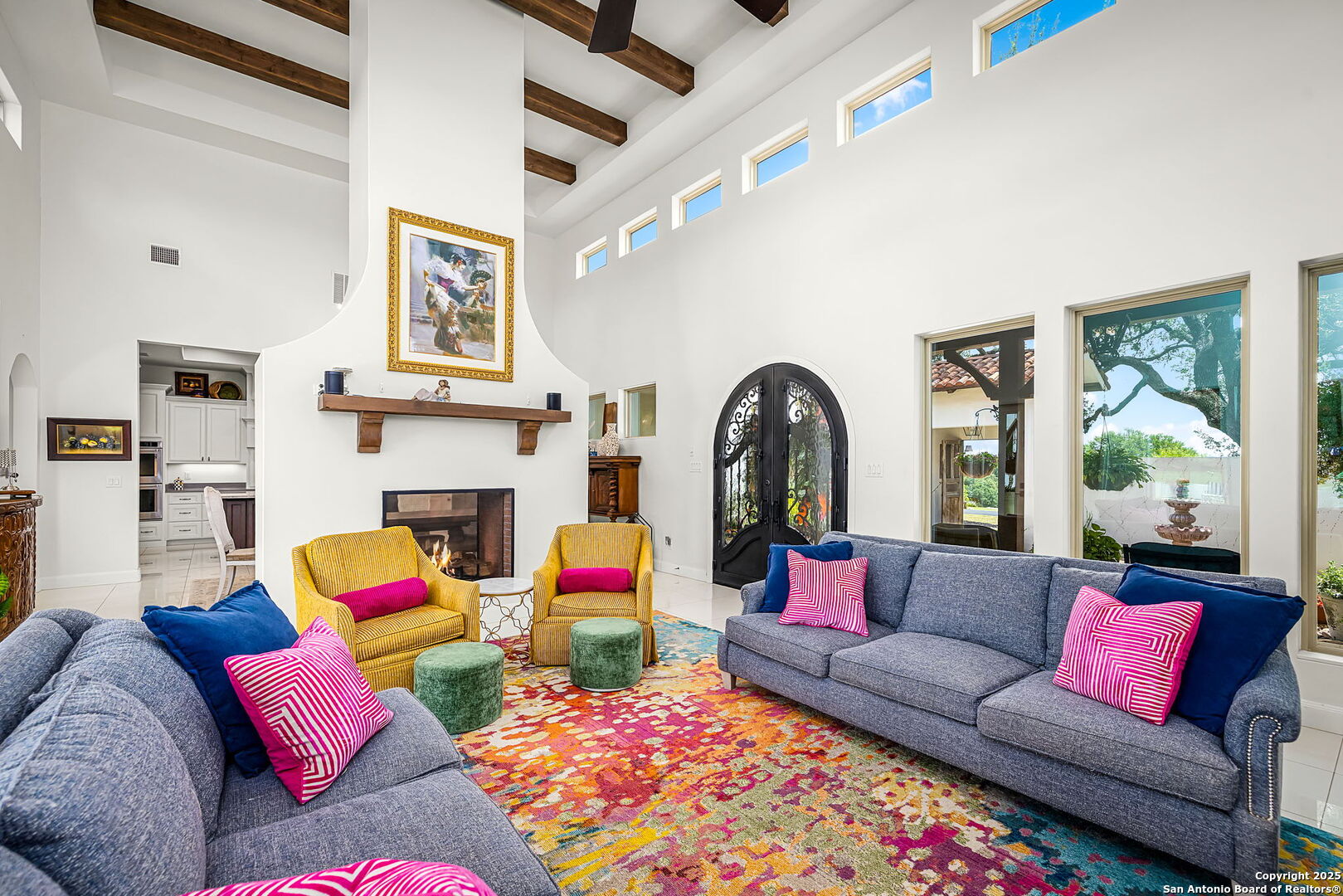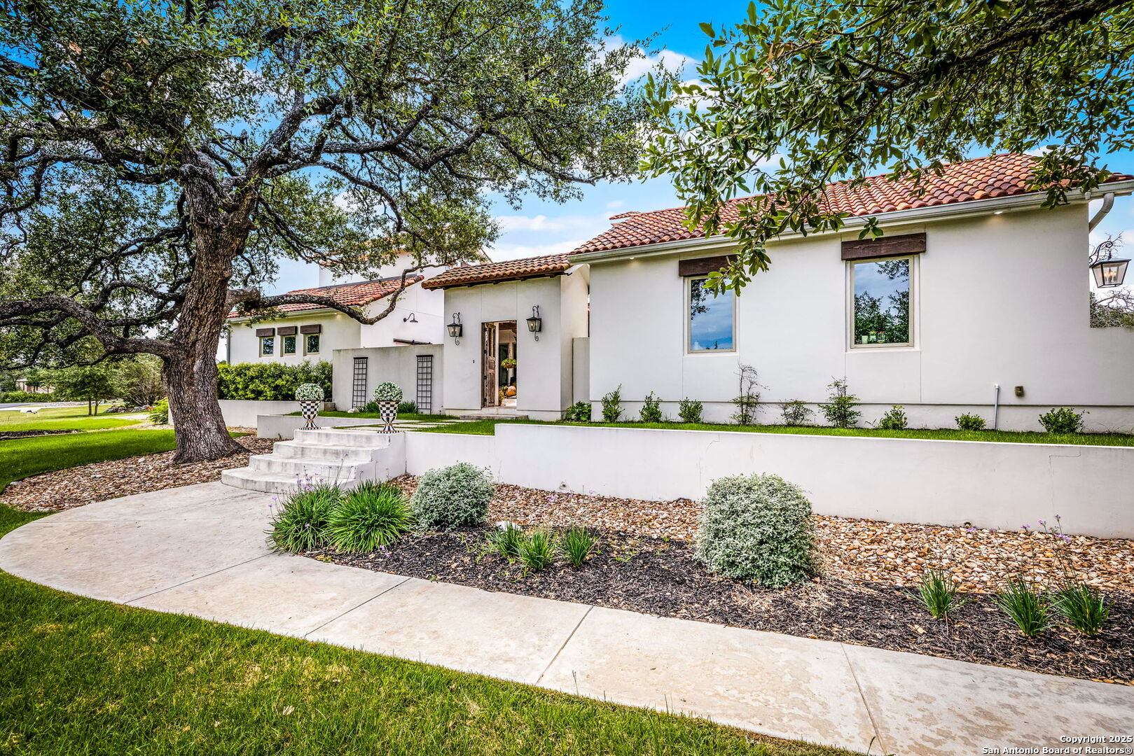 Welcome to an extraordinary Santa Barbara-style retreat in the exclusive gated Bordeaux section of Vintage Oaks, where luxury, privacy, and timeless design converge. Situated on over an acre of manicured grounds, this custom-built masterpiece offers 4 bedrooms, 3 bathrooms, a dedicated office, and a resort-inspired outdoor living space that blends seamlessly with the Hill Country landscape. From the moment you arrive, the home's graceful architecture, creamy smooth stucco, and rich wood accents create an ambiance of refined elegance. A private, arched entry gate invites you into a serene courtyard-a perfect first impression-where lush greenery and the gentle sound of a fountain welcome you home. Inside, the open-concept layout is defined by soaring ceilings adorned with exposed wood beams, hand-troweled walls, and an abundance of natural light streaming through expansive windows. The living room serves as the heart of the home, anchored by a stunning fireplace that exudes warmth and character. Just beyond, the chef's kitchen is a culinary dream, boasting high-end appliances, a gas range, double ovens, custom cabinetry, a sprawling center island with seating, and a walk-in pantry designed for both functionality and style. The adjacent dining area ensures every meal is served with a side of beauty. The primary suite is a sanctuary of comfort and sophistication. Featuring its own fireplace, it's a retreat you'll never want to leave. The spa-inspired en suite bath includes a clawfoot soaking tub, walk-in shower, dual vanities, and an expansive walk-in closet. Three additional bedrooms are generously sized, each offering comfort, style, and thoughtful design touches. A dedicated office, overlooking the courtyard, makes working from home both productive and inspiring. Step outside, and you'll discover the crown jewel of this property: an outdoor living space designed for year-round enjoyment. A sparkling pool with a spa invites refreshing dips on warm Texas days, while the surrounding patios and pergola provide shaded spots to relax. An outdoor kitchen with a built-in grill and prep space makes entertaining effortless, and the outdoor fireplace sets the scene for cozy evenings under the stars. Whether hosting a large gathering or enjoying a quiet night with family, this backyard delivers an unparalleled experience. Additional features include a three-car garage with ample storage, three total fireplaces (in the living room, primary suite, and outdoors), and thoughtful landscaping that enhances privacy and beauty from every angle. As part of the Vintage Oaks community, you'll have access to world-class amenities including multiple pools, walking trails, a fitness center, and more-all while enjoying the security of the gated Bordeaux section. This is more than just a home-it's a lifestyle. Every detail, from the arched doorways to the beamed ceilings, has been carefully curated to embody the charm of Santa Barbara design while offering the modern conveniences today's luxury buyers demand. Perfectly positioned in the heart of the Texas Hill Country, you'll enjoy the tranquility of your private retreat while being just minutes from the vibrant culture, dining, and shopping of New Braunfels. With its sophisticated architecture, resort-style amenities, and a location that offers both prestige and convenience, this home is a rare find for the discerning buyer seeking elegance, comfort, and the ultimate in indoor-outdoor living.