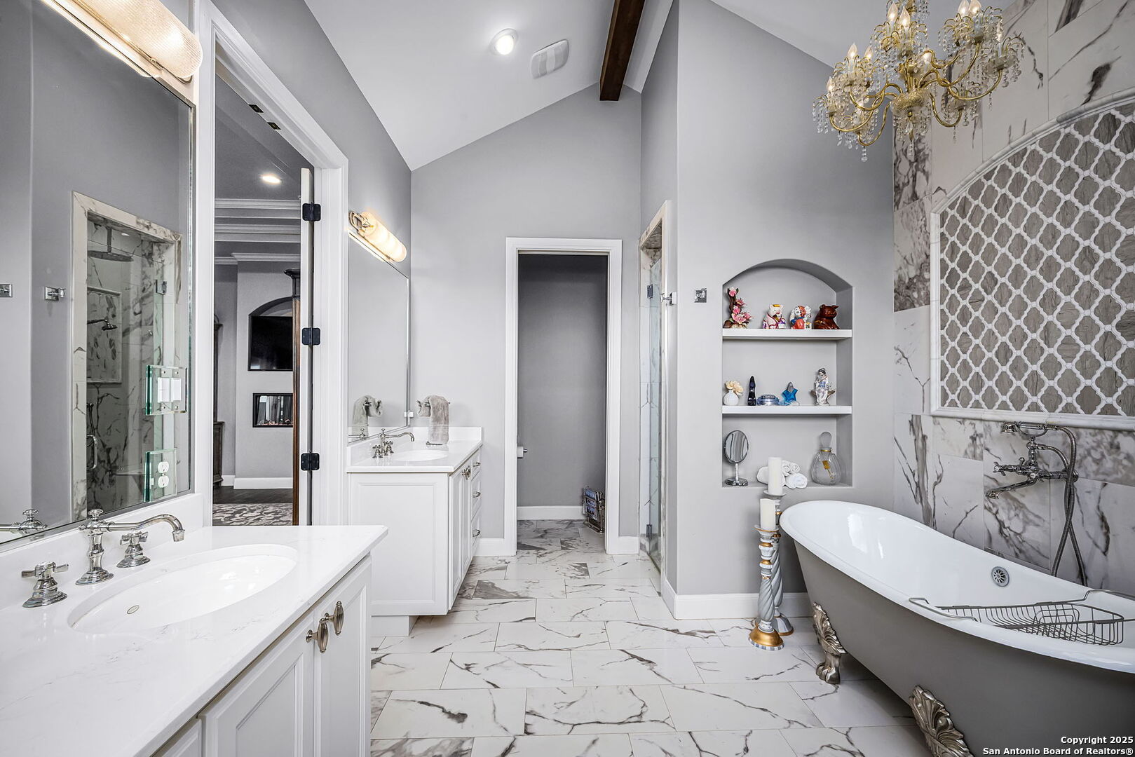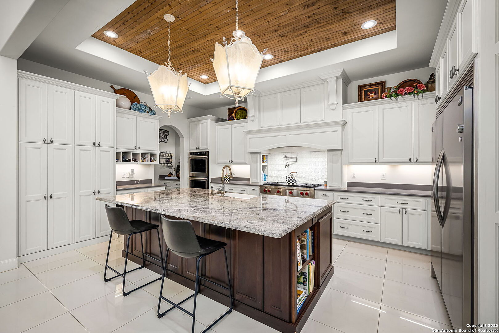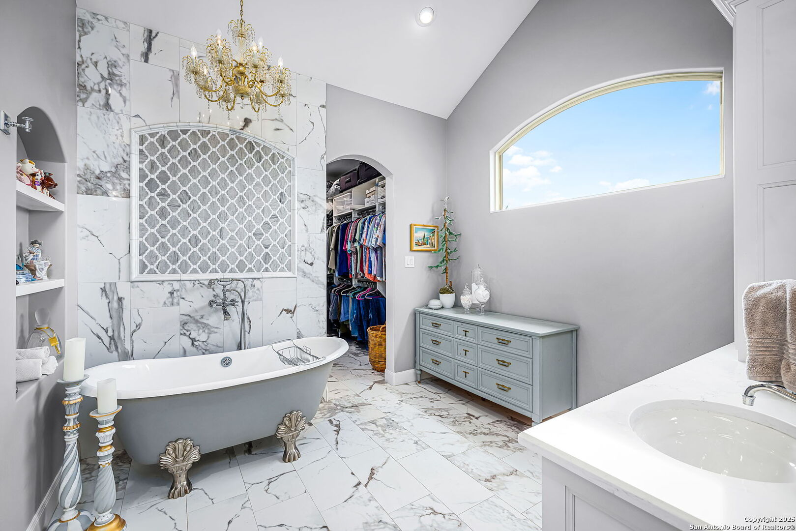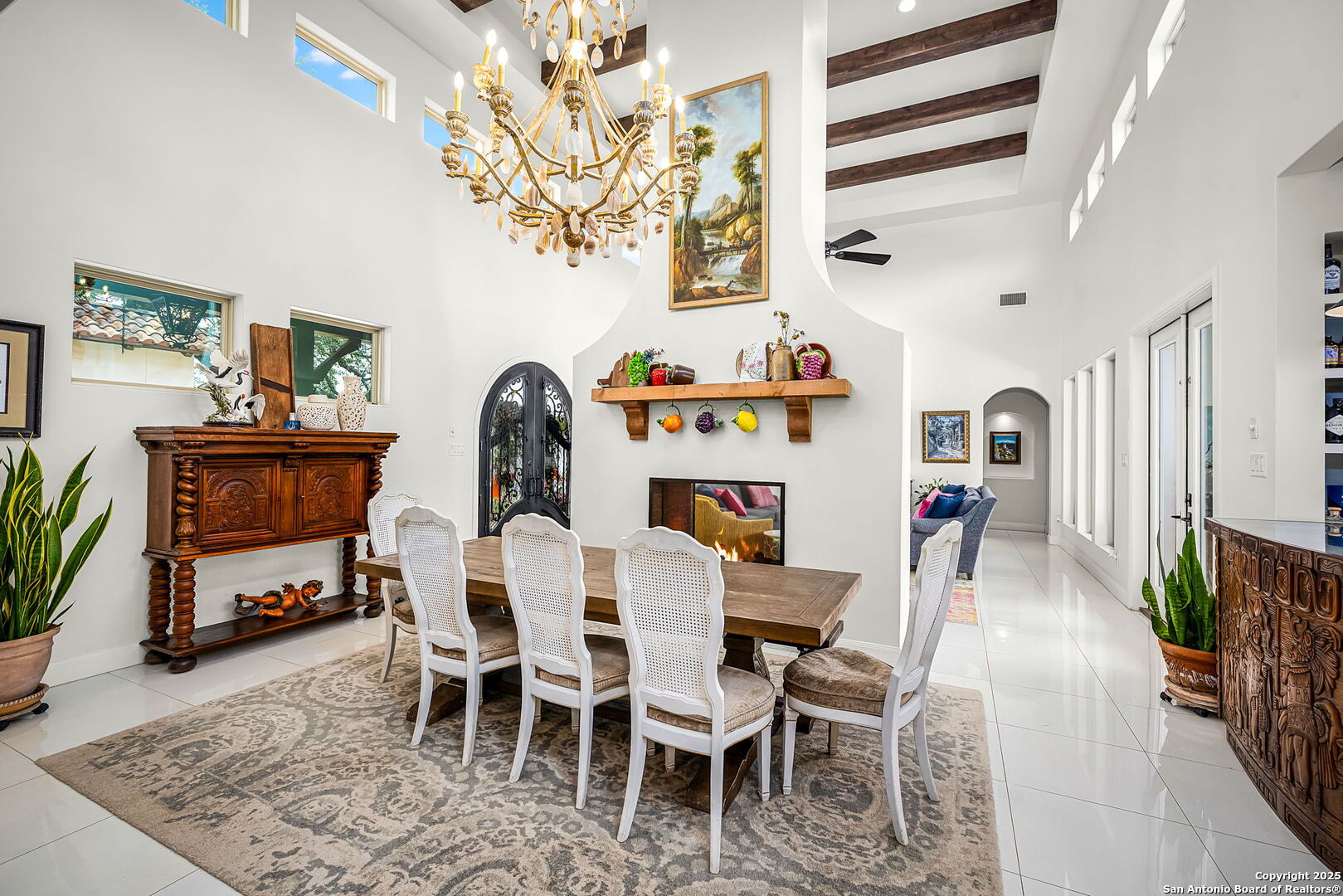 Welcome to an extraordinary Santa Barbara-style retreat in the exclusive gated Bordeaux section of Vintage Oaks, where luxury, privacy, and timeless design converge. Situated on over an acre of manicured grounds, this custom-built masterpiece offers 4 bedrooms, 3 bathrooms, a dedicated office, and a resort-inspired outdoor living space that blends seamlessly with the Hill Country landscape. From the moment you arrive, the home's graceful architecture, creamy smooth stucco, and rich wood accents create an ambiance of refined elegance. A private, arched entry gate invites you into a serene courtyard-a perfect first impression-where lush greenery and the gentle sound of a fountain welcome you home. Inside, the open-concept layout is defined by soaring ceilings adorned with exposed wood beams, hand-troweled walls, and an abundance of natural light streaming through expansive windows. The living room serves as the heart of the home, anchored by a stunning fireplace that exudes warmth and character. Just beyond, the chef's kitchen is a culinary dream, boasting high-end appliances, a gas range, double ovens, custom cabinetry, a sprawling center island with seating, and a walk-in pantry designed for both functionality and style. The adjacent dining area ensures every meal is served with a side of beauty. The primary suite is a sanctuary of comfort and sophistication. Featuring its own fireplace, it's a retreat you'll never want to leave. The spa-inspired en suite bath includes a clawfoot soaking tub, walk-in shower, dual vanities, and an expansive walk-in closet. Three additional bedrooms are generously sized, each offering comfort, style, and thoughtful design touches. A dedicated office, overlooking the courtyard, makes working from home both productive and inspiring. Step outside, and you'll discover the crown jewel of this property: an outdoor living space designed for year-round enjoyment. A sparkling pool with a spa invites refreshing dips on warm Texas days, while the surrounding patios and pergola provide shaded spots to relax. An outdoor kitchen with a built-in grill and prep space makes entertaining effortless, and the outdoor fireplace sets the scene for cozy evenings under the stars. Whether hosting a large gathering or enjoying a quiet night with family, this backyard delivers an unparalleled experience. Additional features include a three-car garage with ample storage, three total fireplaces (in the living room, primary suite, and outdoors), and thoughtful landscaping that enhances privacy and beauty from every angle. As part of the Vintage Oaks community, you'll have access to world-class amenities including multiple pools, walking trails, a fitness center, and more-all while enjoying the security of the gated Bordeaux section. This is more than just a home-it's a lifestyle. Every detail, from the arched doorways to the beamed ceilings, has been carefully curated to embody the charm of Santa Barbara design while offering the modern conveniences today's luxury buyers demand. Perfectly positioned in the heart of the Texas Hill Country, you'll enjoy the tranquility of your private retreat while being just minutes from the vibrant culture, dining, and shopping of New Braunfels. With its sophisticated architecture, resort-style amenities, and a location that offers both prestige and convenience, this home is a rare find for the discerning buyer seeking elegance, comfort, and the ultimate in indoor-outdoor living.