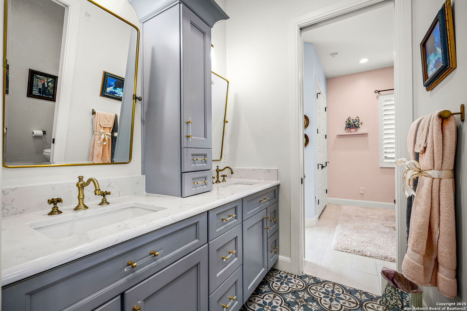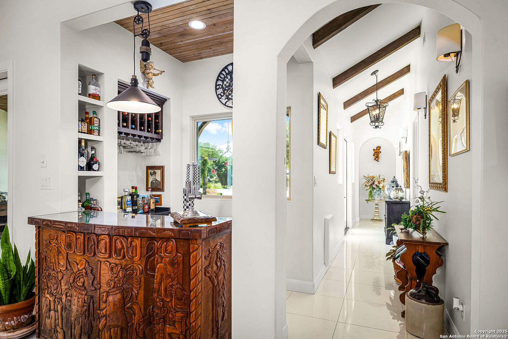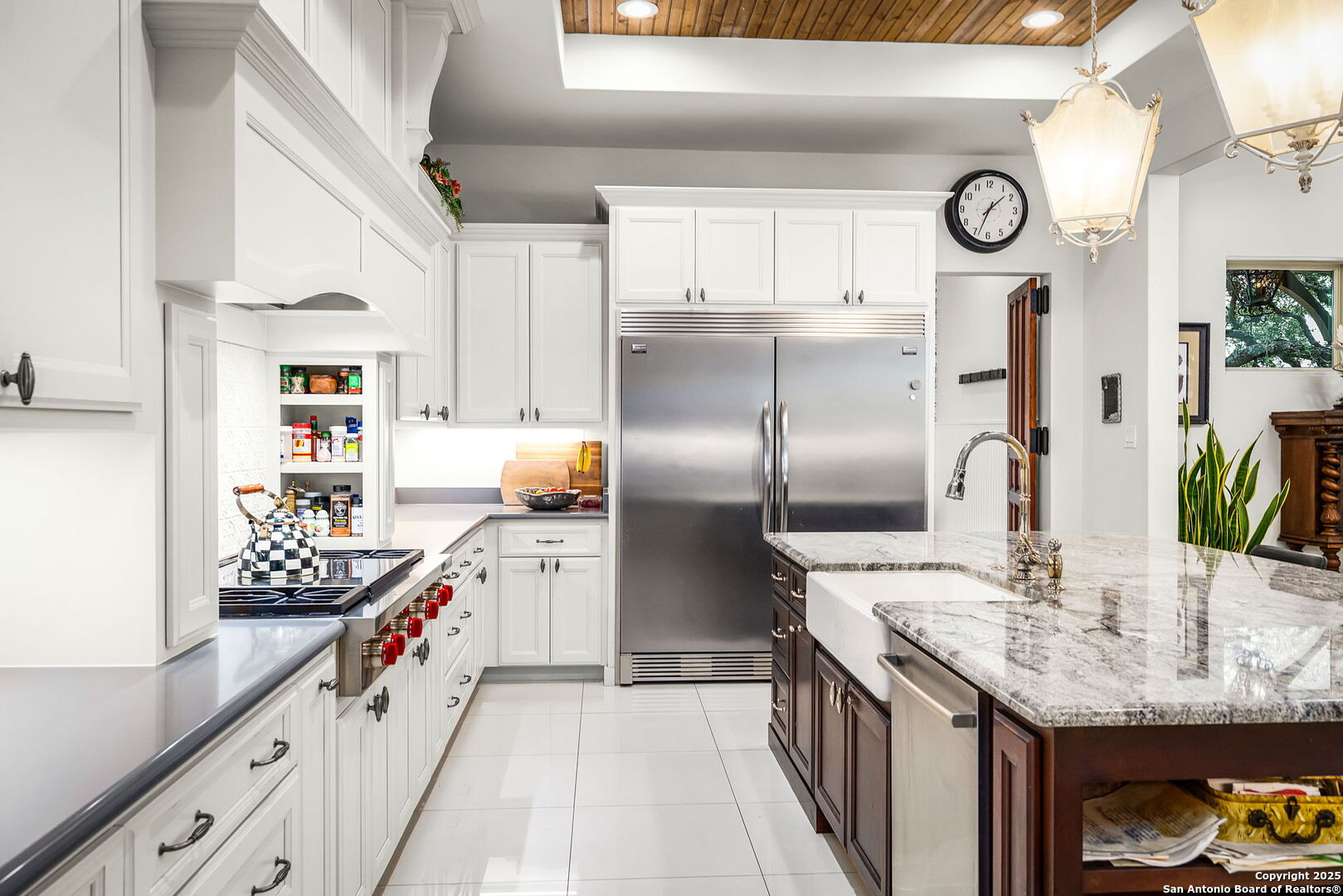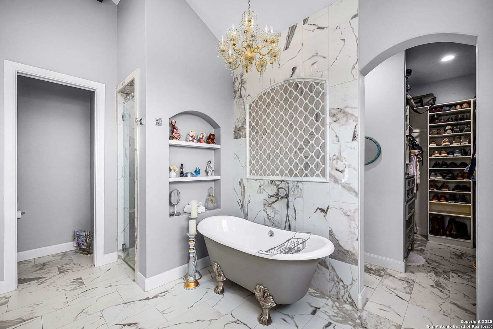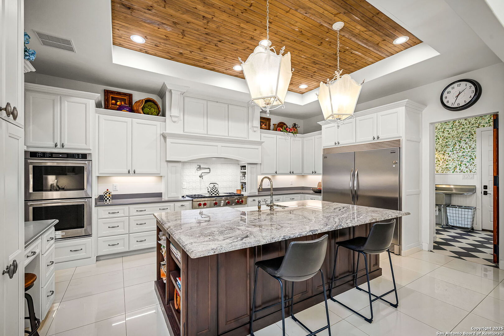 Welcome to an extraordinary Santa Barbara-style retreat in the exclusive gated Bordeaux section of Vintage Oaks, where luxury, privacy, and timeless design converge. Situated on over an acre of manicured grounds, this custom-built masterpiece offers 4 bedrooms, 3 bathrooms, a dedicated office, and a resort-inspired outdoor living space that blends seamlessly with the Hill Country landscape. From the moment you arrive, the home's graceful architecture, creamy smooth stucco, and rich wood accents create an ambiance of refined elegance. A private, arched entry gate invites you into a serene courtyard-a perfect first impression-where lush greenery and the gentle sound of a fountain welcome you home. Inside, the open-concept layout is defined by soaring ceilings adorned with exposed wood beams, hand-troweled walls, and an abundance of natural light streaming through expansive windows. The living room serves as the heart of the home, anchored by a stunning fireplace that exudes warmth and character. Just beyond, the chef's kitchen is a culinary dream, boasting high-end appliances, a gas range, double ovens, custom cabinetry, a sprawling center island with seating, and a walk-in pantry designed for both functionality and style. The adjacent dining area ensures every meal is served with a side of beauty. The primary suite is a sanctuary of comfort and sophistication. Featuring its own fireplace, it's a retreat you'll never want to leave. The spa-inspired en suite bath includes a clawfoot soaking tub, walk-in shower, dual vanities, and an expansive walk-in closet. Three additional bedrooms are generously sized, each offering comfort, style, and thoughtful design touches. A dedicated office, overlooking the courtyard, makes working from home both productive and inspiring. Step outside, and you'll discover the crown jewel of this property: an outdoor living space designed for year-round enjoyment. A sparkling pool with a spa invites refreshing dips on warm Texas days, while the surrounding patios and pergola provide shaded spots to relax. An outdoor kitchen with a built-in grill and prep space makes entertaining effortless, and the outdoor fireplace sets the scene for cozy evenings under the stars. Whether hosting a large gathering or enjoying a quiet night with family, this backyard delivers an unparalleled experience. Additional features include a three-car garage with ample storage, three total fireplaces (in the living room, primary suite, and outdoors), and thoughtful landscaping that enhances privacy and beauty from every angle. As part of the Vintage Oaks community, you'll have access to world-class amenities including multiple pools, walking trails, a fitness center, and more-all while enjoying the security of the gated Bordeaux section. This is more than just a home-it's a lifestyle. Every detail, from the arched doorways to the beamed ceilings, has been carefully curated to embody the charm of Santa Barbara design while offering the modern conveniences today's luxury buyers demand. Perfectly positioned in the heart of the Texas Hill Country, you'll enjoy the tranquility of your private retreat while being just minutes from the vibrant culture, dining, and shopping of New Braunfels. With its sophisticated architecture, resort-style amenities, and a location that offers both prestige and convenience, this home is a rare find for the discerning buyer seeking elegance, comfort, and the ultimate in indoor-outdoor living.