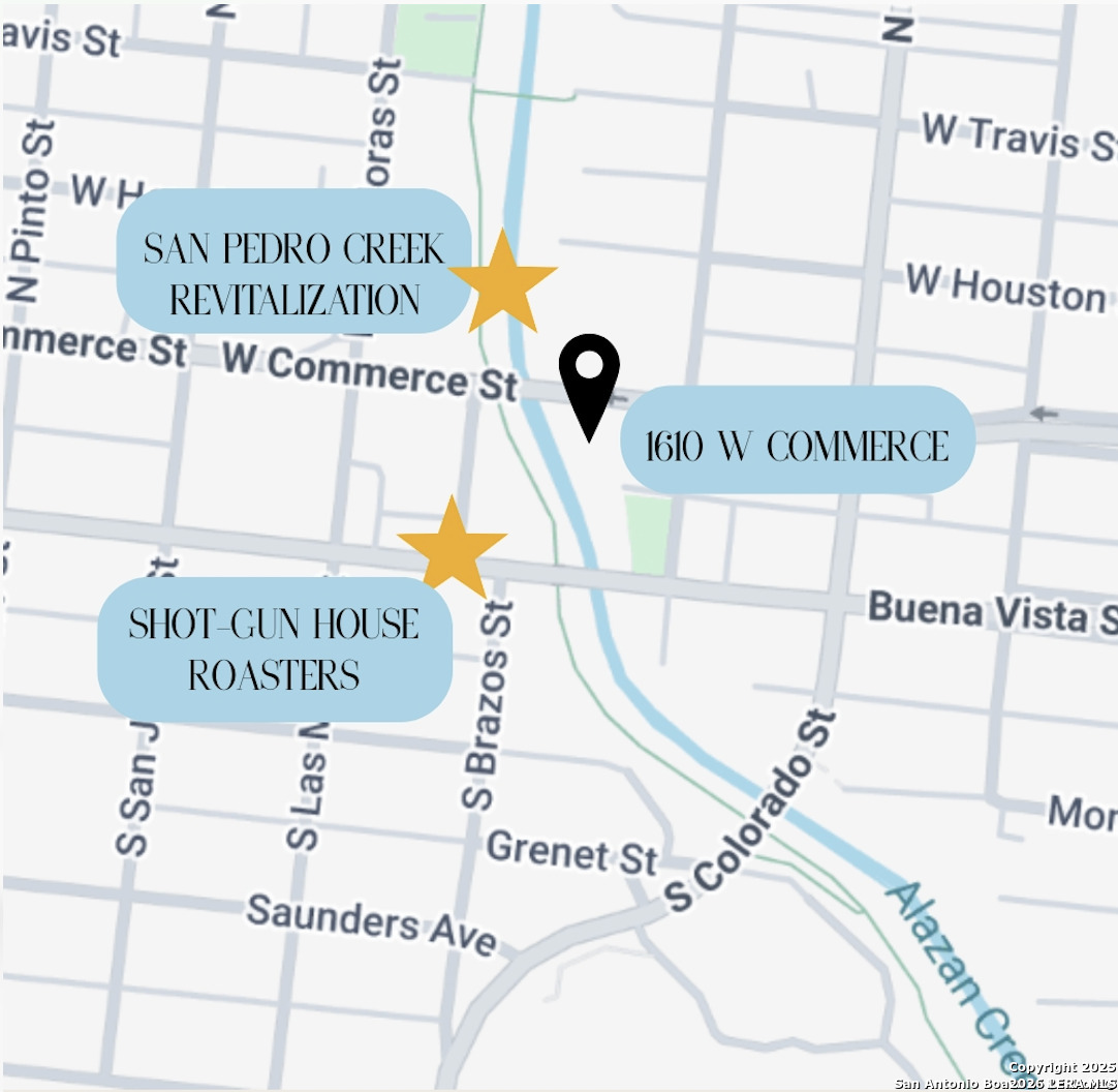 Discover a prime commercial opportunity in San Antonio's historic West Side near UTSA Downtown, the Courthouse District, Market Square, and Jaime's Place. This Craftsman-style office offers multiple private offices, a reception area, and flexible workspace. Zoned I-1, allowing a wide range of professional or light-industrial uses. High-visibility frontage along W Commerce and just steps from San Pedro Creek and Warehouse 5. Perfect for law firms, insurance, creative studios, retail, office, salons, restaurants, bars, and professional services seeking a centrally located, character-filled property. (This is a gross lease, which means taxes are included in rent, not NNN.)