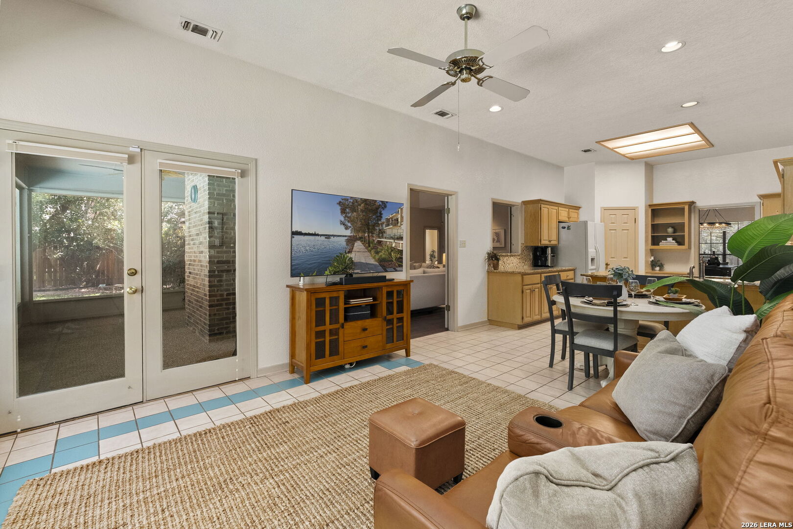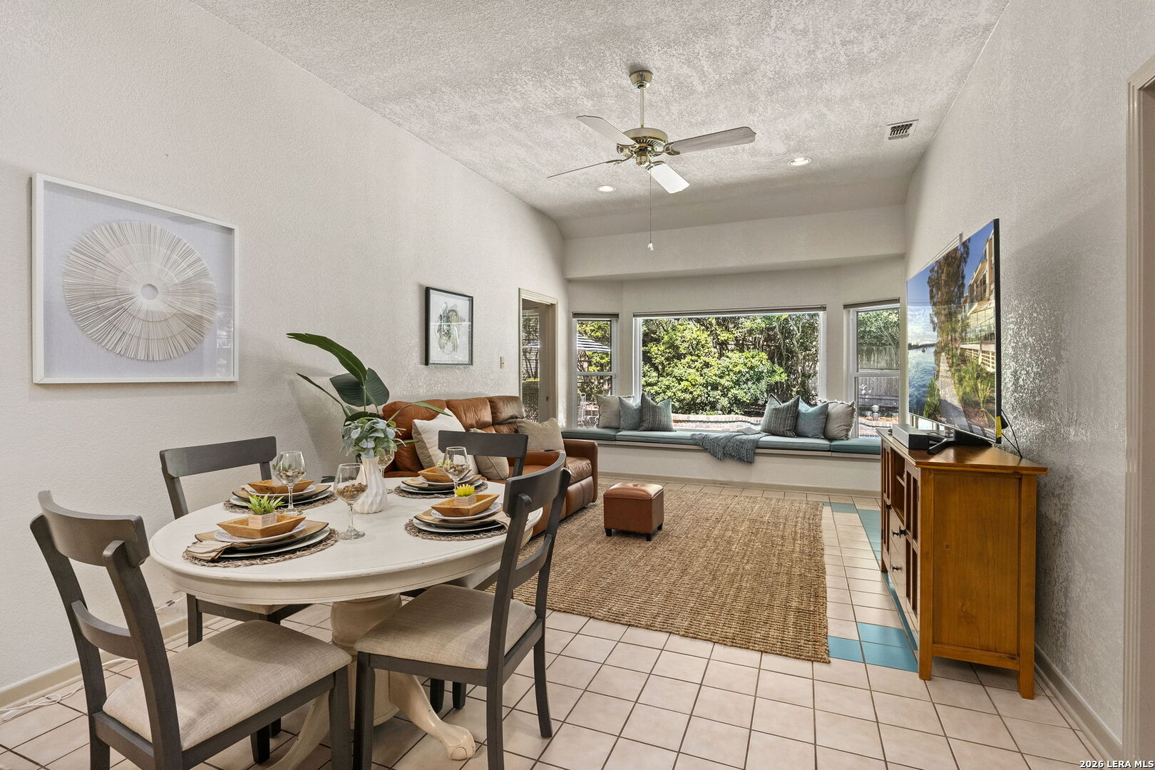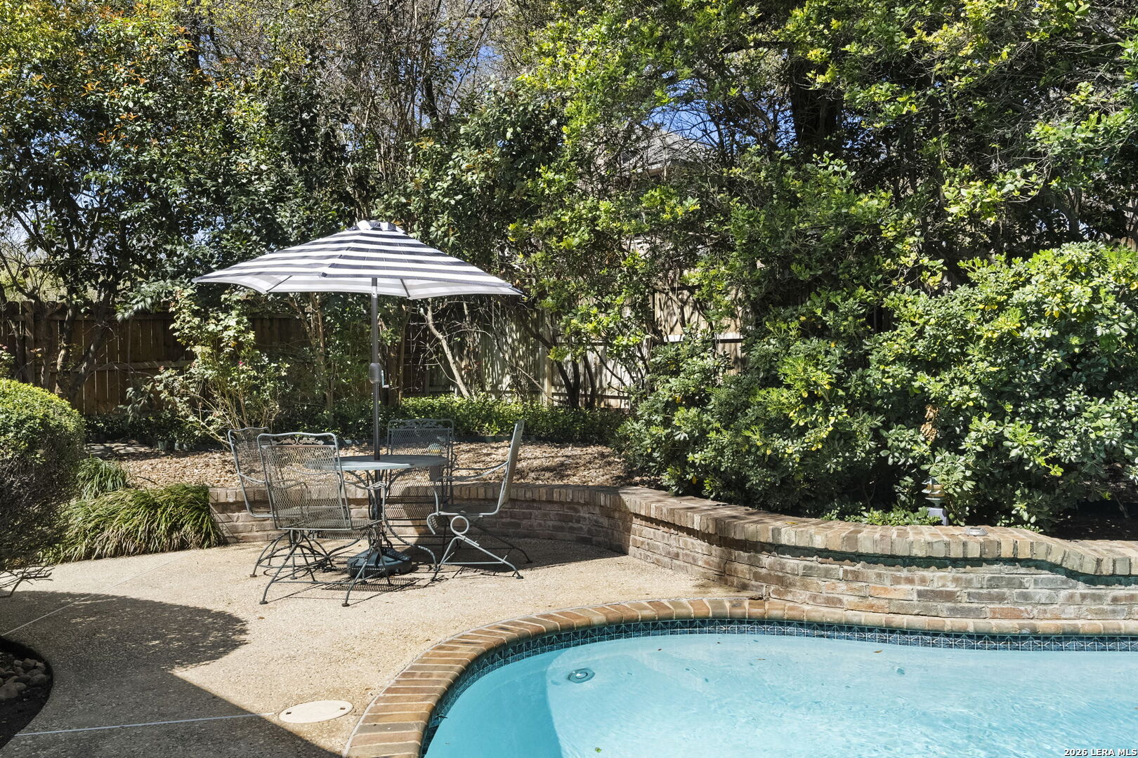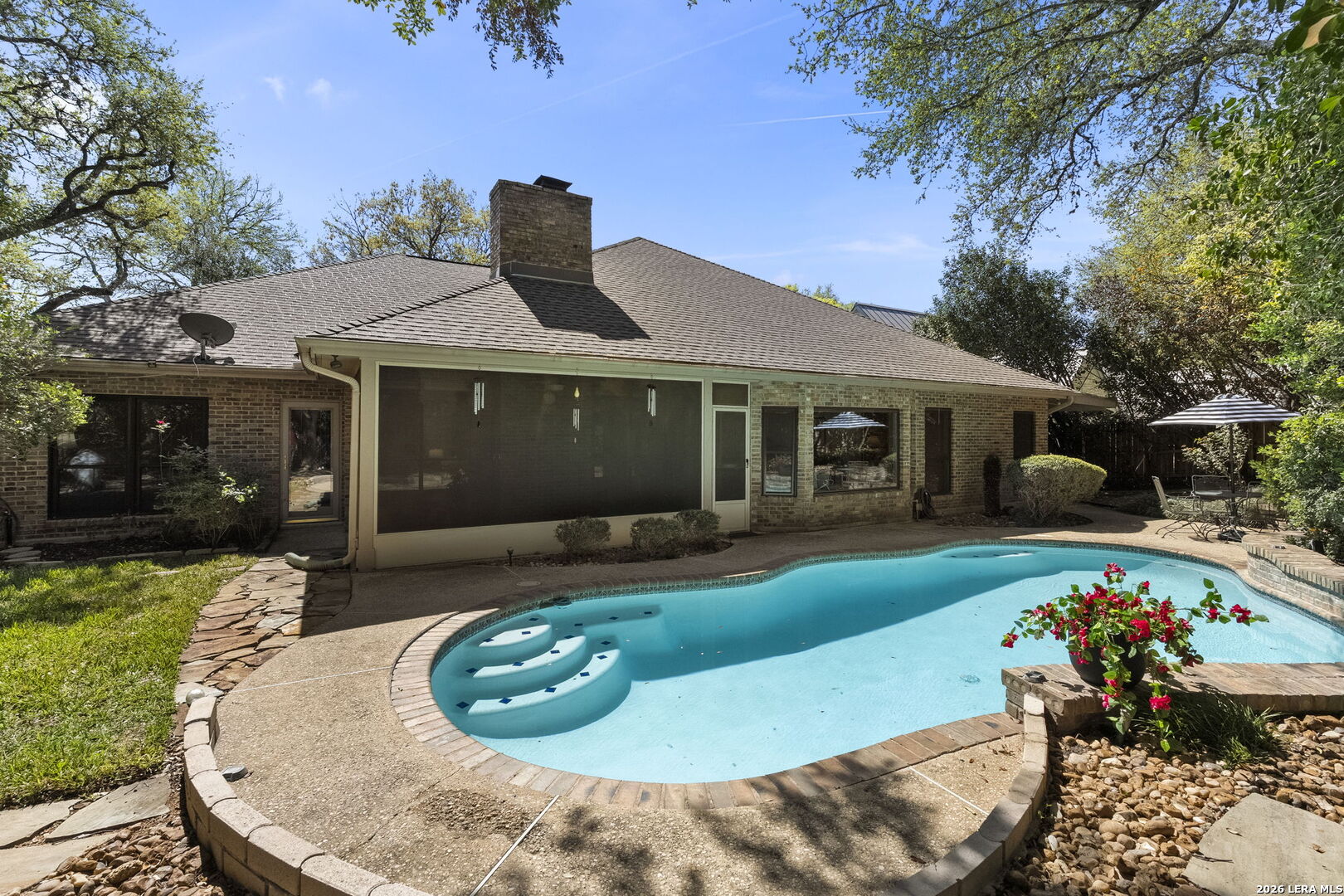 Set on a beautifully treed lot in the established Deerfield community, this thoughtfully designed single-story residence offers a balance of comfort, great curb appeal, functionality, and inviting indoor-outdoor living. The home features four bedrooms and three bathrooms with a layout designed to support both everyday living and effortless entertaining. A welcoming entry introduces the central living spaces, where the oversized family room is highlighted by soaring ceilings and a striking floor-to-ceiling brick fireplace that anchors the space. Hardwood flooring extends through the primary suite, family room, dining area, and one additional bedroom, adding warmth and continuity throughout the main living areas. The kitchen is designed with both practicality and gathering in mind, offering granite countertops, abundant cabinetry, and a spacious walk-in pantry that provides excellent storage and preparation space. Just beyond the breakfast area, a versatile bonus room creates an additional living space and features a window seat overlooking the backyard, allowing natural light to fill the room. The primary suite offers a comfortable retreat with dual vanities, a Roman tub, a separate shower, and dual closets. The split bedroom arrangement places the additional bedrooms on the opposite side of the home, providing privacy and flexibility for guests, home offices, or additional living needs. Outdoor living is equally inviting. Mature trees and established landscaping create a sense of privacy, while the screened porch and Keith Zars in-ground pool provide welcoming spaces for relaxation or entertaining throughout the year. Additional highlights include a dedicated storage area, a garage with epoxy flooring and built-in shelving, fresh interior paint, and recent pool improvements that enhance the home's move-in-ready appeal while still offering opportunities for personalization. Conveniently located near shopping, dining, and major transportation routes, the home is just a short distance from the community amenities and is located within the North East Independent School District. Residents also enjoy easy access to the nearby Salado Creek Greenway walking and biking trails, offering miles of scenic paths for outdoor recreation.