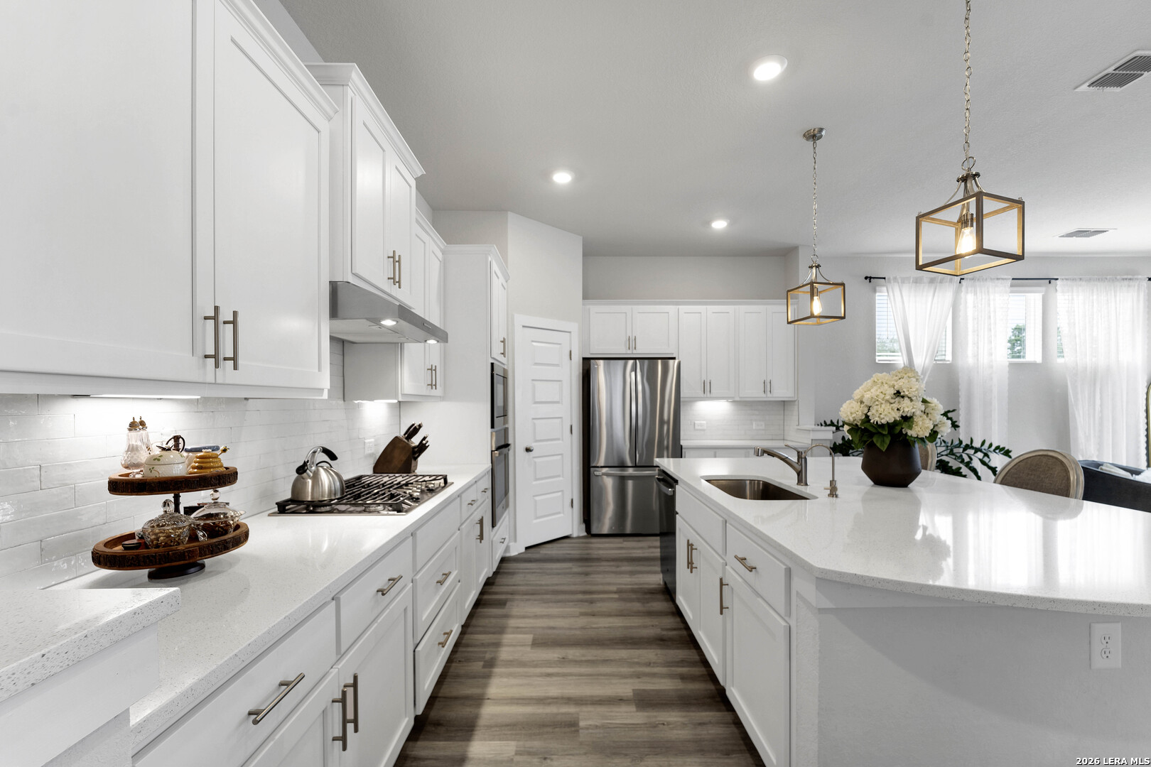 Discover this stunning two-story home located in the highly desirable Meyer Ranch community in the heart of the Texas Hill Country. Designed with an open-concept layout, soaring ceilings, and abundant natural light, this home offers a bright, welcoming feel from the moment you walk in. At the center of the home is a beautiful kitchen featuring a spacious island, crisp white cabinetry, gas cooktop, and built-in oven. The generously sized primary suite on the main level provides a peaceful retreat, complete with a private bath offering dual sinks, a large walk-in shower, and walk-in closet. A secondary bedroom and full bathroom on the first floor make a perfect space for guests or multi-generational living. Upstairs, a flexible loft area offers endless possibilities for a game room, media space, or playroom, along with two additional bedrooms and a full bath. Step outside to the serene backyard and enjoy the covered patio overlooking a private greenbelt with no rear neighbors, perfect for relaxing or entertaining. Meyer Ranch offers exceptional community amenities, including a resort-style pool, playground, dog park, scenic walking trails, and neighborhood events that foster a true sense of community. This wonderful home is ready to welcome its next owners, don't miss your chance to make it yours!