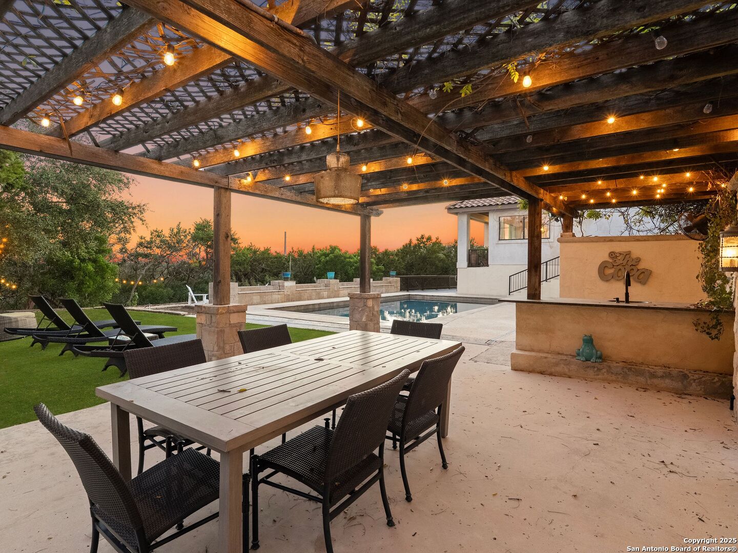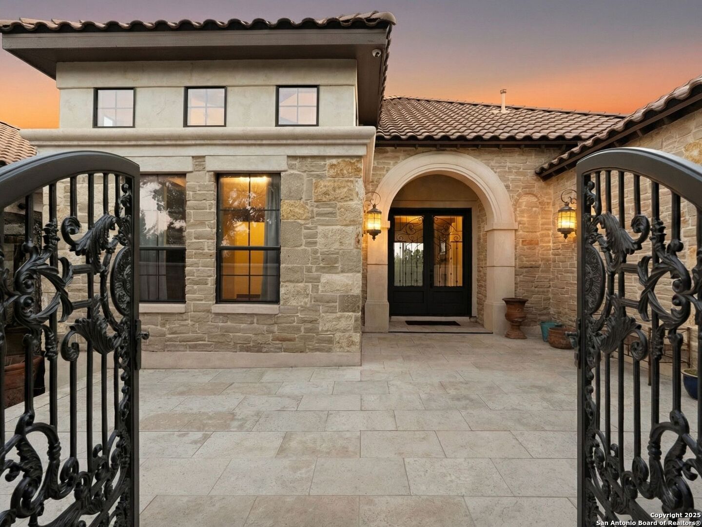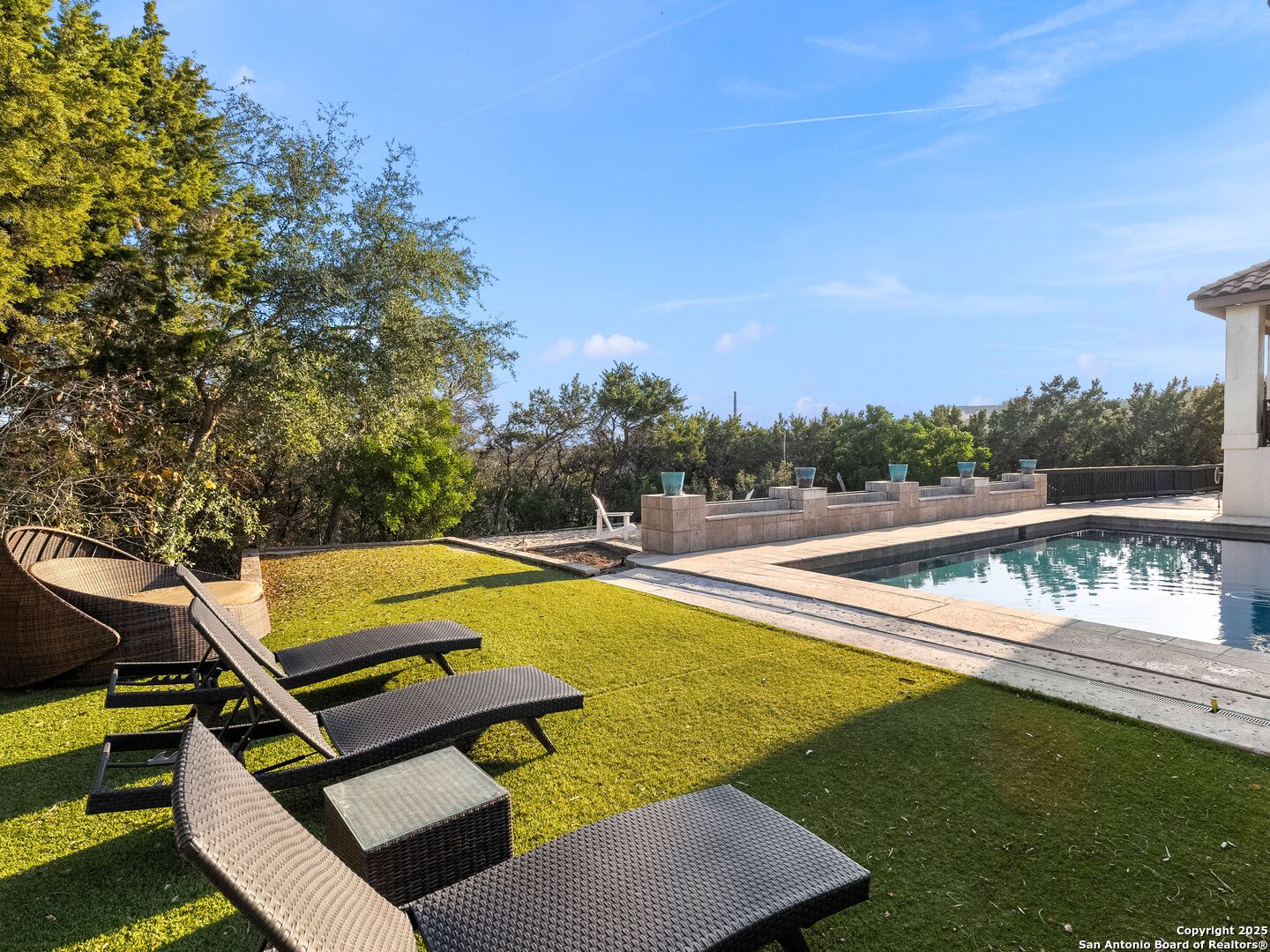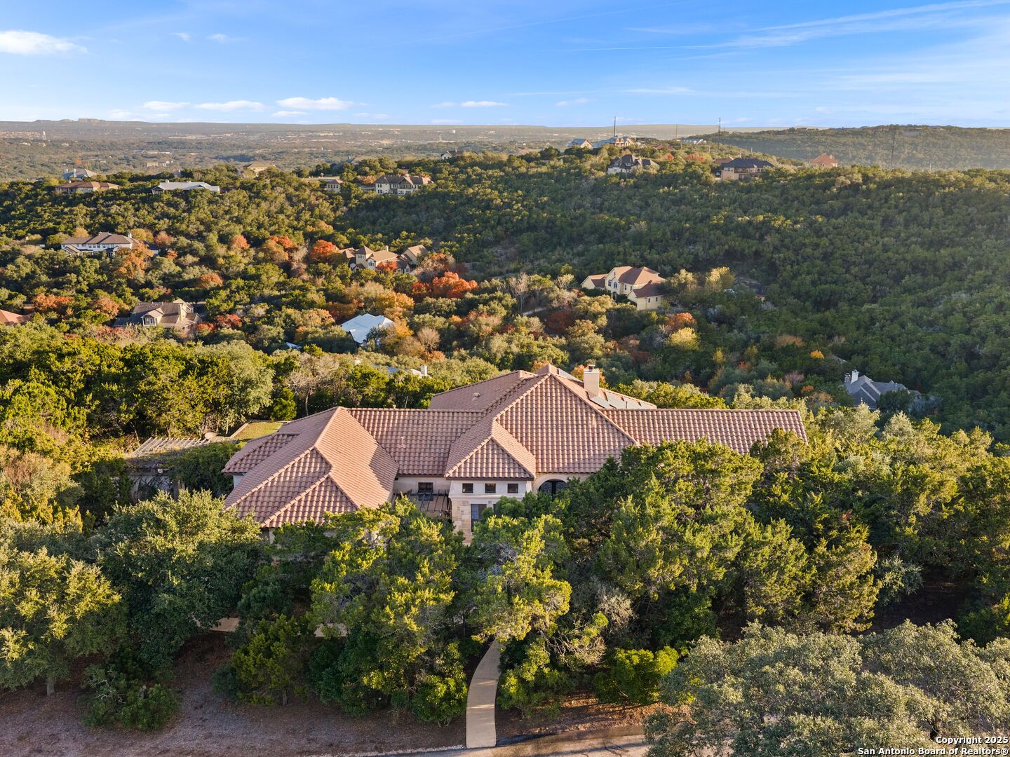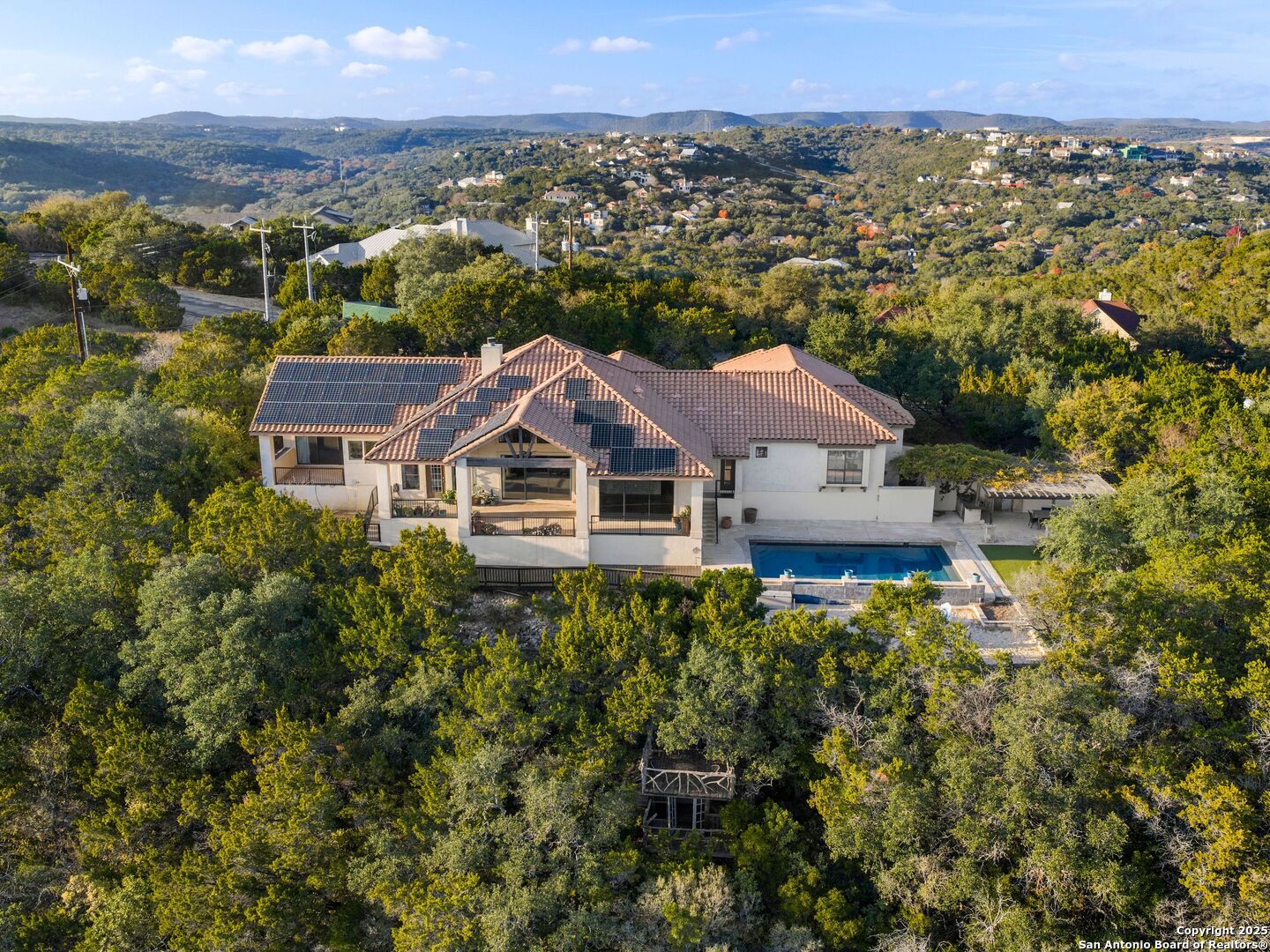 Nestled atop a private hilltop with downtown views in the distance, this Mediterranean estate offers a masterful blend of timeless craftsmanship, elegance, and tranquility. This single-story residence spans 3960 sq.ft. with four private bedrooms, each with its own private en-suite, plus an extra cabana bath for effortless indoor-outdoor living. The spacious primary suite serves as a true retreat complete with a spa-inspired bath, dual walk-in closets, and a private patio with breathtaking views. Designed for entertaining, the home opens up to a gorgeous pool with multiple gathering areas complete with hosting amenities, framed by a hill country back drop. Back inside, you will find warm, yet modern textures creating an inviting atmosphere, anchored by a rock fireplace at the heart of the home. The kitchen is impeccably outfitted with premier Wolf and Sub-Zero appliances, just steps away from the wine cellar fit for an avid collector. The stately private office offers a balance of sophistication, focus, and comfort.